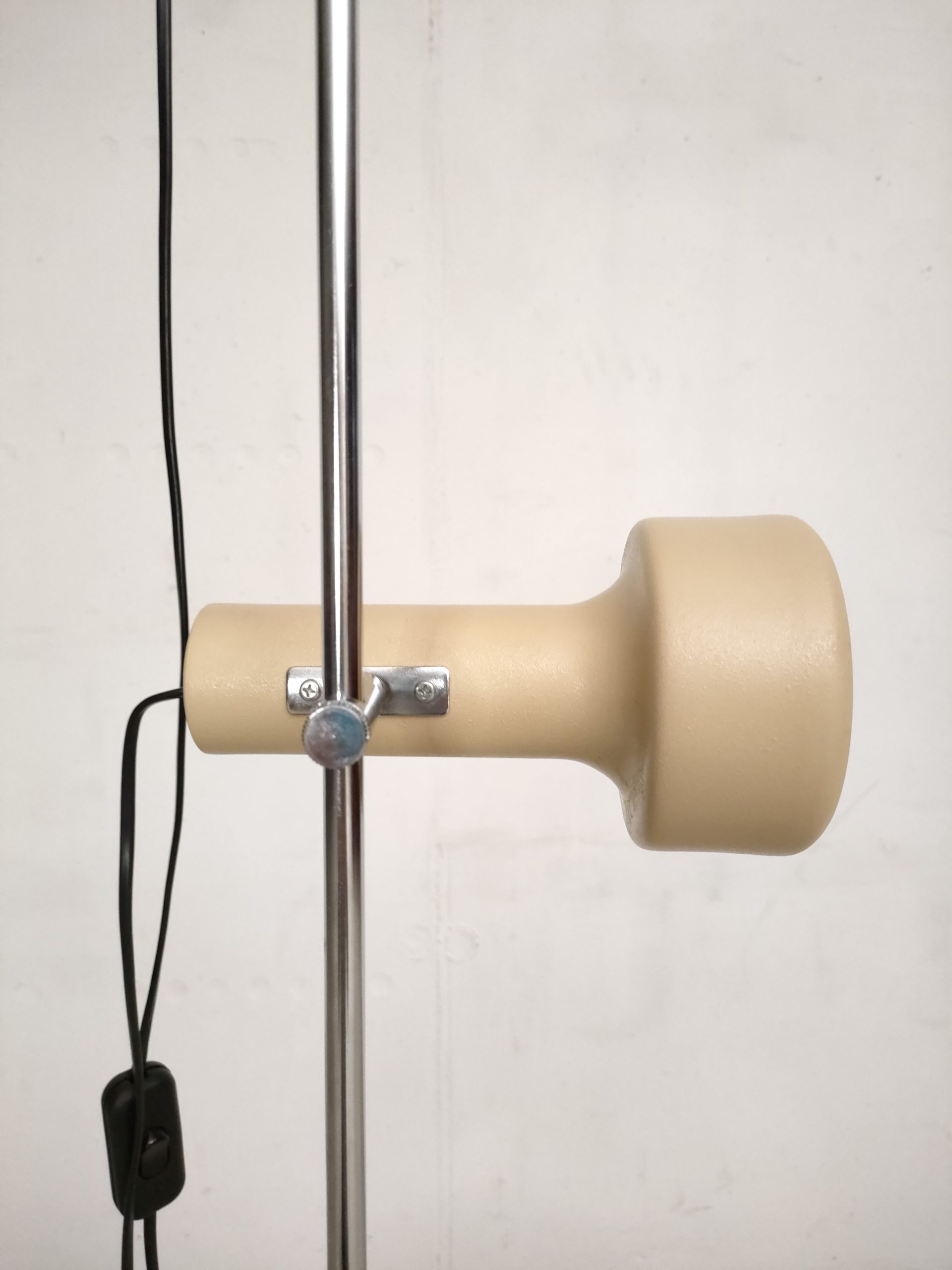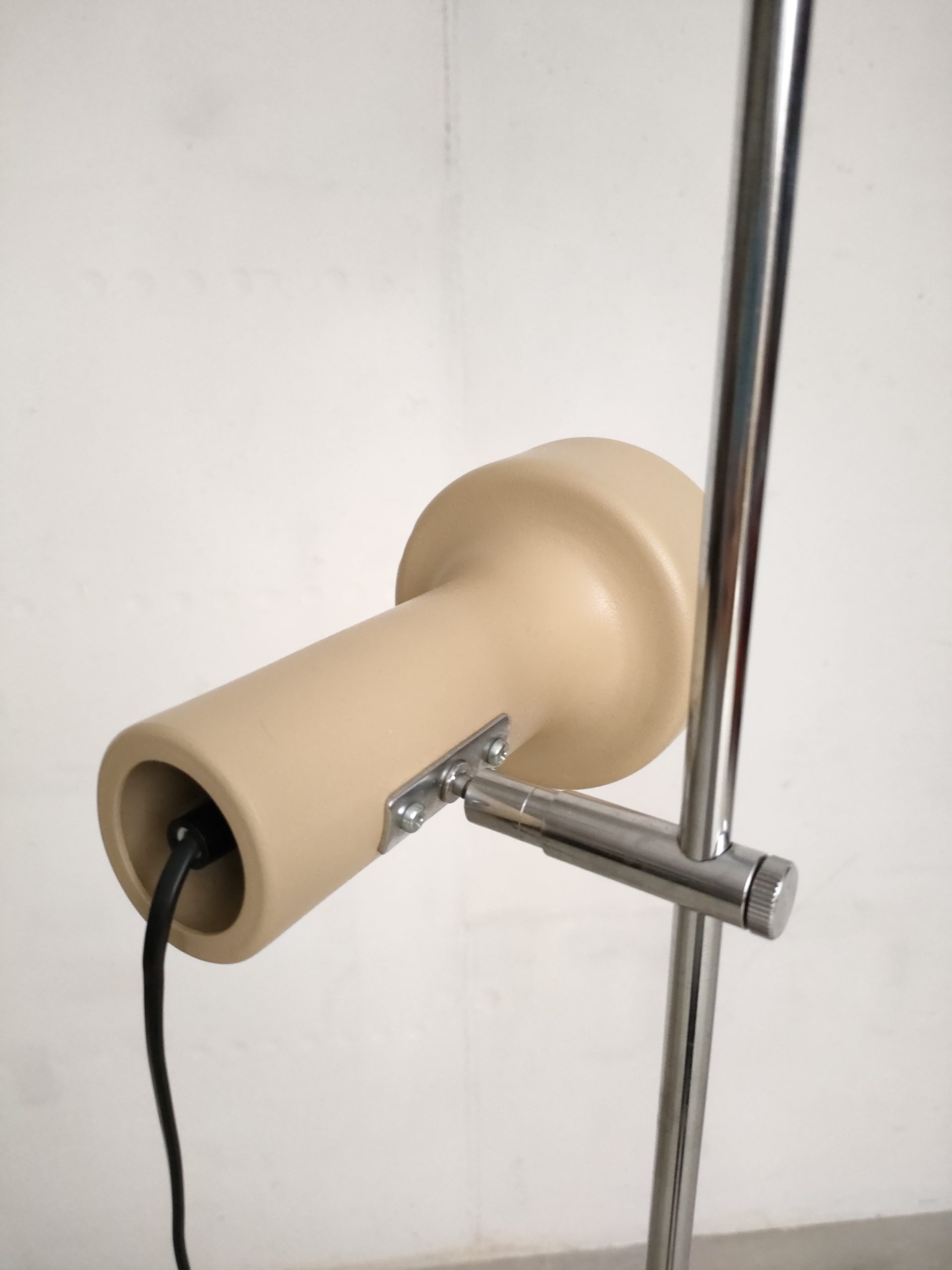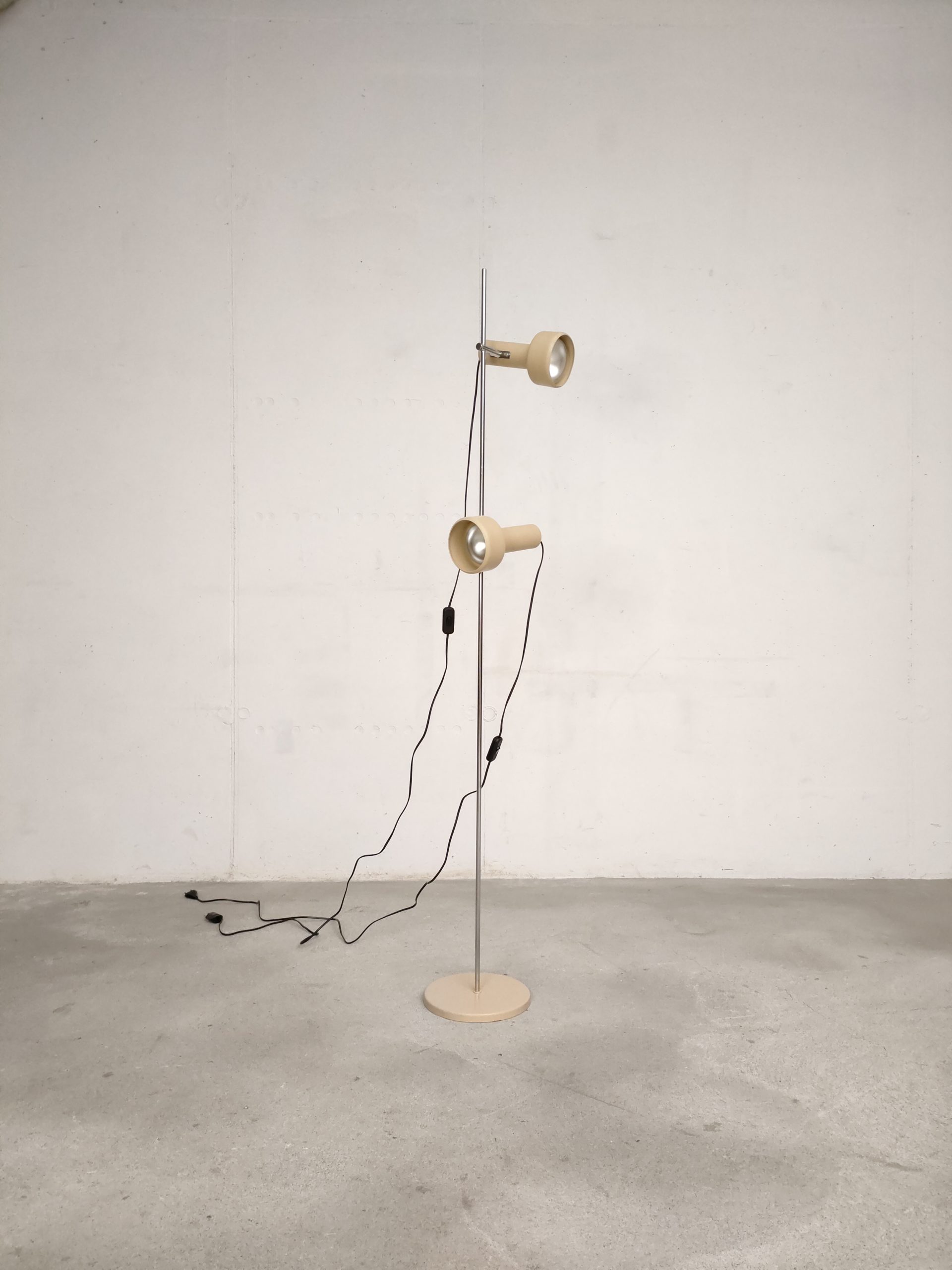 Produit venduLampe sur pied spot vintage avec socle et deux spots en métal de couleur beige et tige en métal chromé.
