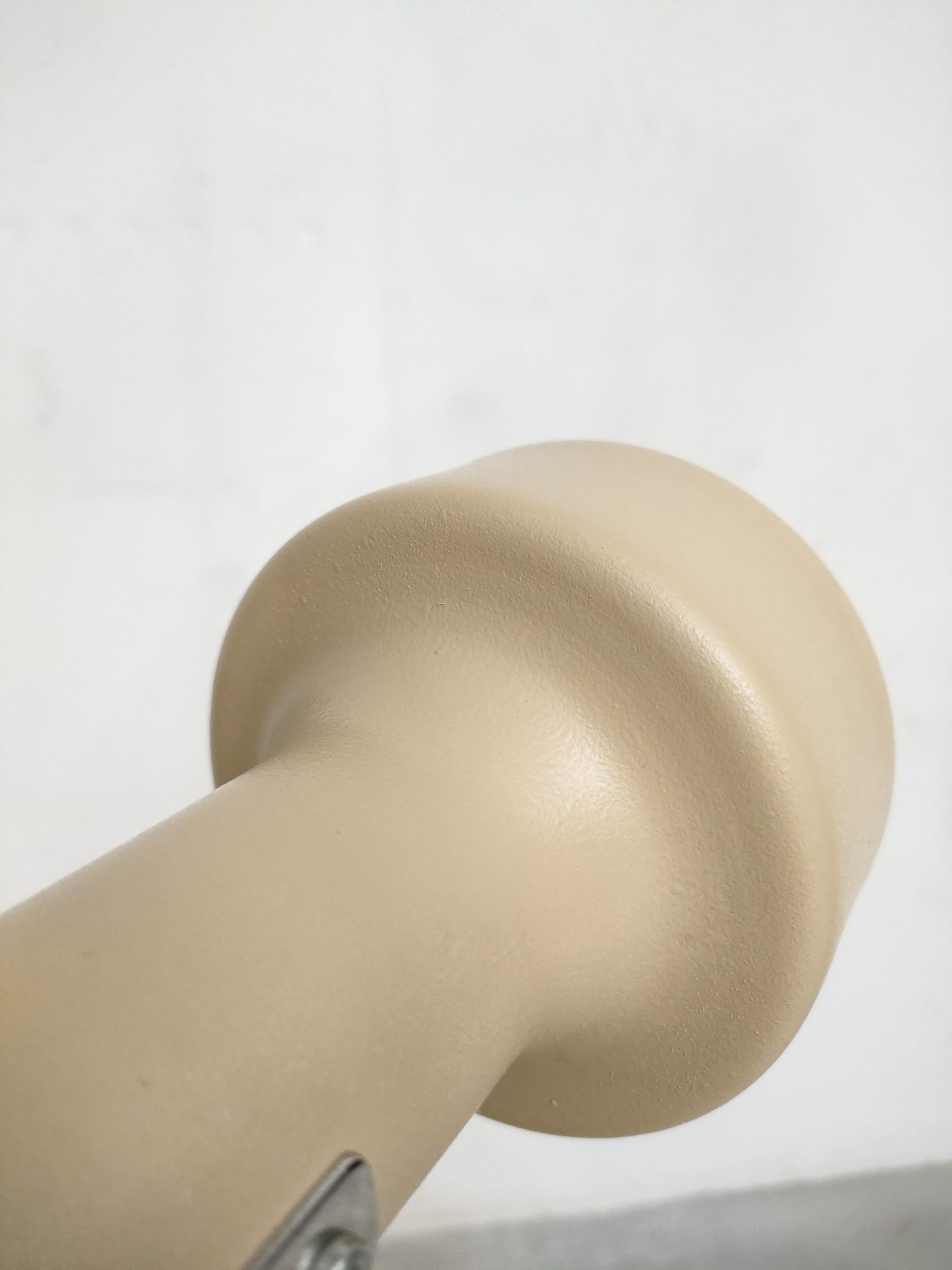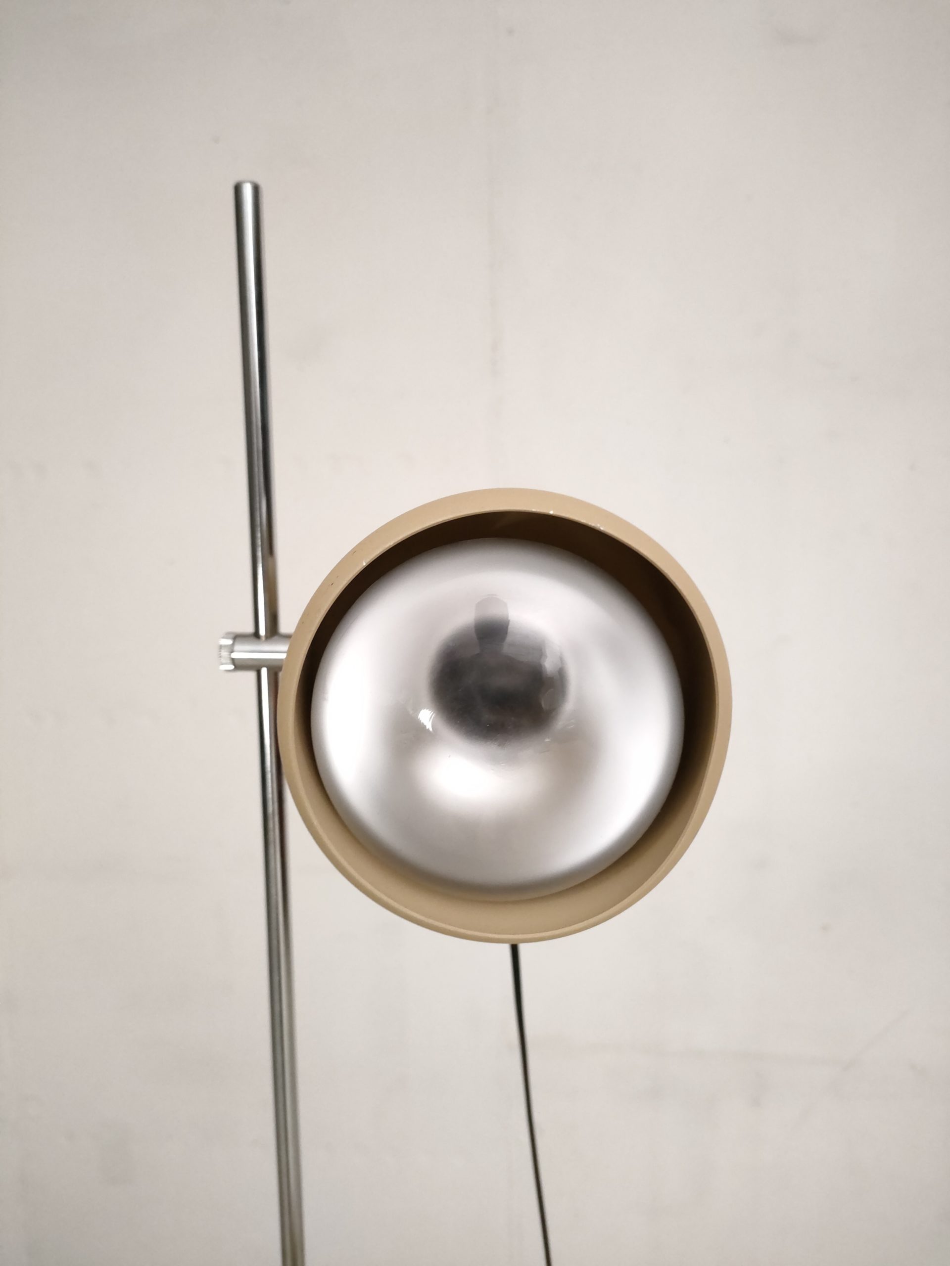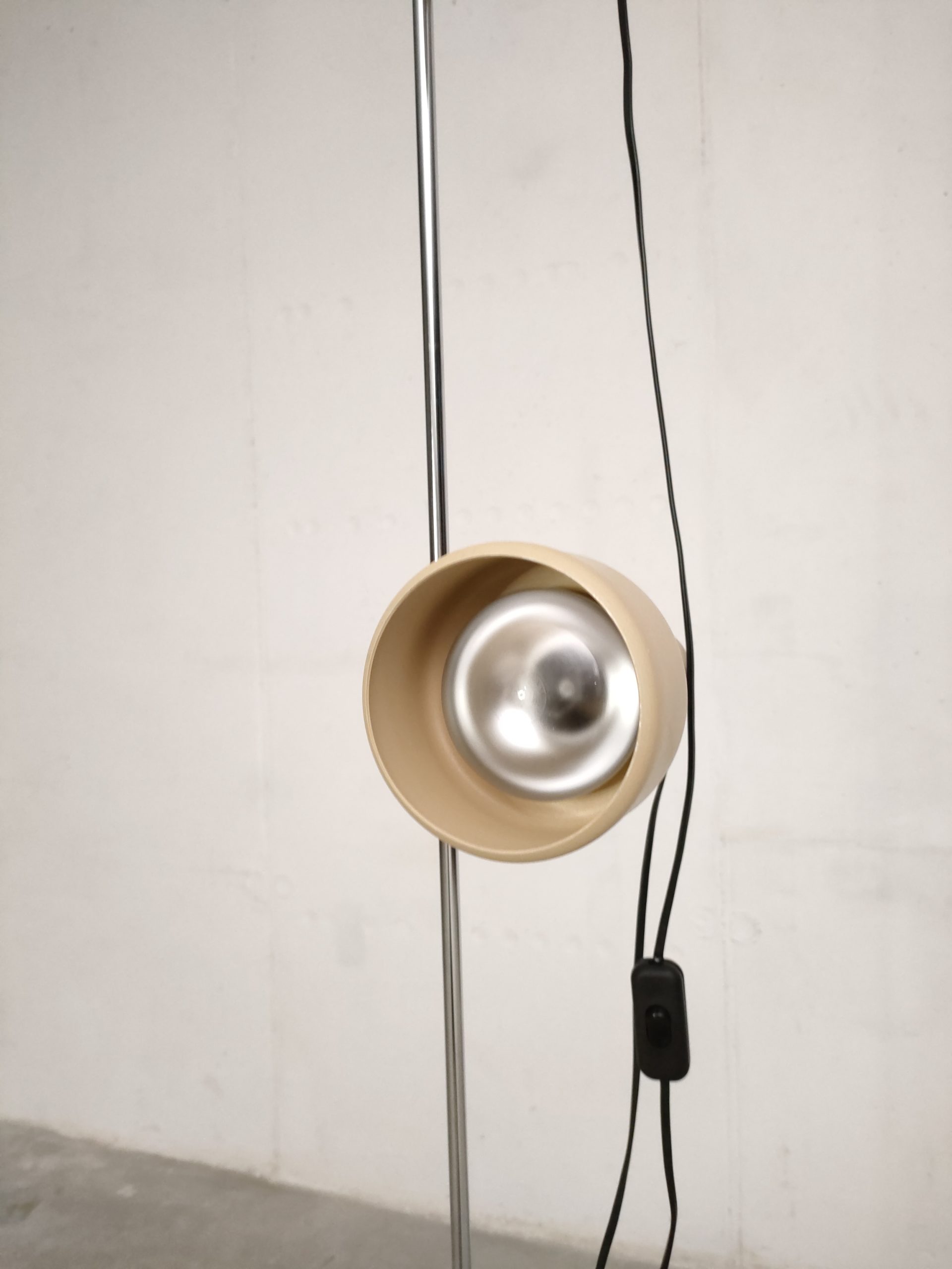 Produit venduLampe sur pied spot vintage avec socle et deux spots en métal de couleur beige et tige en métal chromé.