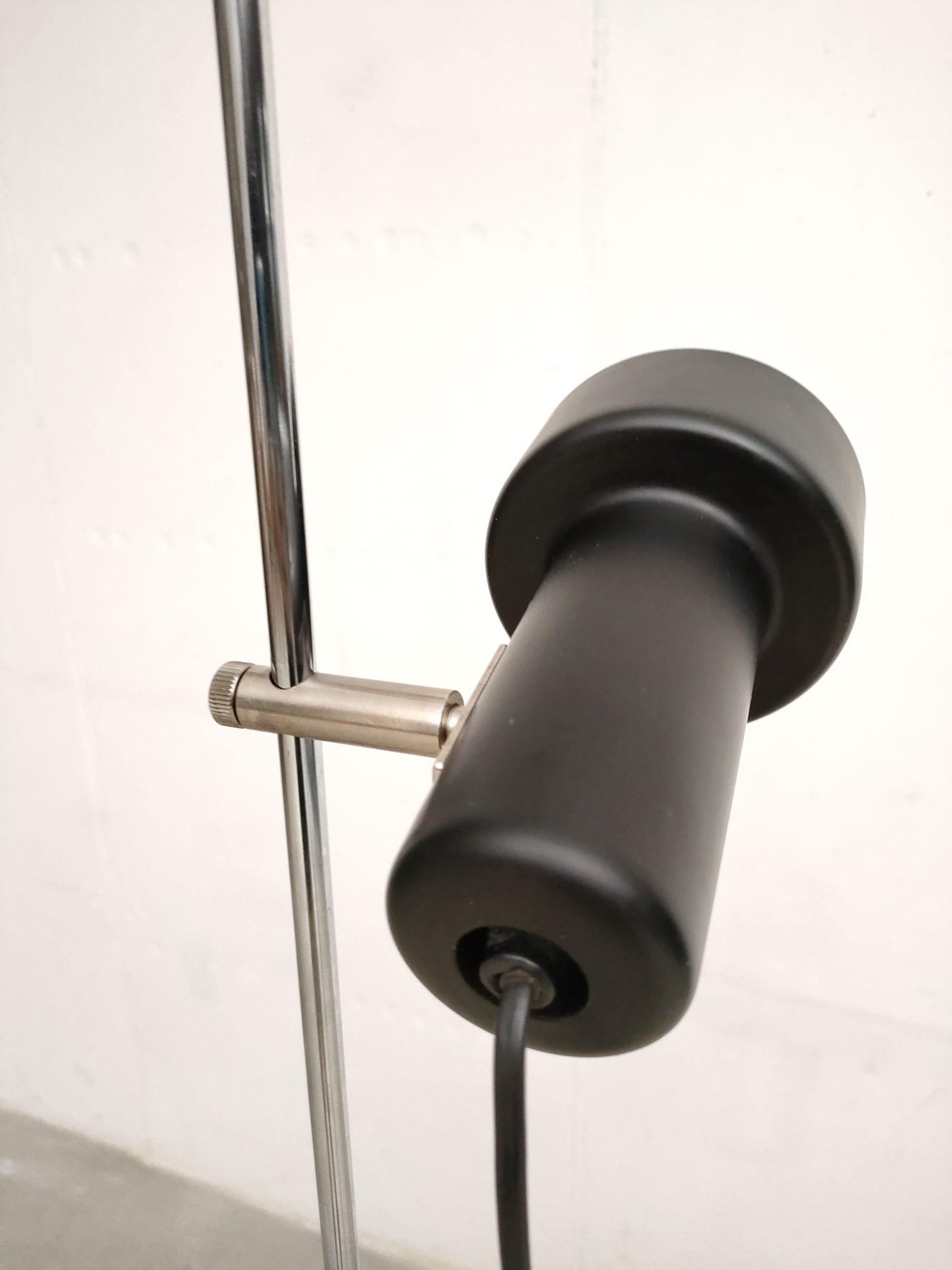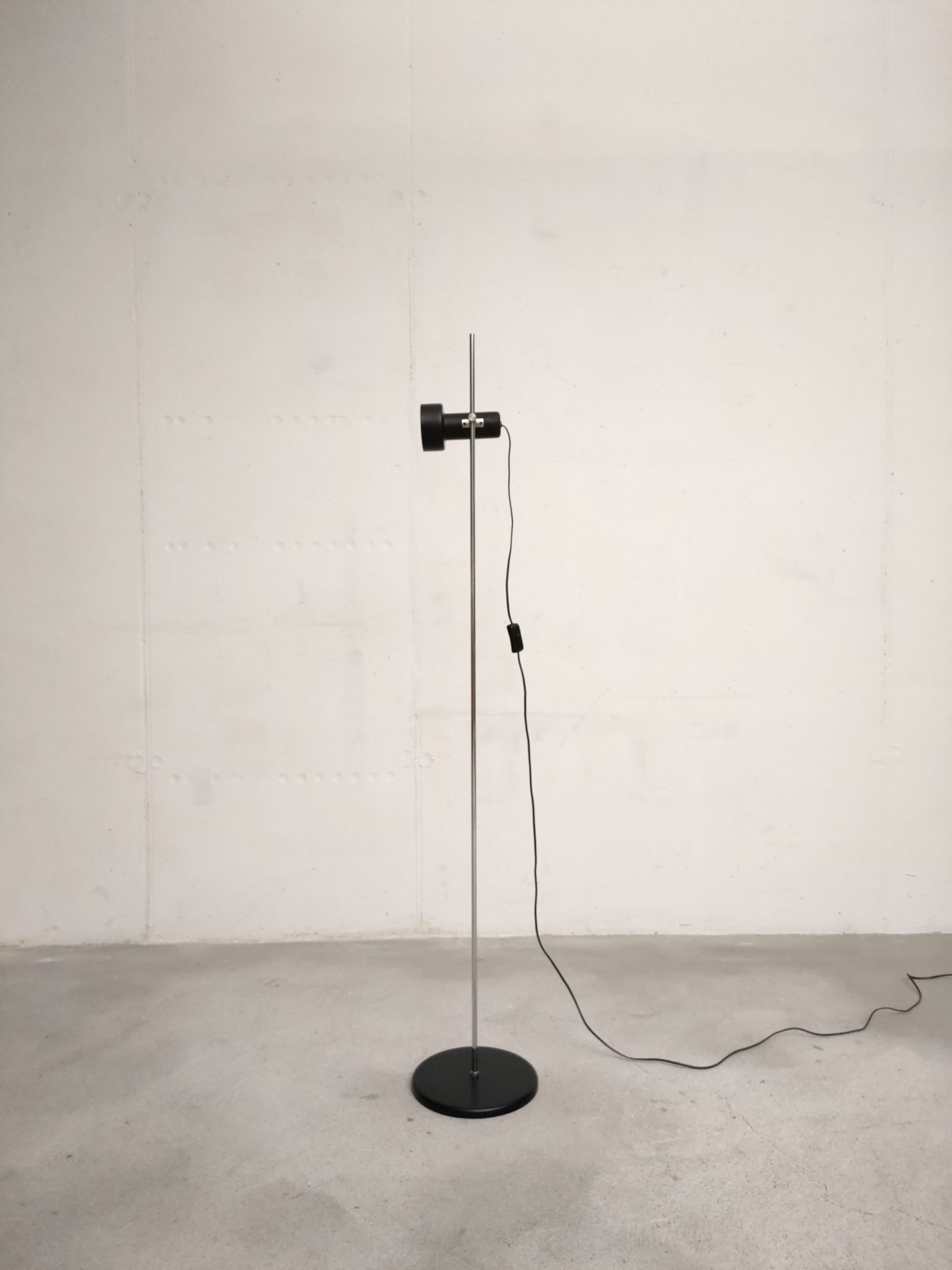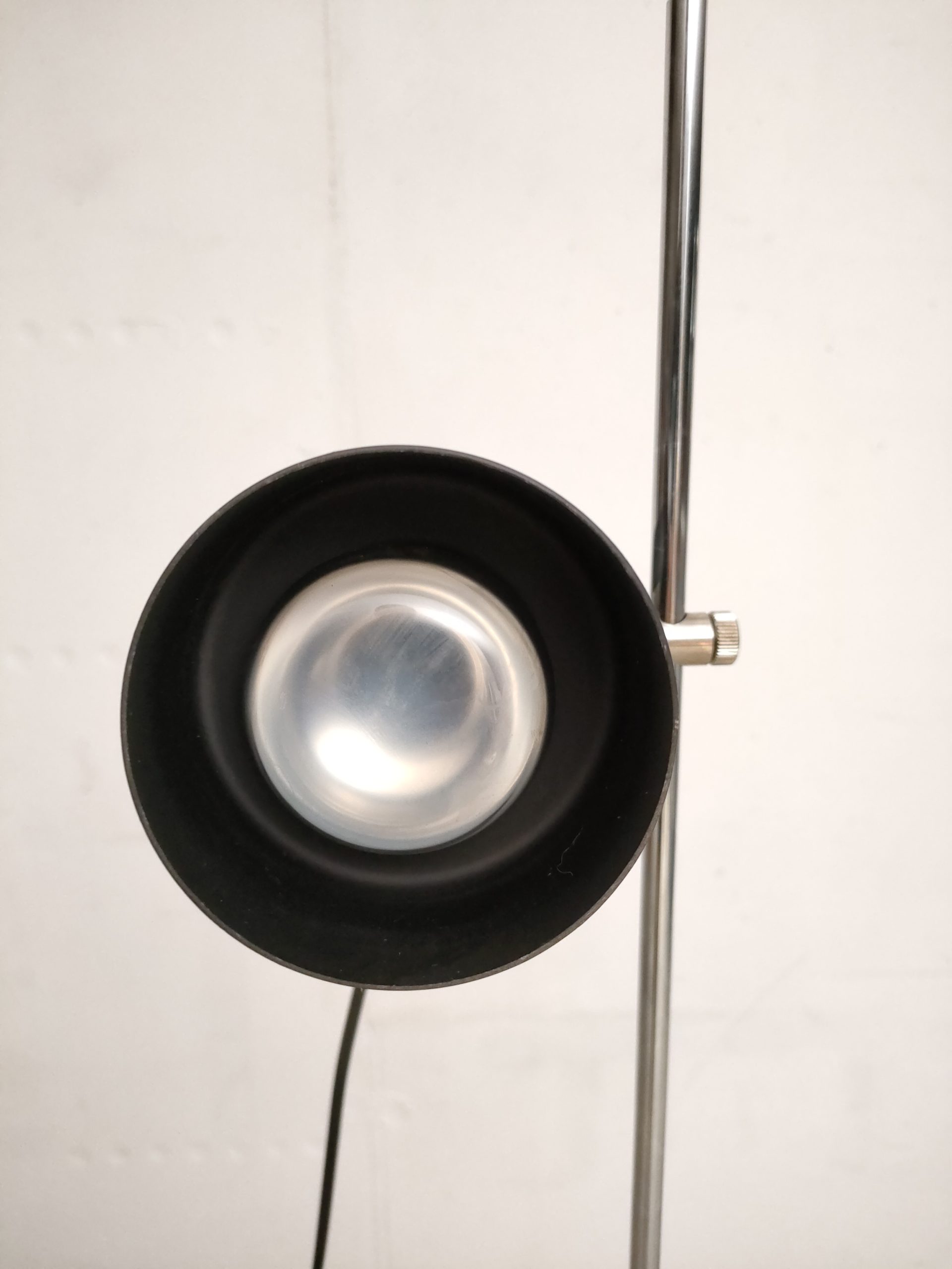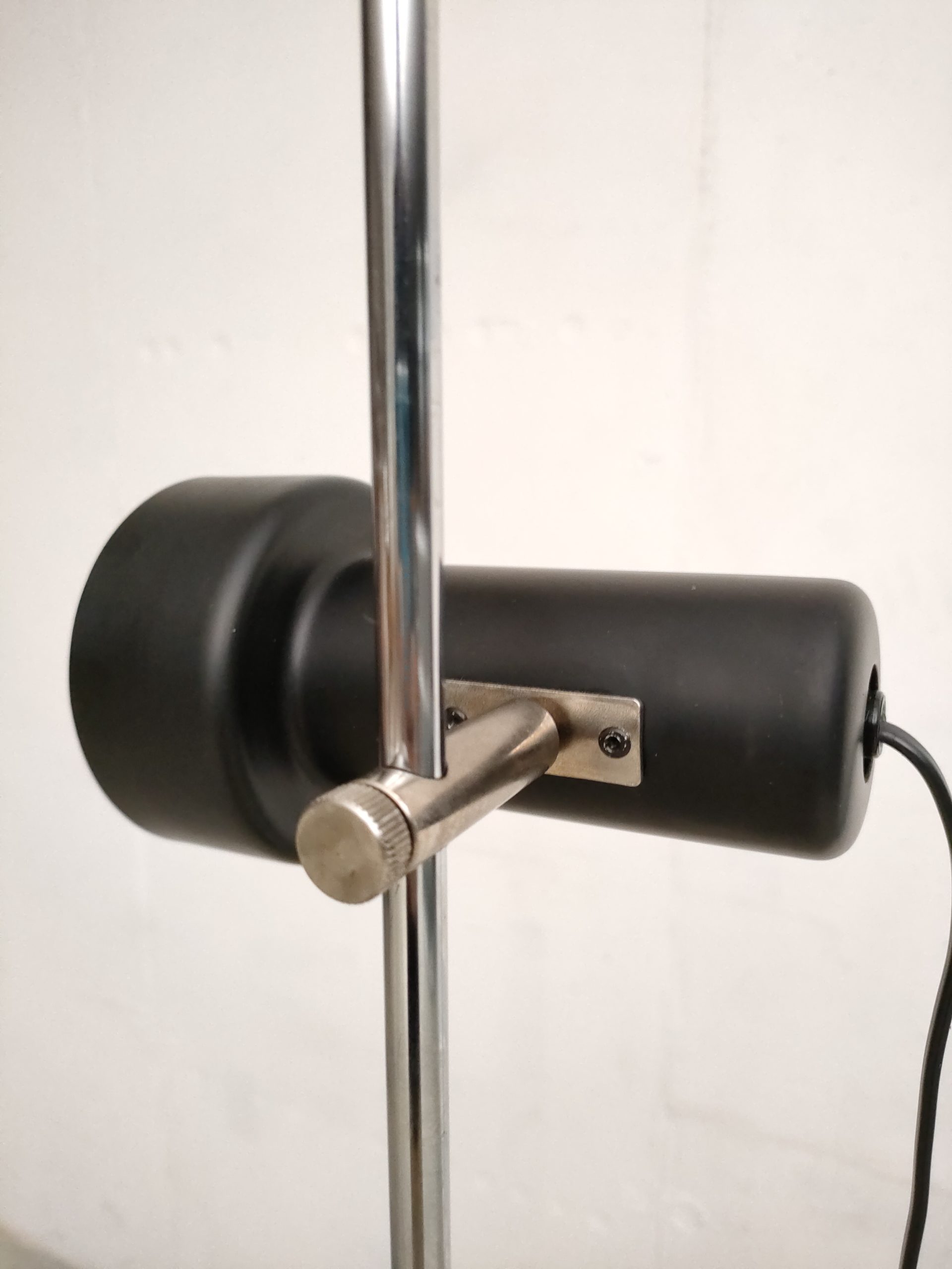 Produit venduLampe sur pied vintage avec spot et socle en métal noir et tige en métal chromé. Le spot peut être orienté dans toutes les directions et la hauteur est aussi réglable. Parfaitement stable et fonctionnelle.