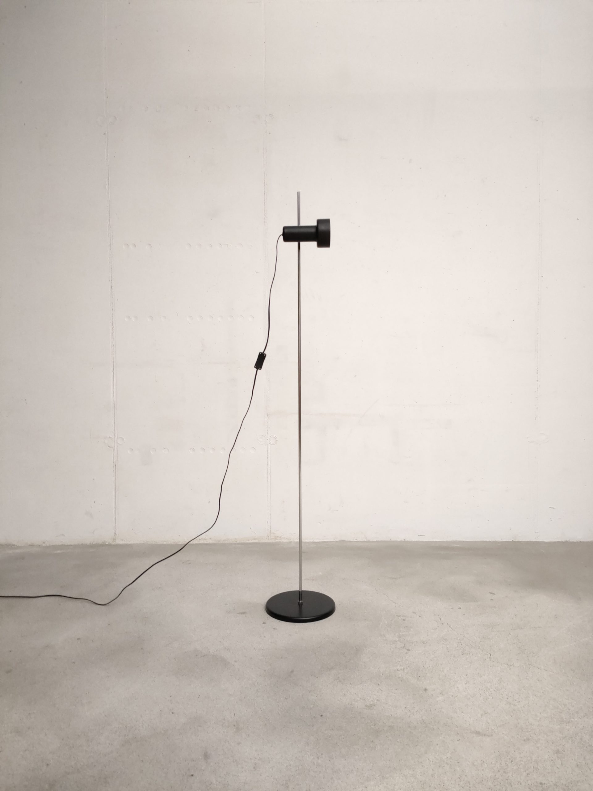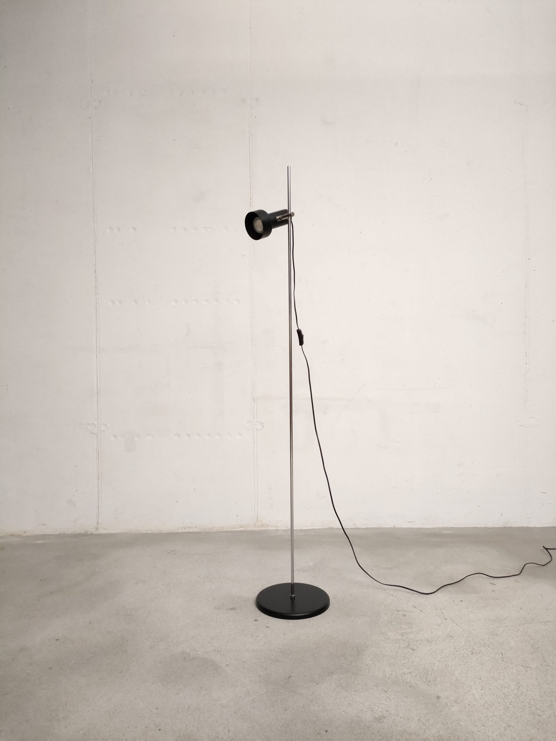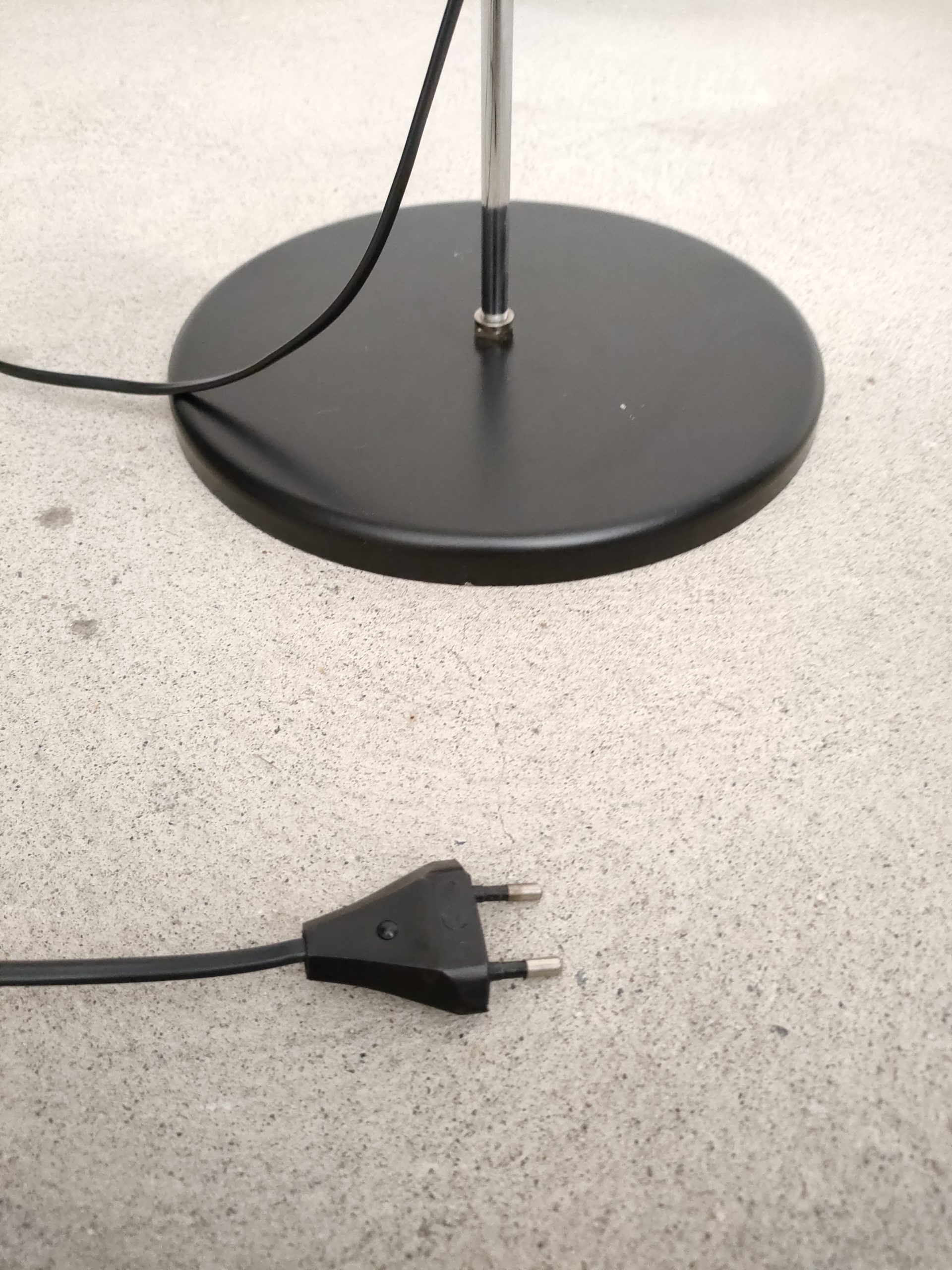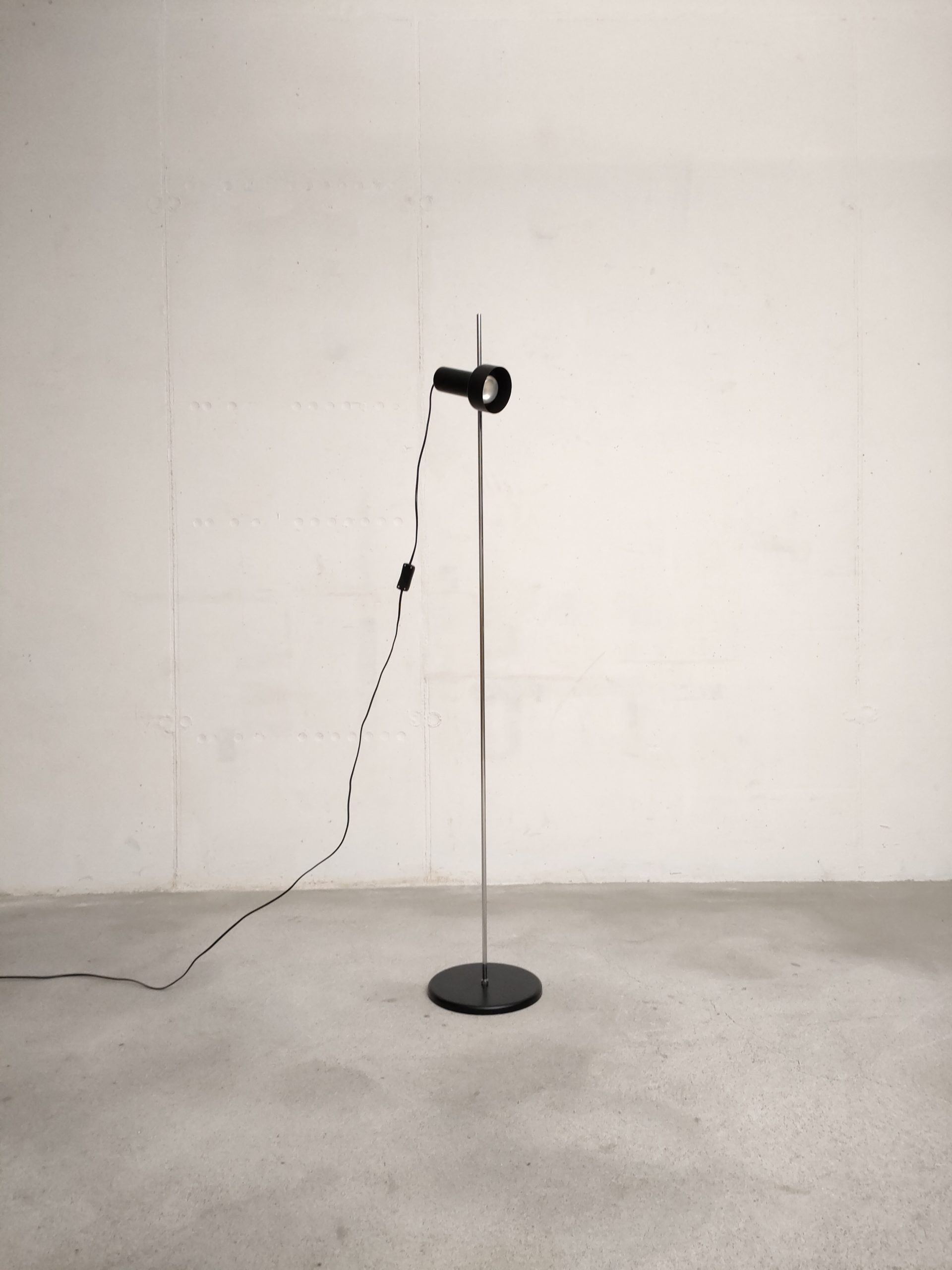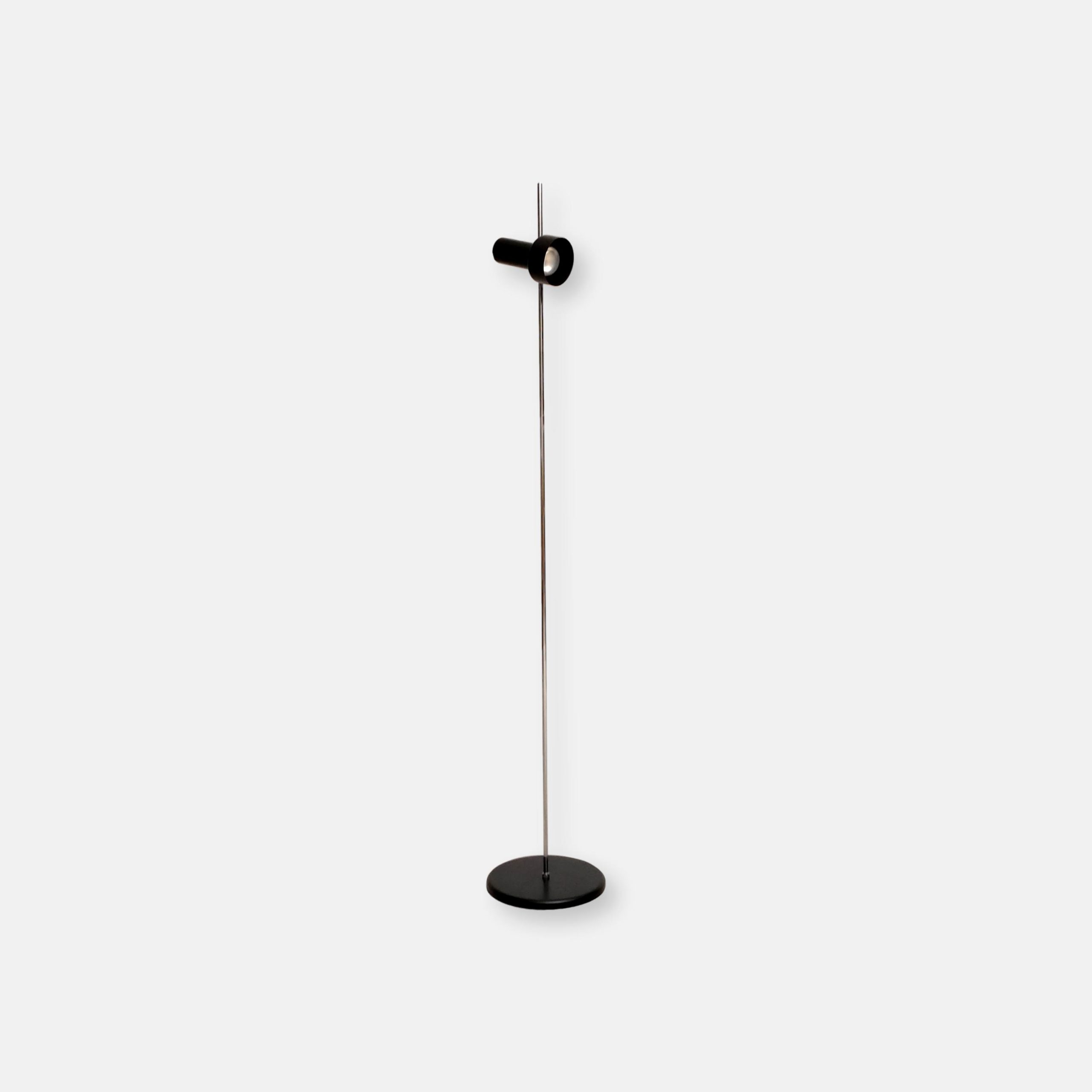 Produit venduLampe sur pied vintage avec spot et socle en métal noir et tige en métal chromé. Le spot peut être orienté dans toutes les directions et la hauteur est aussi réglable. Parfaitement stable et fonctionnelle.