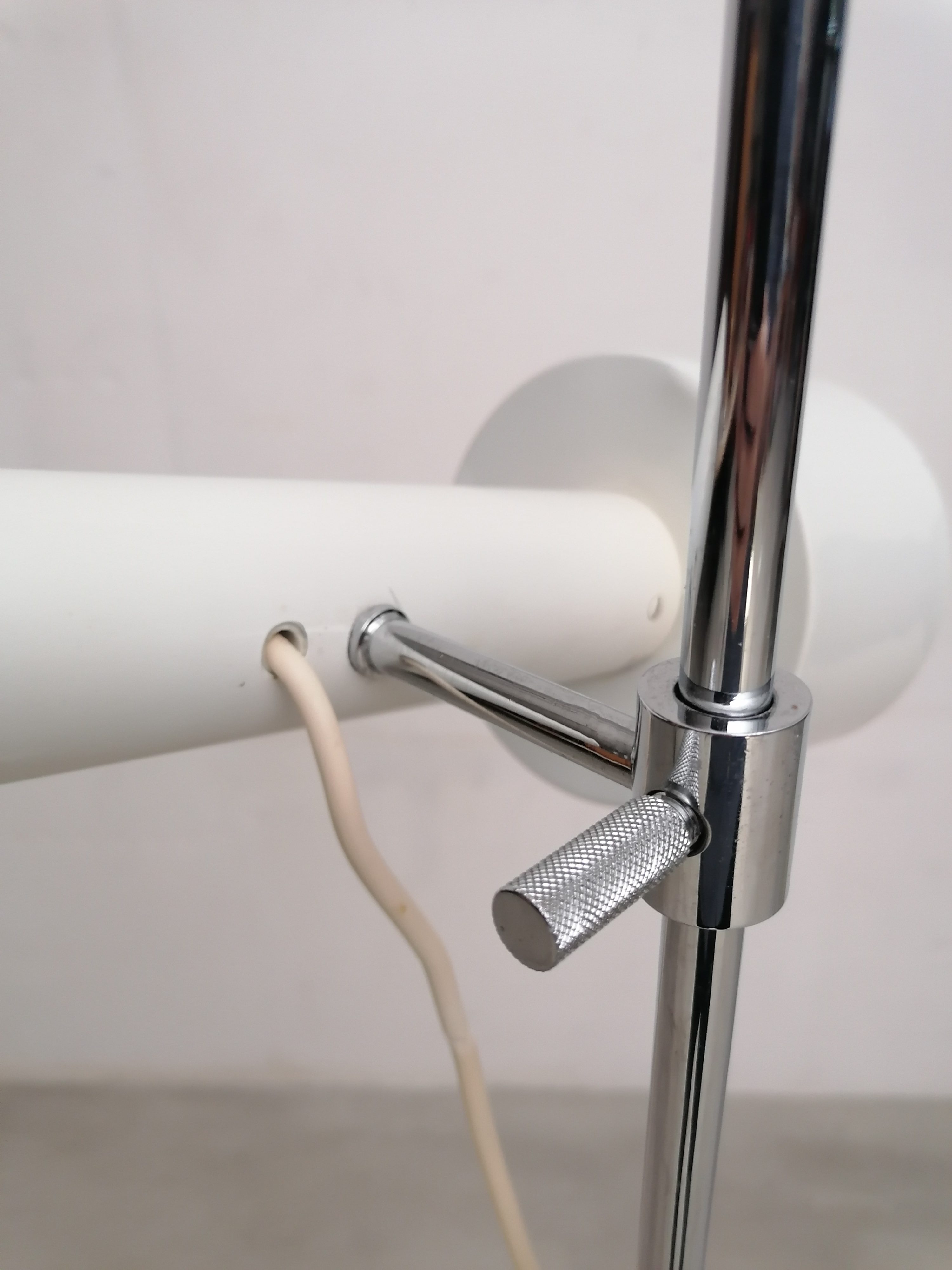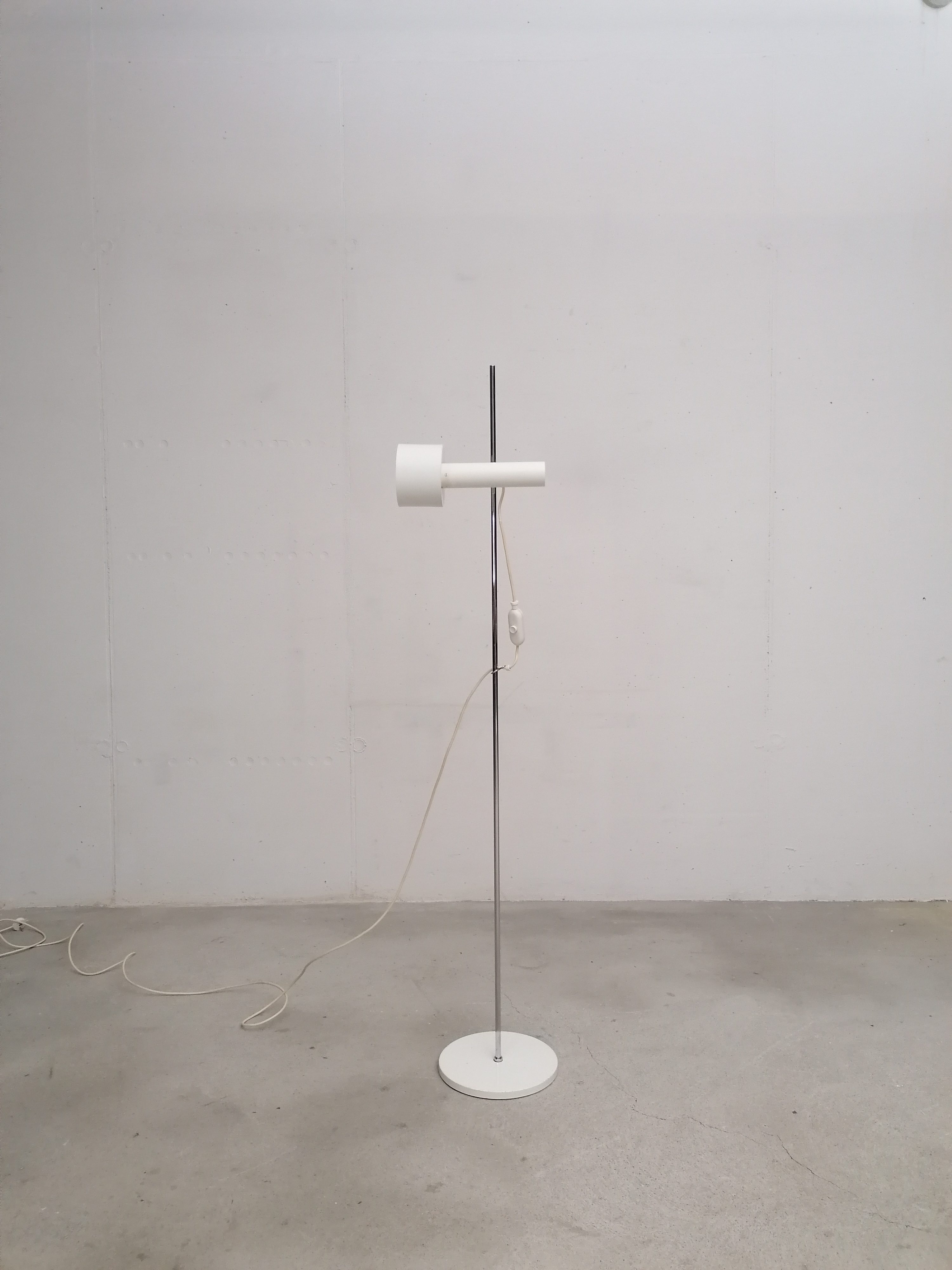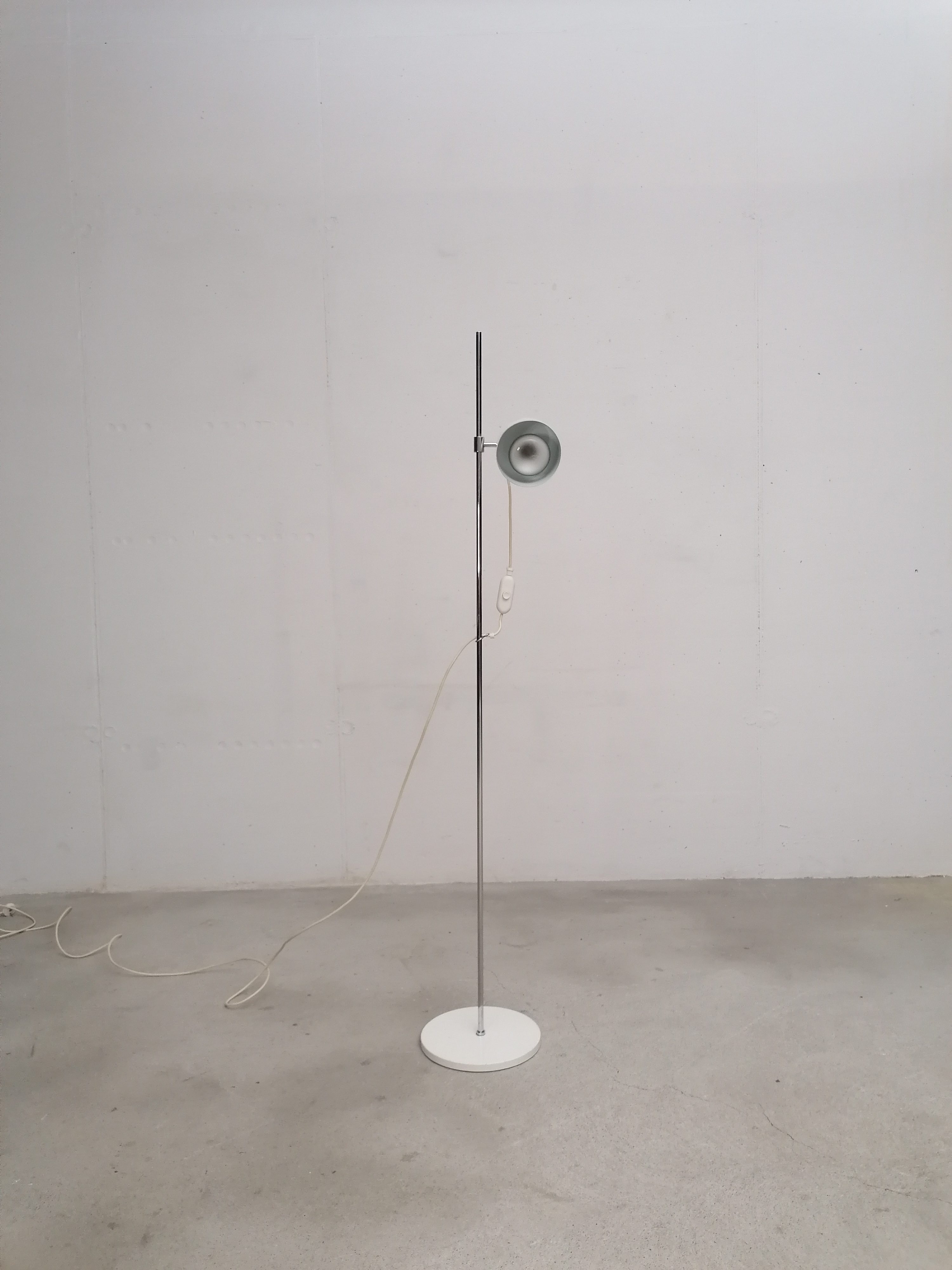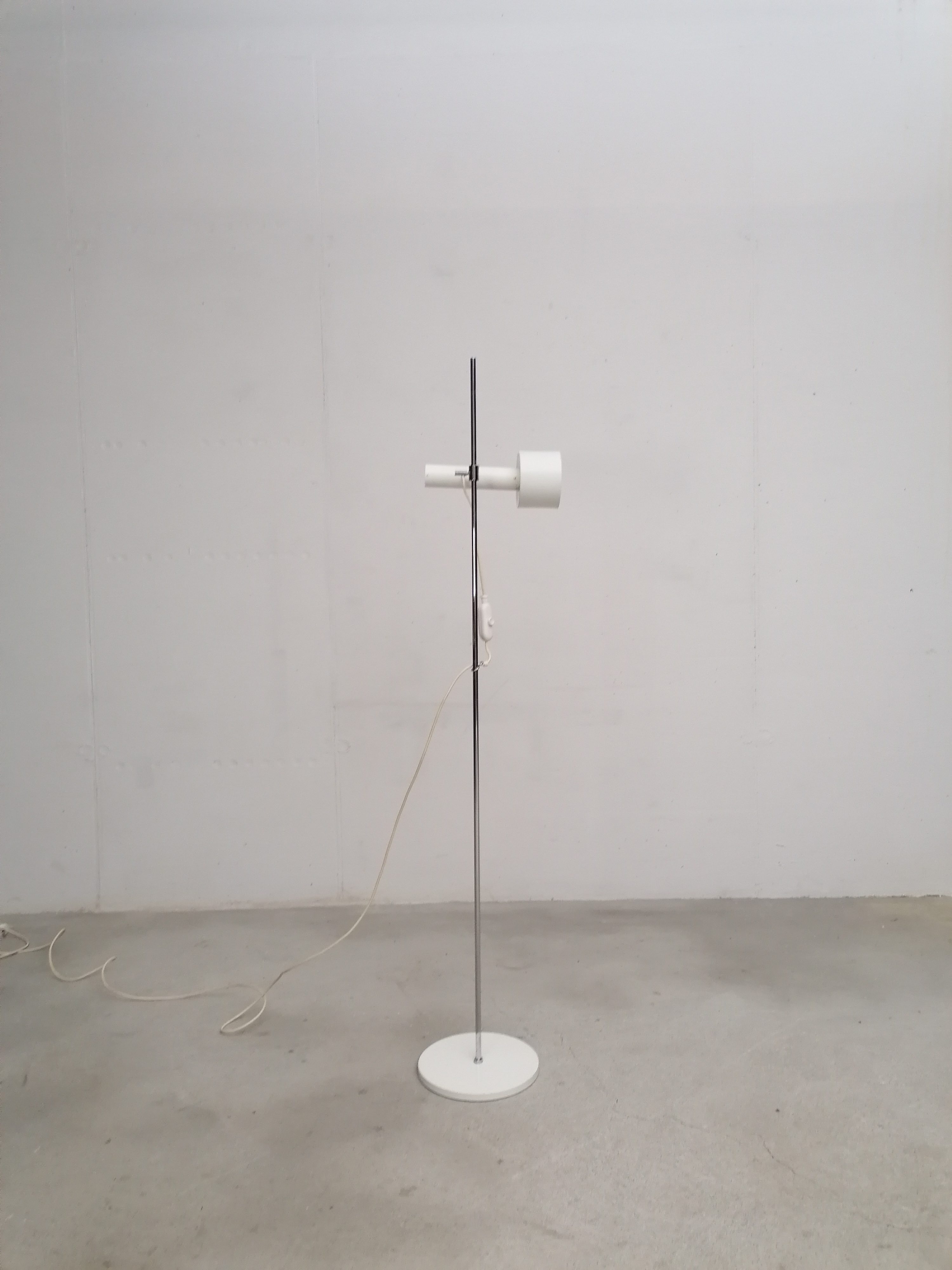 Produit venduLampe sur pied vintage avec spot et socle en métal blanc et tige en métal chromé. Le spot peut être orienté dans toutes les directions et la hauteur est aussi réglable. Quelques traces d’usure sont présentes ainsi qu’un léger beugne sur le spot (voir photos). Parfaitement stable et fonctionnelle.