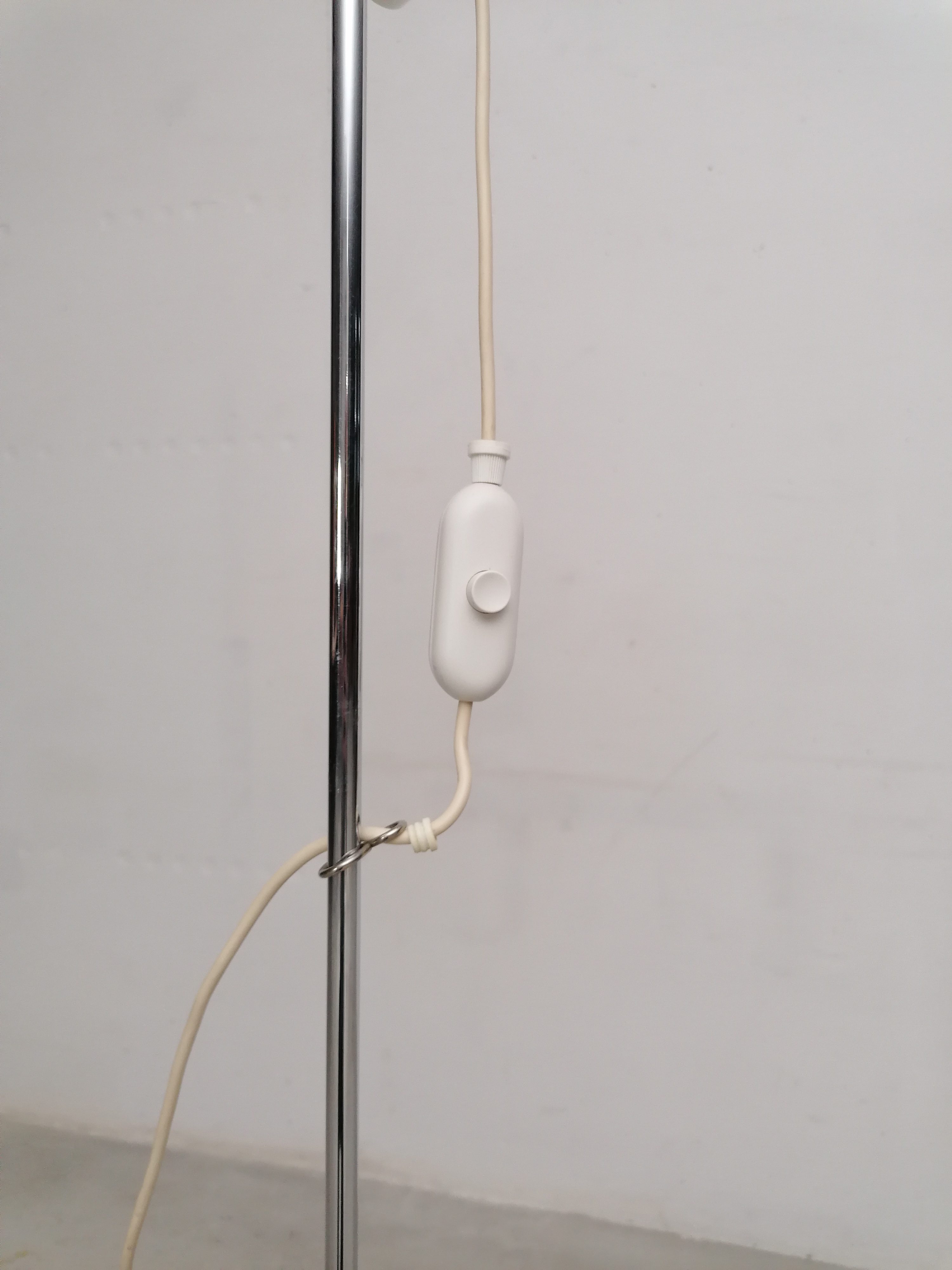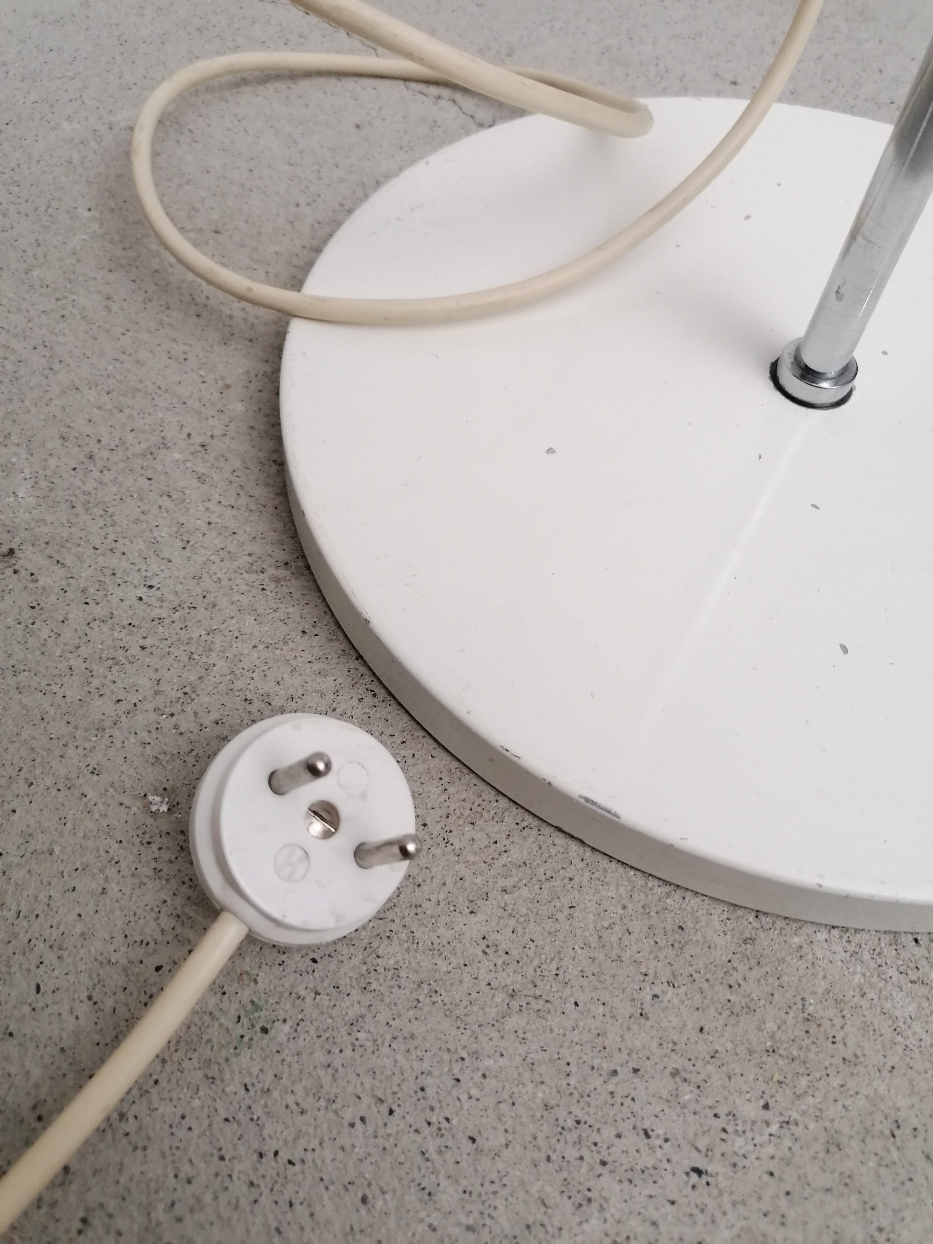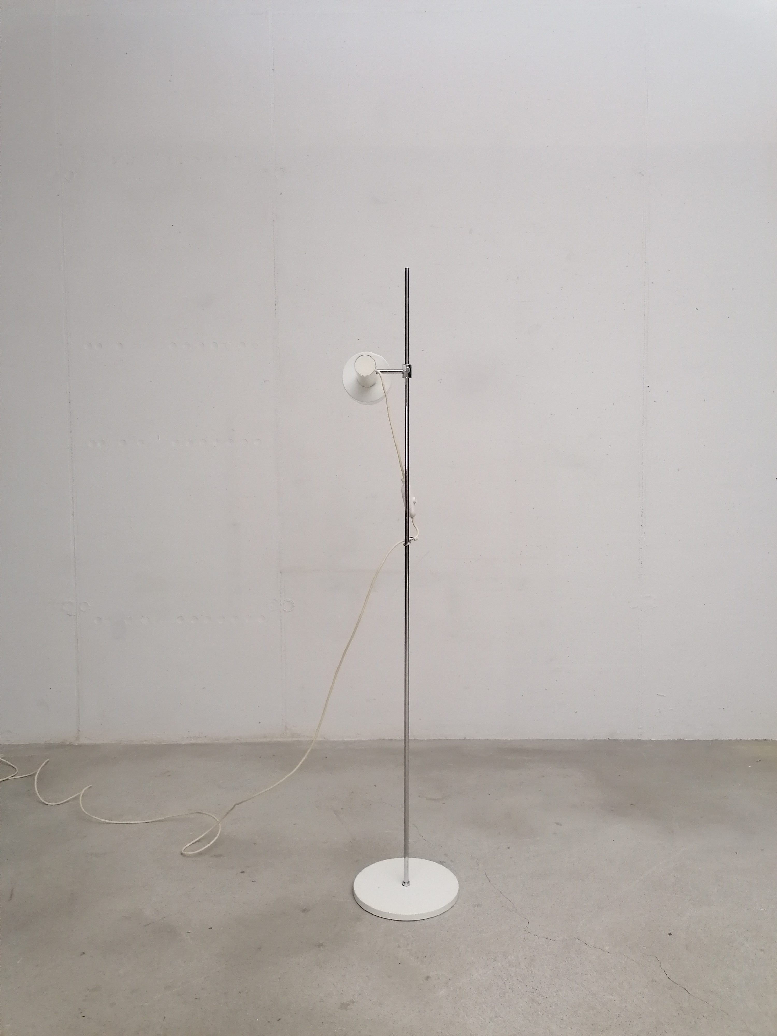 Produit venduLampe sur pied vintage avec spot et socle en métal blanc et tige en métal chromé. Le spot peut être orienté dans toutes les directions et la hauteur est aussi réglable. Quelques traces d’usure sont présentes ainsi qu’un léger beugne sur le spot (voir photos). Parfaitement stable et fonctionnelle.