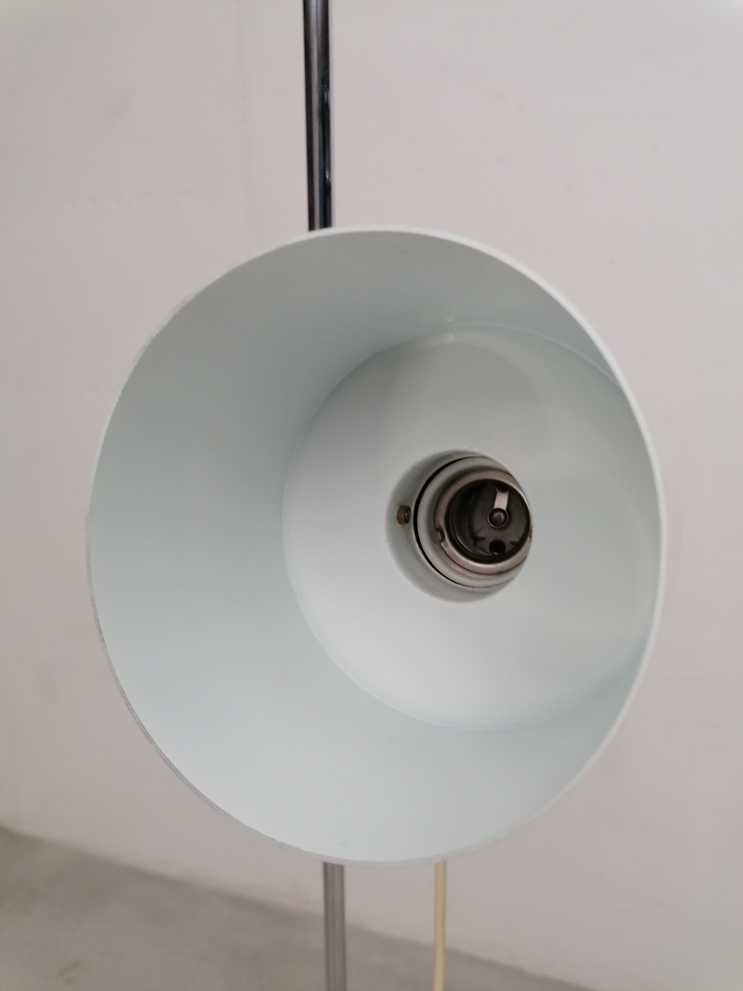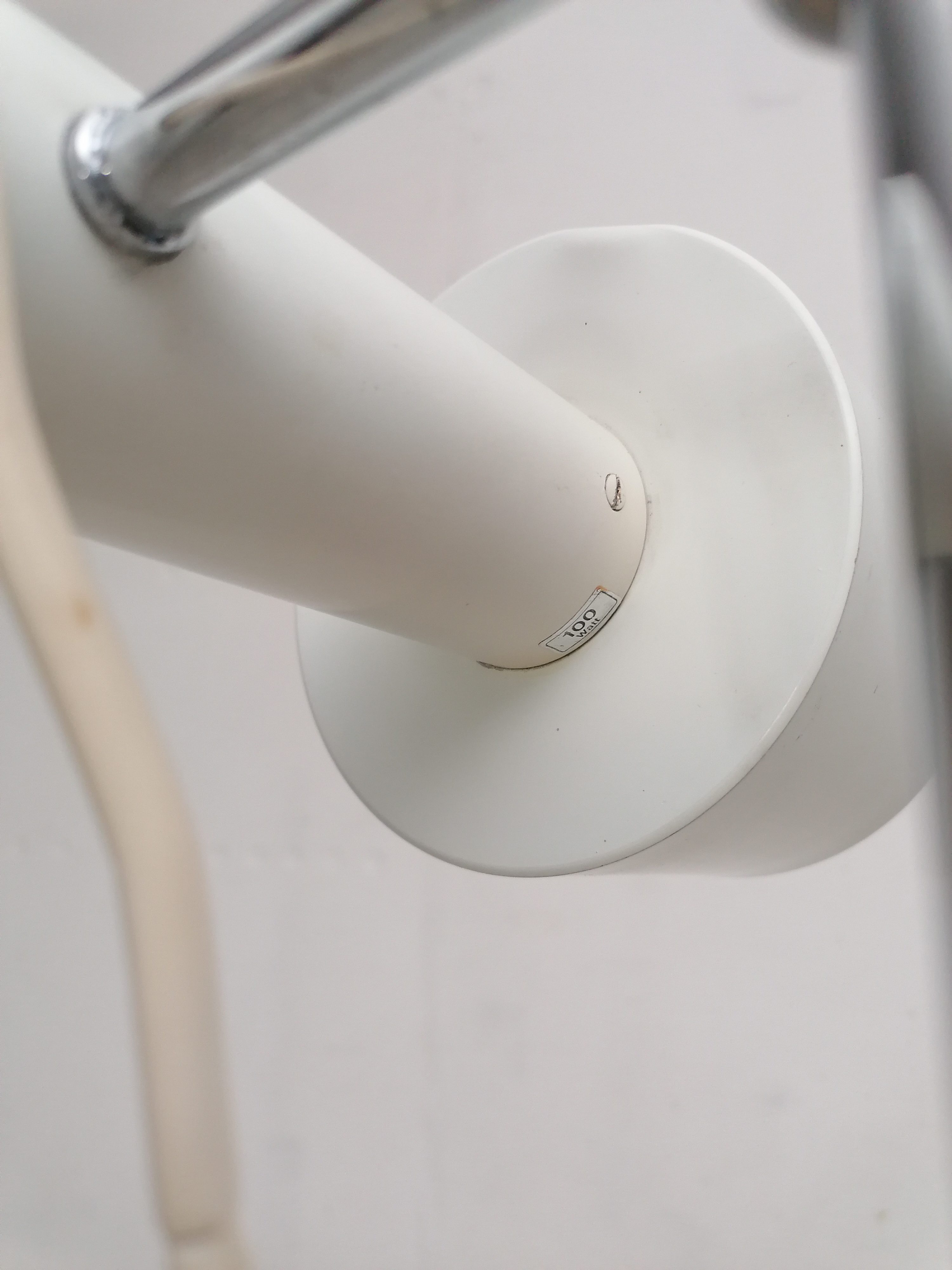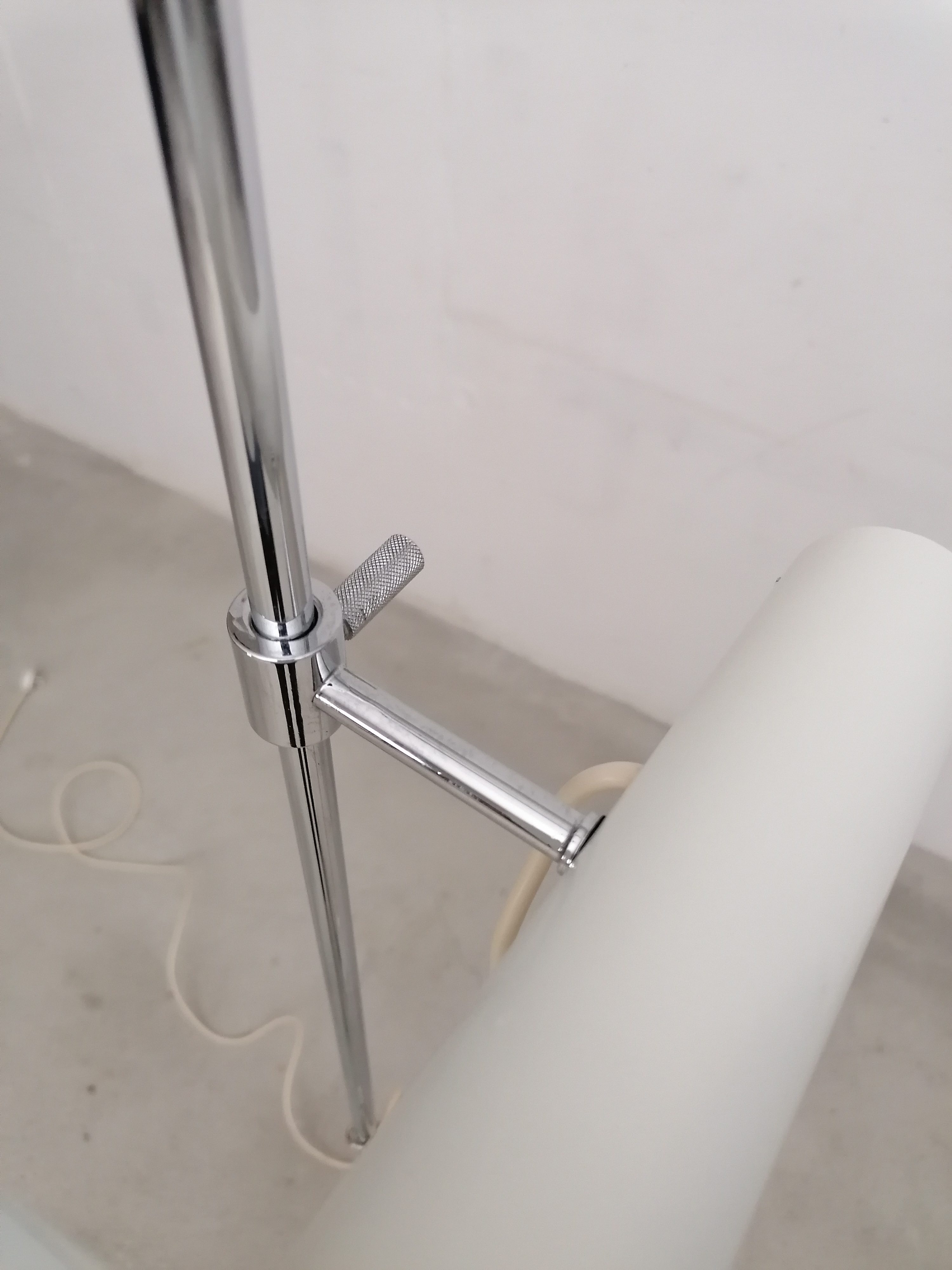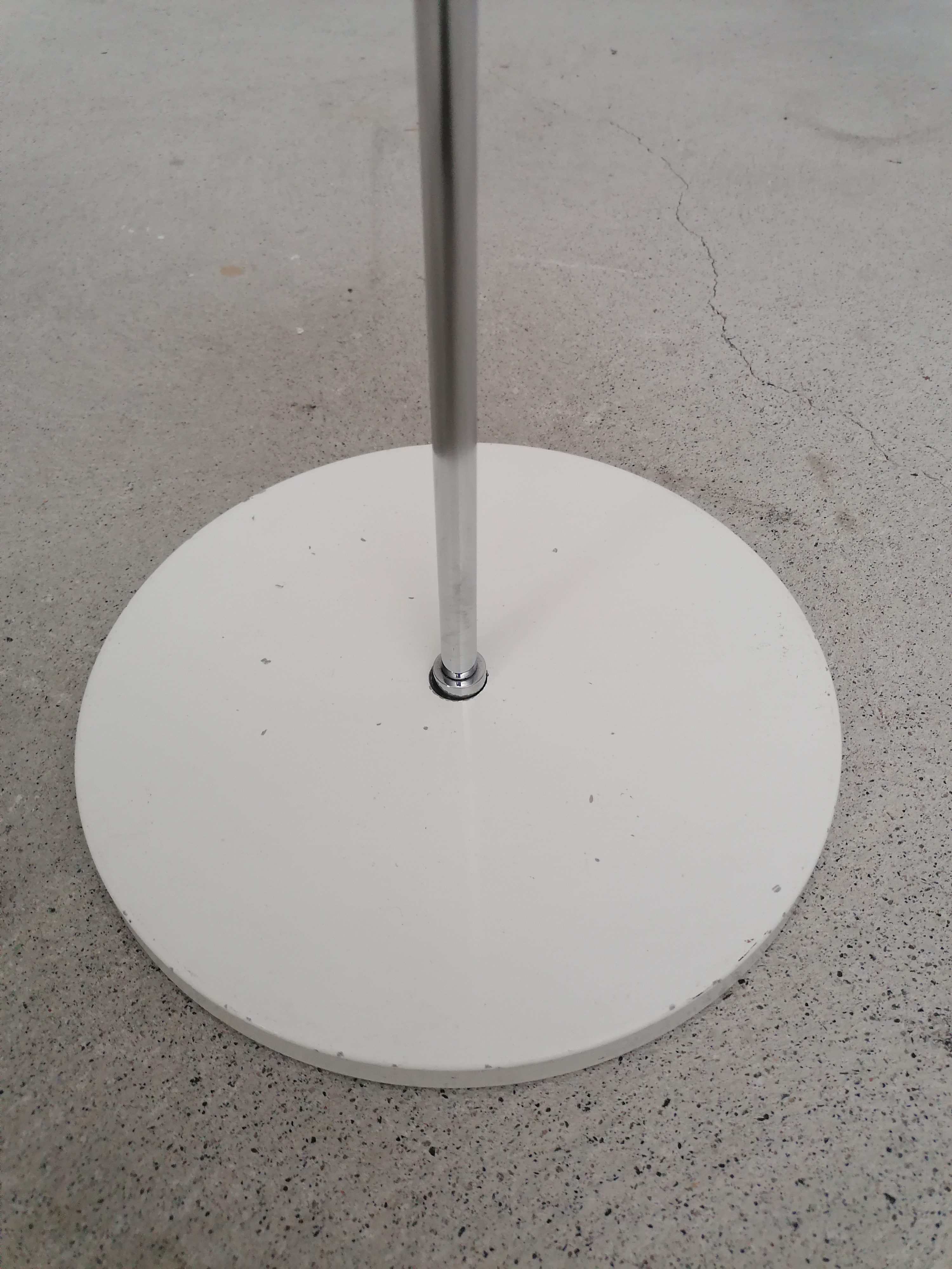 Produit venduLampe sur pied vintage avec spot et socle en métal blanc et tige en métal chromé. Le spot peut être orienté dans toutes les directions et la hauteur est aussi réglable. Quelques traces d’usure sont présentes ainsi qu’un léger beugne sur le spot (voir photos). Parfaitement stable et fonctionnelle.