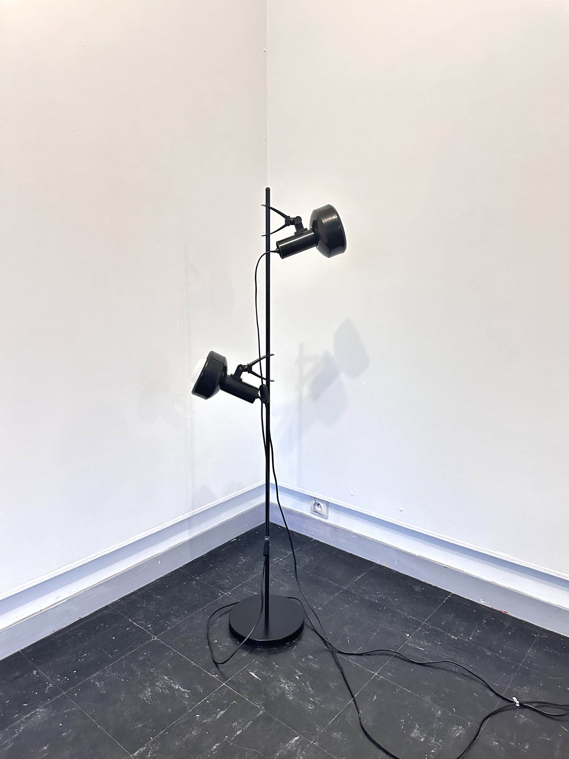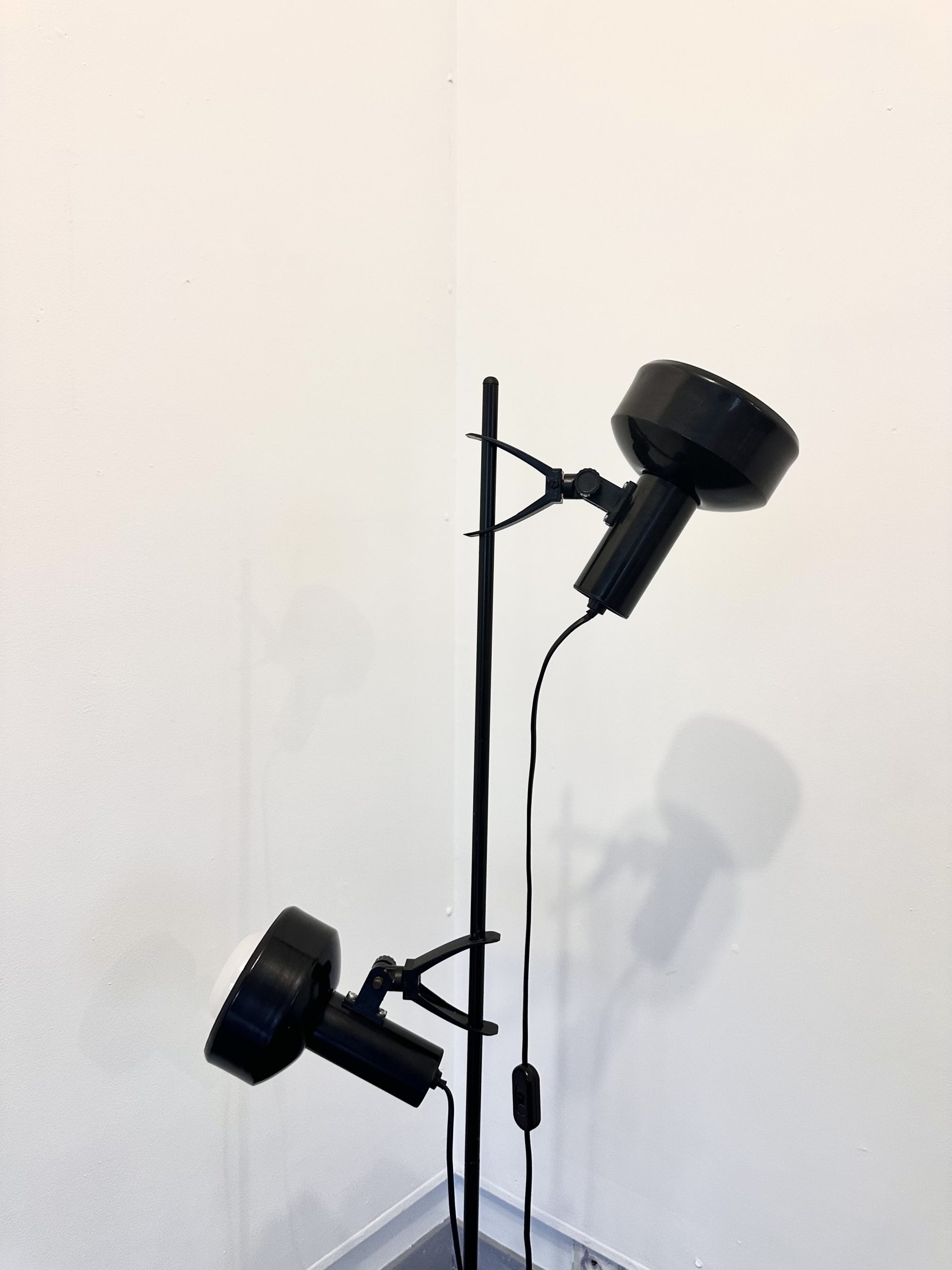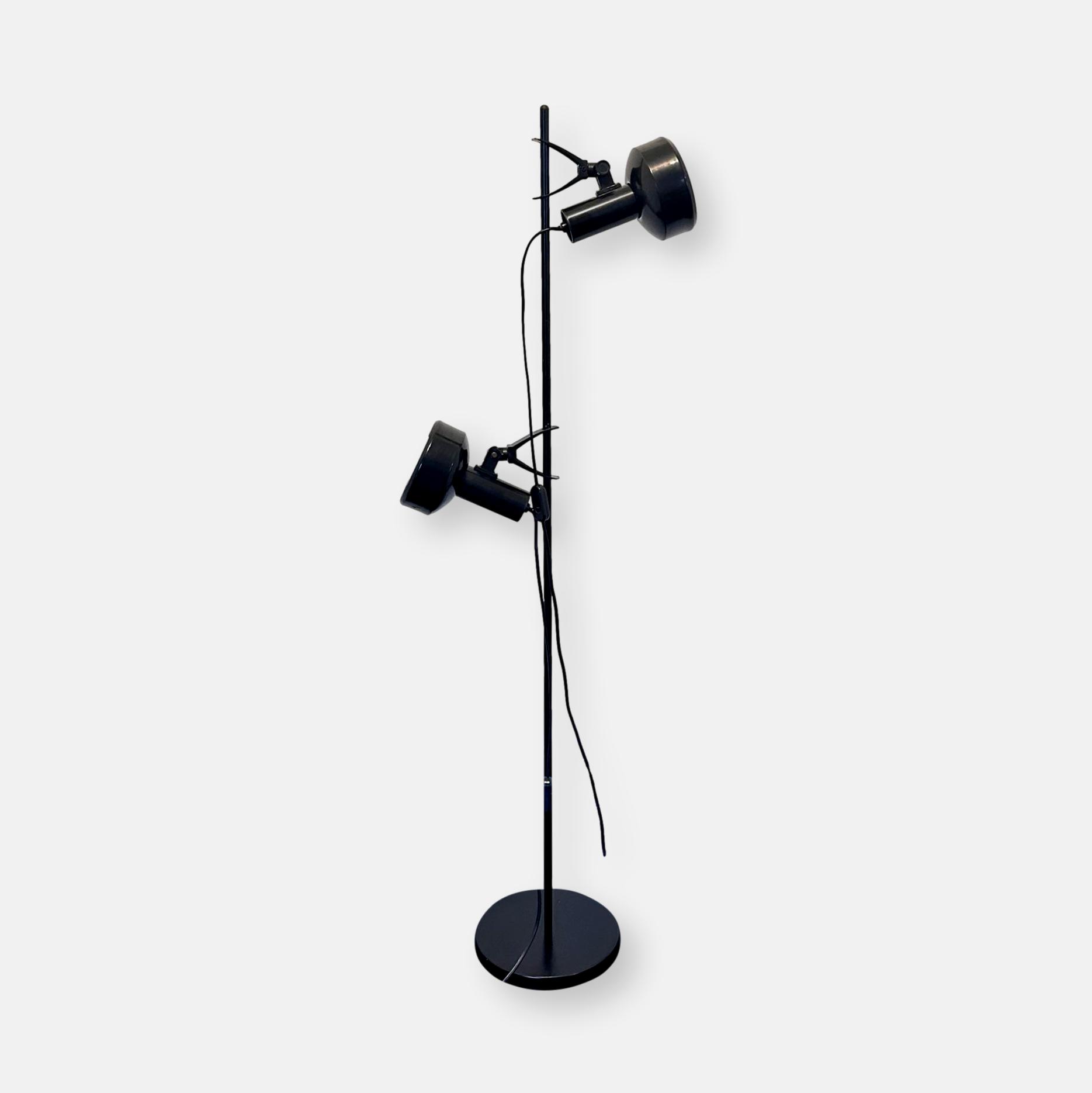 Il s’agit d’une lampe sur pied vintage à deux spots orientables, en métal laqué noir et éléments en plastique, typique de la fin des années 1970 et du début des années 1980.