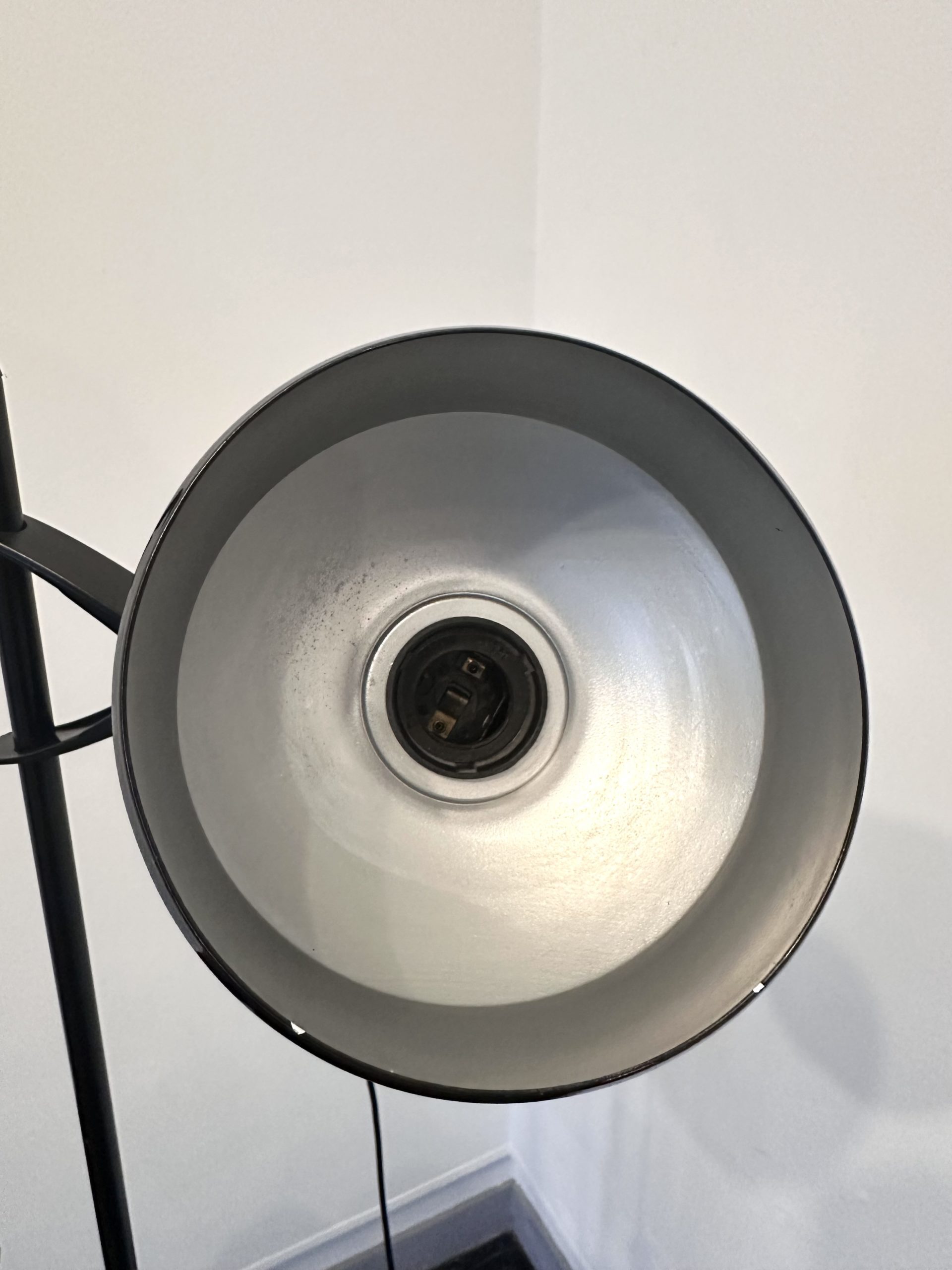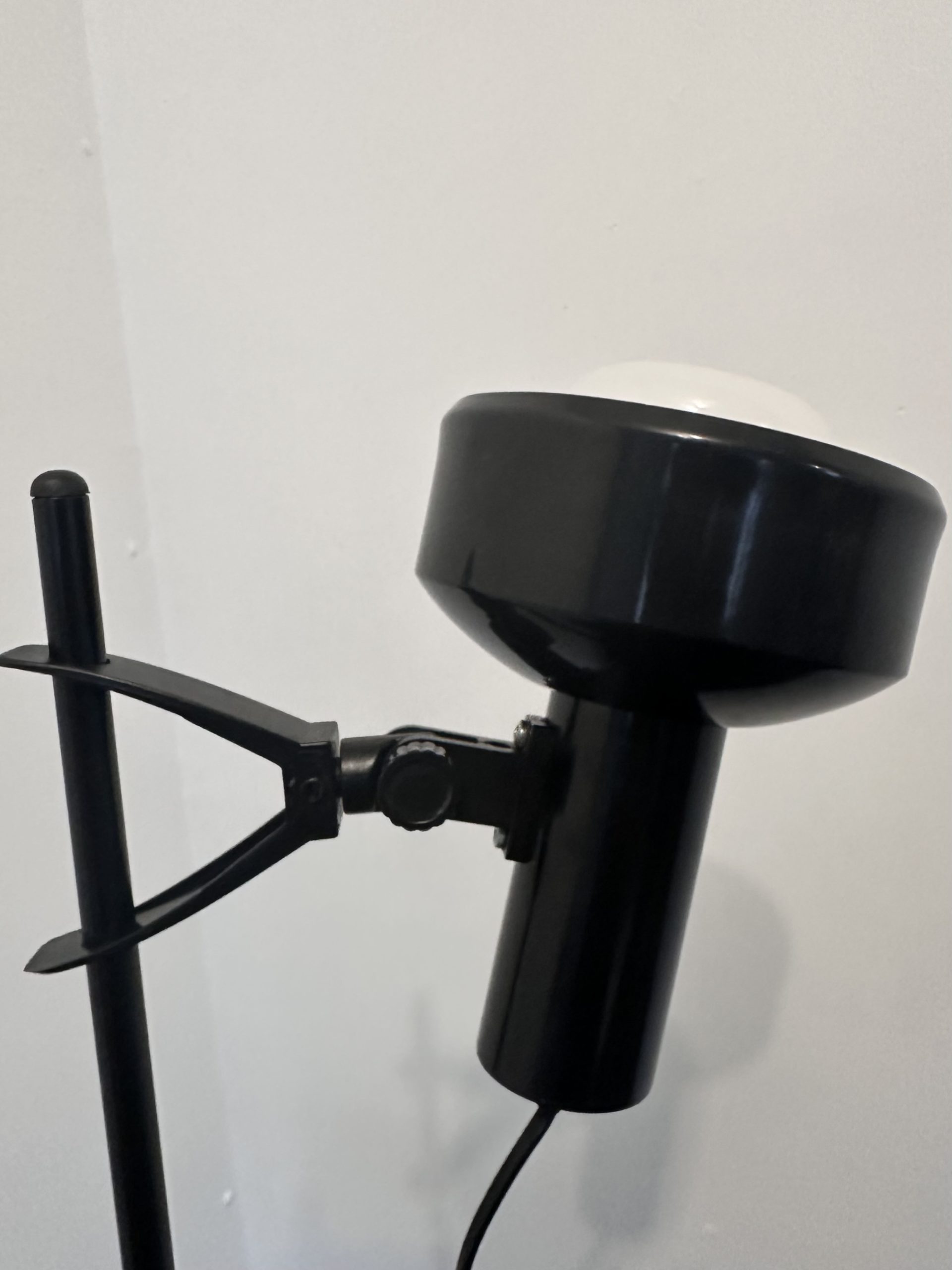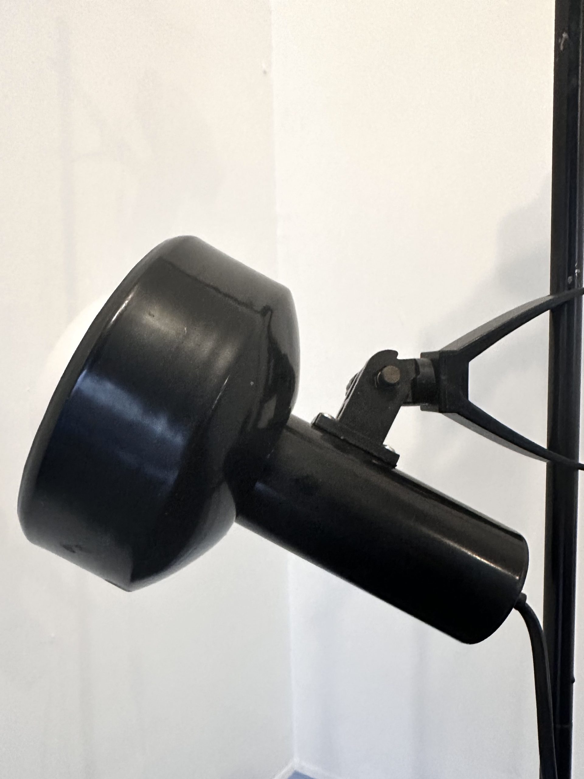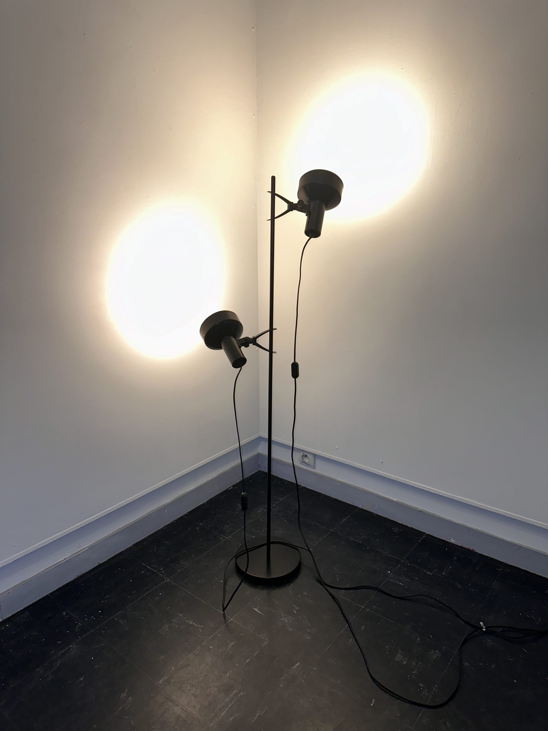 Il s’agit d’une lampe sur pied vintage à deux spots orientables, en métal laqué noir et éléments en plastique, typique de la fin des années 1970 et du début des années 1980.