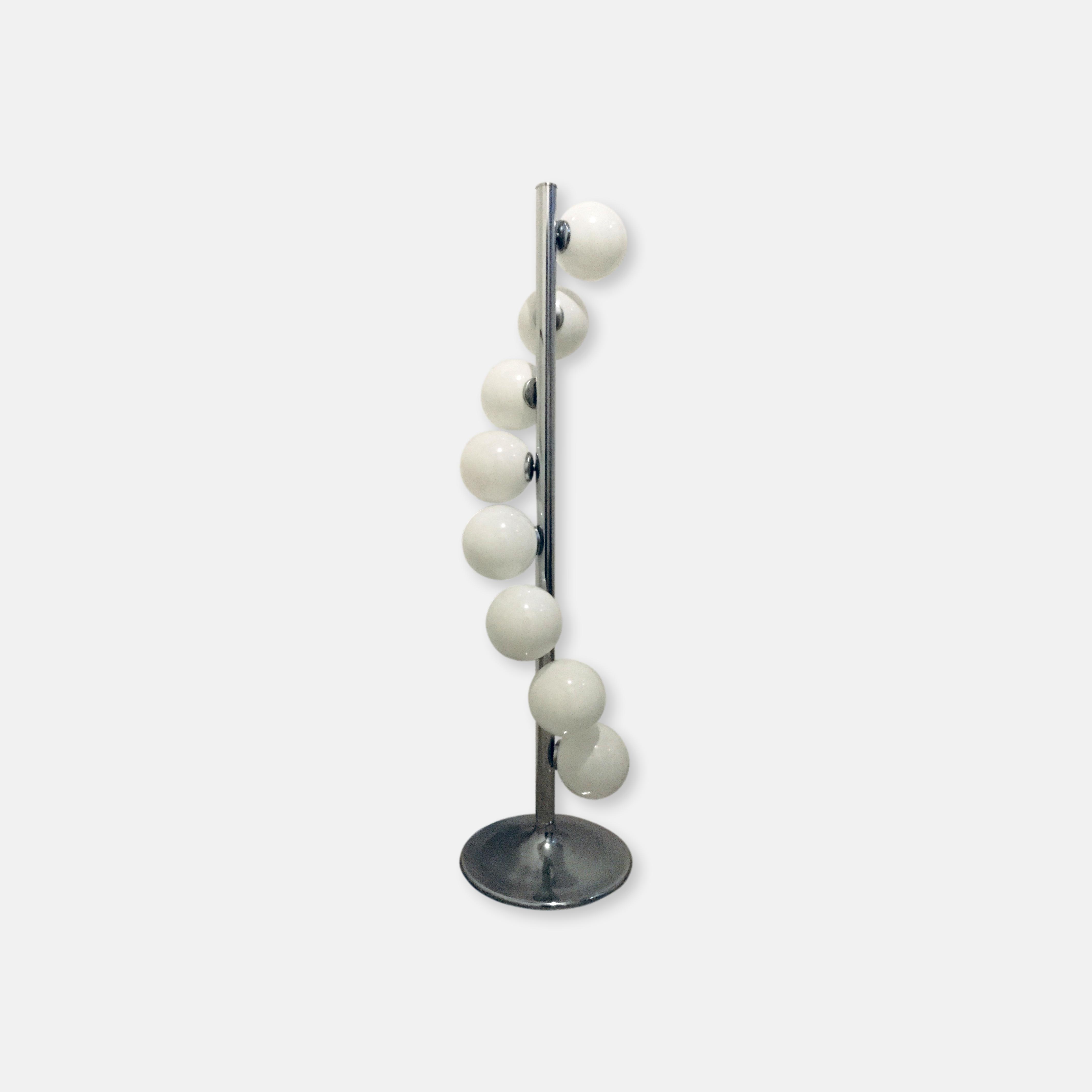 Produit venduStehkugelleuchte Chrom mit acht spiralförmig aufgereihten Glaskugeln aus den 70er Jahren.