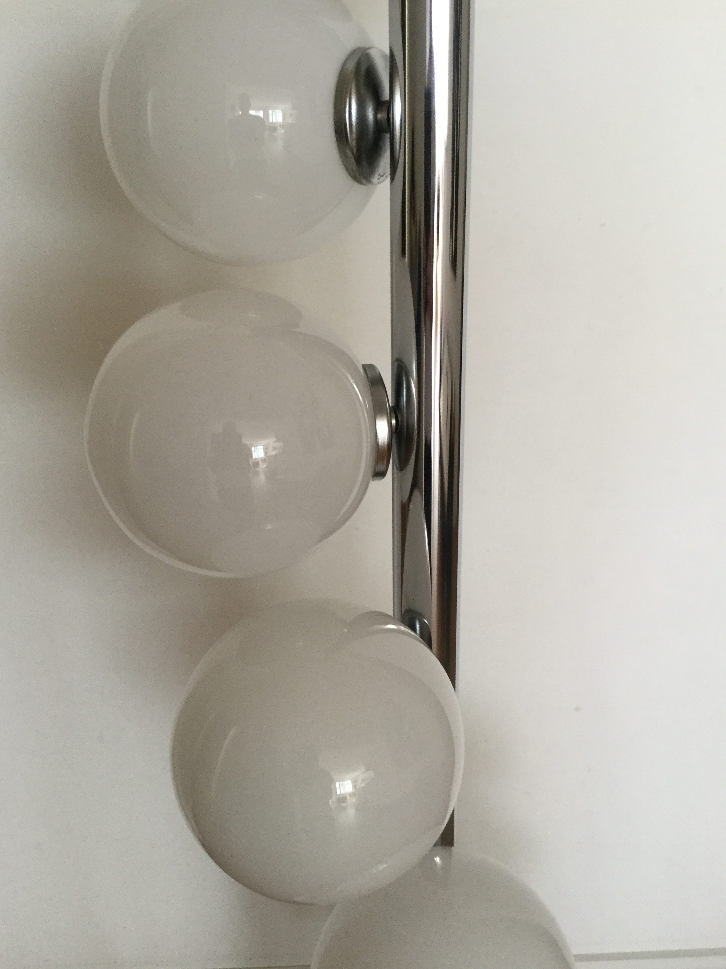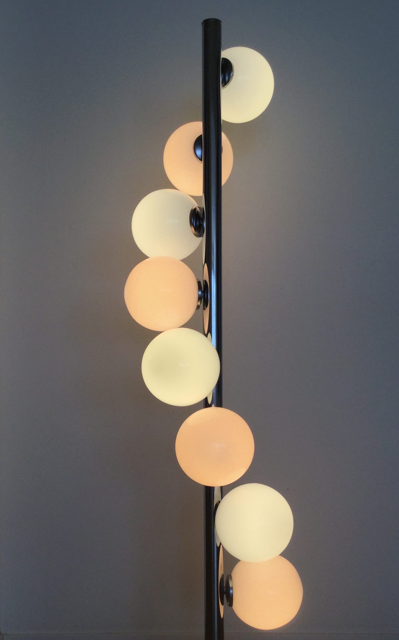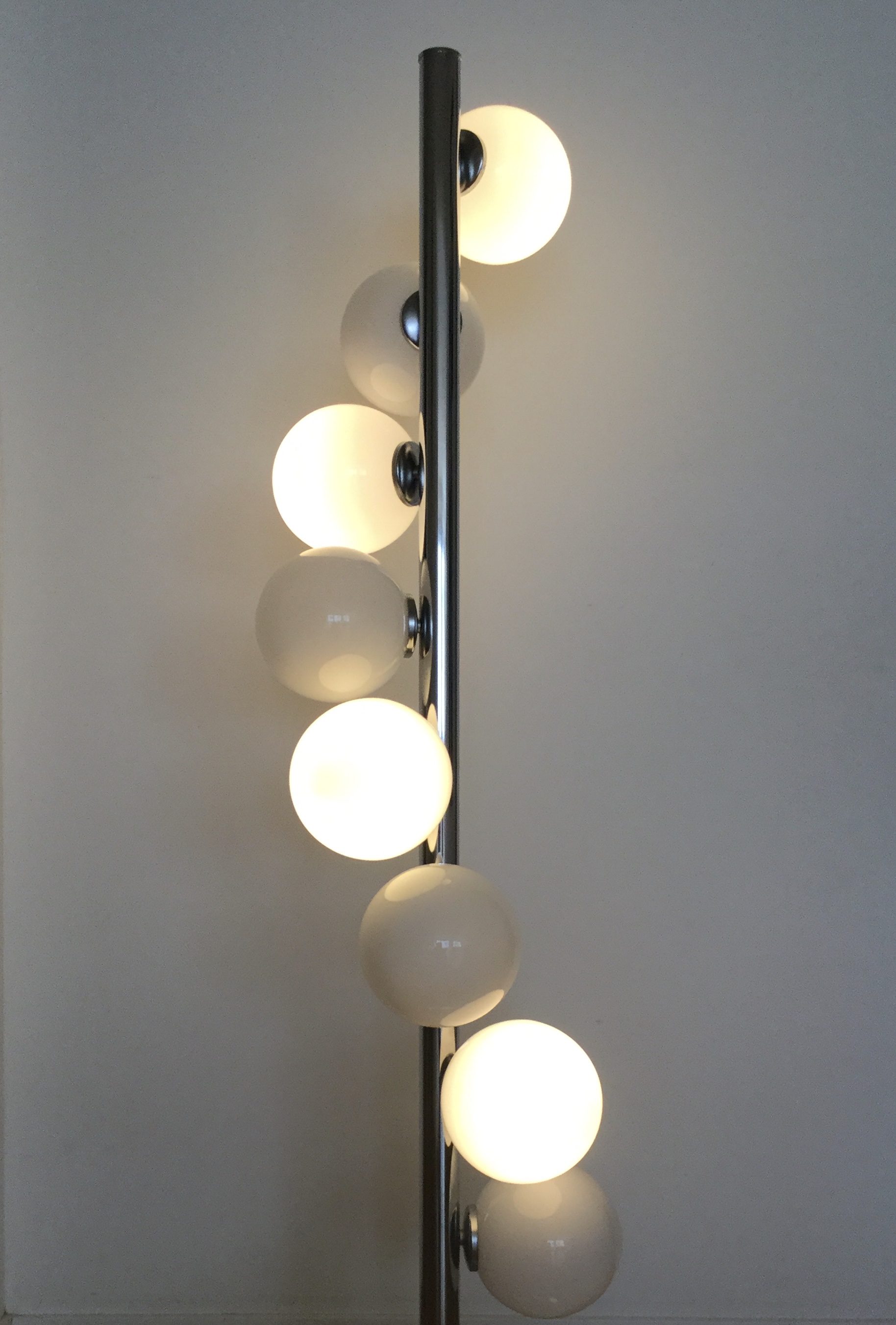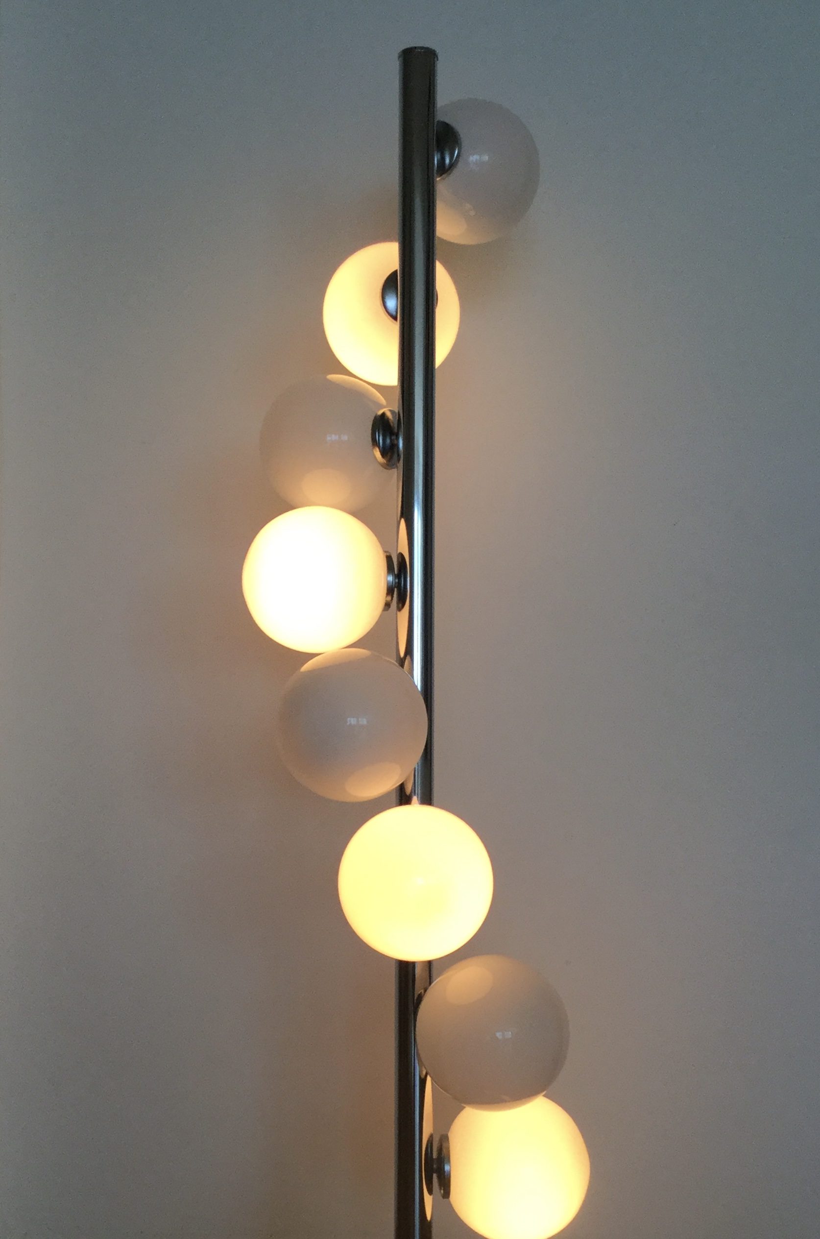 Lampadaire chromé avec huit boules de verre en spirale des années 70.