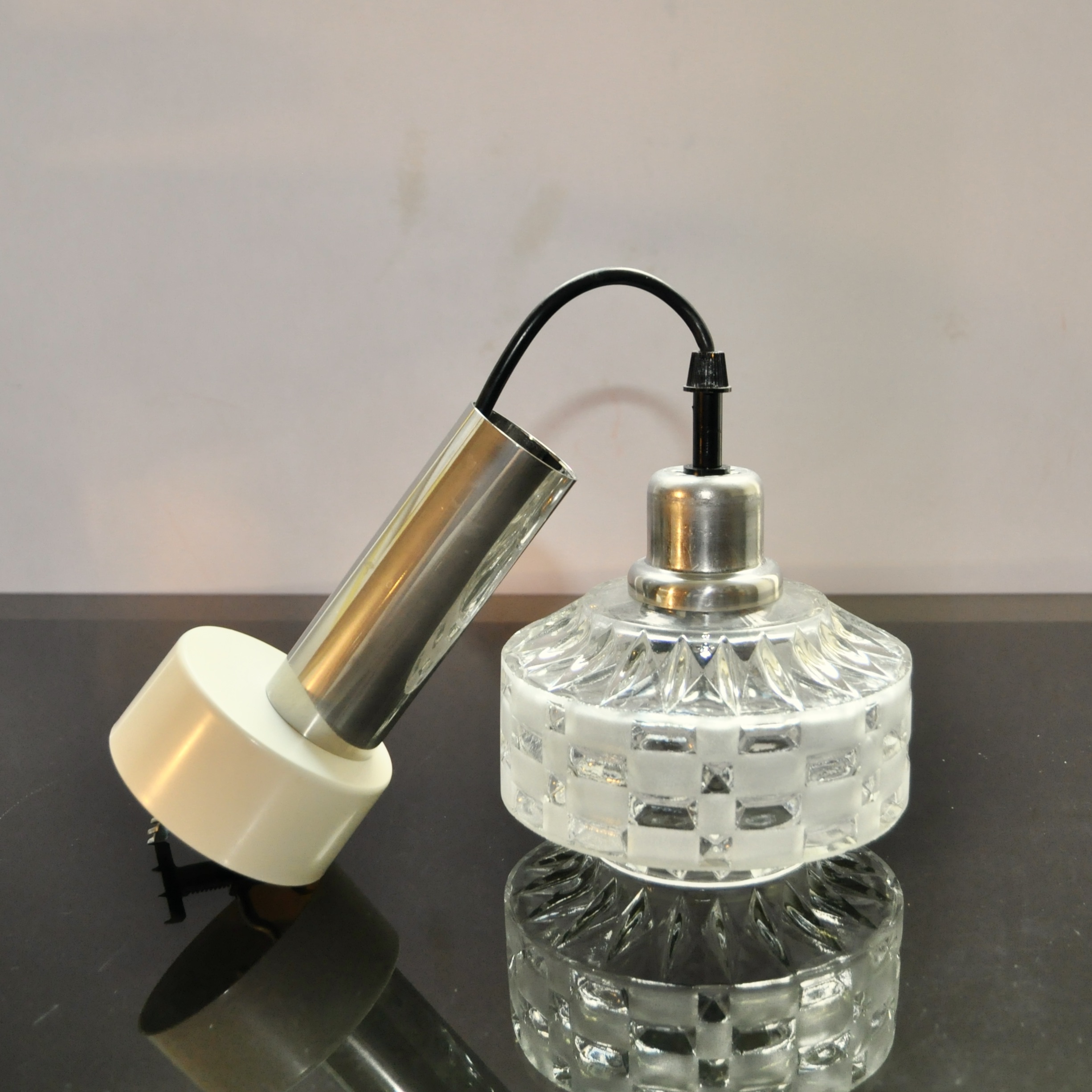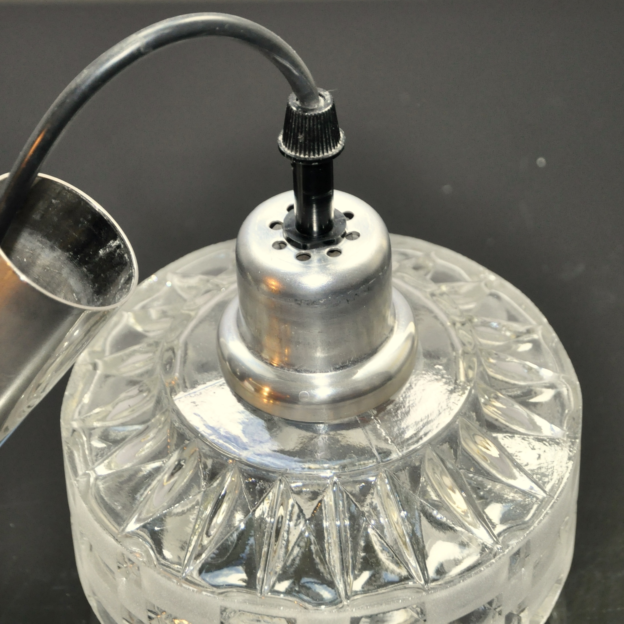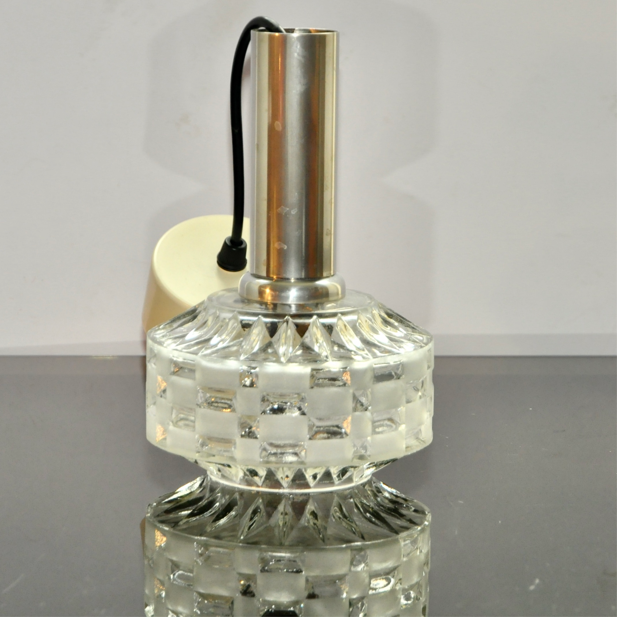 Lampe à suspension en tubulaire chromé et en verre des années 70. L’abat-jour en verre moulé est constitué d’un décor géométrique en relief composé de rectangles alternativement en verre givré et transparent. Son design space age peut faire penser au modèle UFO des années 50. La lampe est en parfait état.