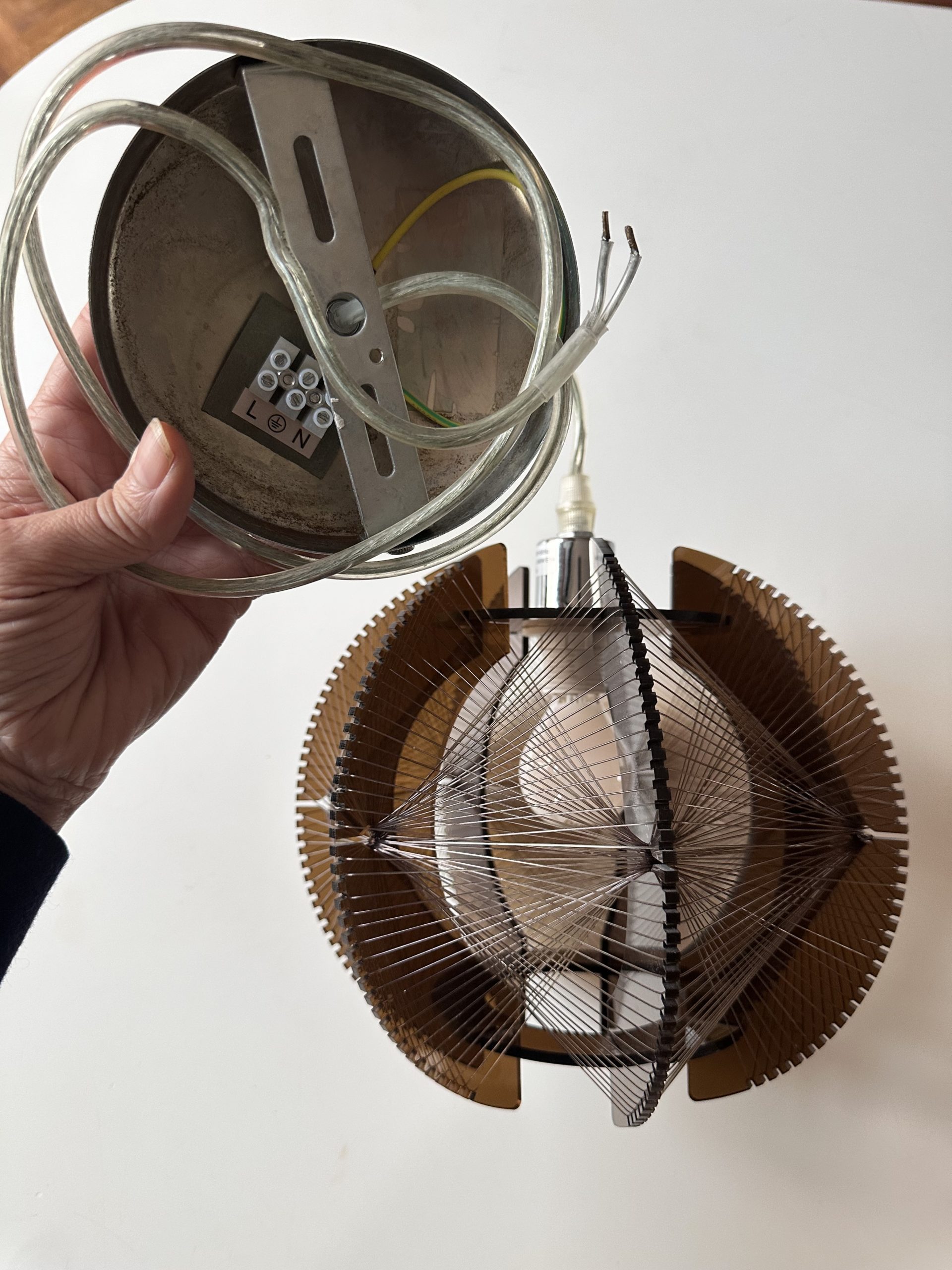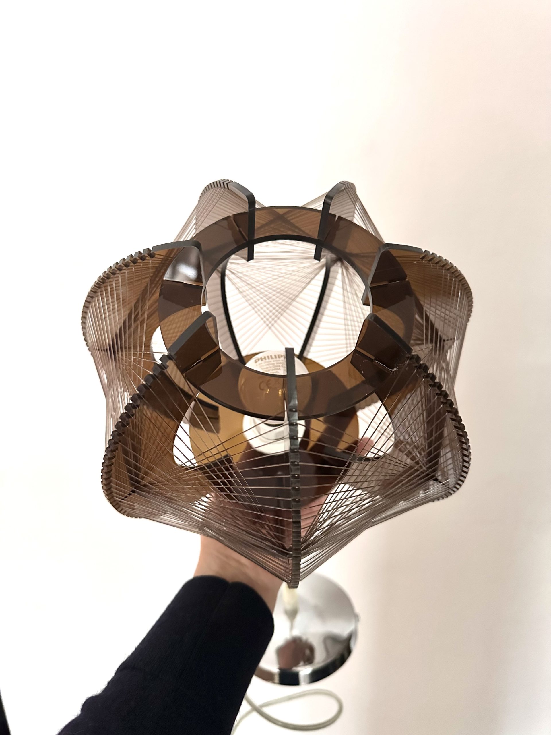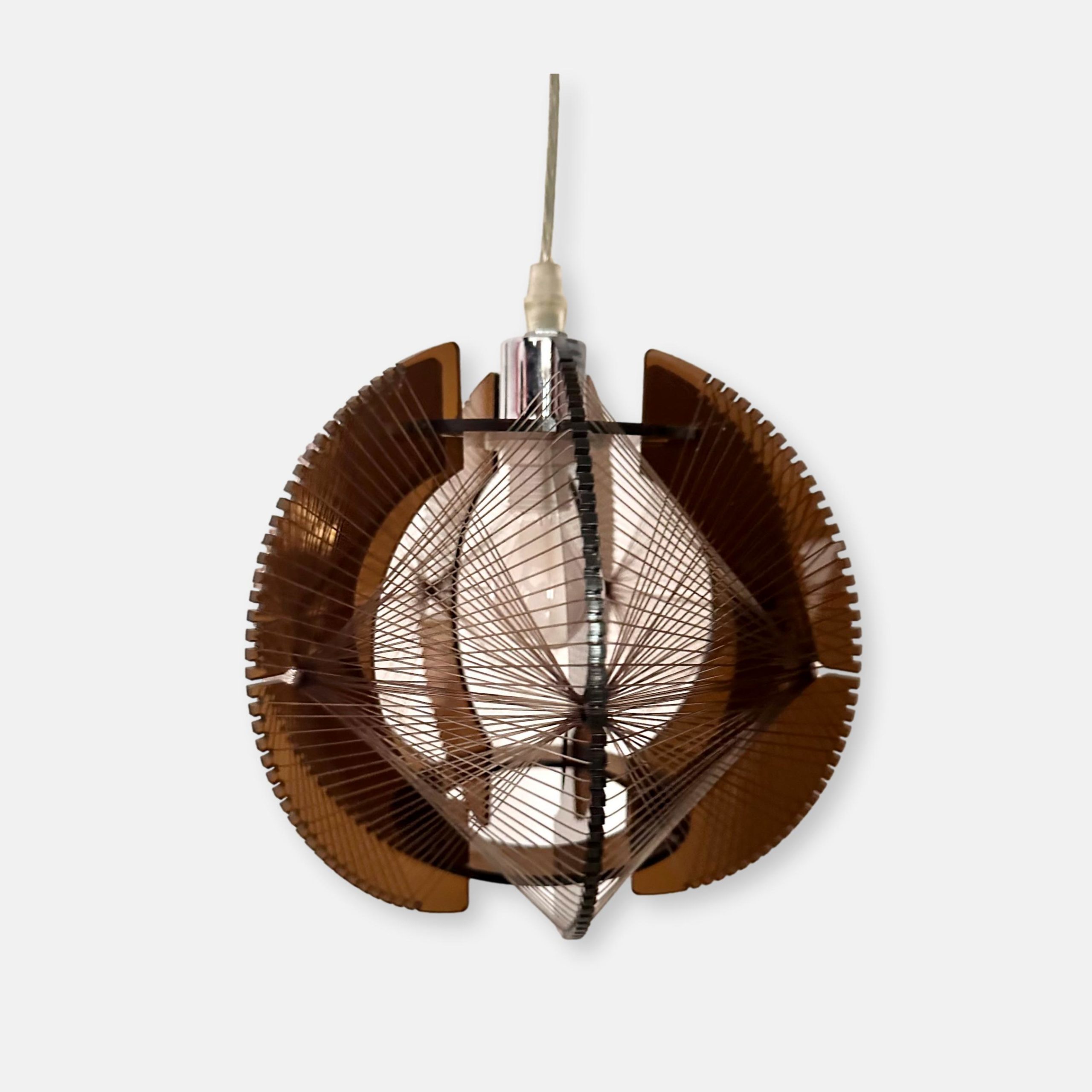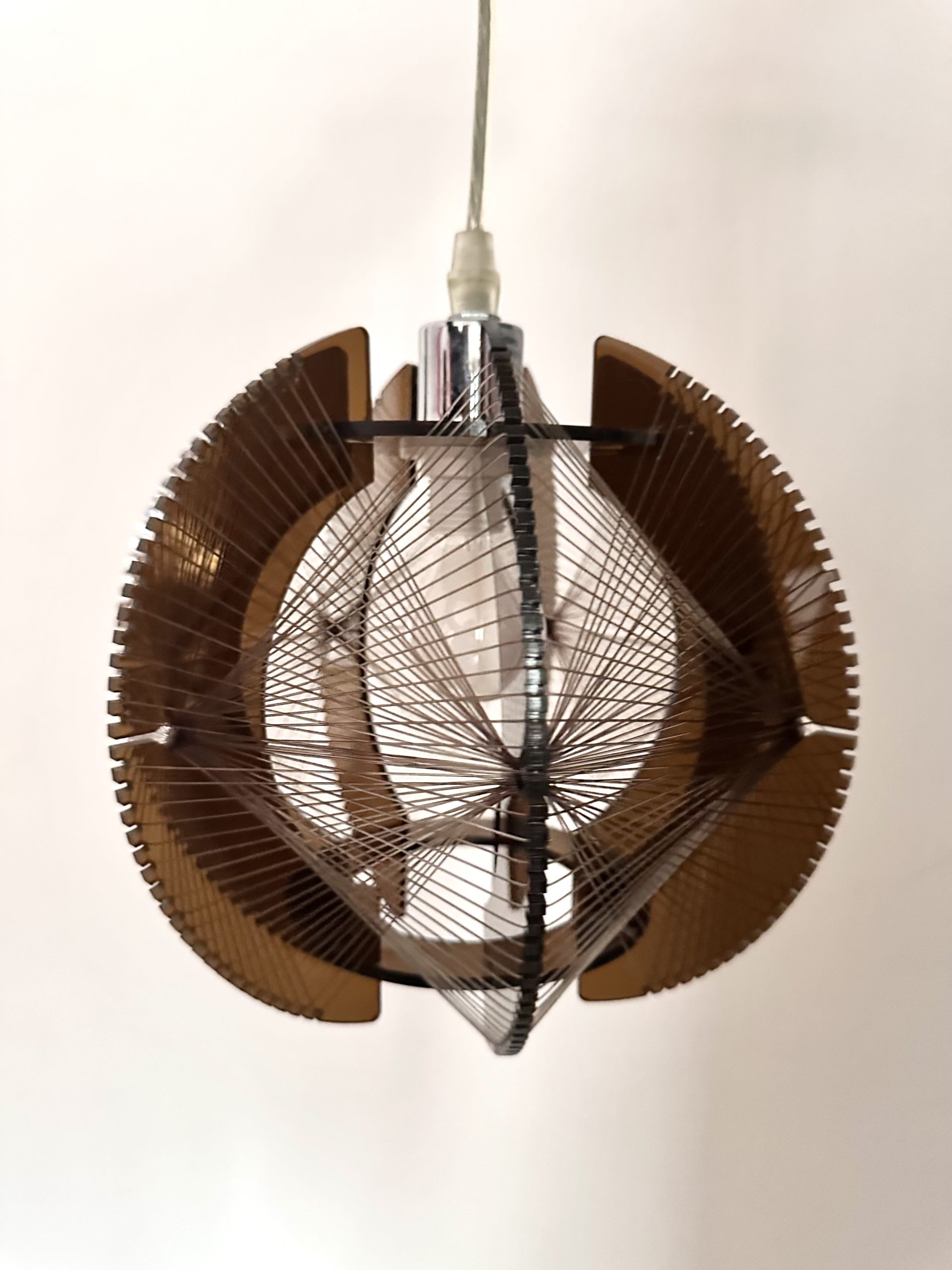 Lampe suspension en plexiglas fumé brun et fils plastiques transparents de couleur brune.