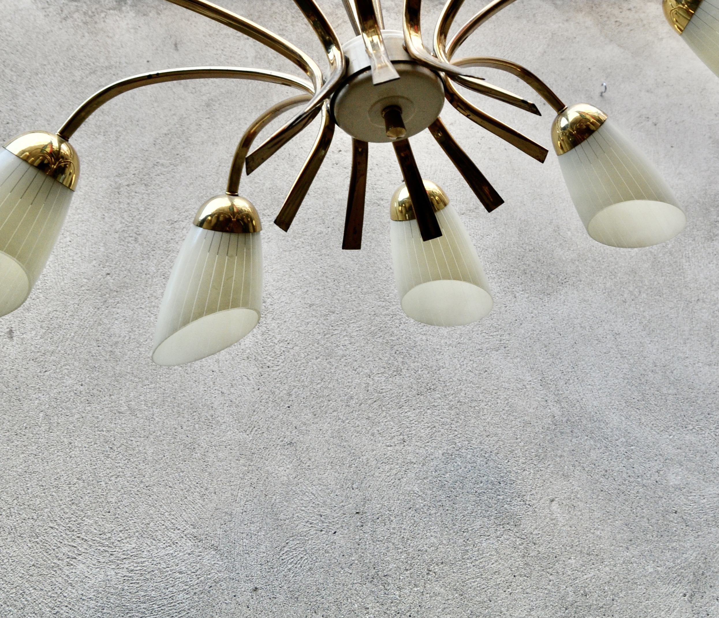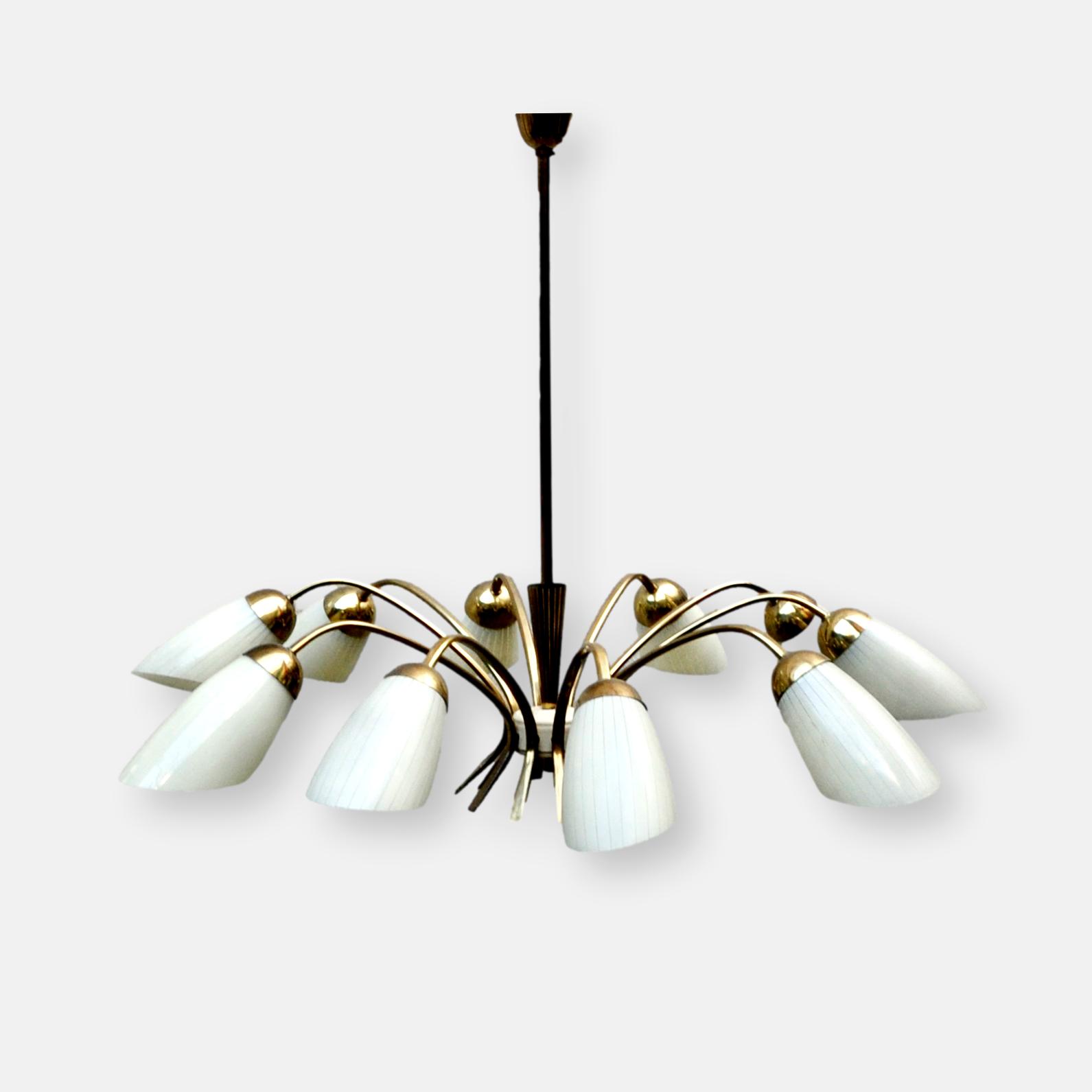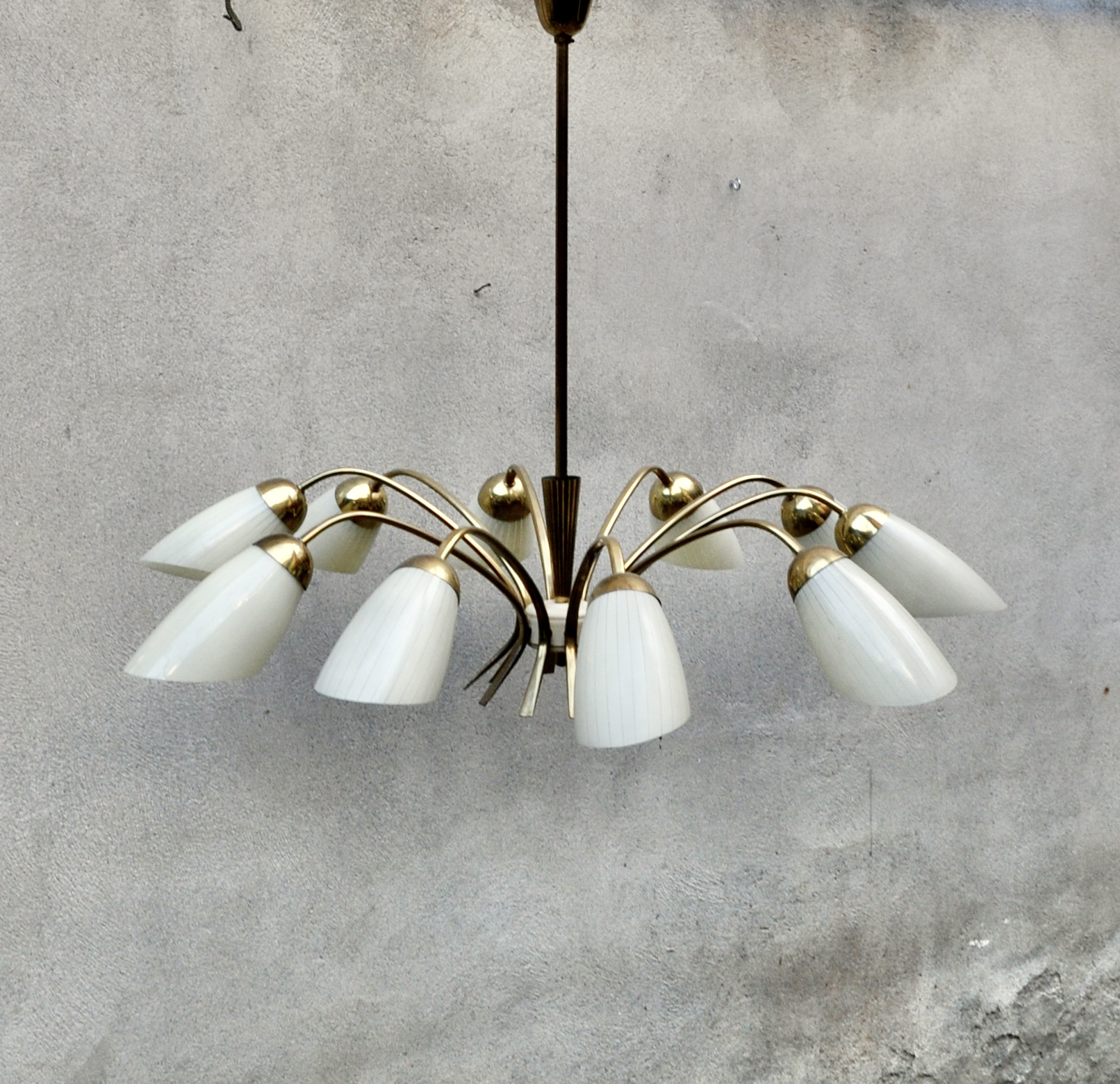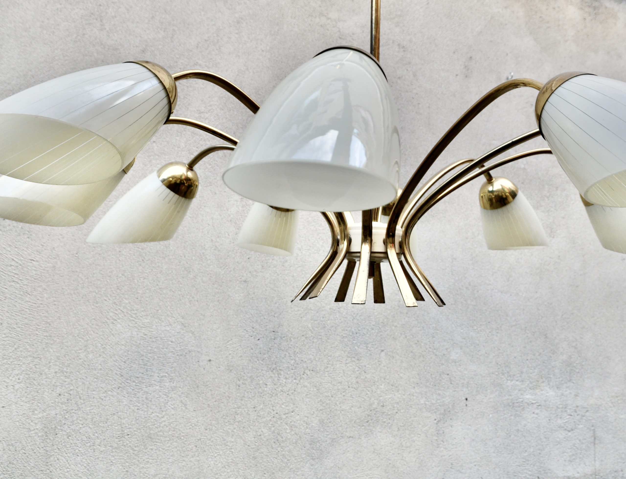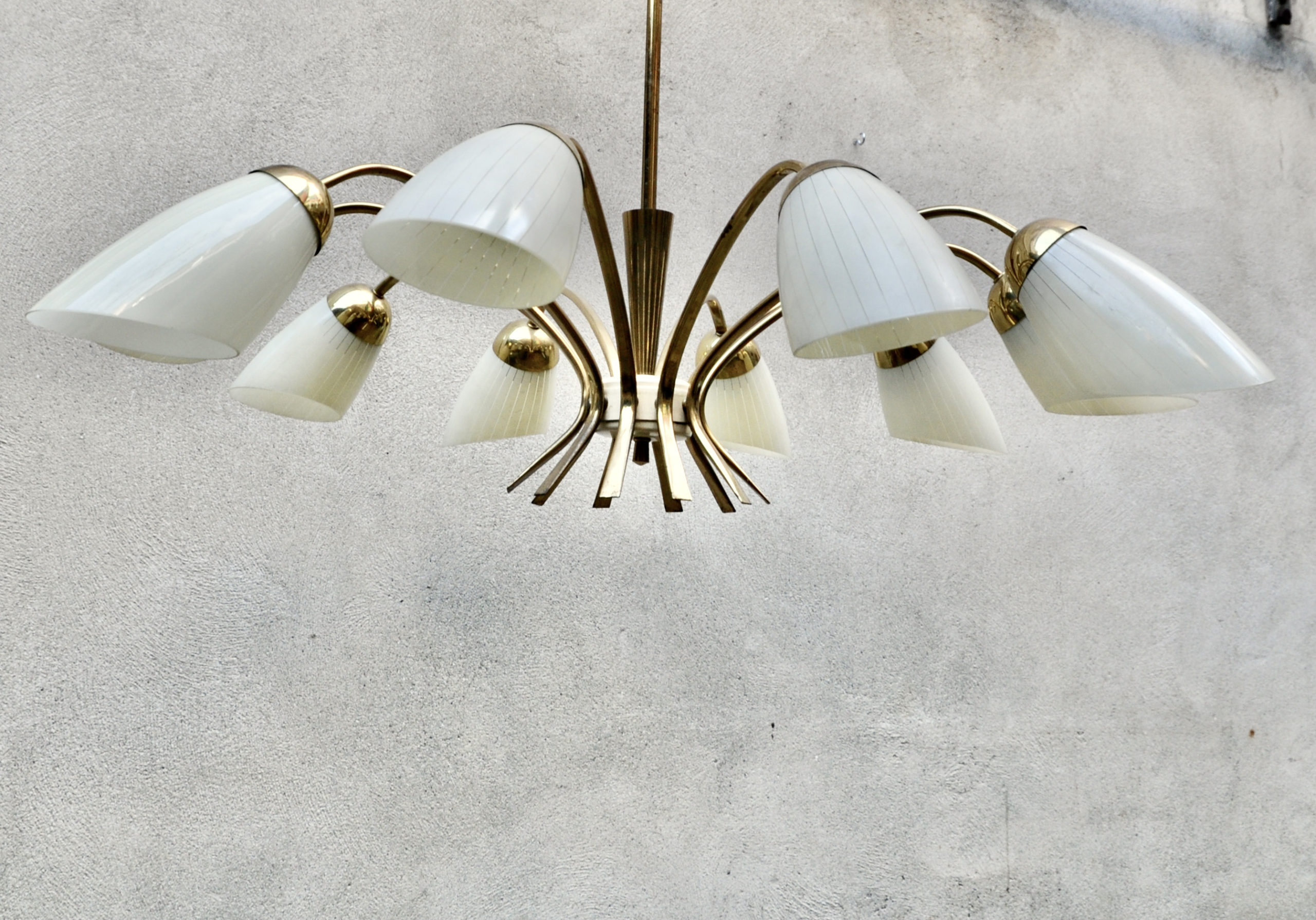 Grand lustre “Araignée” ou “fleur” des années 50 à 10 feux, probablement d’origine suisse. Les bras et la partie centrale sont en laiton brillant et le cache-fil en métal teinté blanc.