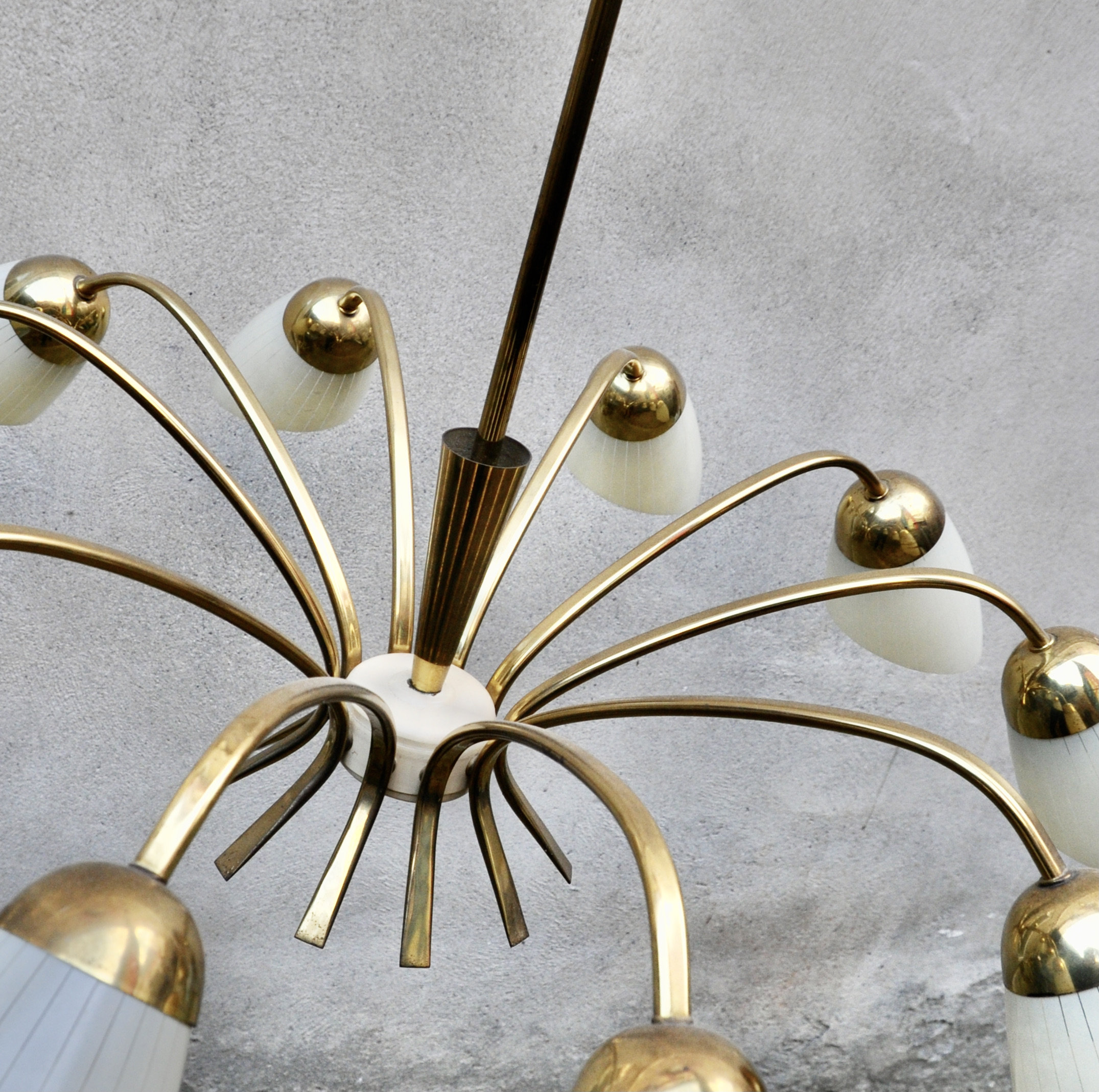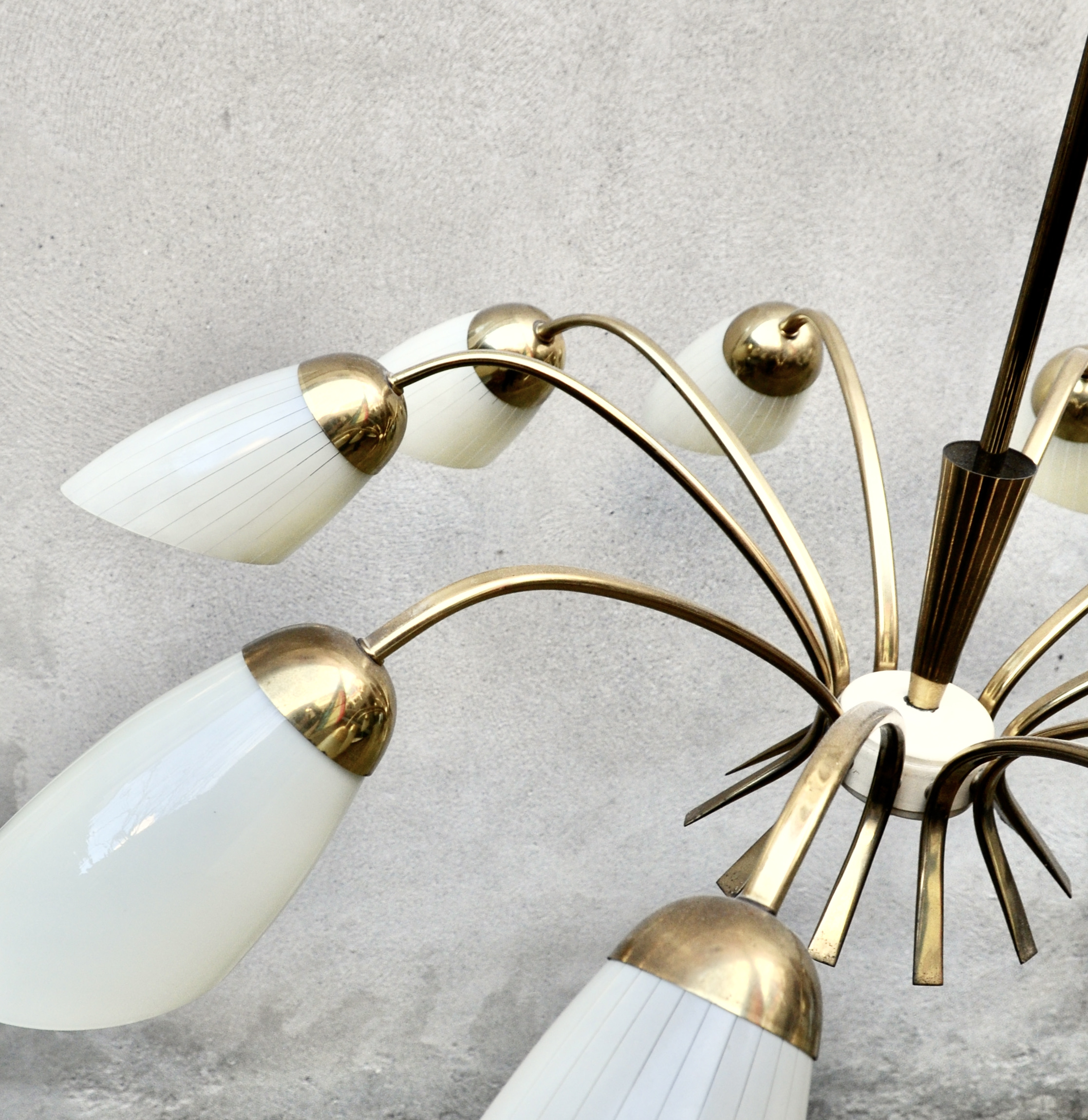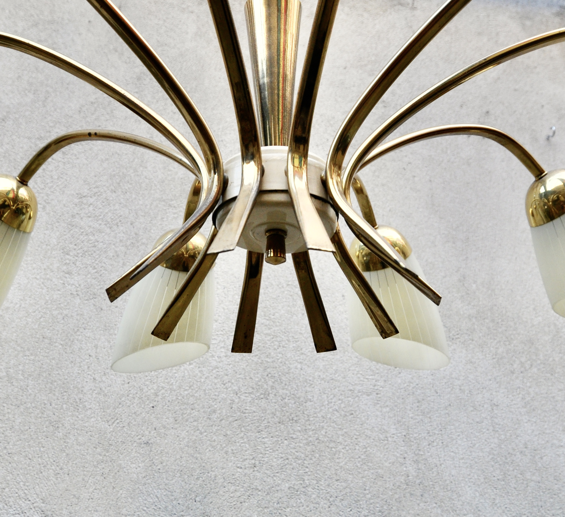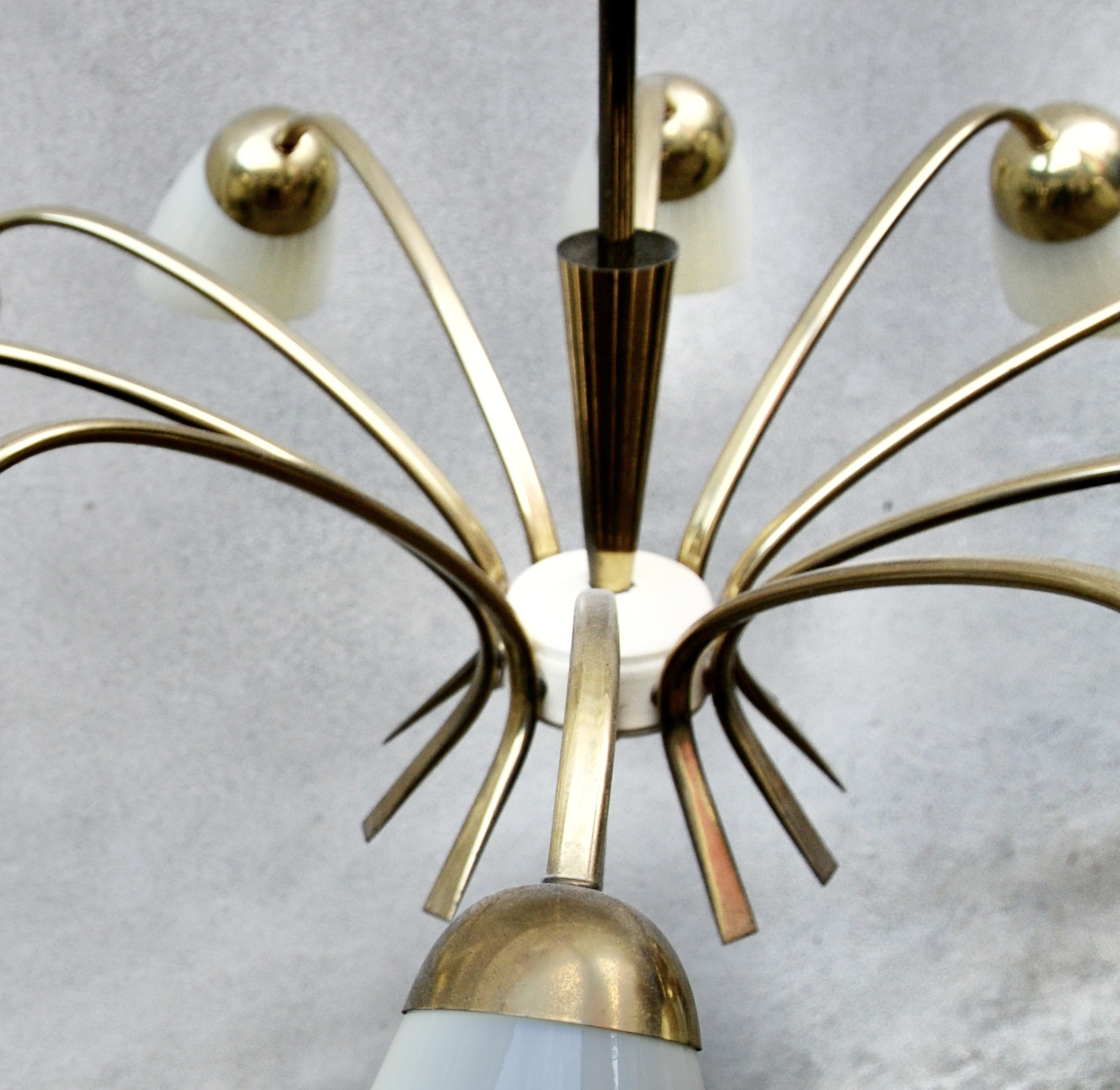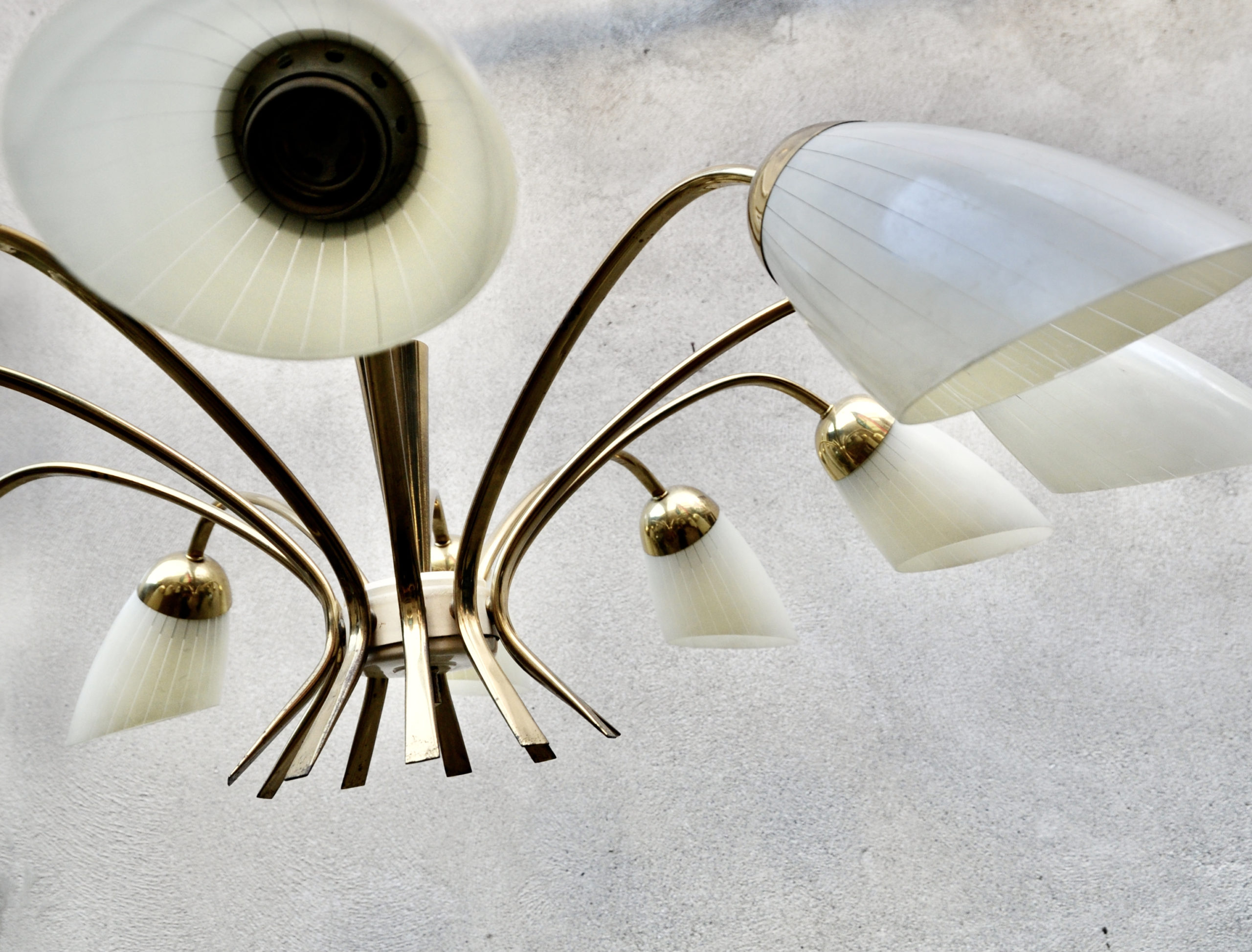 Grand lustre “Araignée” ou “fleur” des années 50 à 10 feux, probablement d’origine suisse. Les bras et la partie centrale sont en laiton brillant et le cache-fil en métal teinté blanc.