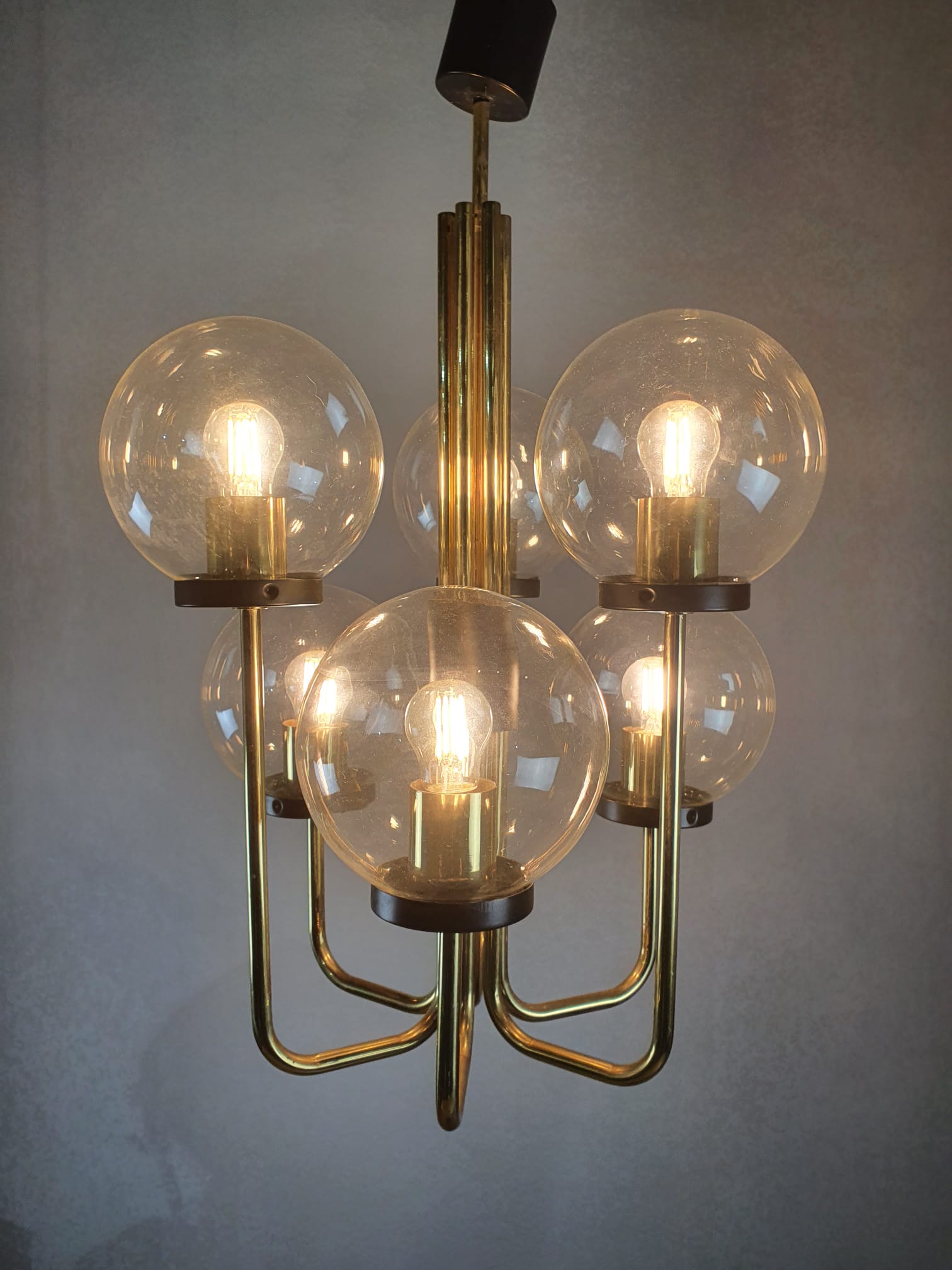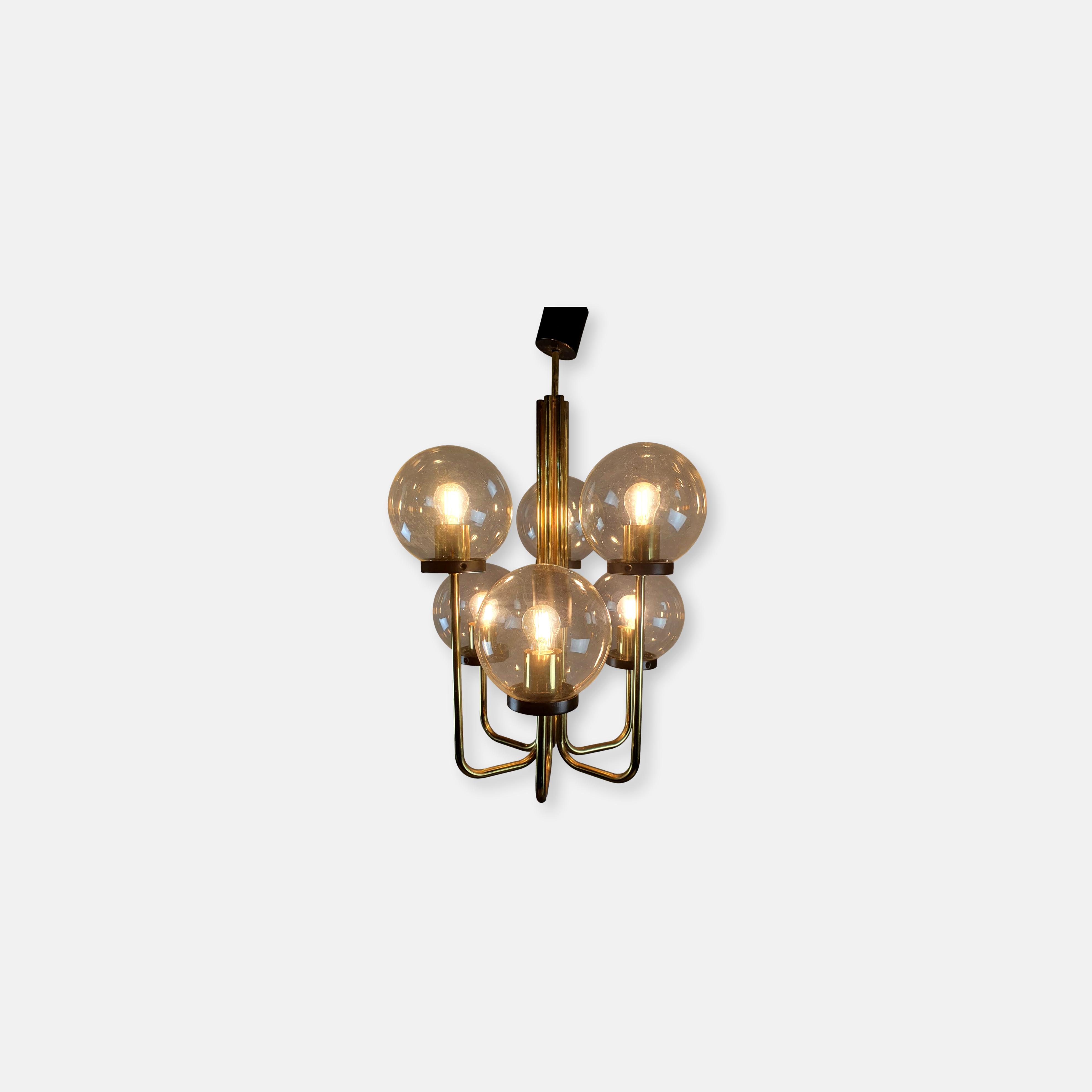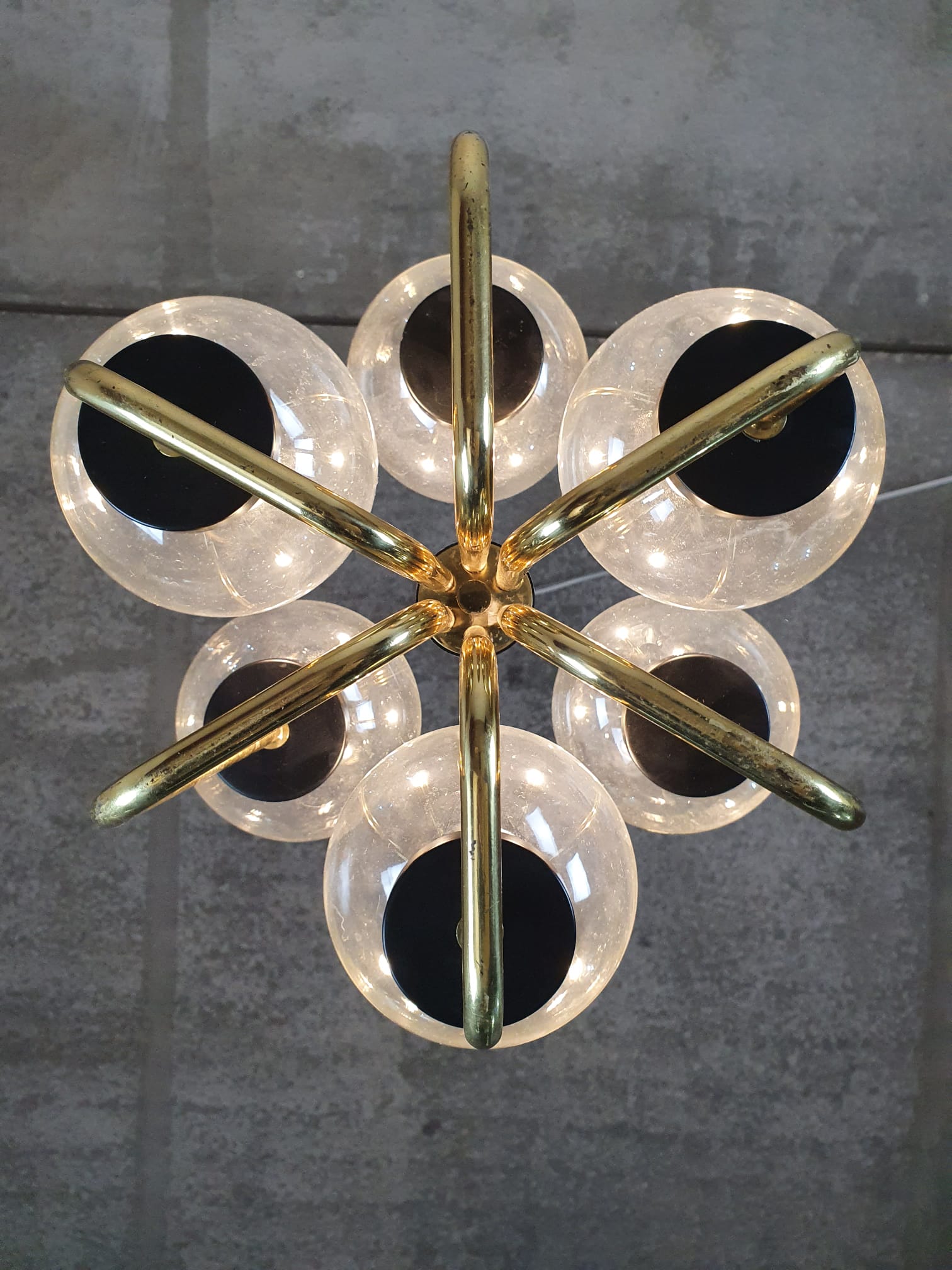Produit venduLustre en laiton avec 6 bras de lumière en opaline transparente des années 50/60
