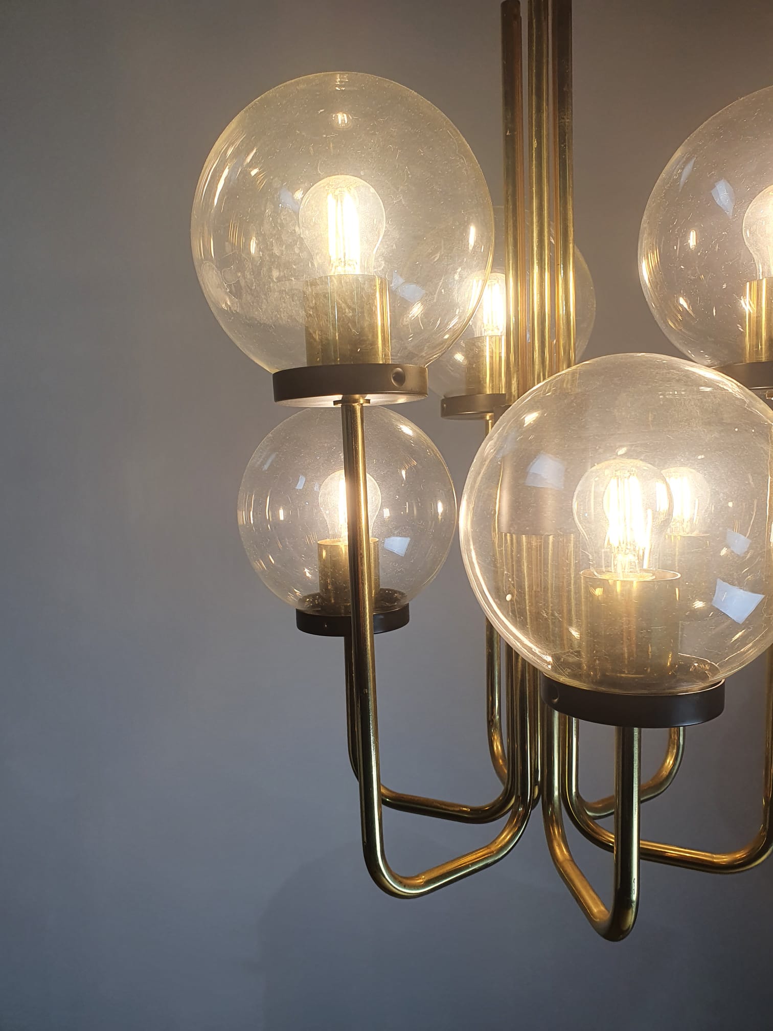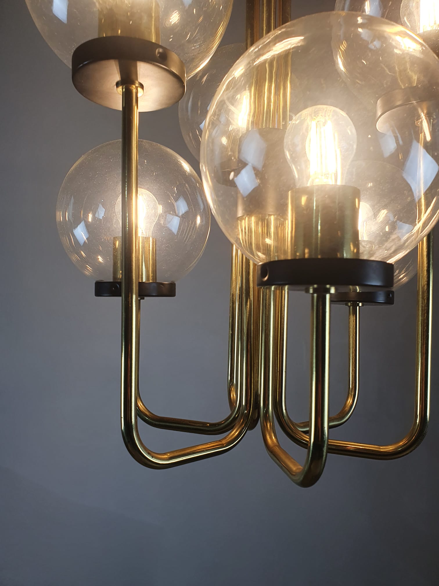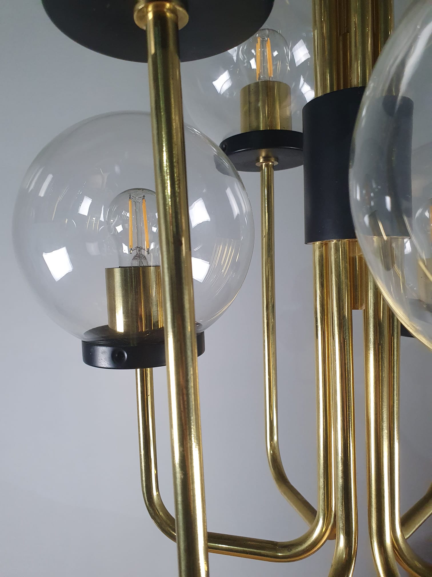 Produit venduLustre en laiton avec 6 bras de lumière en opaline transparente des années 50/60