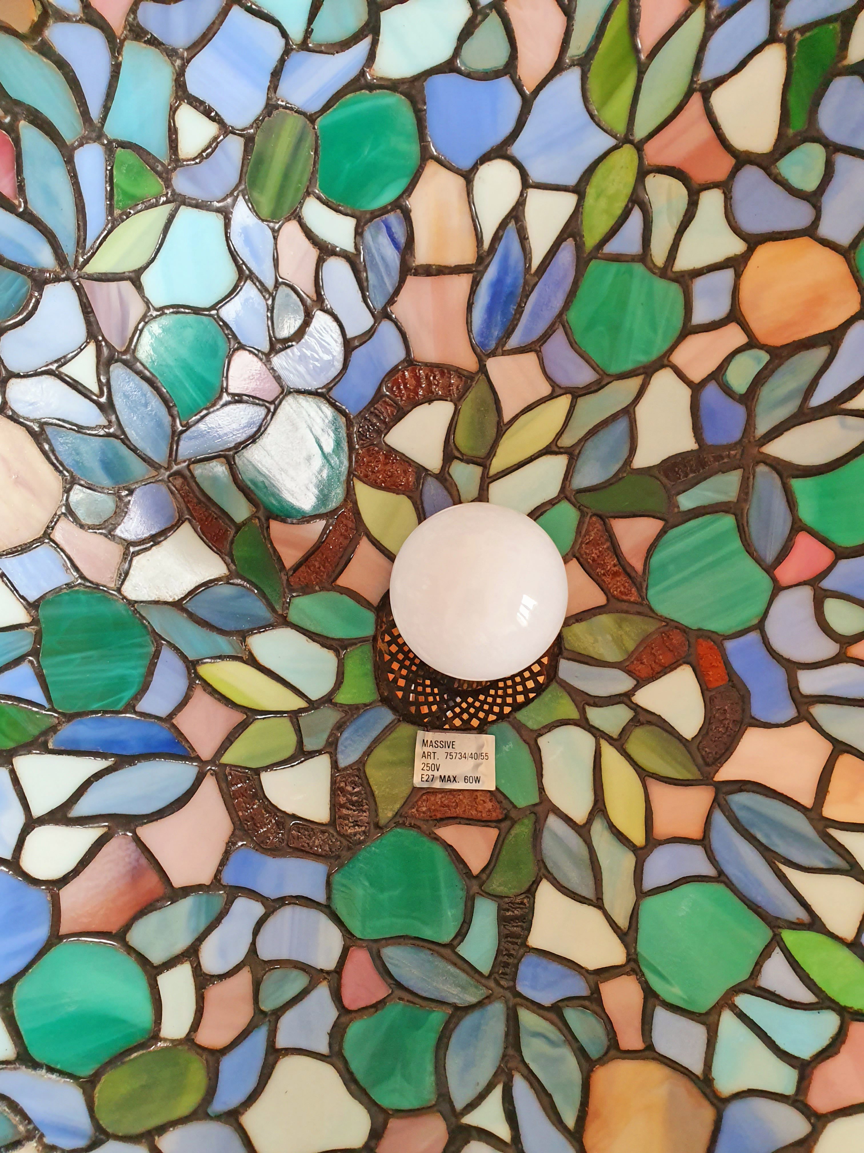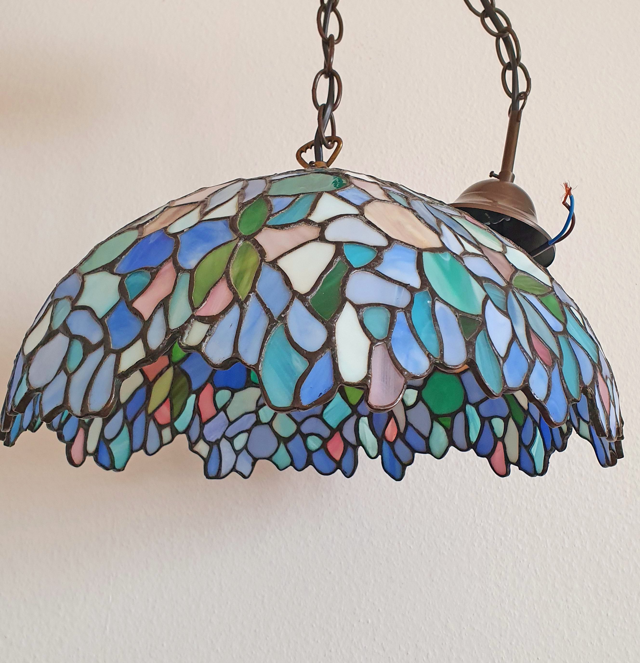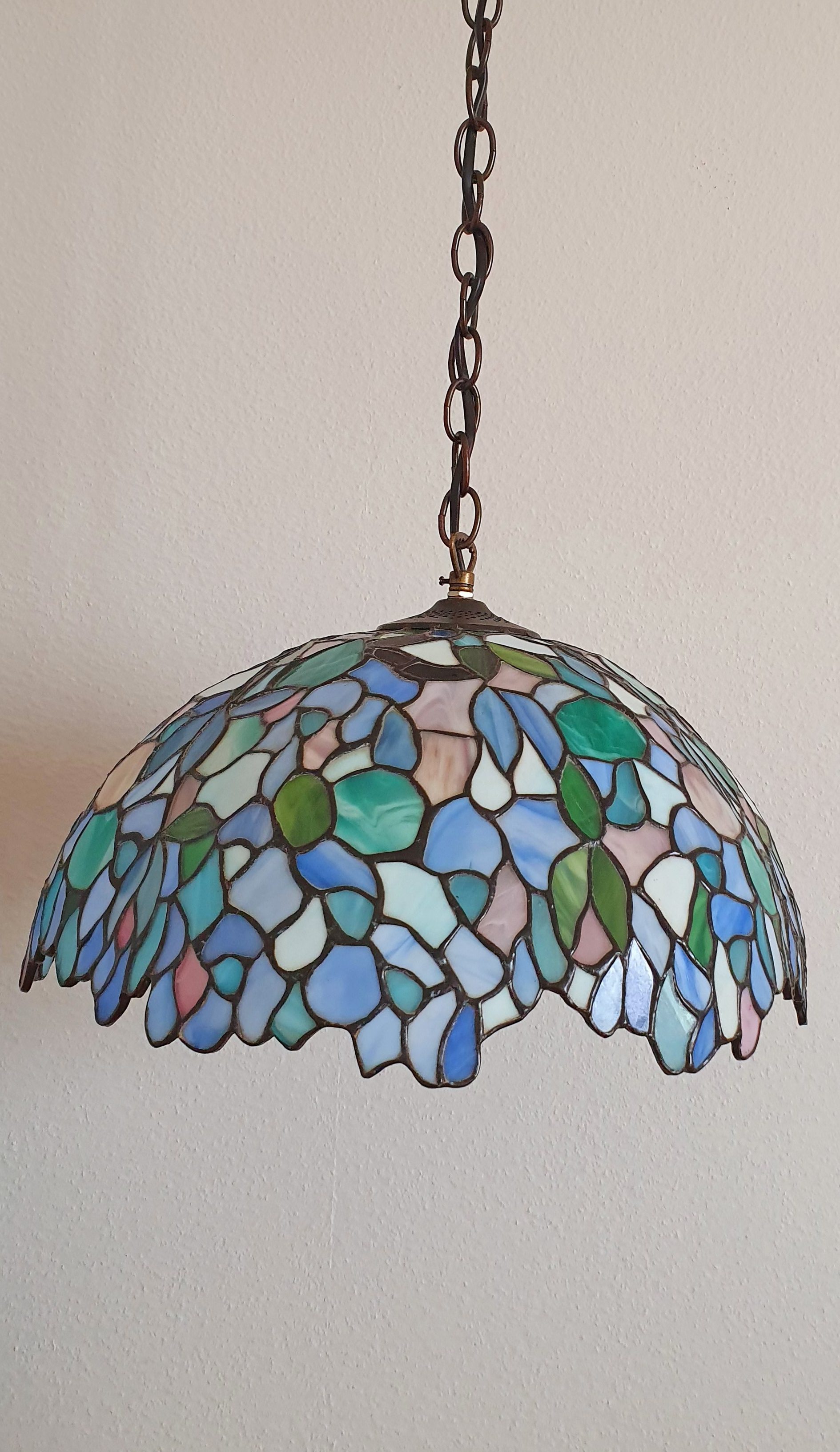 Produit venduLampe suspendue en vitrail multicolore style vintage des années ’80.