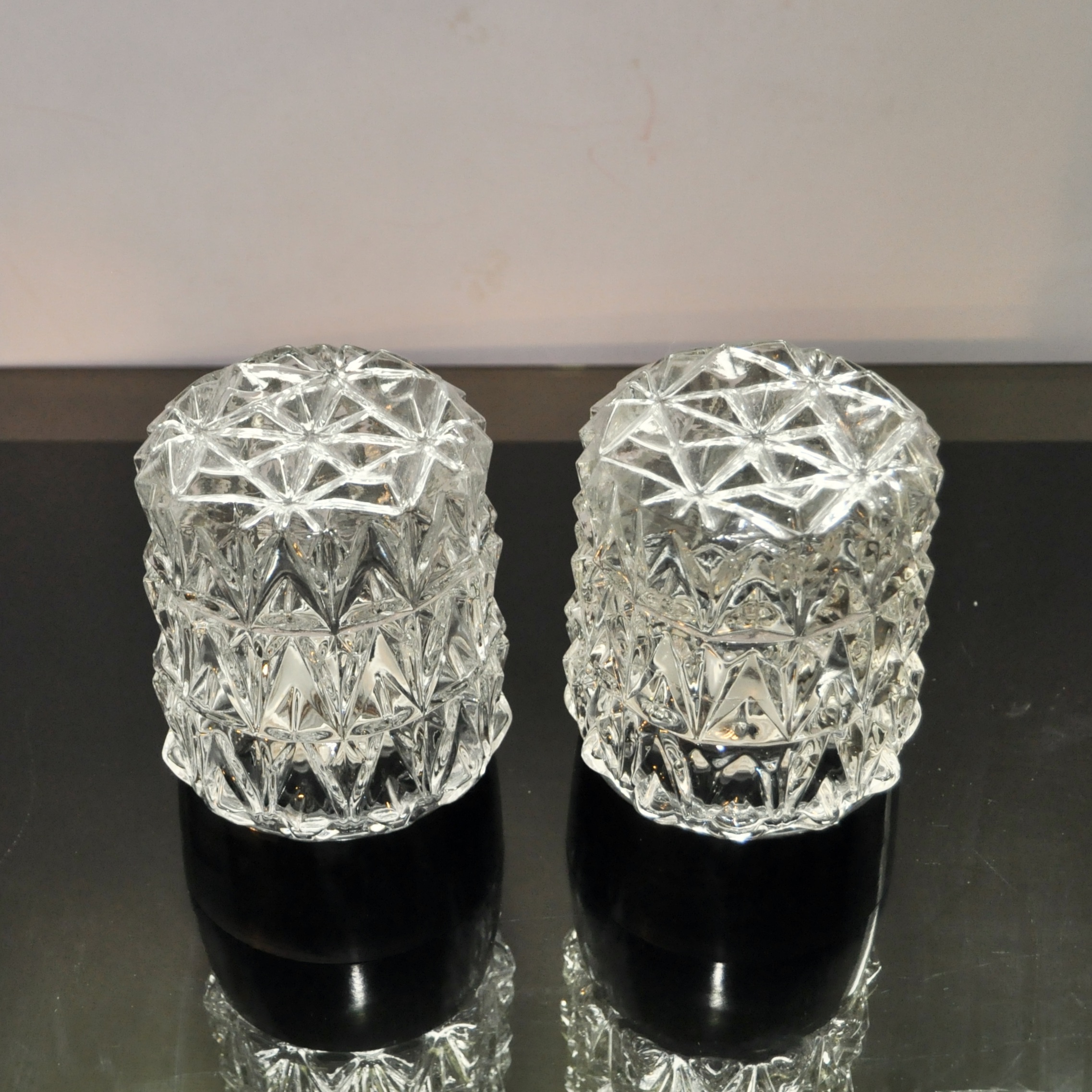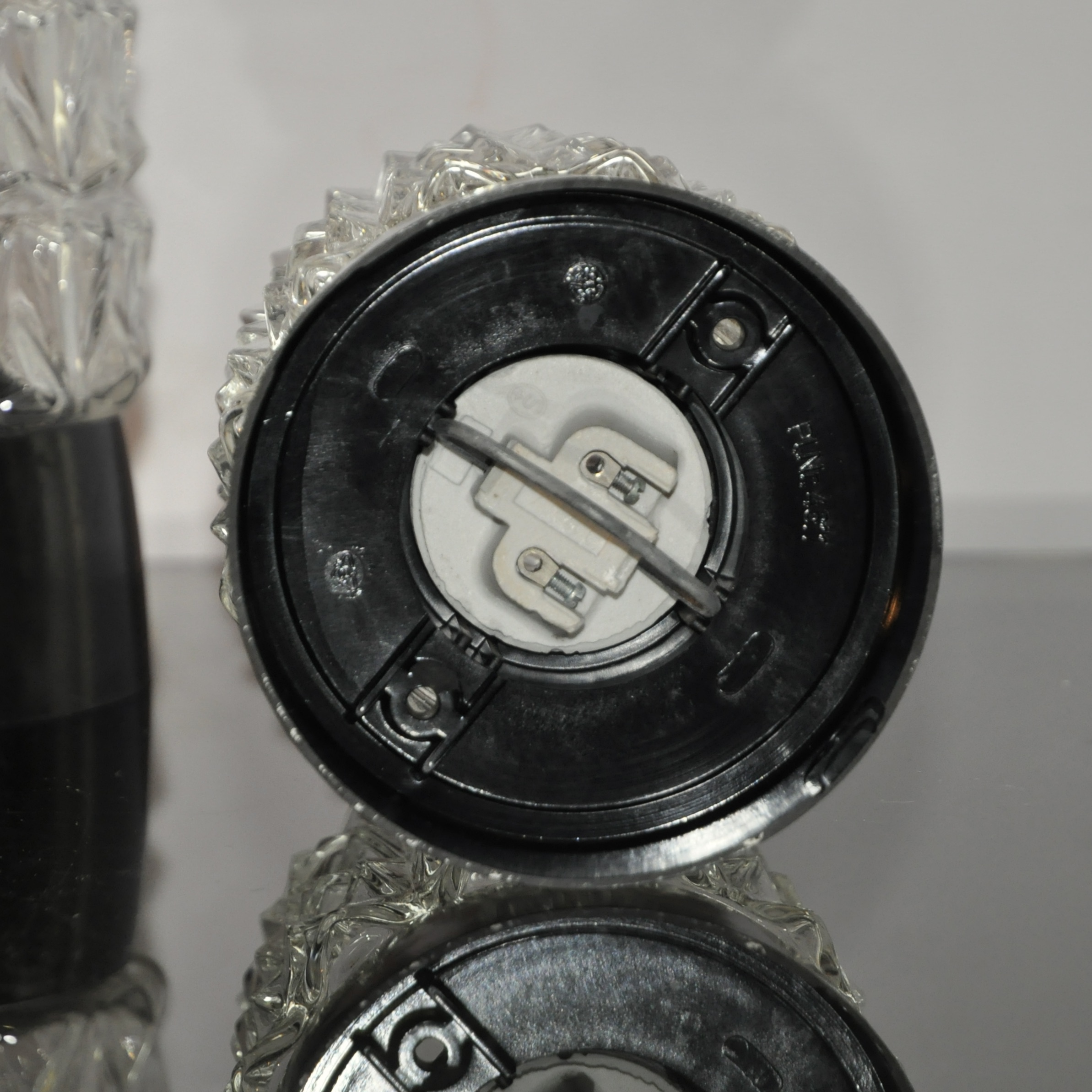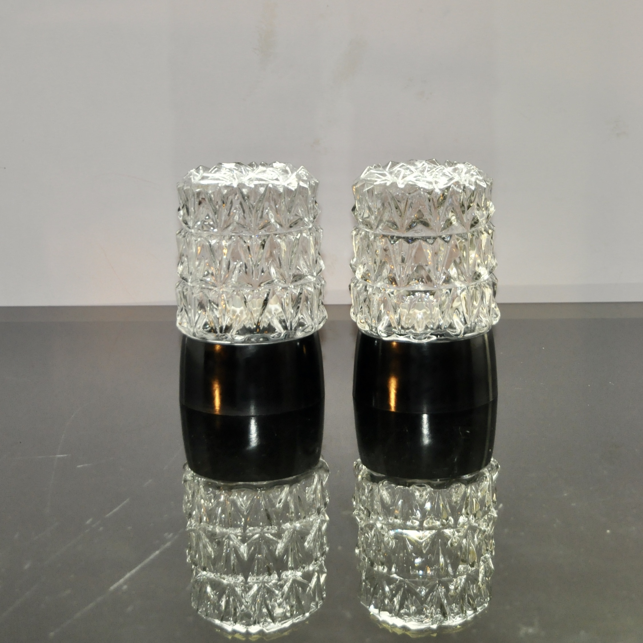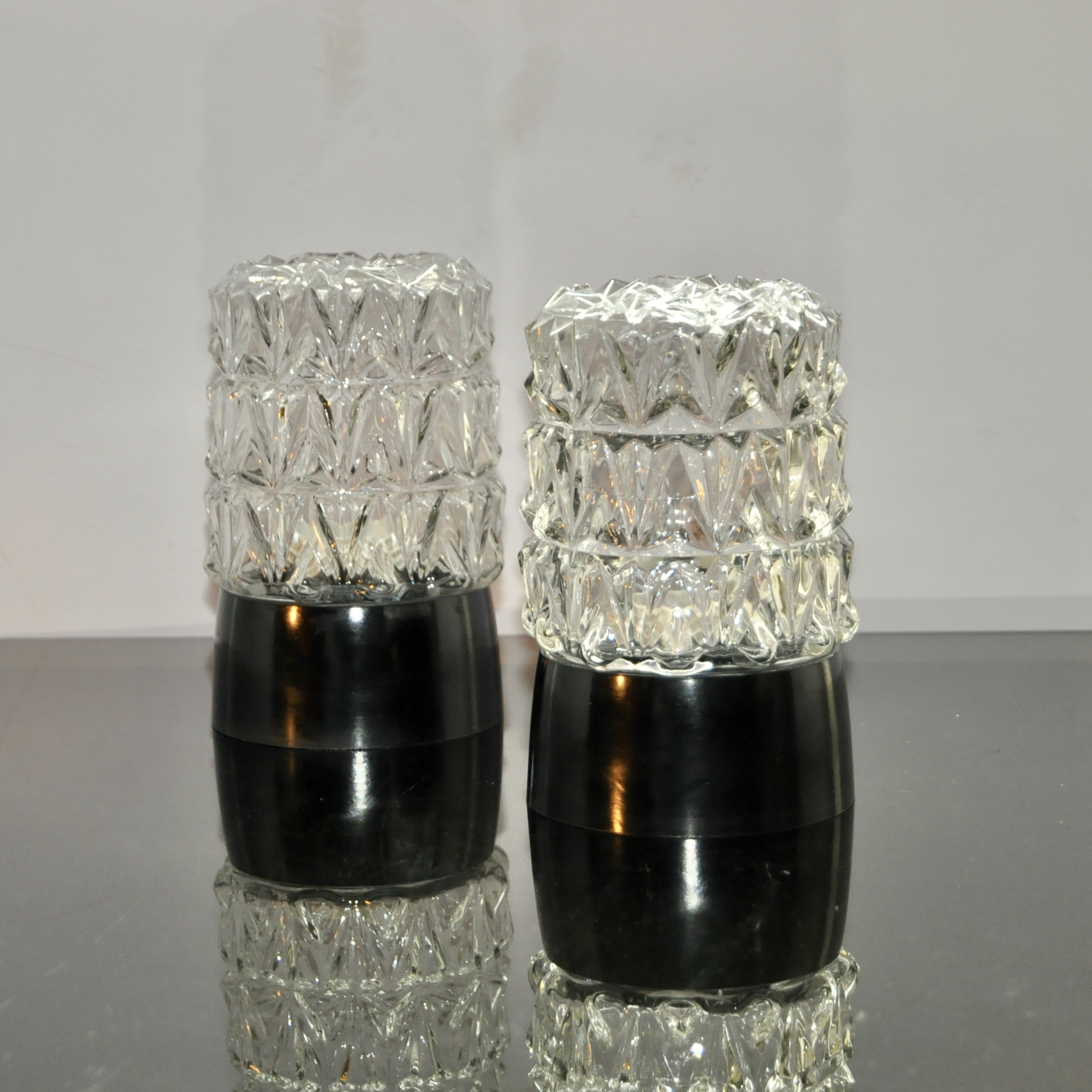 Paire d’appliques ou plafonniers bauhaus, d’époque vers 1950-1960. Le socle est en bakélite de couleur noire brillant et les abat-jours taillés en diamant multi-facettes sont en cristal transparent. Une version au style très “chic” de ces appliques. Ils se vissent dans les socles aisément.