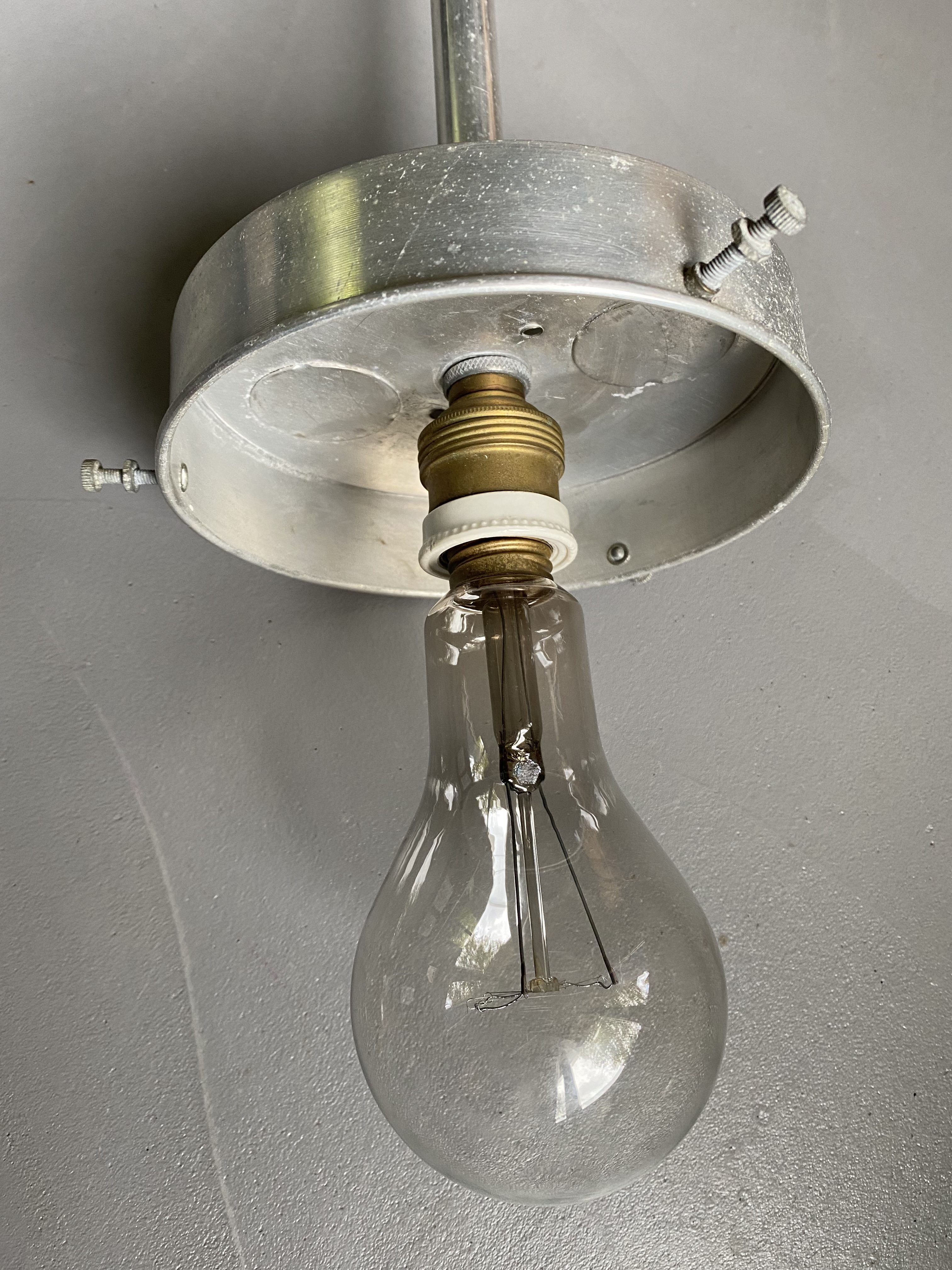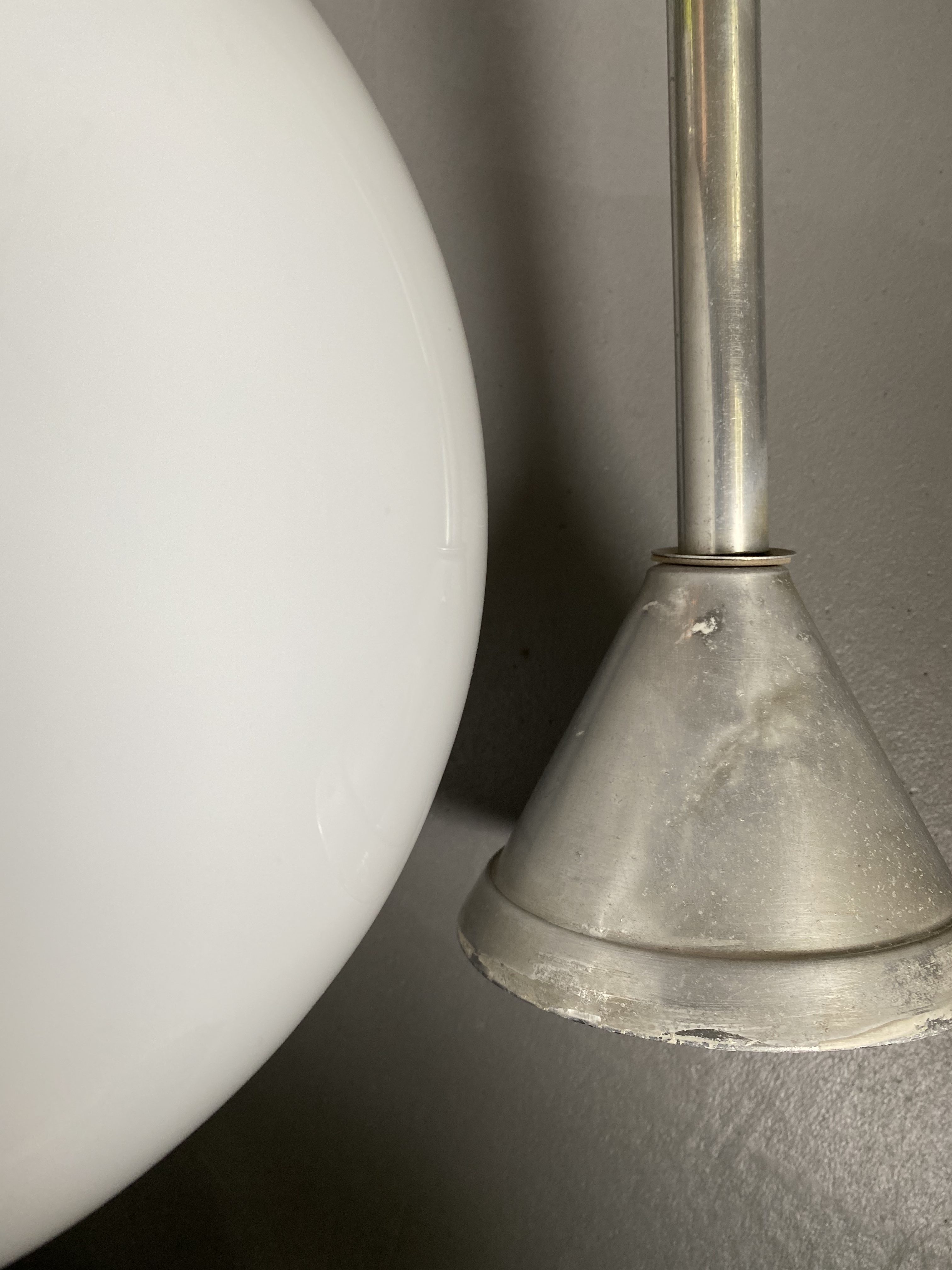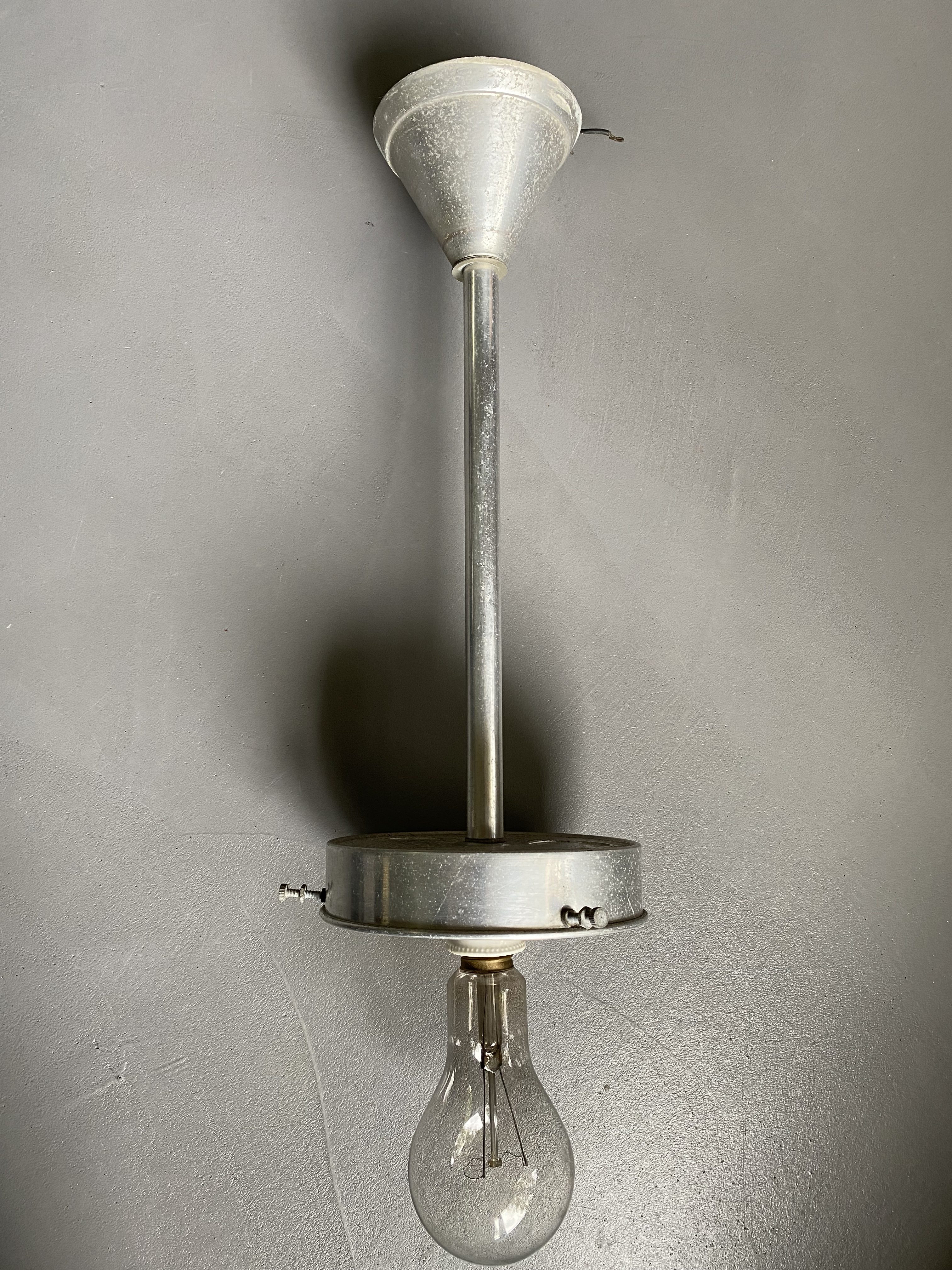 Etat vintage, patine magnifique. Tubes aluminium, très légers donc. Globes en verre. Aucun choc, un des deux a des marques de feutre très peu visibles + traces de peinture sur un des tubes, invisibles une fois la lampe fixée au plafond. Un des tubes est également un peu froissé, mais cela n’est pas dérangeant.