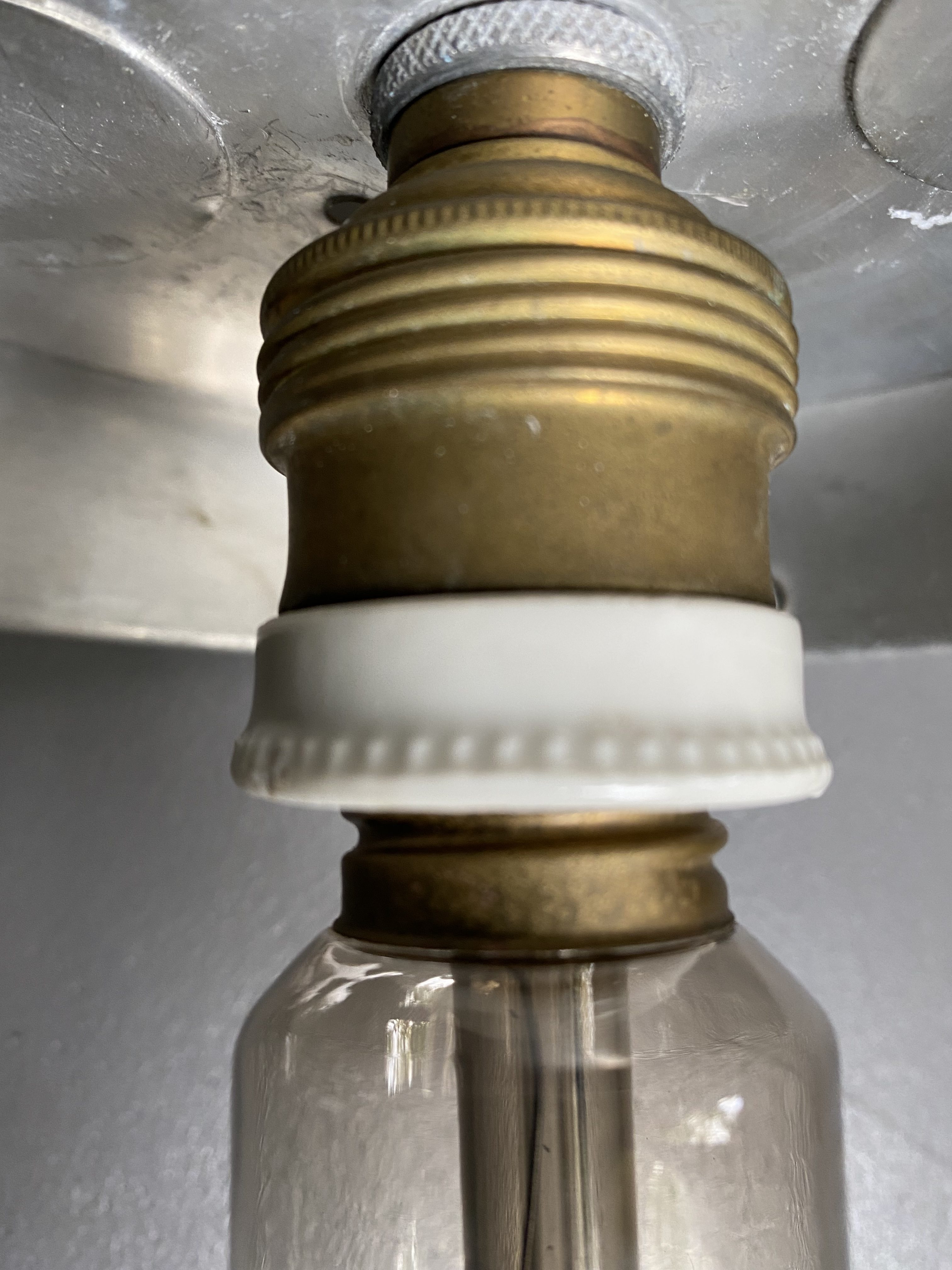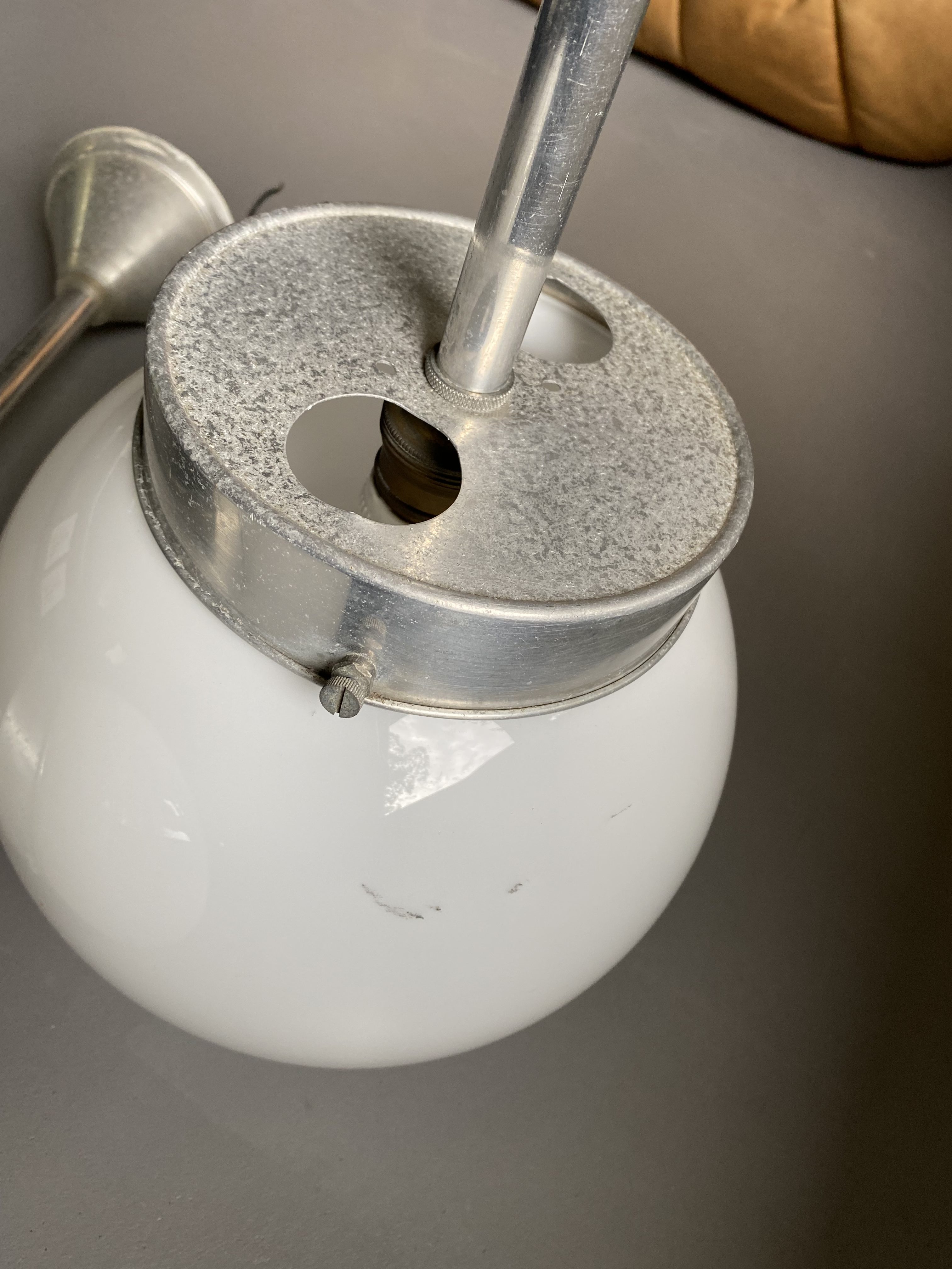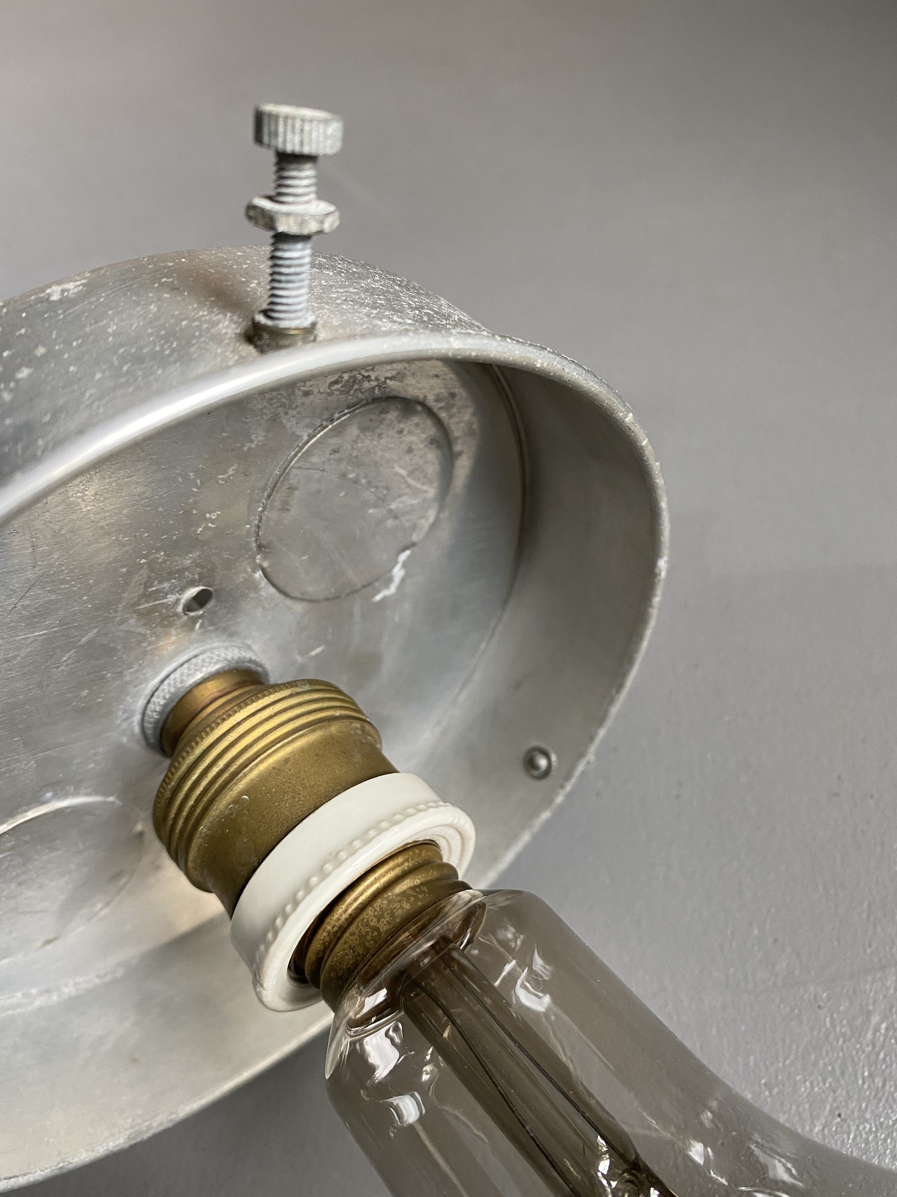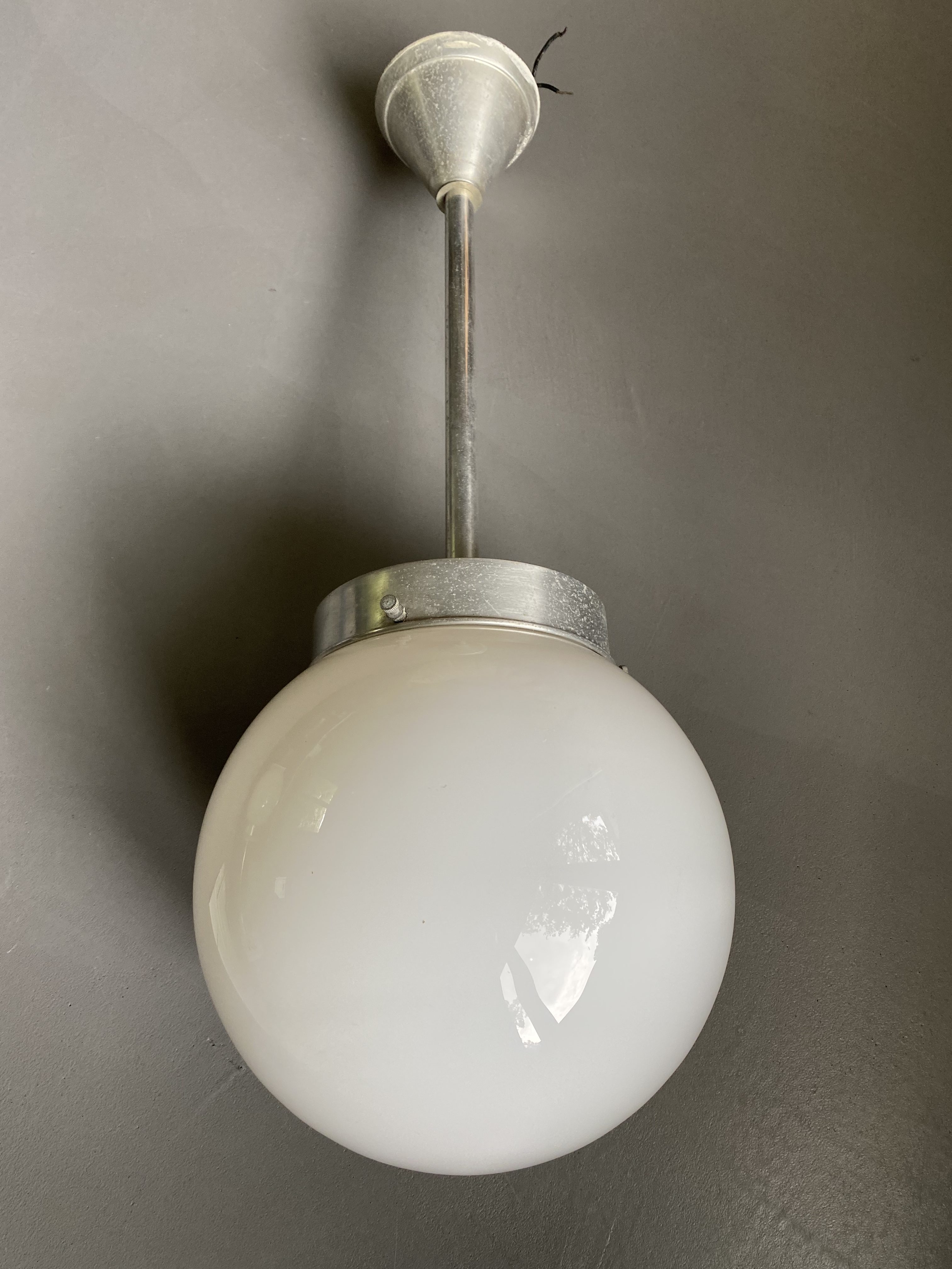 Etat vintage, patine magnifique. Tubes aluminium, très légers donc. Globes en verre. Aucun choc, un des deux a des marques de feutre très peu visibles + traces de peinture sur un des tubes, invisibles une fois la lampe fixée au plafond. Un des tubes est également un peu froissé, mais cela n’est pas dérangeant.