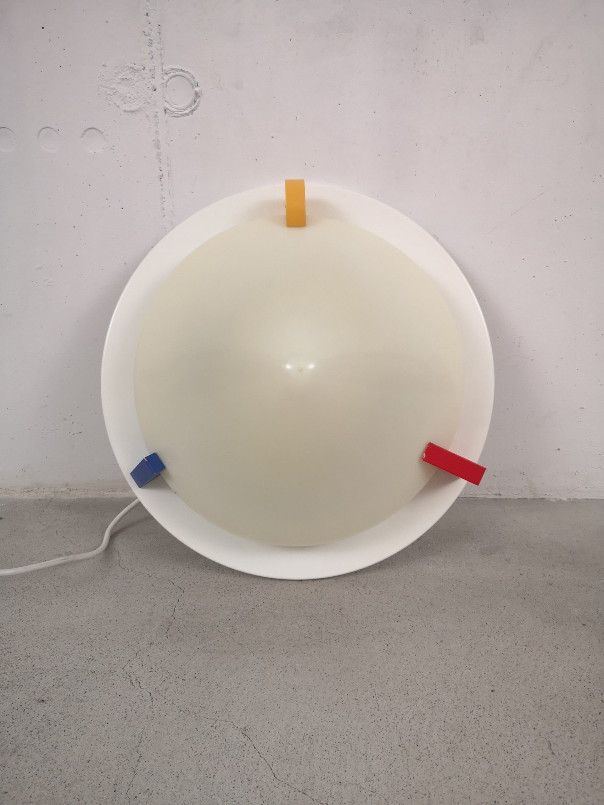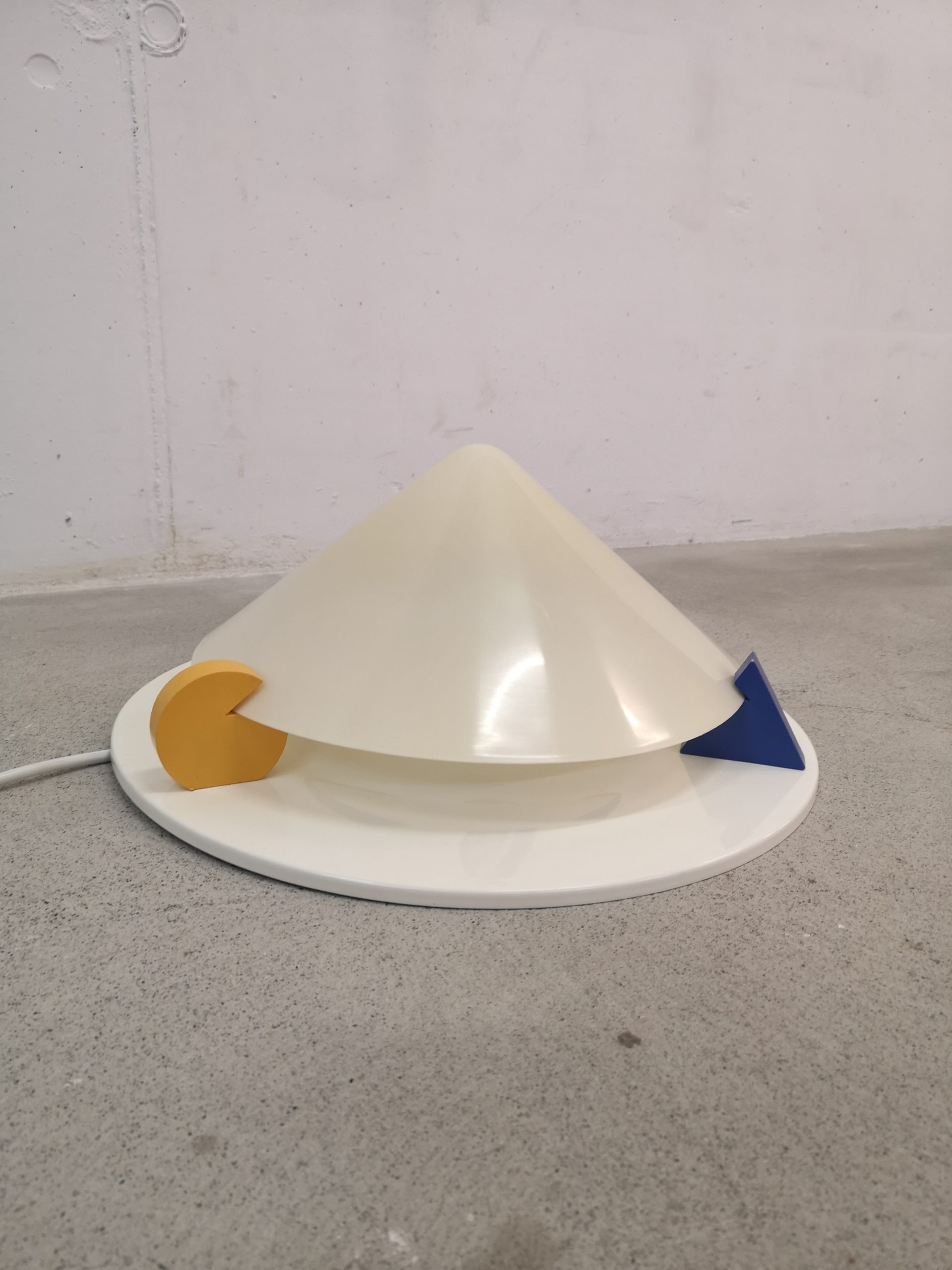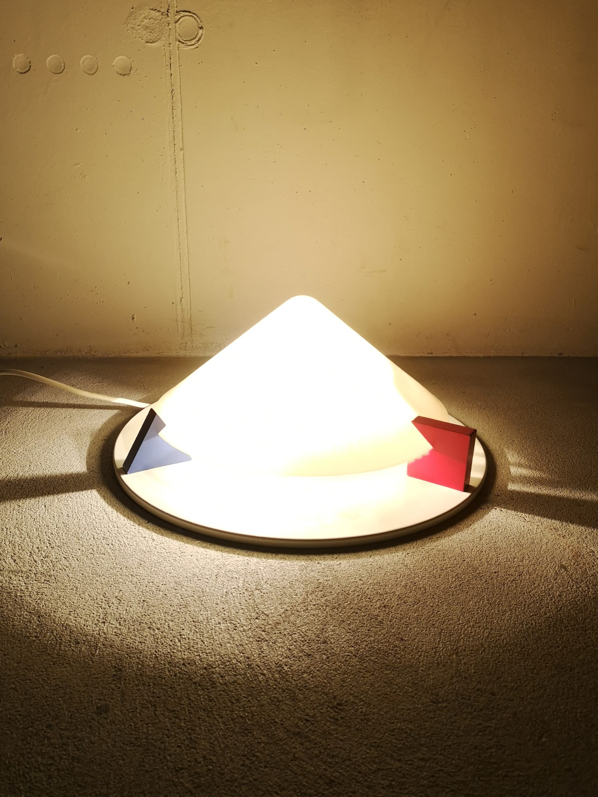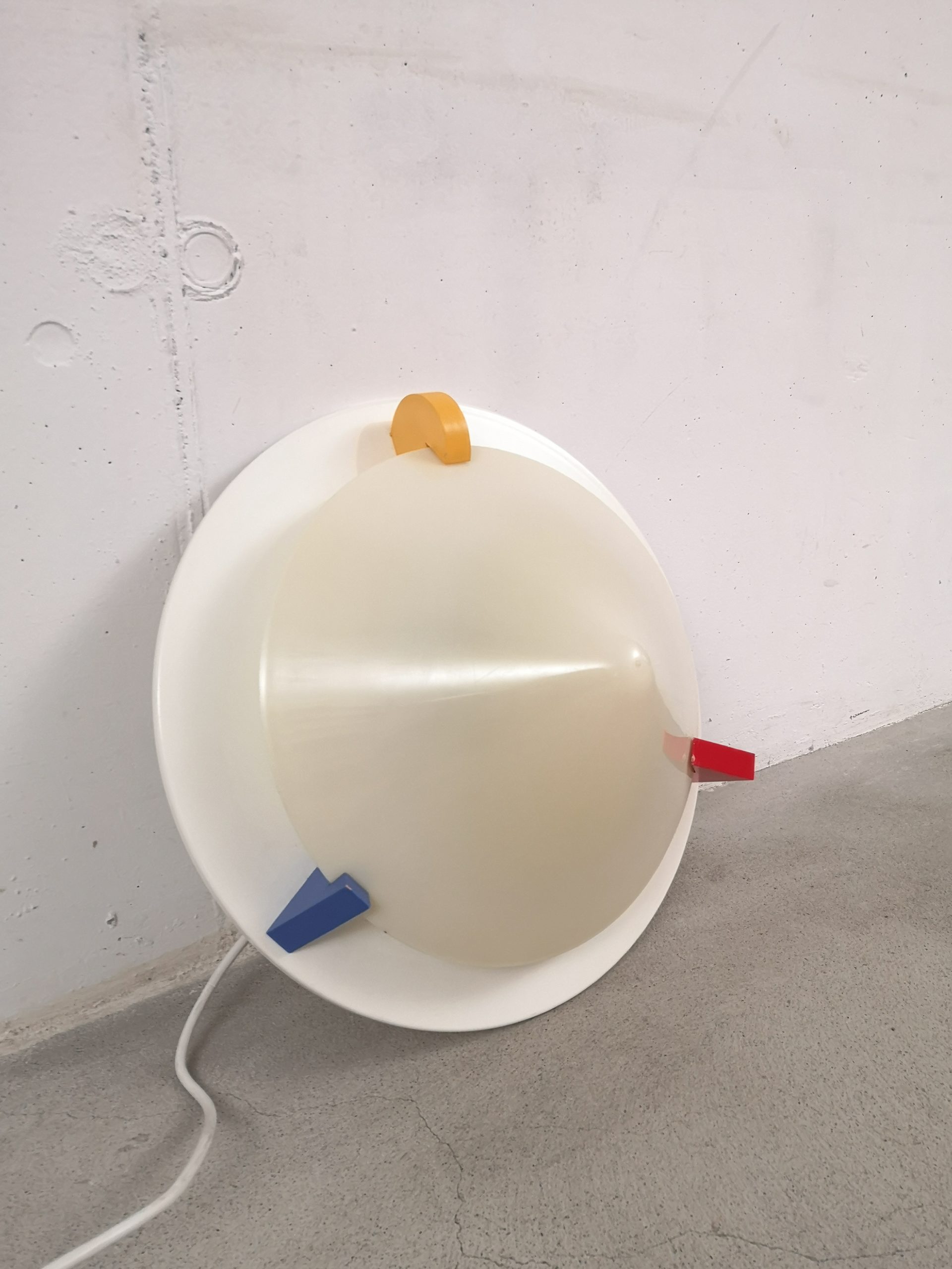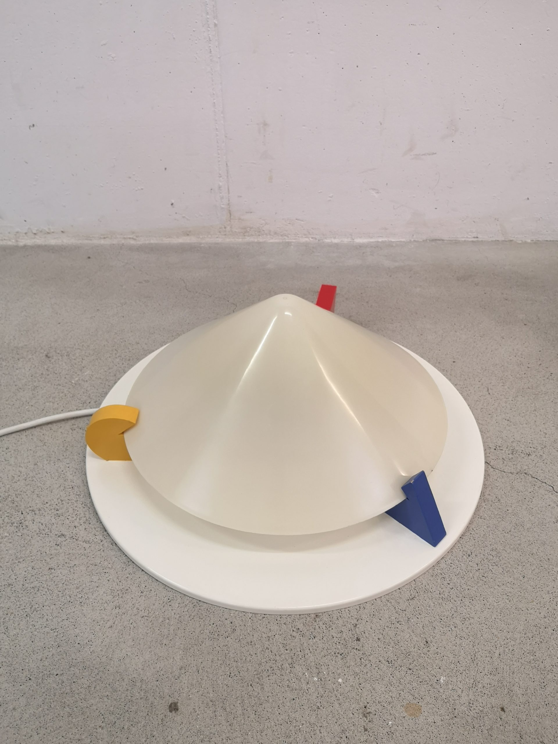 Produit venduPlafonnier ou applique T8814 dans le style Memphis (Ettore Sottsass) conçu par Ikea dans les années 80. Il est composé d’une base en métal, d’un abat-jour en forme de cône en acrylique blanc (jauni par le temps) et de décors en bois : triangle bleu, carré rouge et rond jaune. Pour retirer l’abat-jour, il suffit de tourner les éléments en bois.