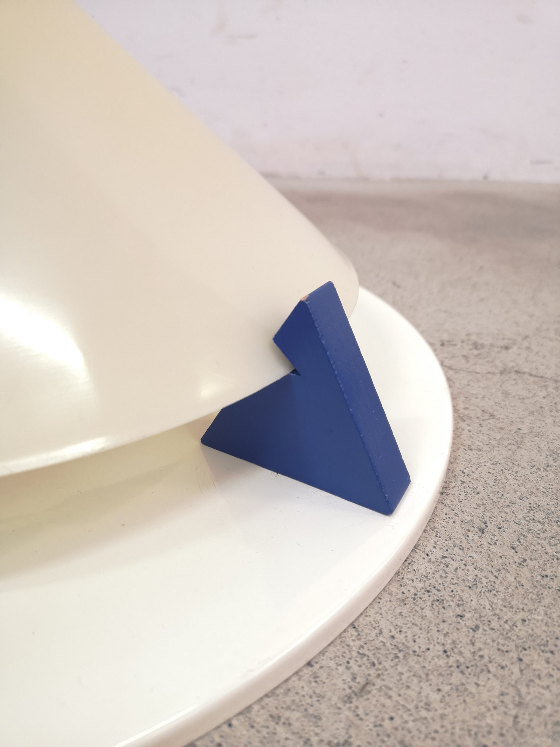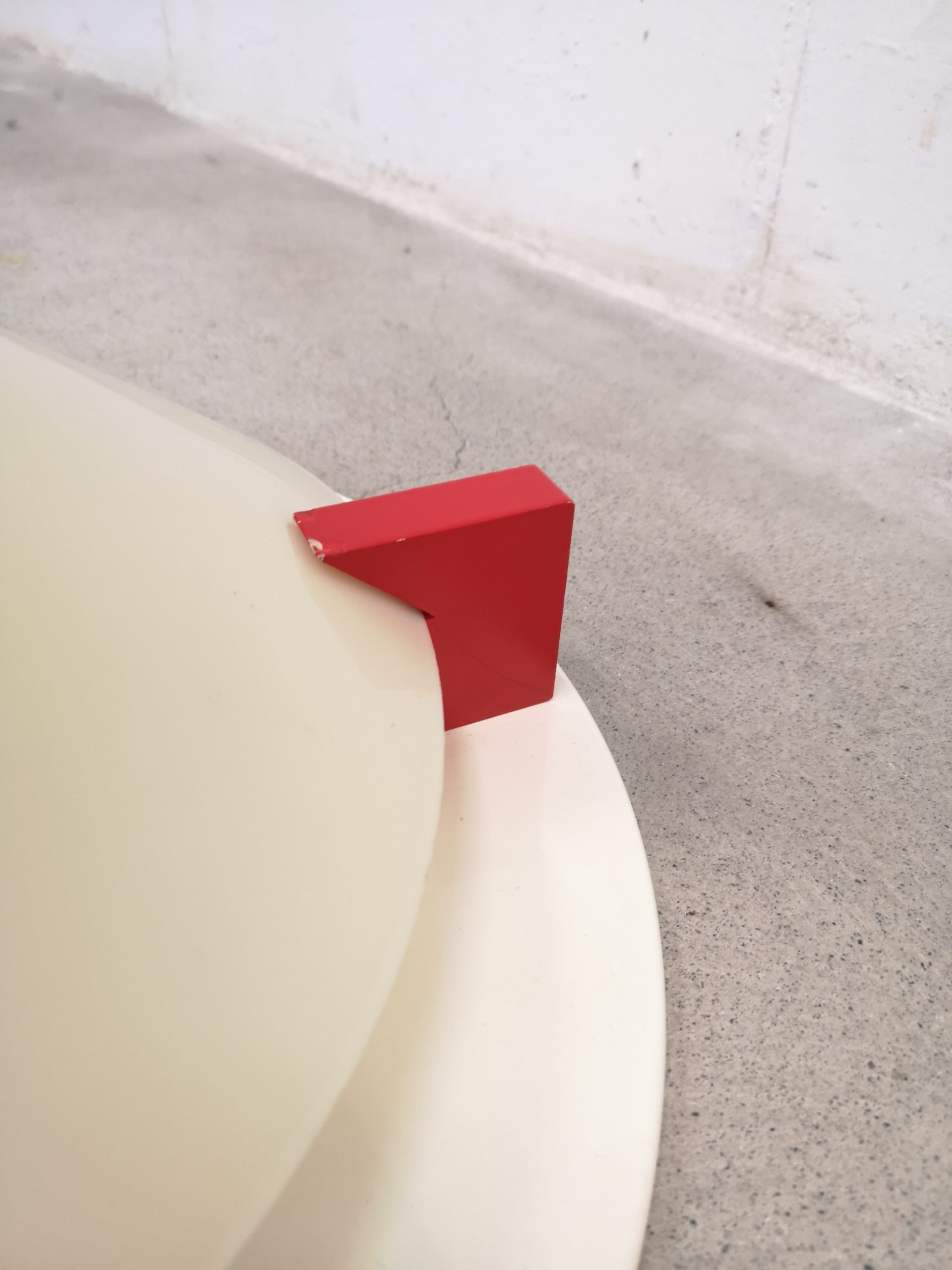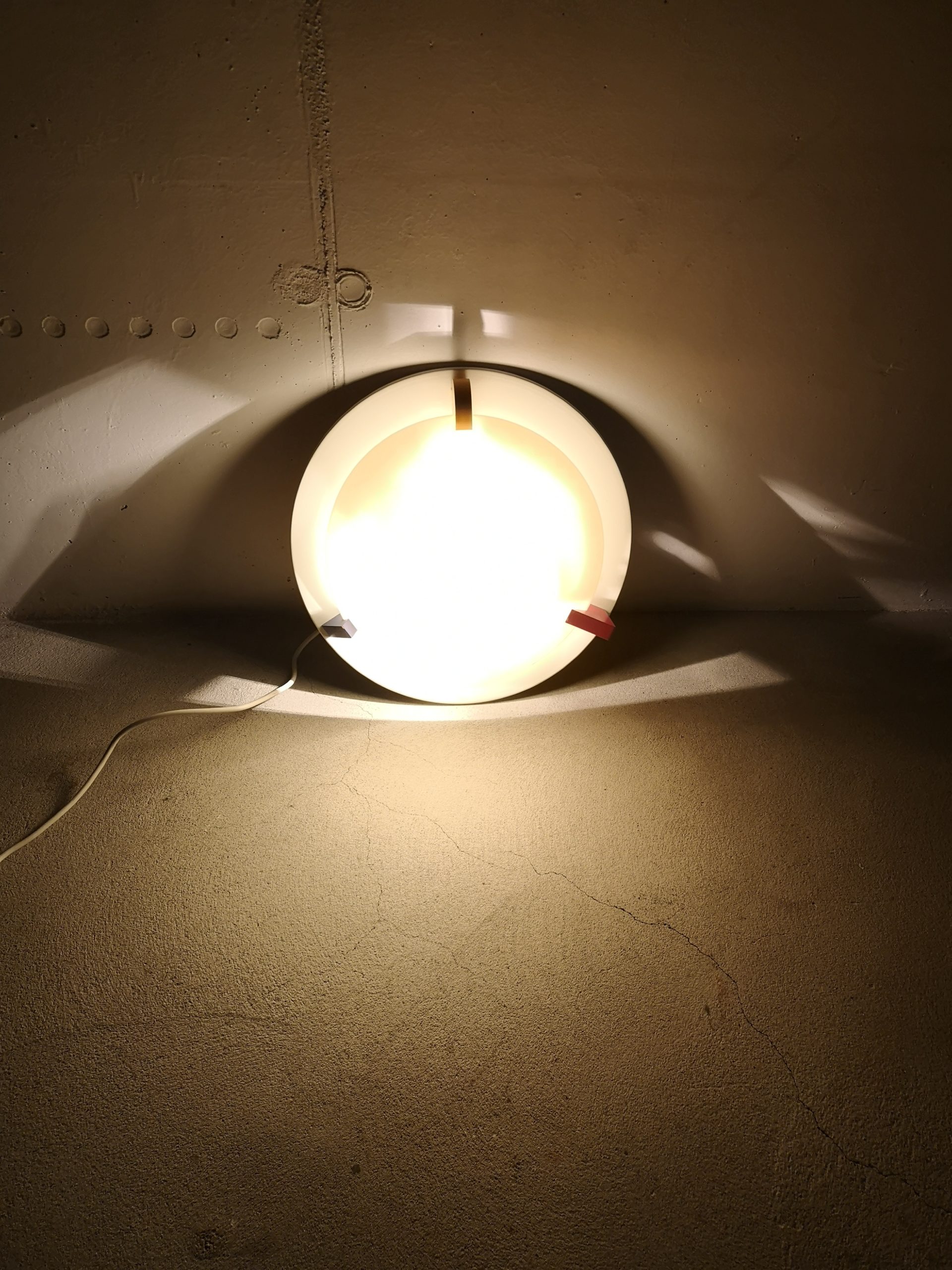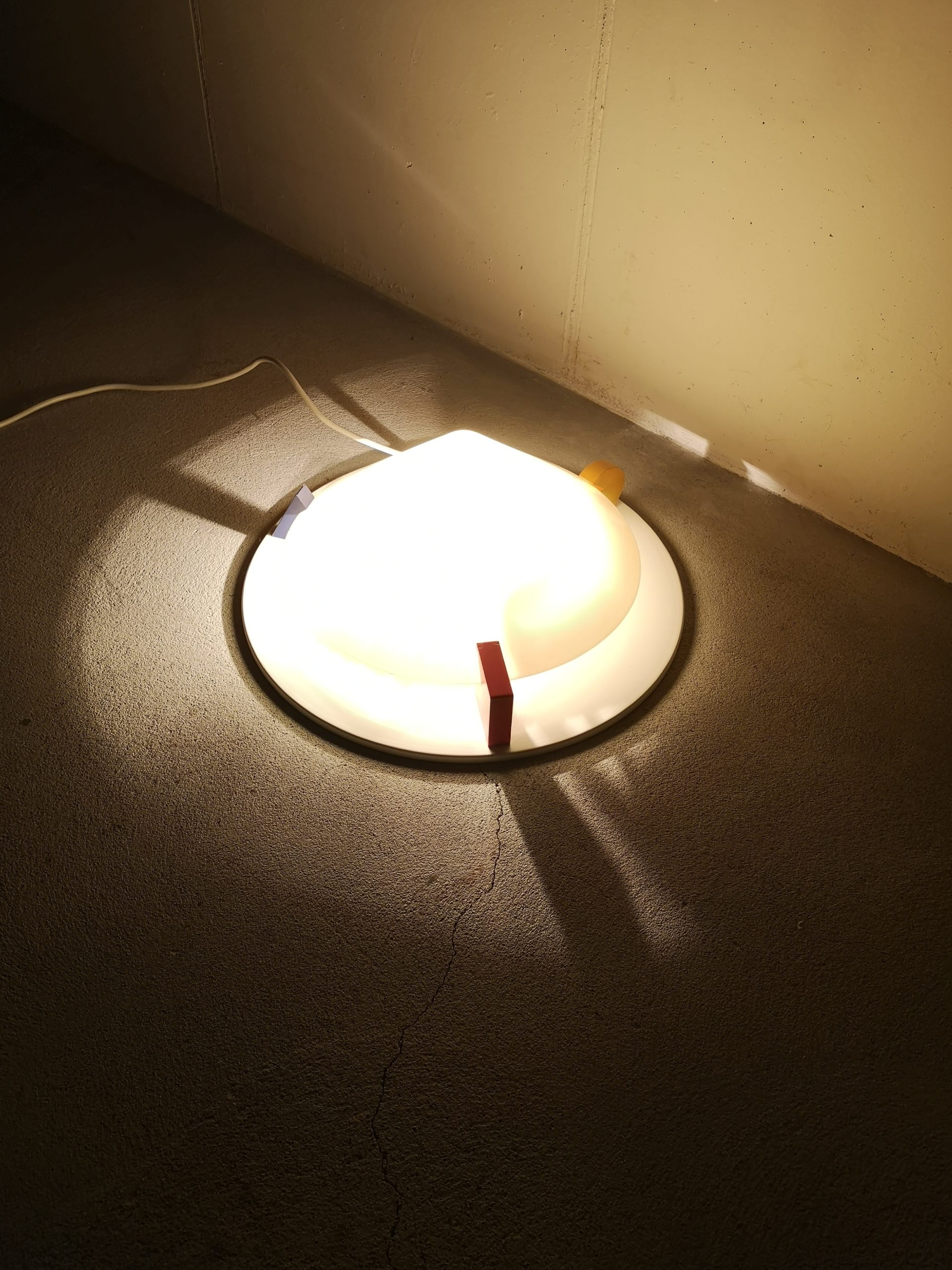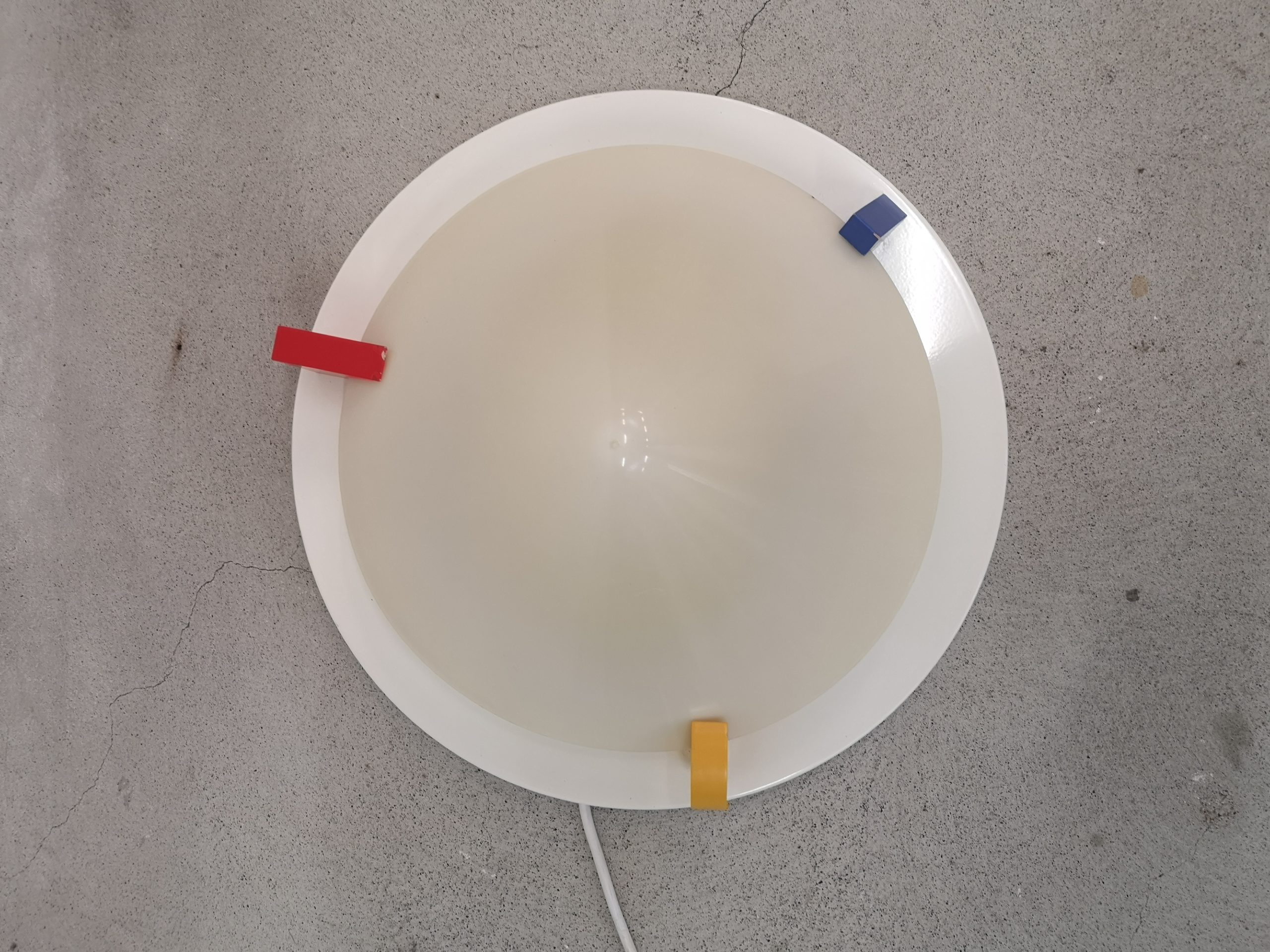 Produit venduPlafonnier ou applique T8814 dans le style Memphis (Ettore Sottsass) conçu par Ikea dans les années 80. Il est composé d’une base en métal, d’un abat-jour en forme de cône en acrylique blanc (jauni par le temps) et de décors en bois : triangle bleu, carré rouge et rond jaune. Pour retirer l’abat-jour, il suffit de tourner les éléments en bois.