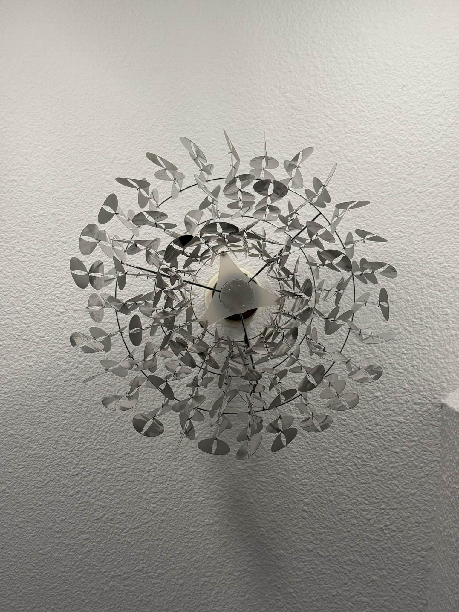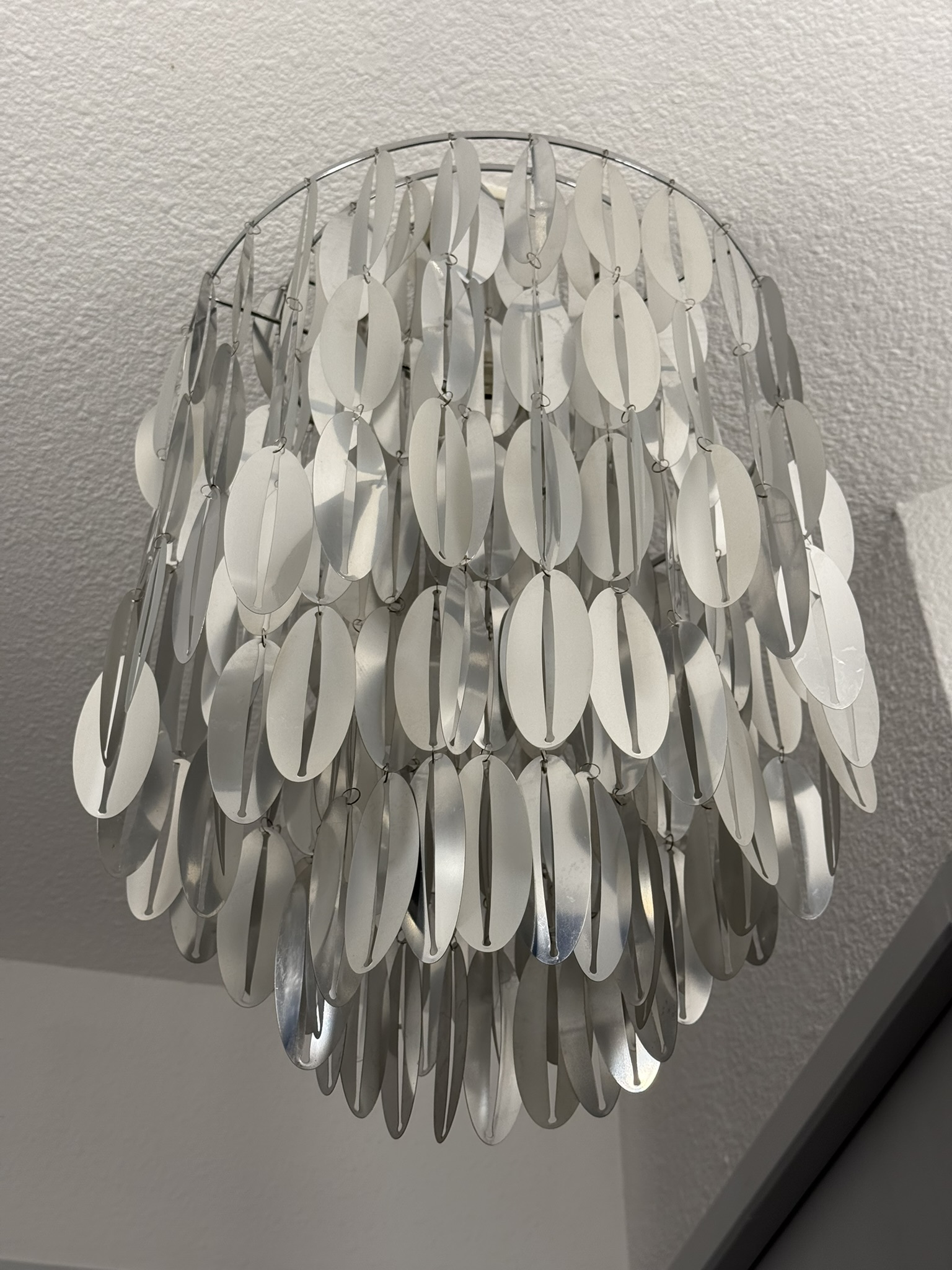 Produit venduCeiling-mounted Space Age lamp featuring a cascading arrangement of detachable plastic discs, creating a striking sculptural effect with diffused lighting.