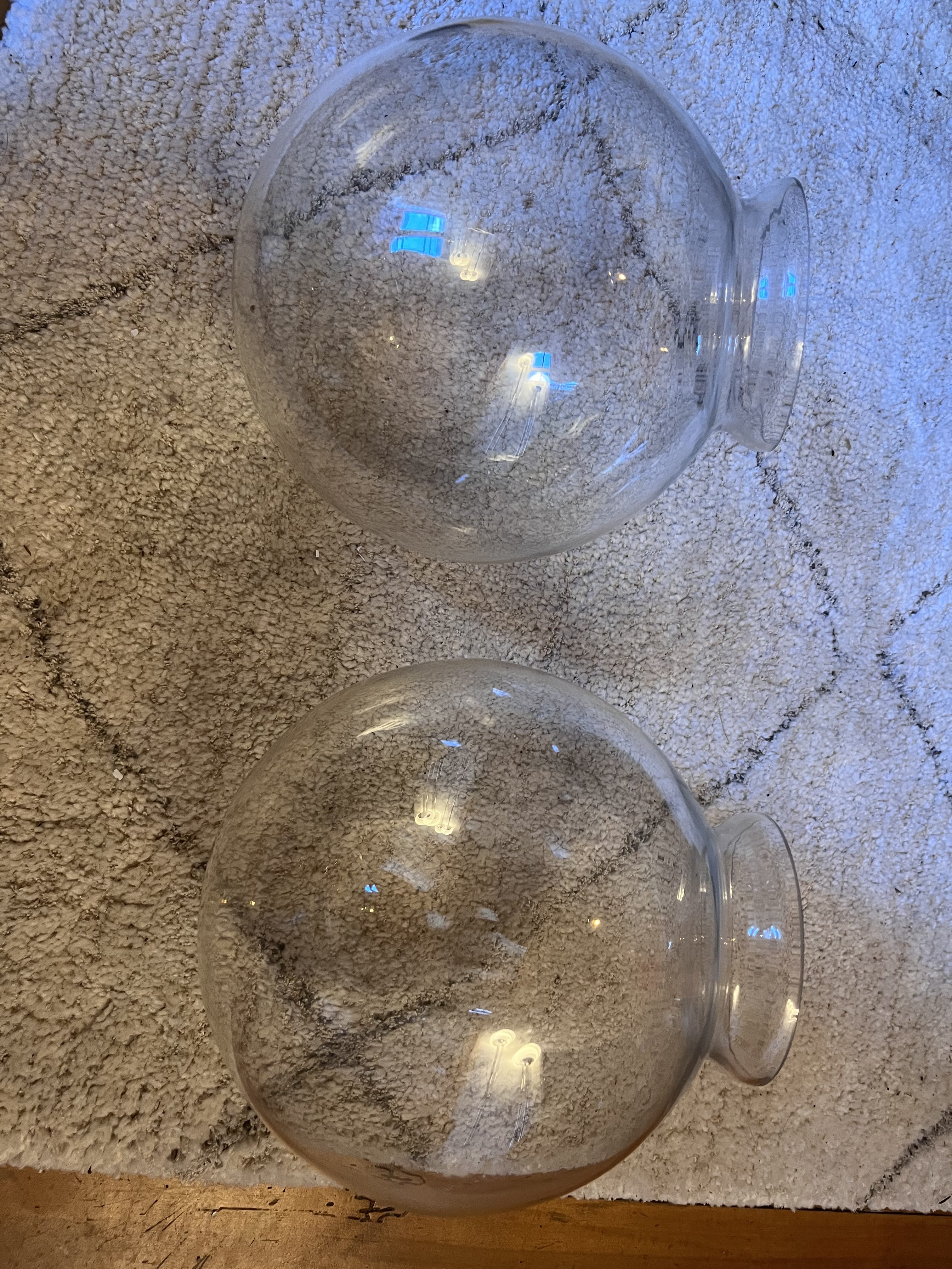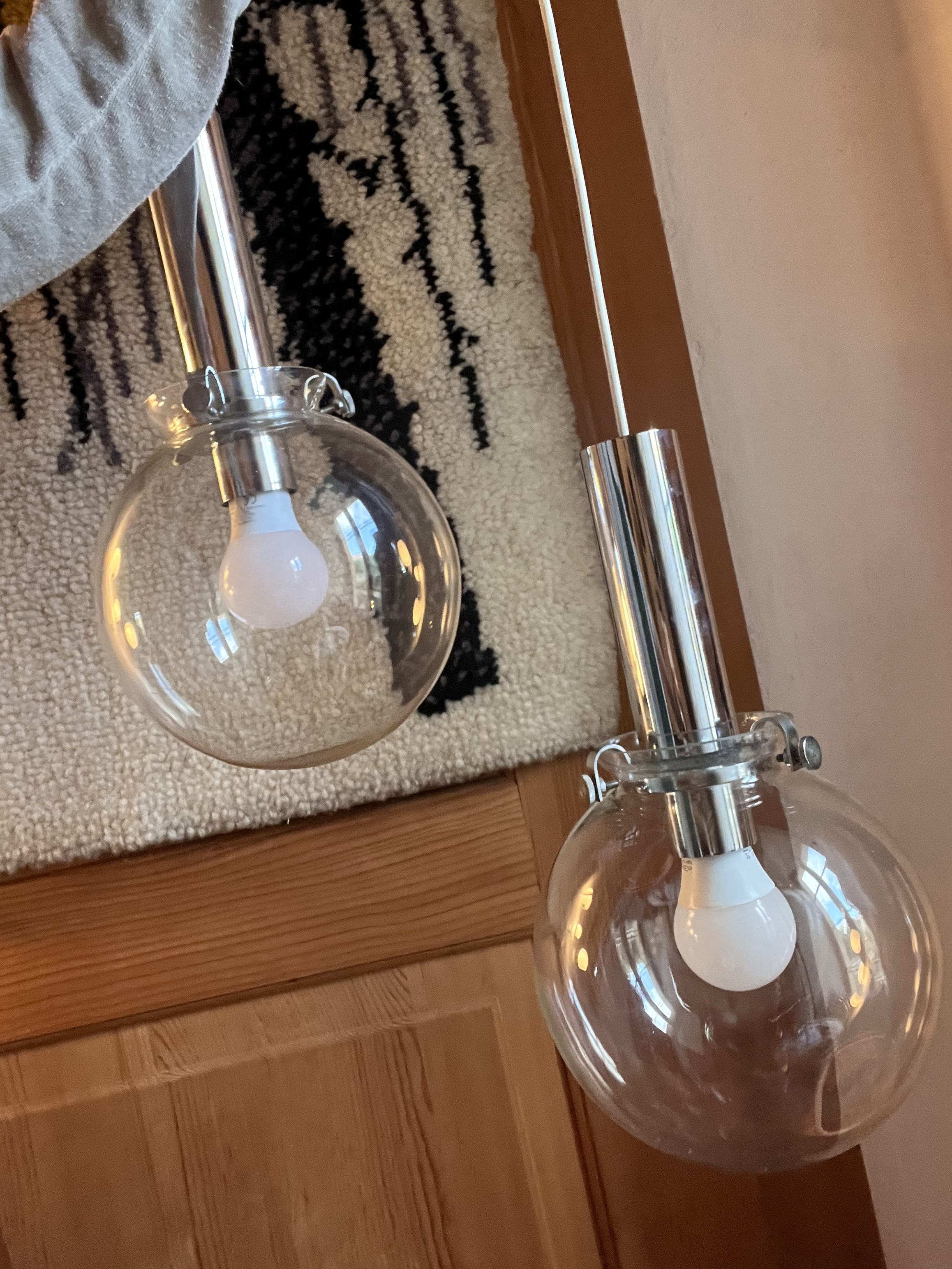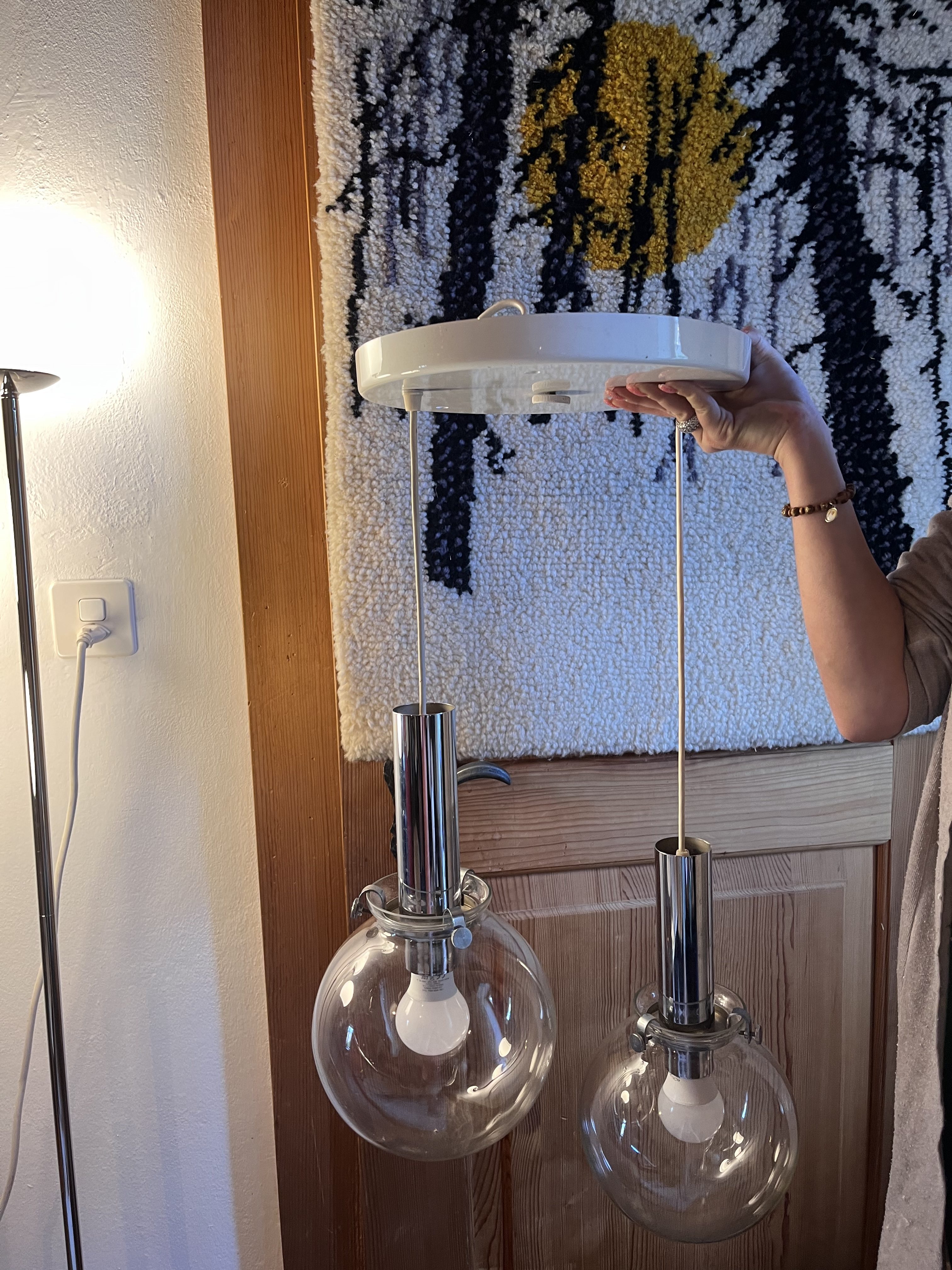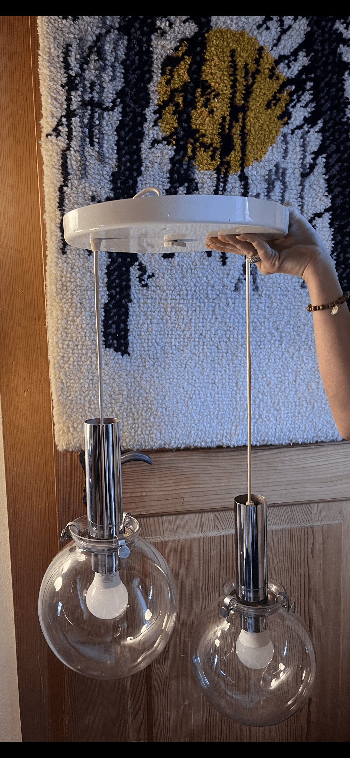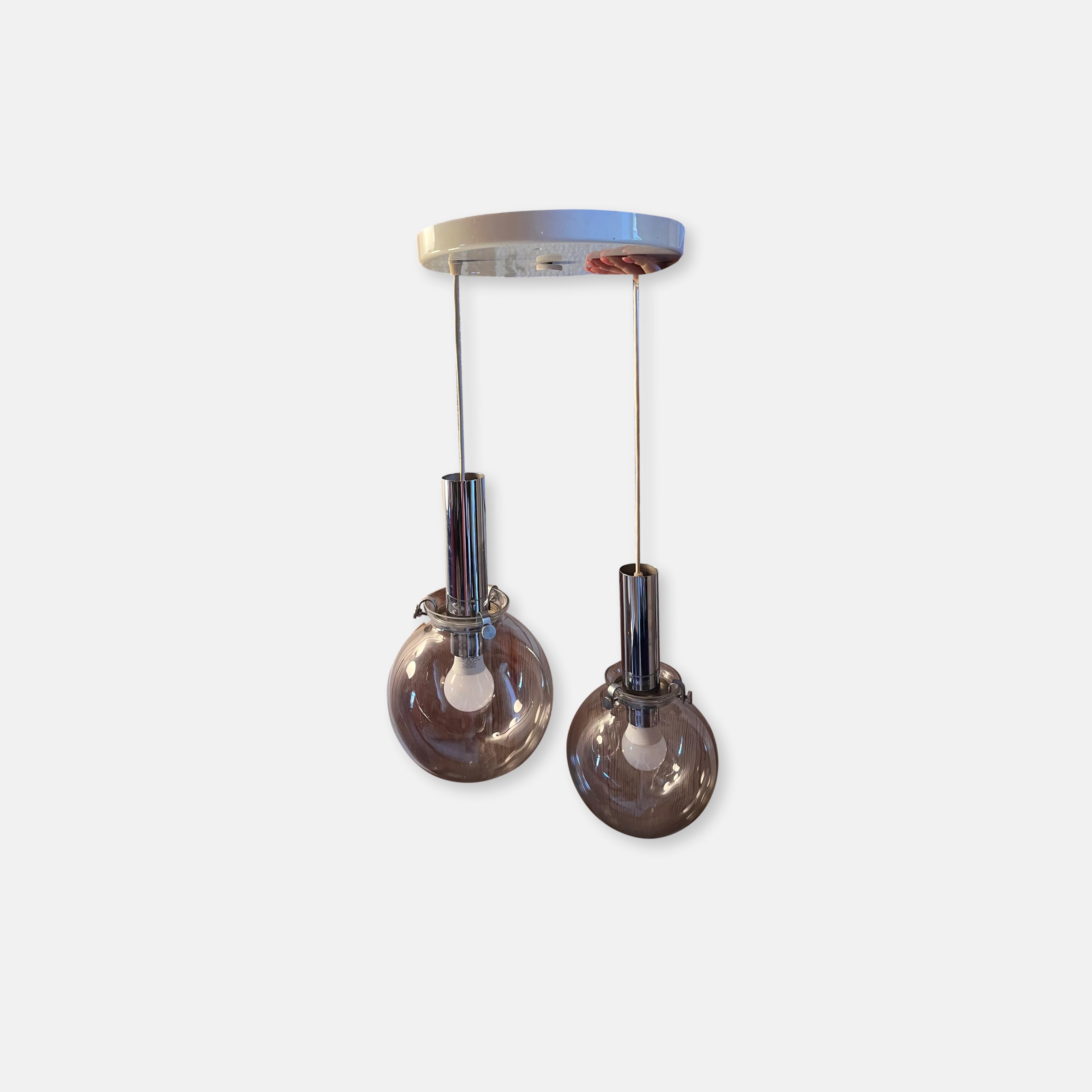 Produit venduSuspension vintage avec deux globes en verre et plafonnier en métal blanc.