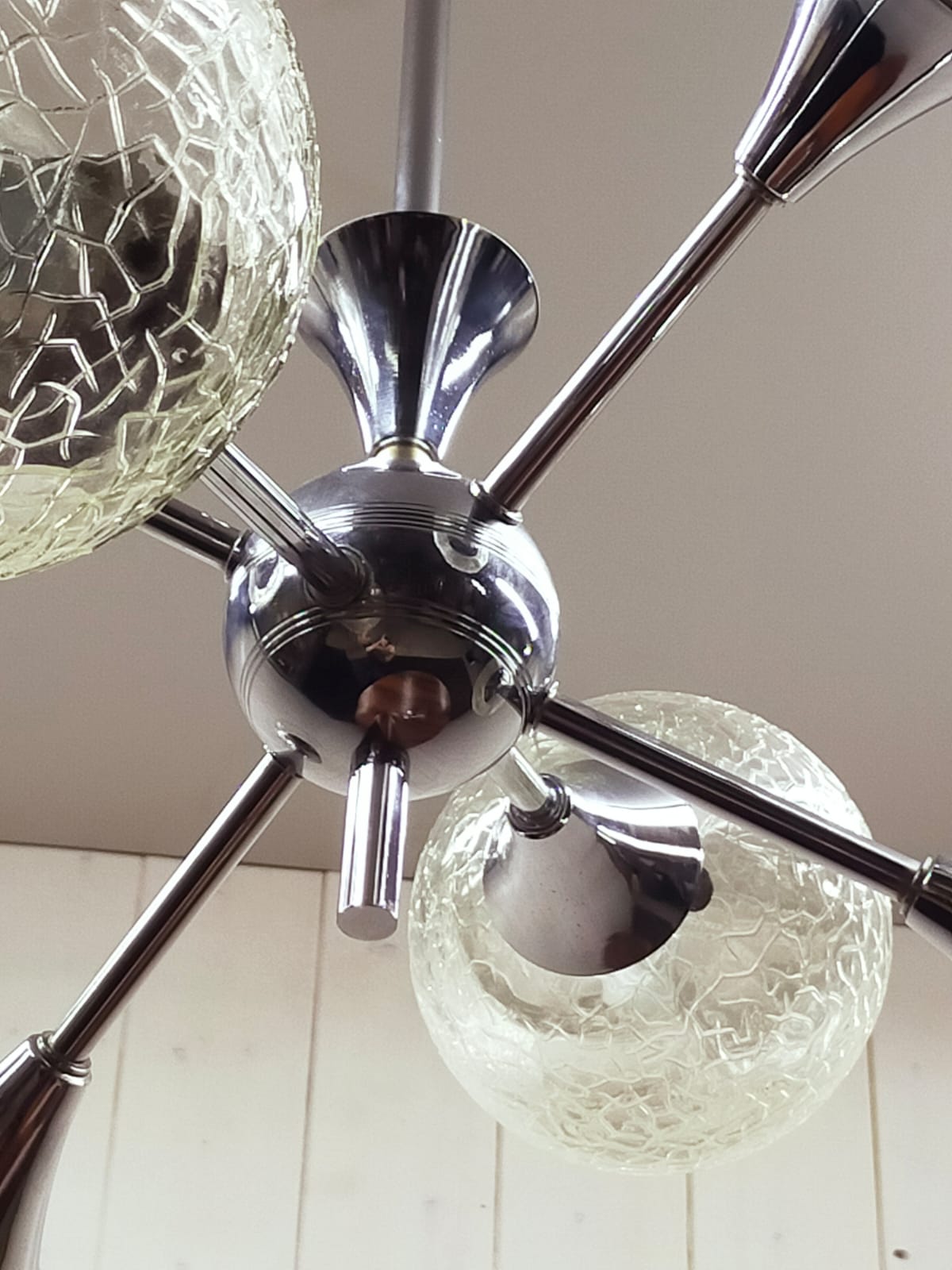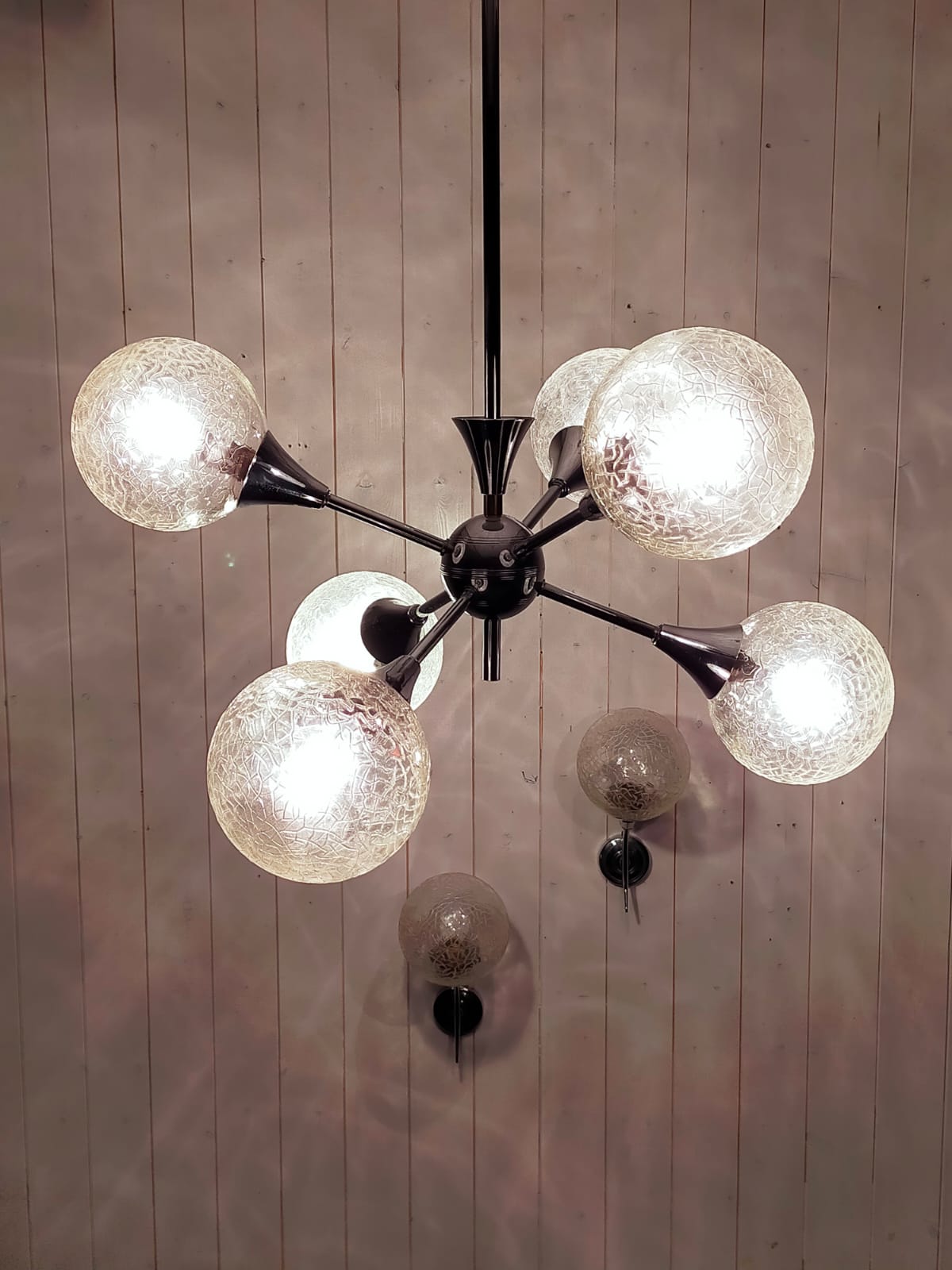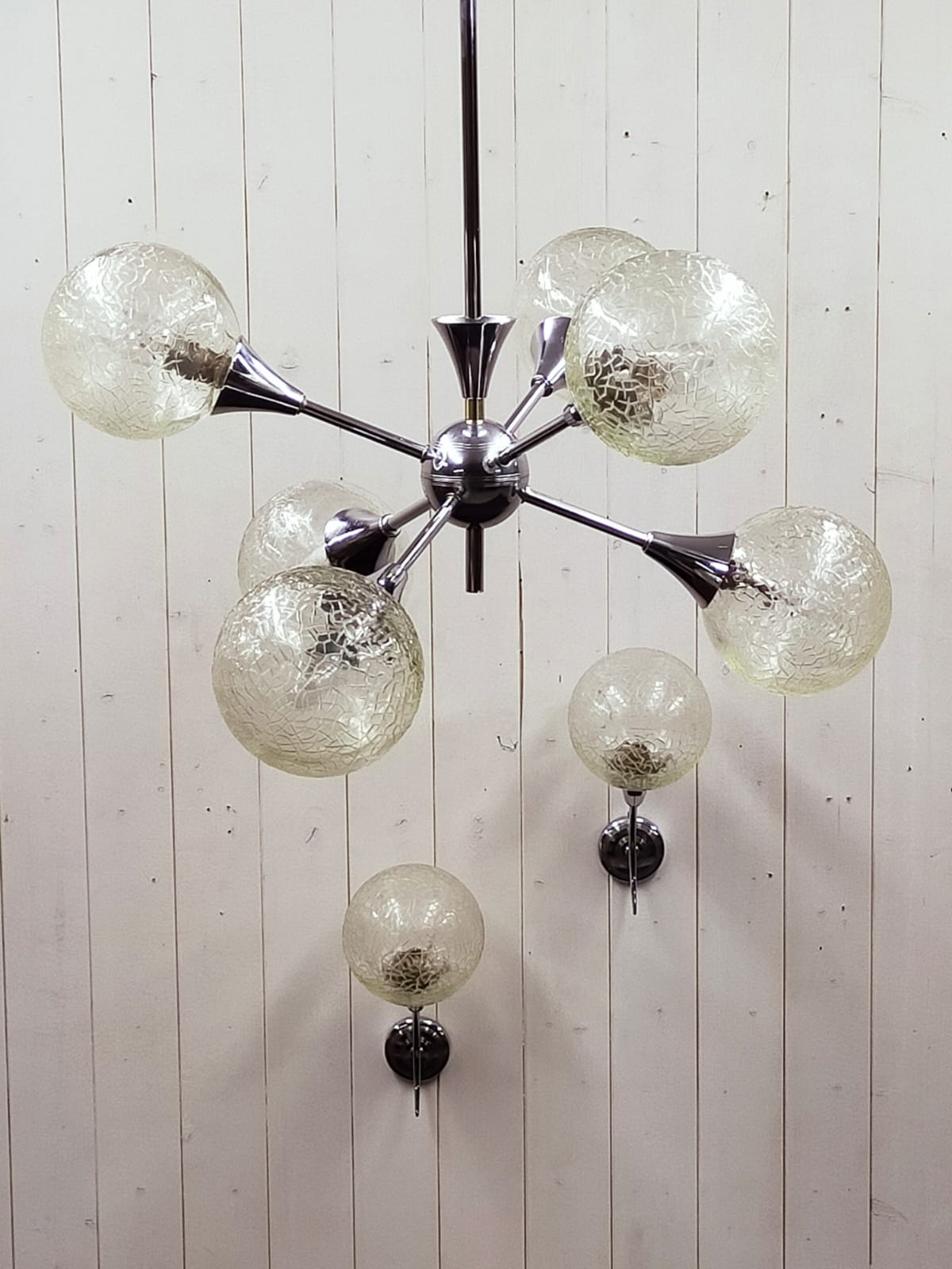 Magnifique et rare ensemble spoutnik des années Space age (années 70) composé d’une suspension avec 6 globes et de deux appliques. Le tout en parfait tout droit sortie de restauration.