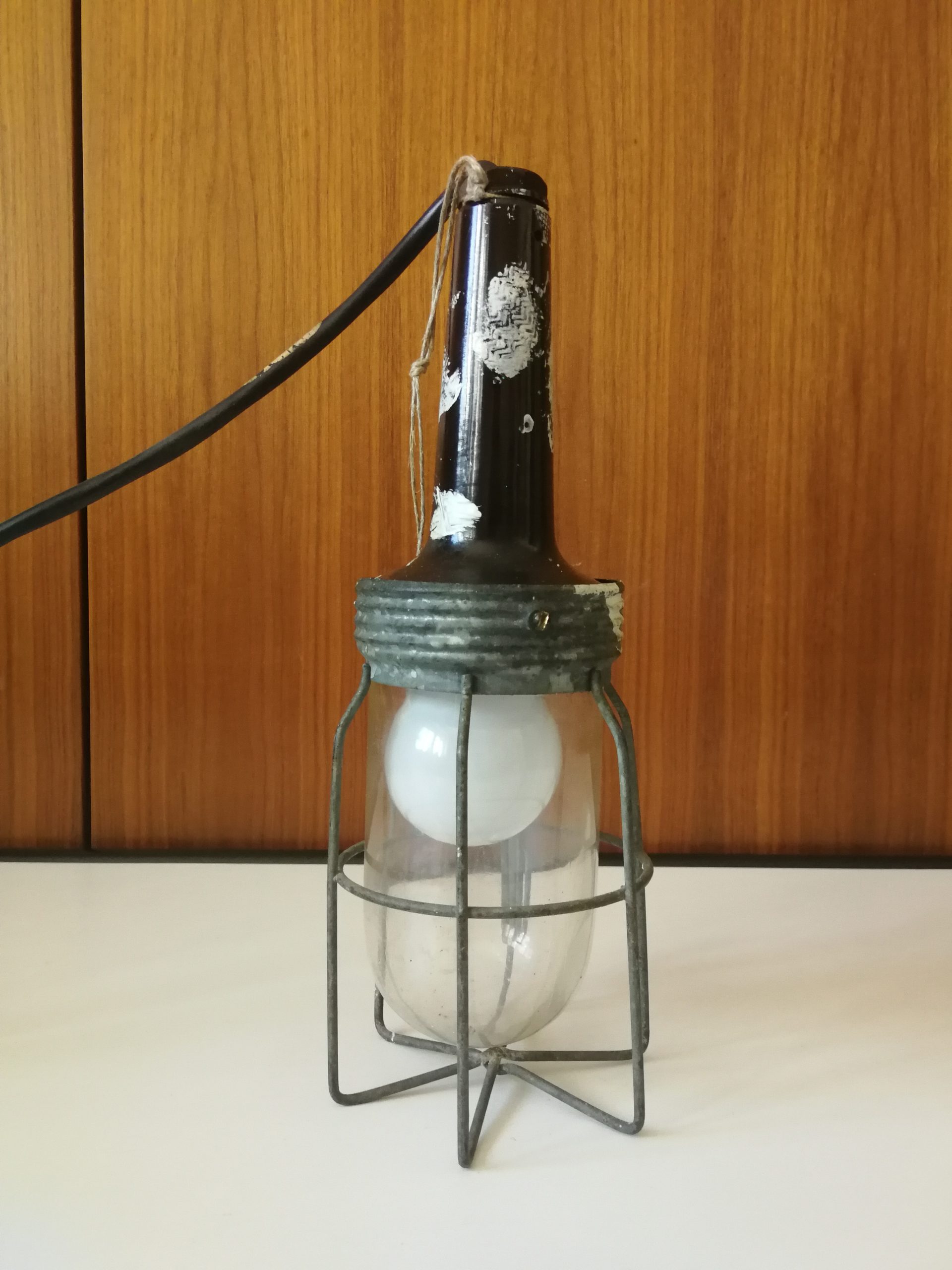 Produit venduSuspension industrielle vintage. En métal et verre. Elle est dotée d’un long câble (environ 2 mètres) pour la brancher à une prise et d’une ficelle mais aussi d’un crochet en métal pour la suspendre. Des traces de peinture blanche soulignent son caractère industriel.