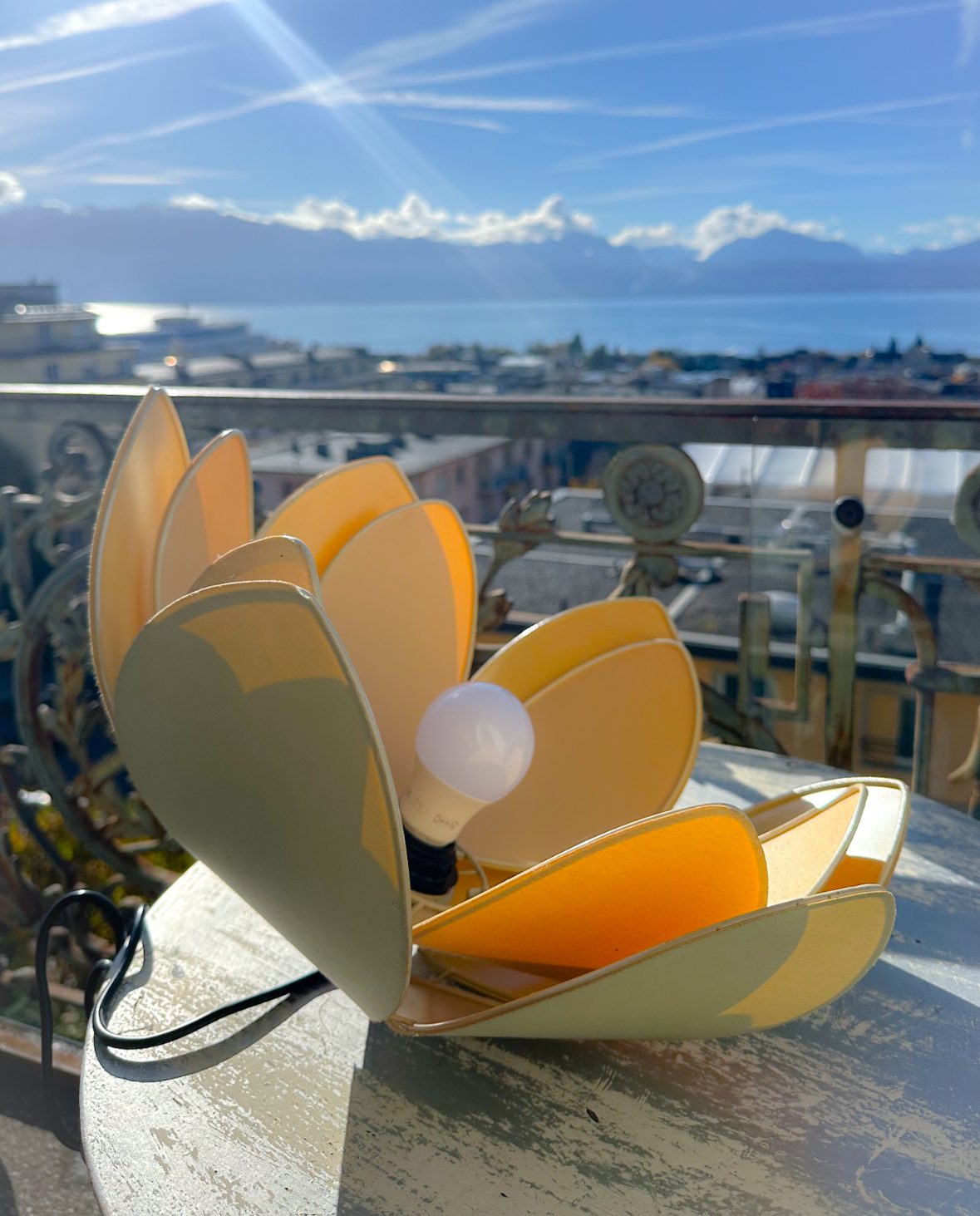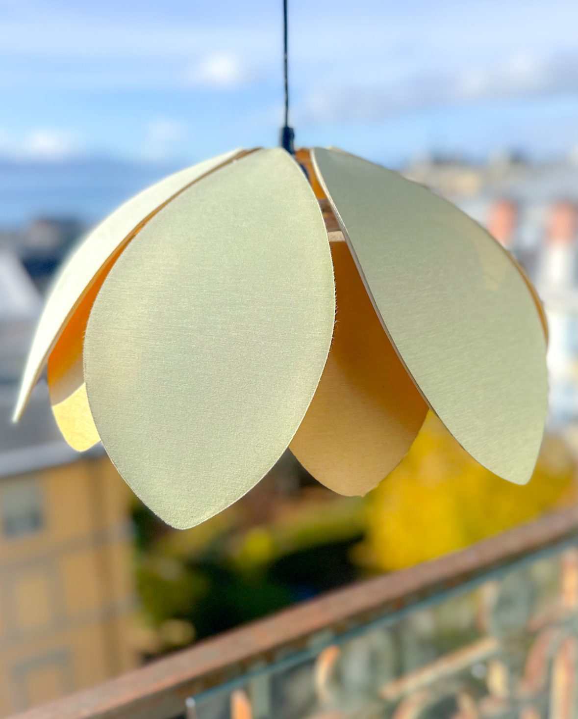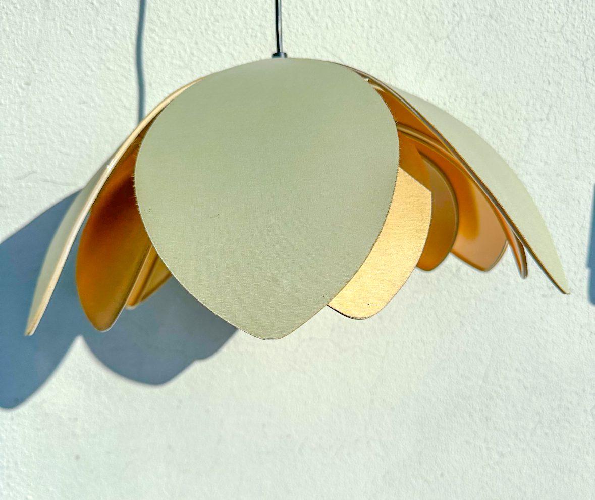 Une belle suspension lotus composée d’une double rangée de pétales textiles.