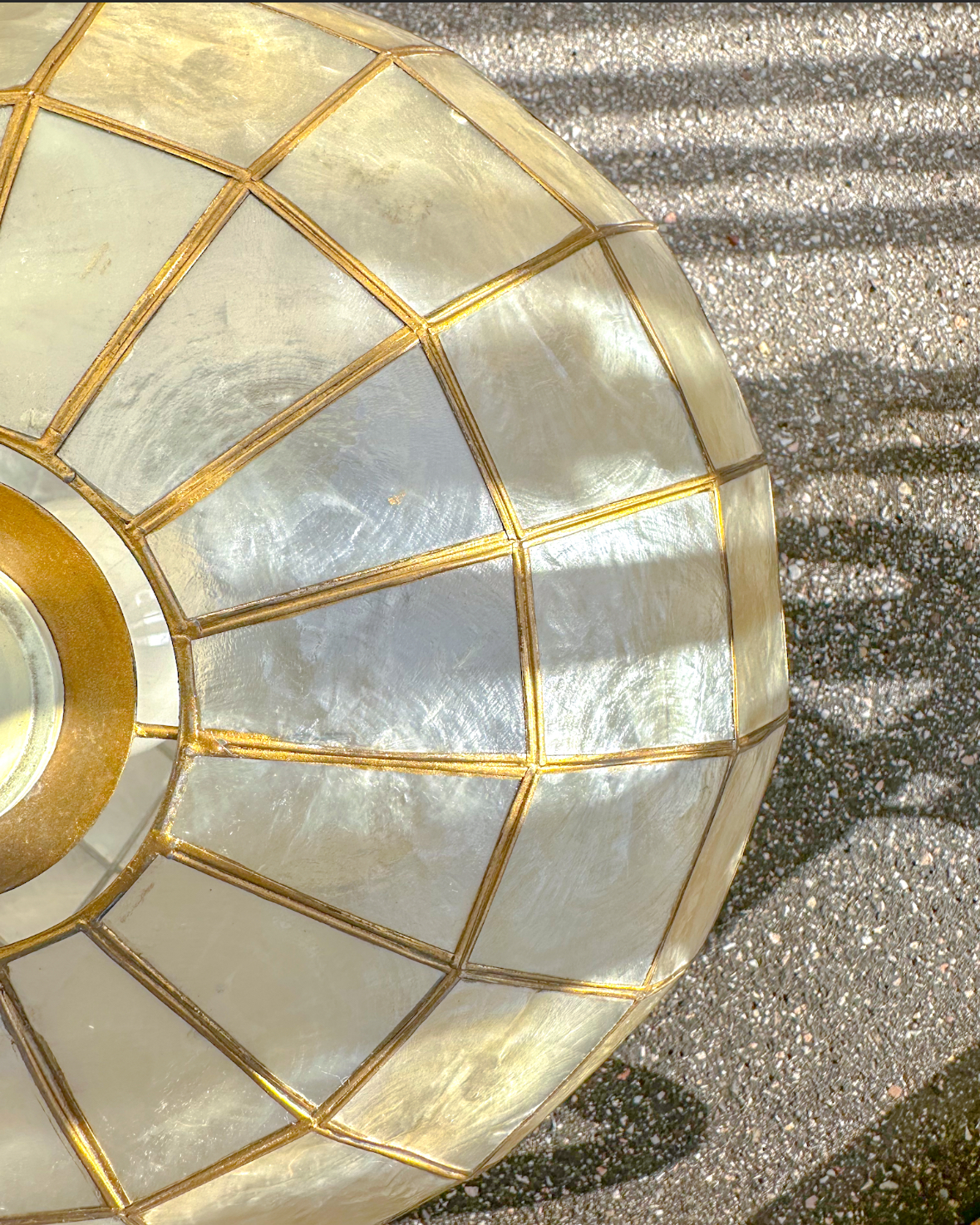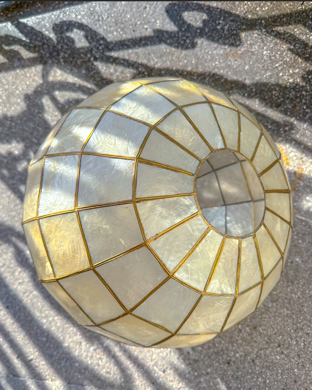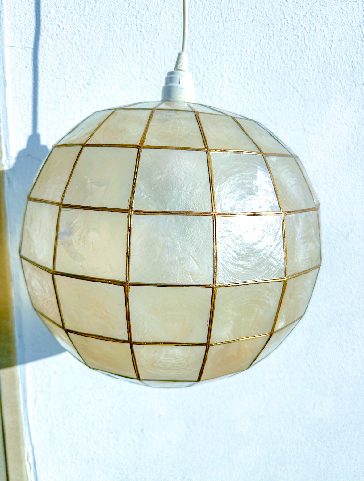 Grand lustre constitué d’une sphère en nacre provenant probablement des Philippines et datant des années 70.