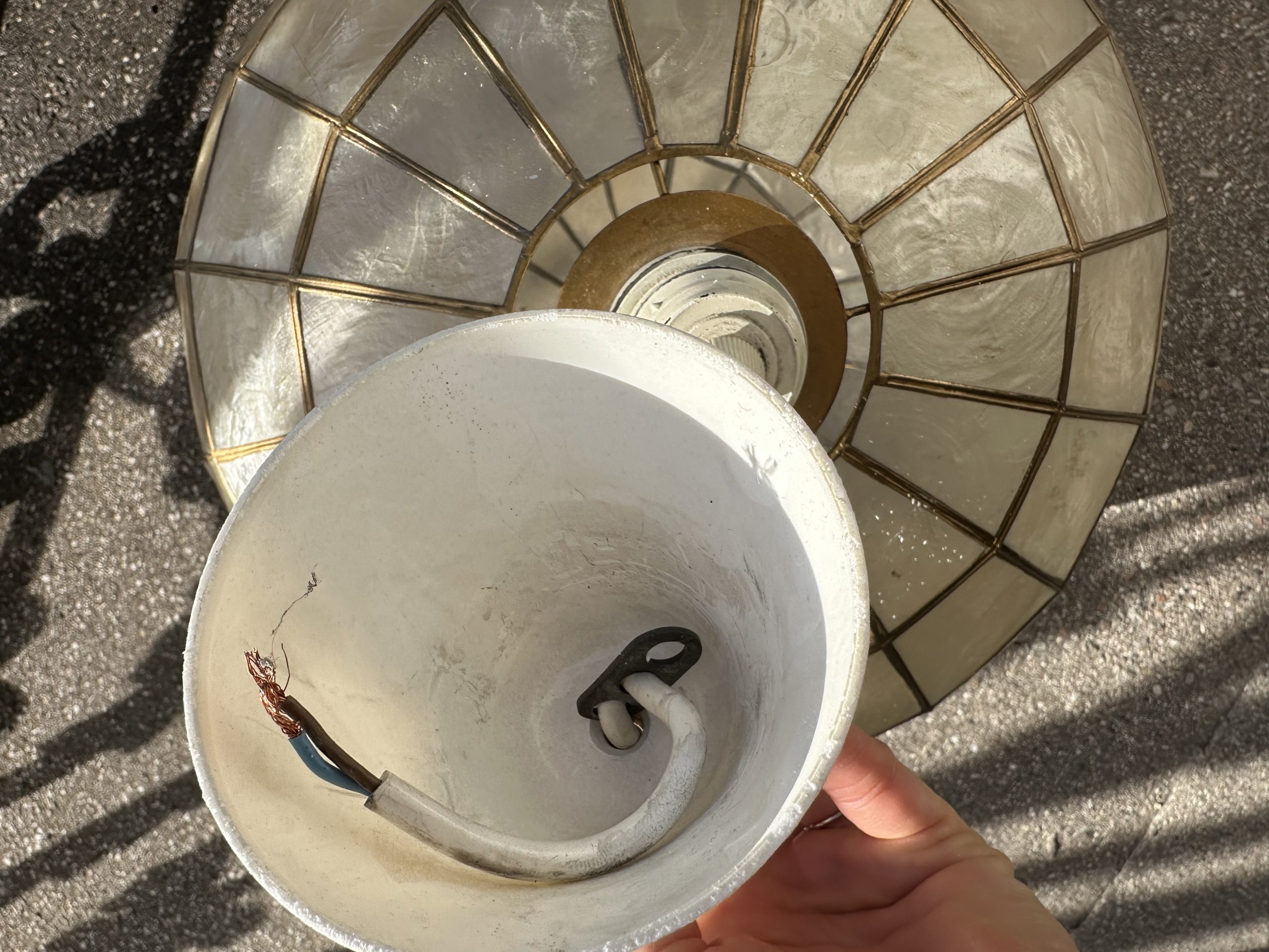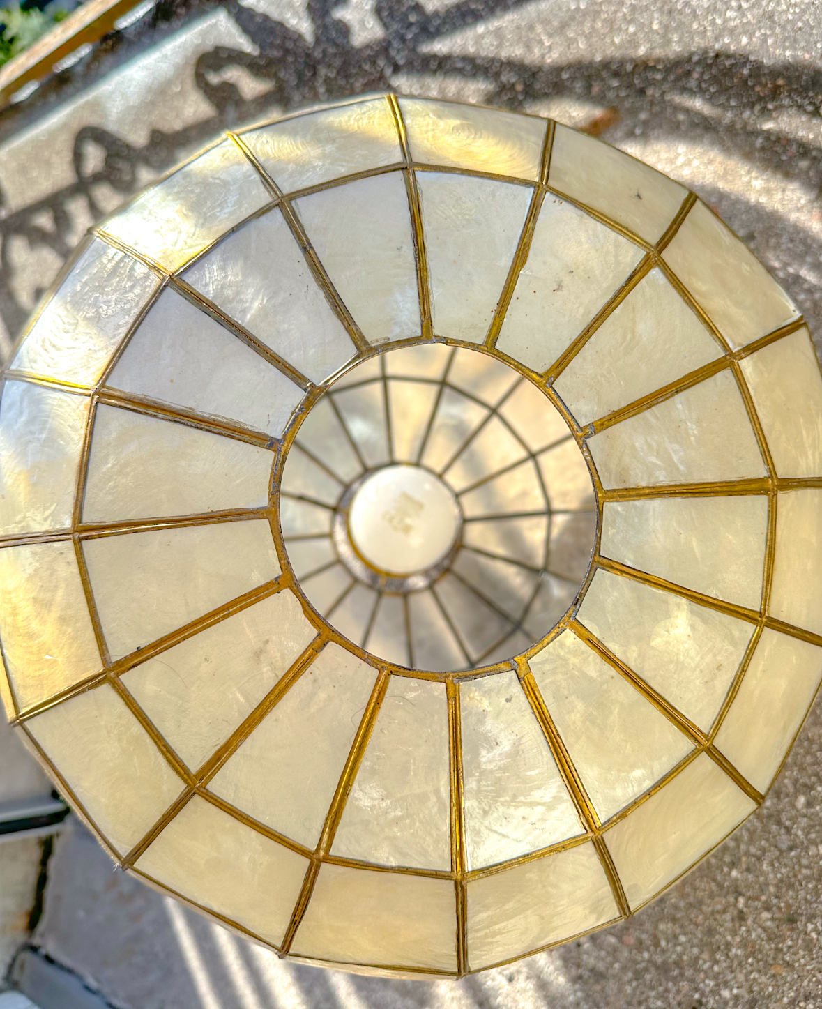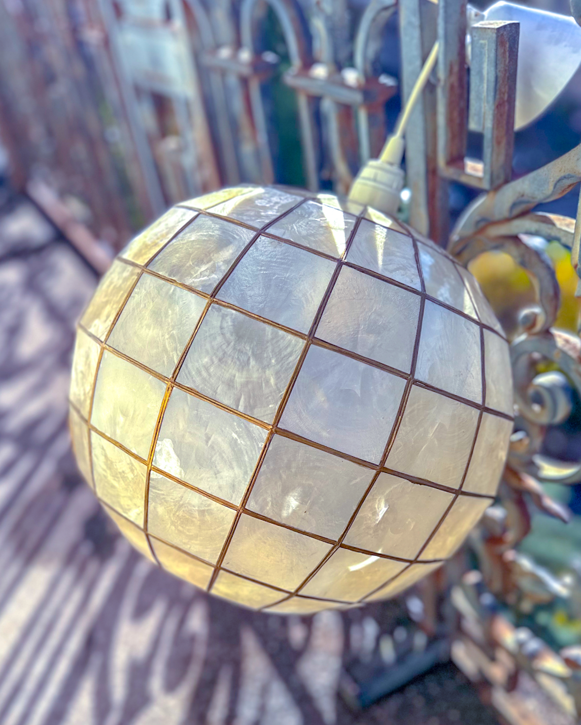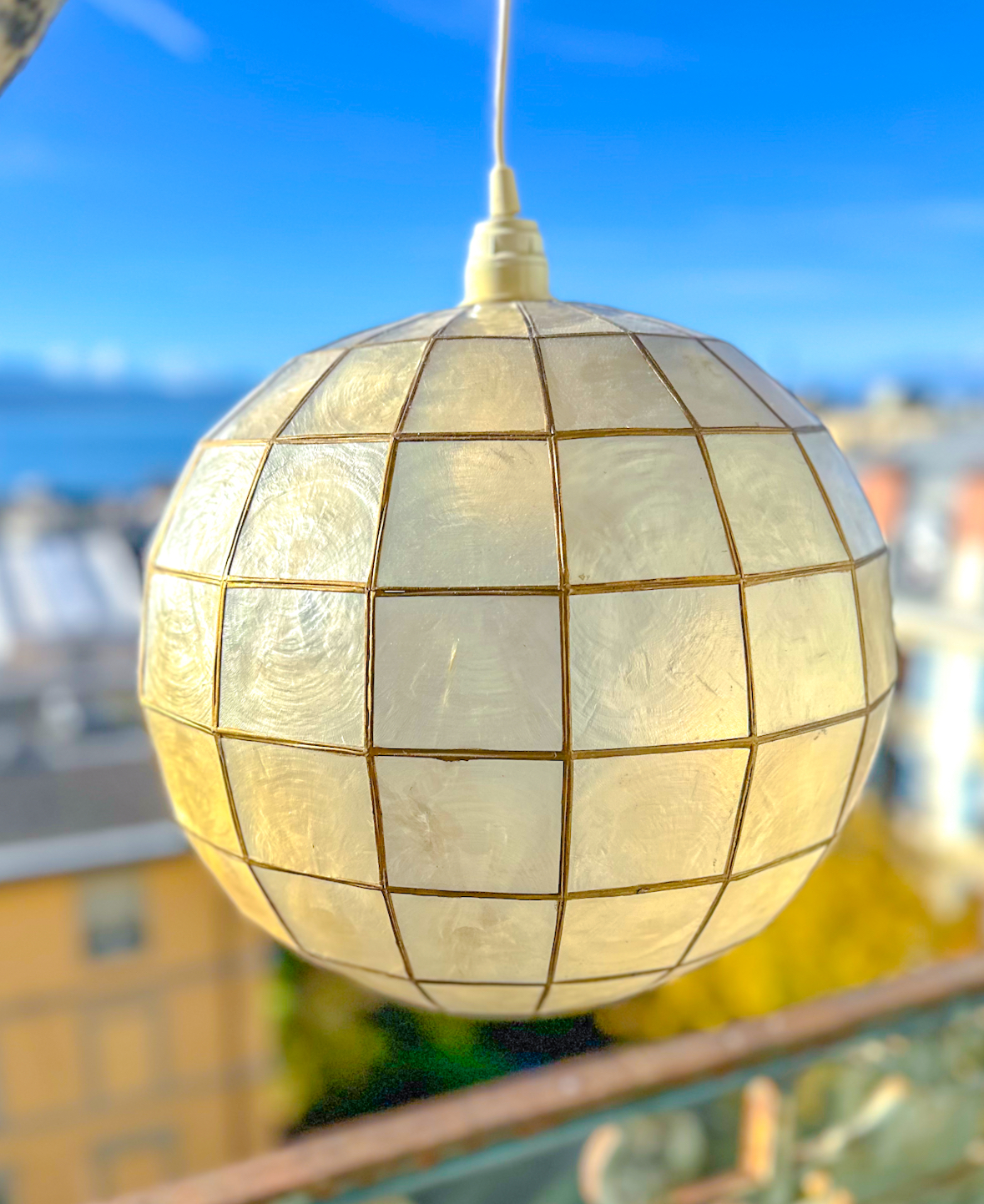 Grand lustre constitué d’une sphère en nacre provenant probablement des Philippines et datant des années 70.