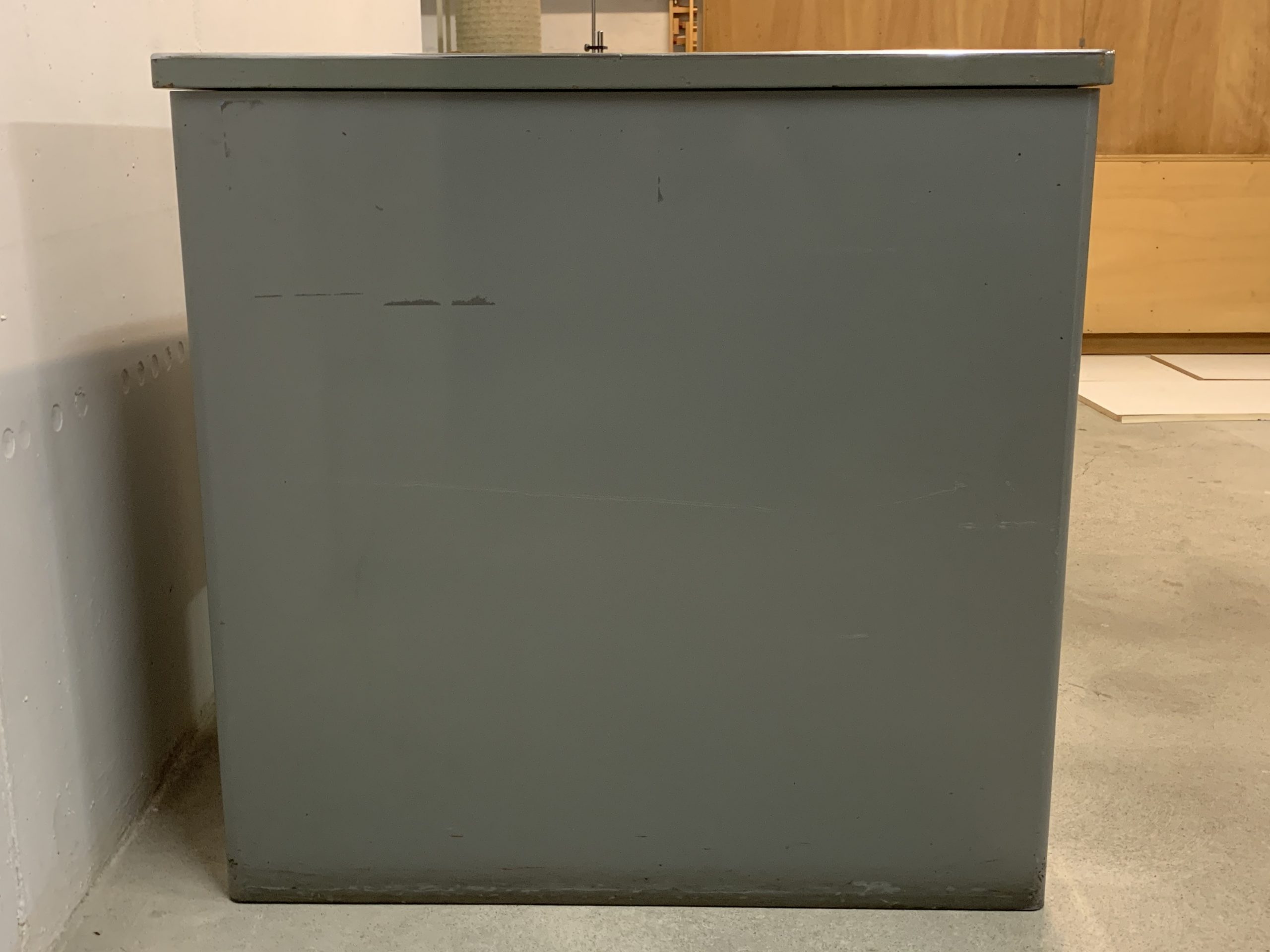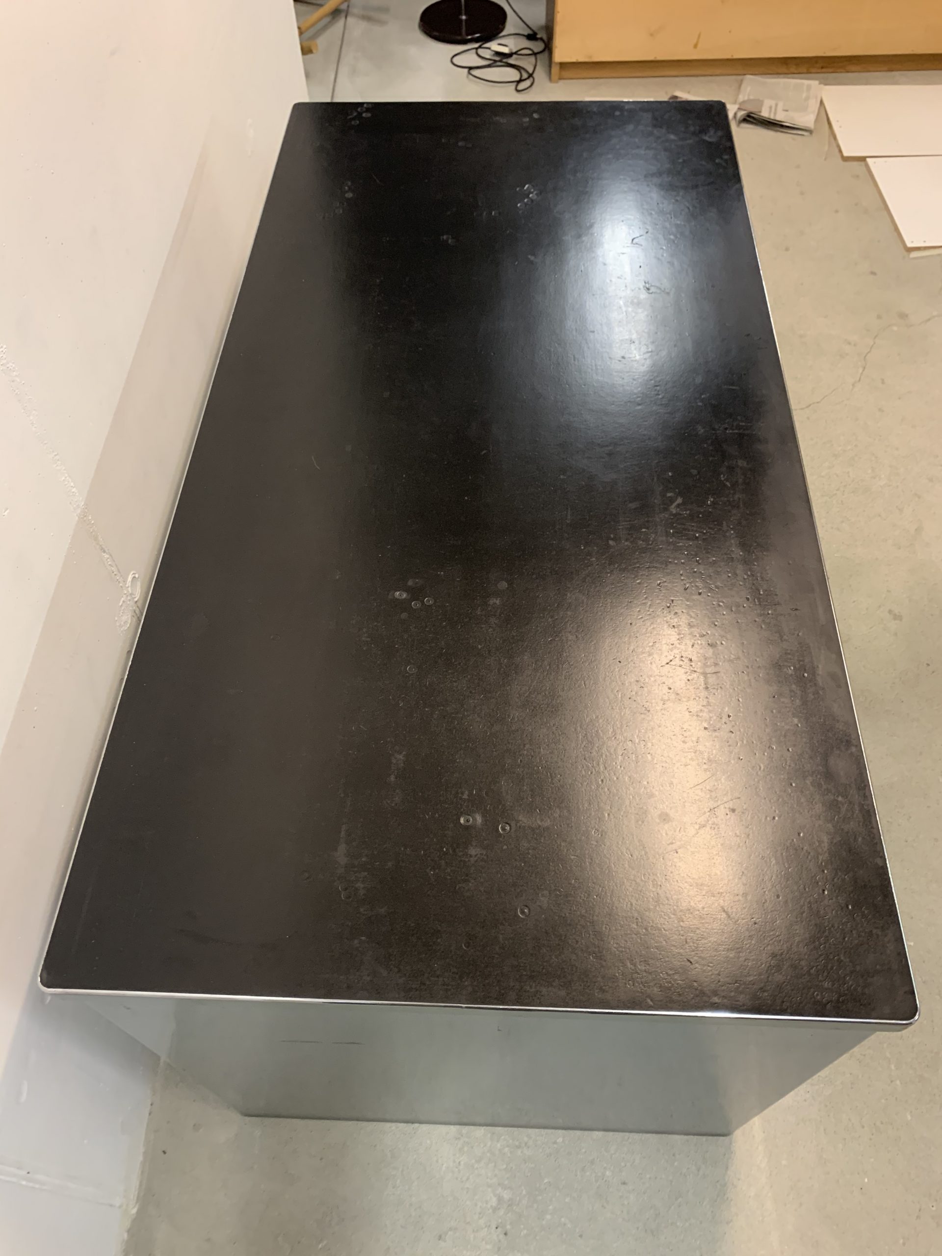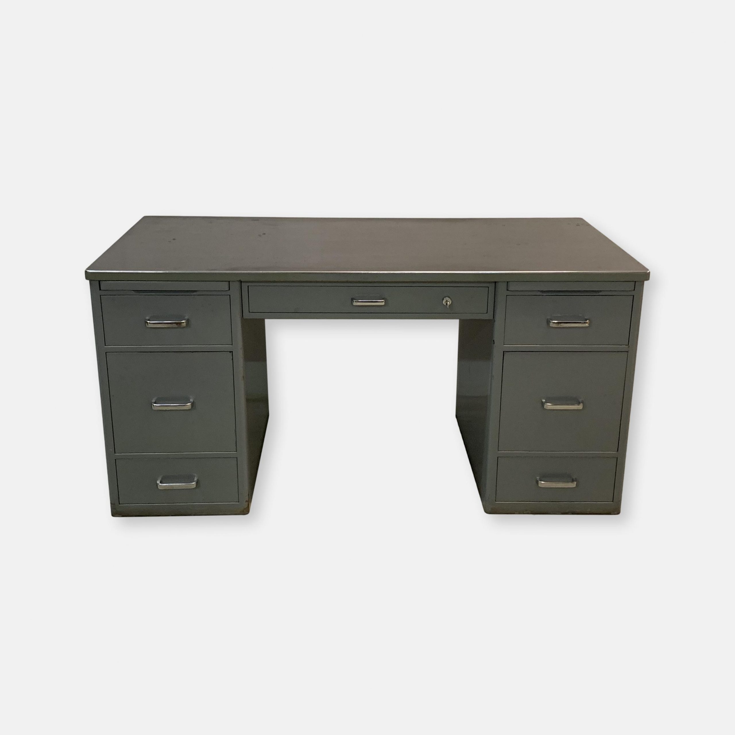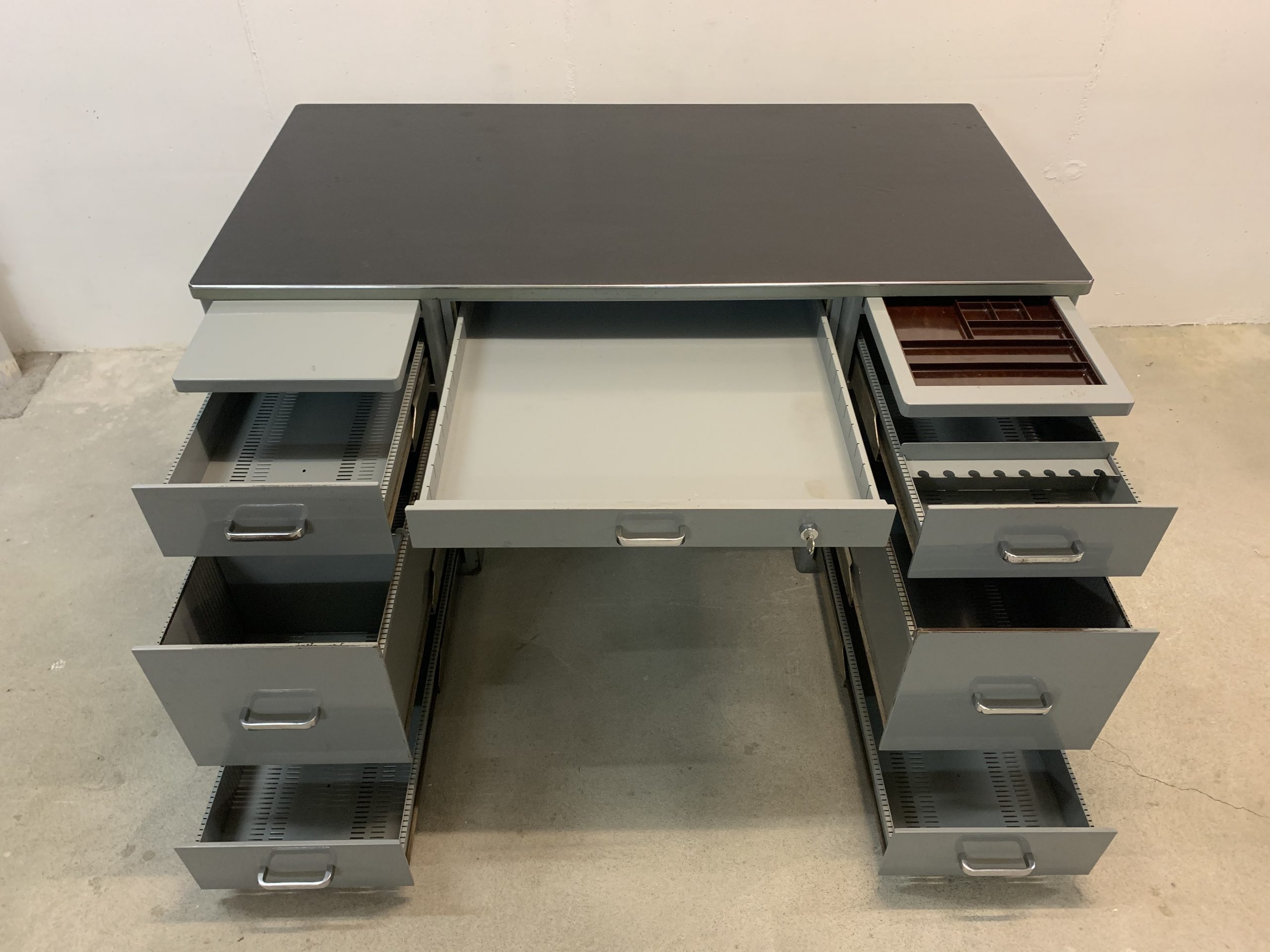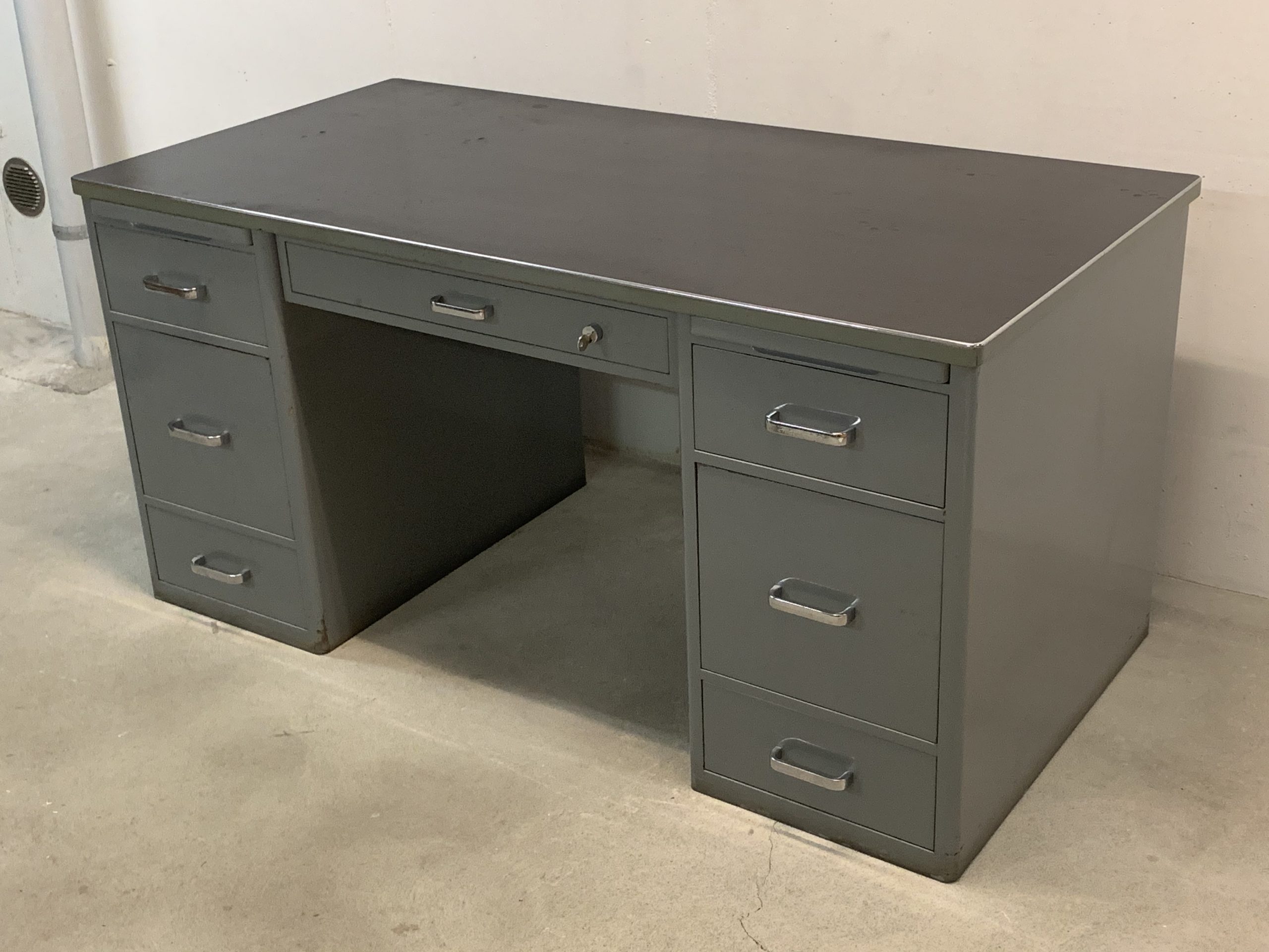 Produit venduBureau Bigla en métal des années 60. Le bureau est très lourd et solide. Les tiroirs sont montés sur des rails qui coulissent comme au premier jour. 2 clés disponibles. La serrure unique ferme presque tous les tiroirs simultanément. Les grands tiroirs conviennent pour les dossiers suspendus; les autres ont quelques petits équipements modulables. La surface du bureau est recouverte d’une sorte de lino qui a plusieurs marques d’impacts et d’une trace (3 cm), comme on peut le voir sur les photos. L’état général du bureau reste très bon.