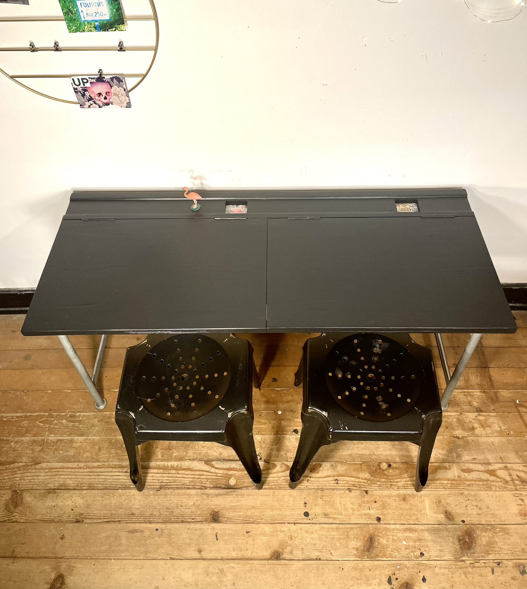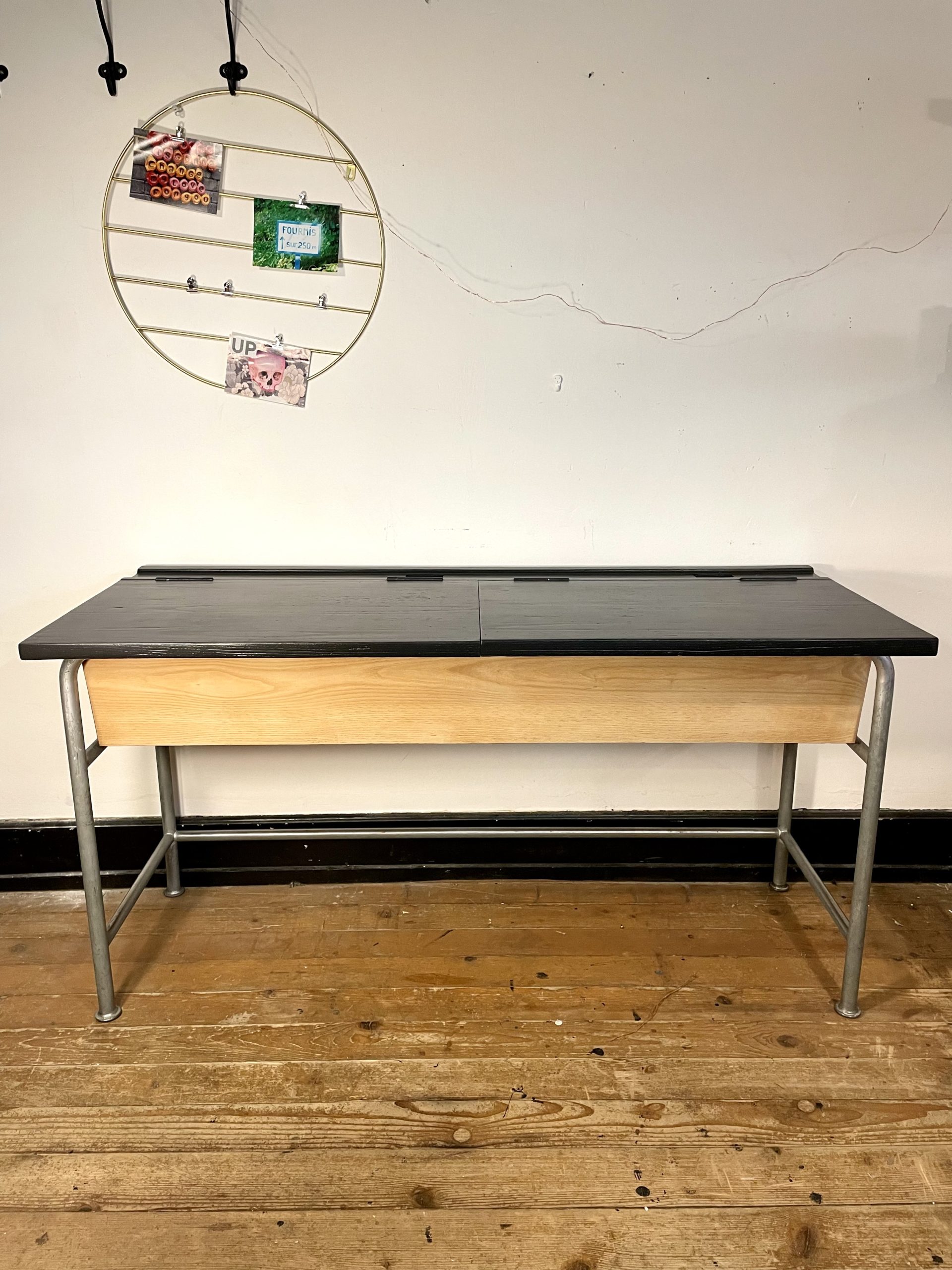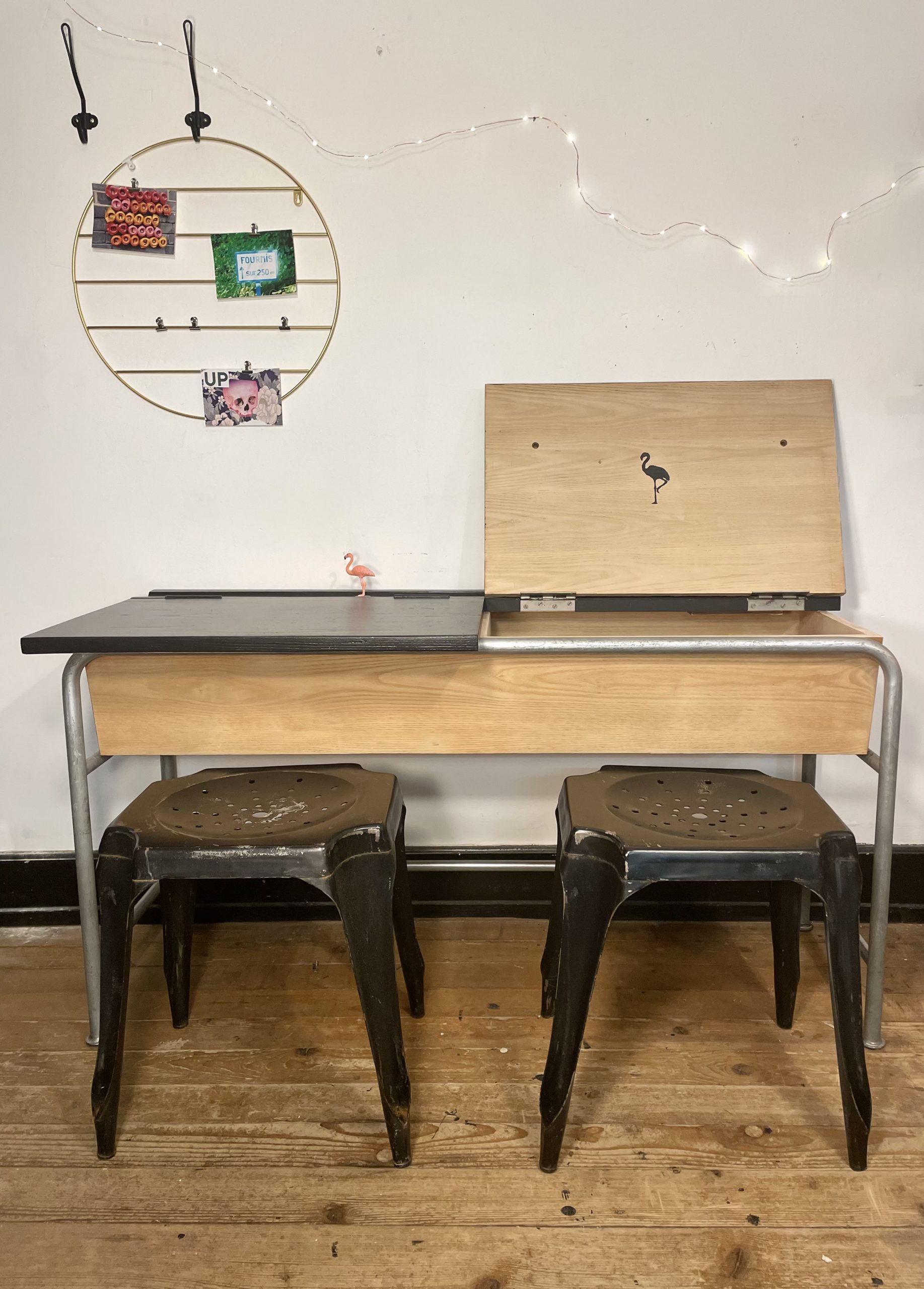 Produit venduBureau d’écolier double revisité. plateau repeint en noir. Piétement métal. Flamant rose dans les tiroirs lorsque l’on soulève le plateau. Crochets sur les côtés. Papier peint tigre et flamant rise à la place des encriers.