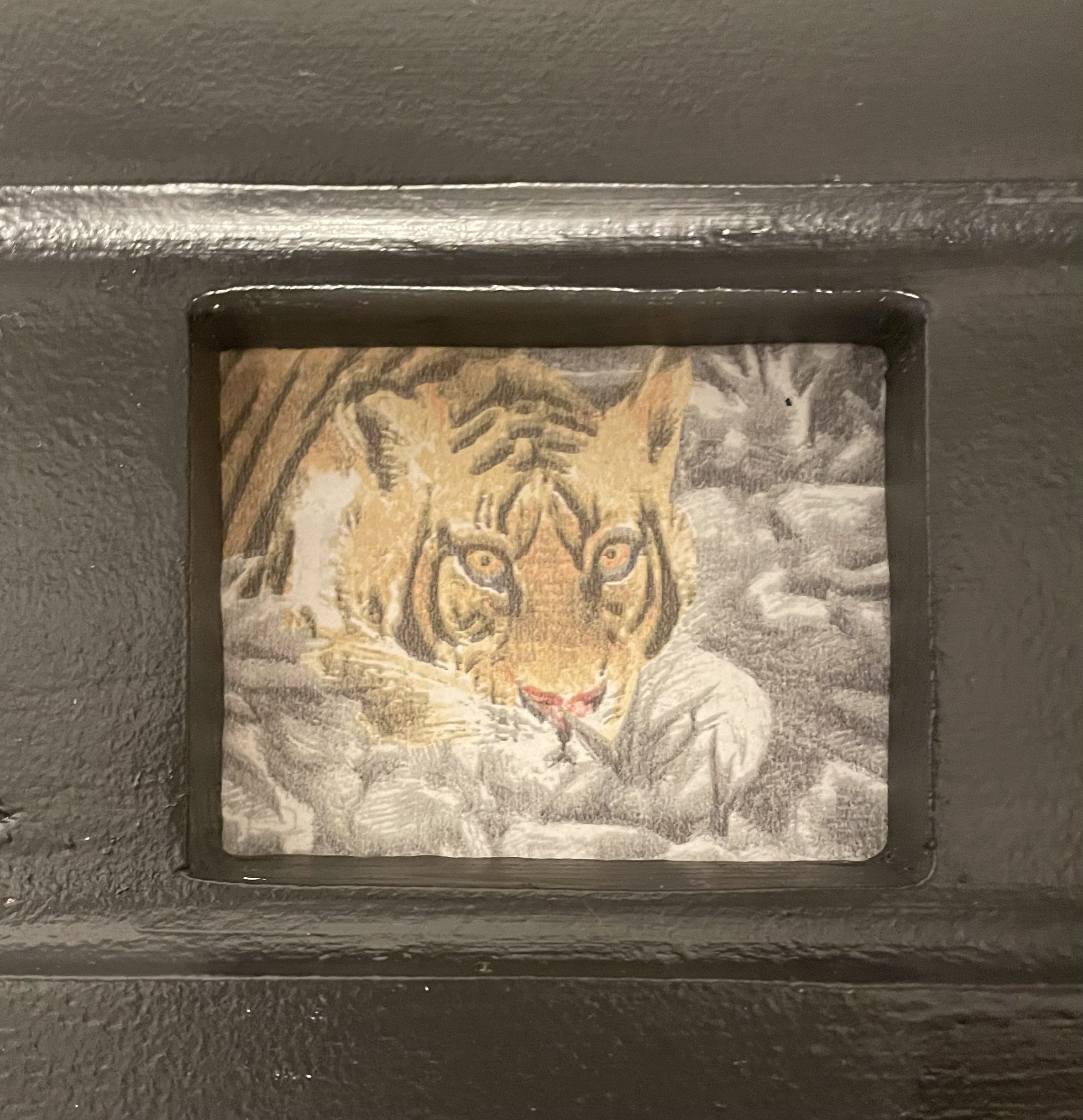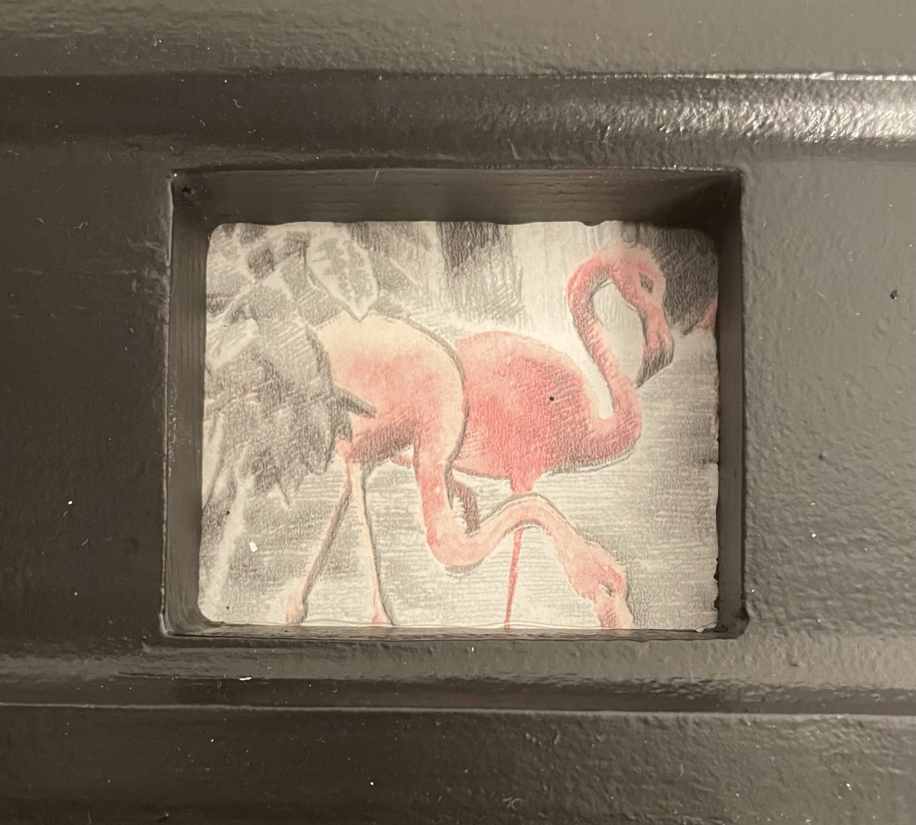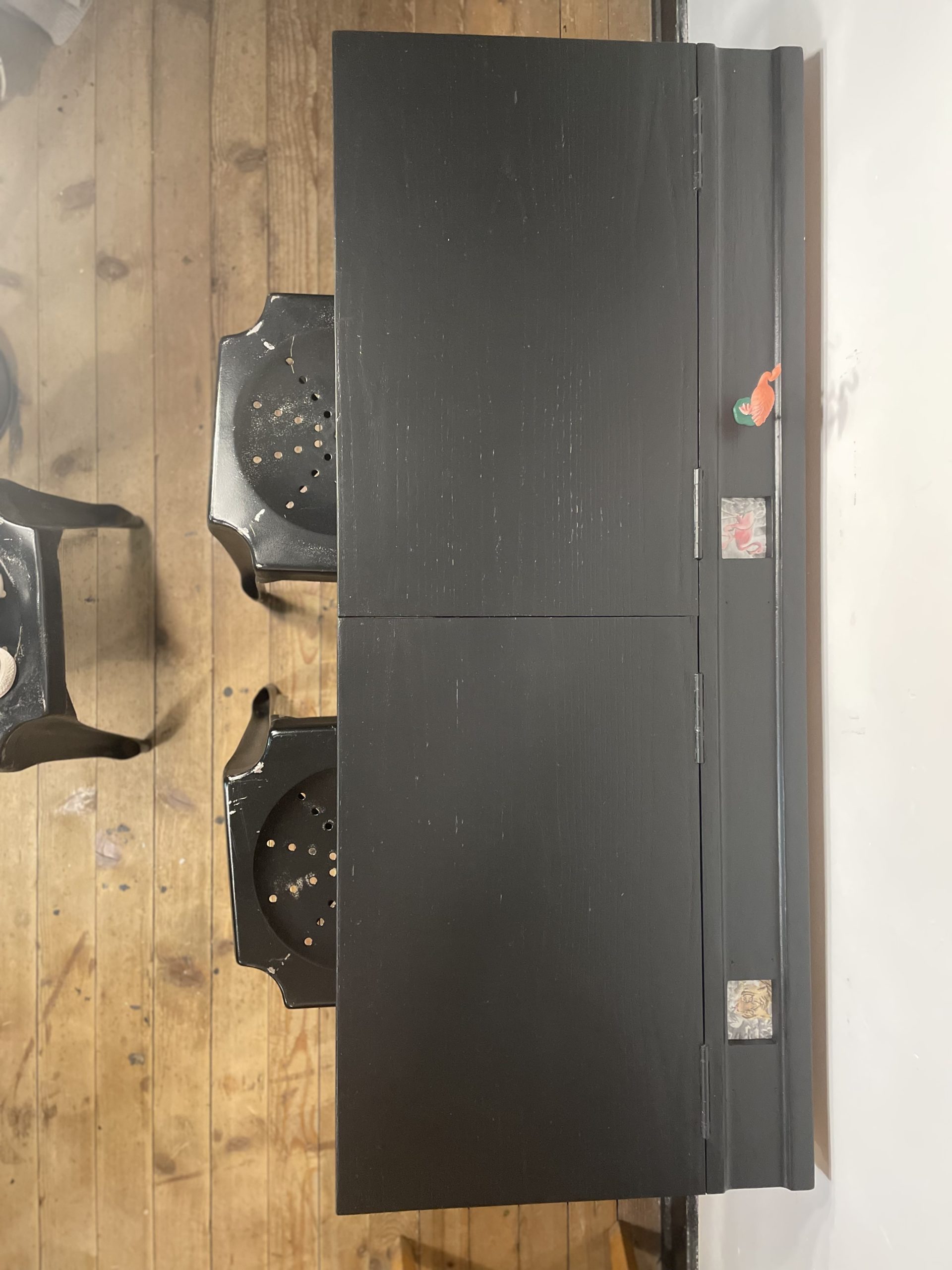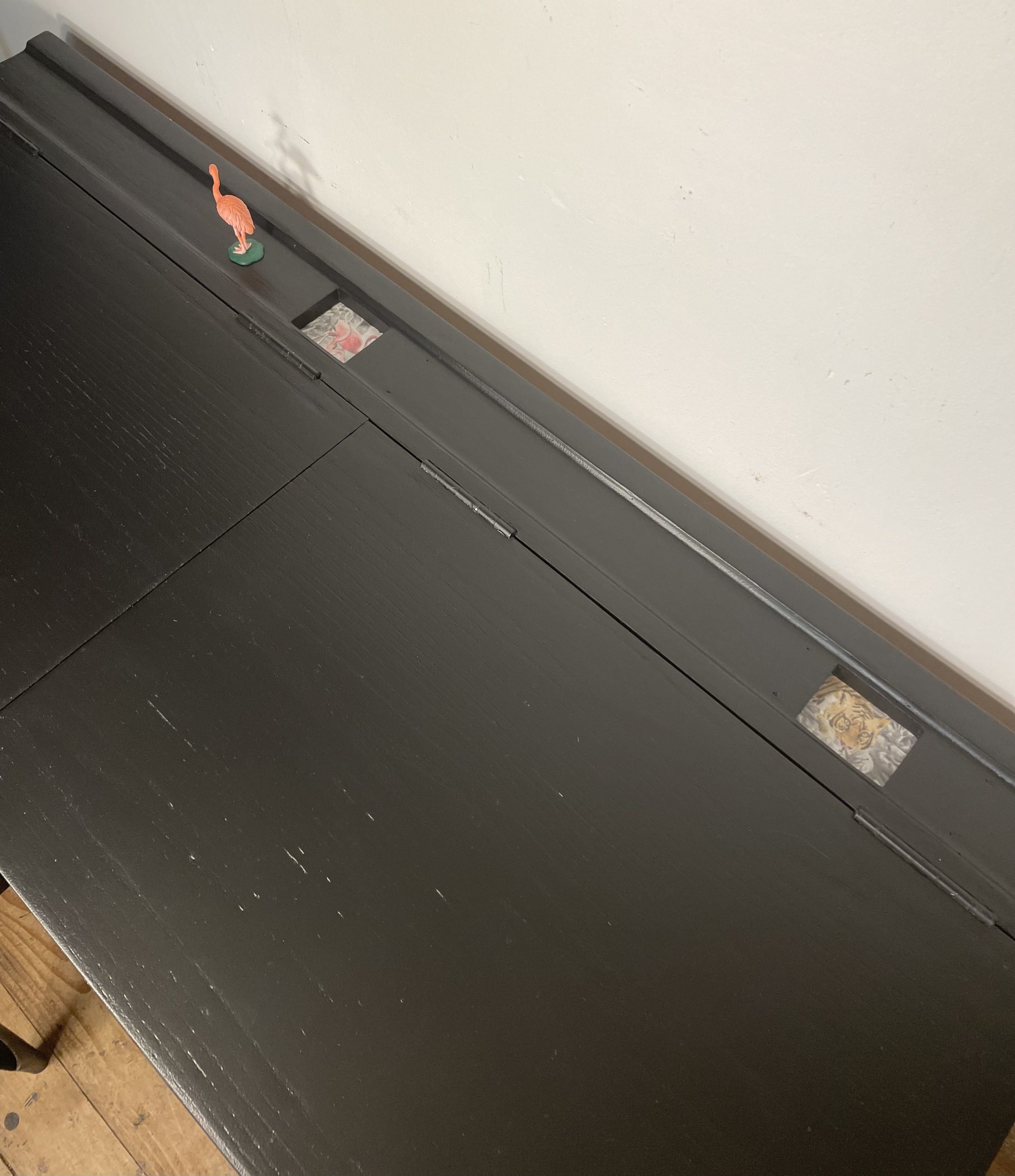 Produit venduBureau d’écolier double revisité. plateau repeint en noir. Piétement métal. Flamant rose dans les tiroirs lorsque l’on soulève le plateau. Crochets sur les côtés. Papier peint tigre et flamant rise à la place des encriers.