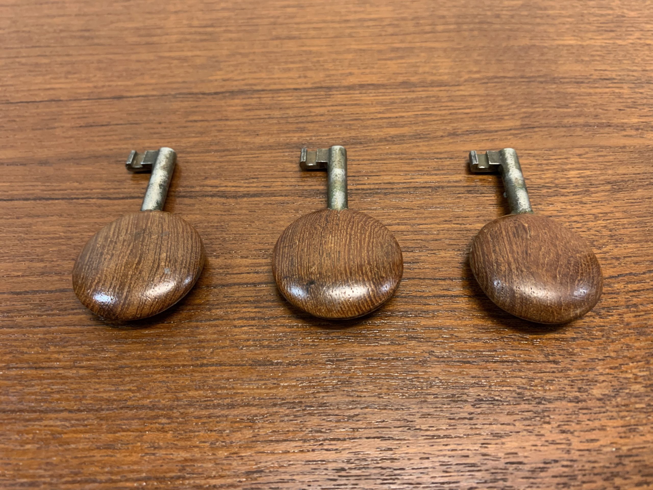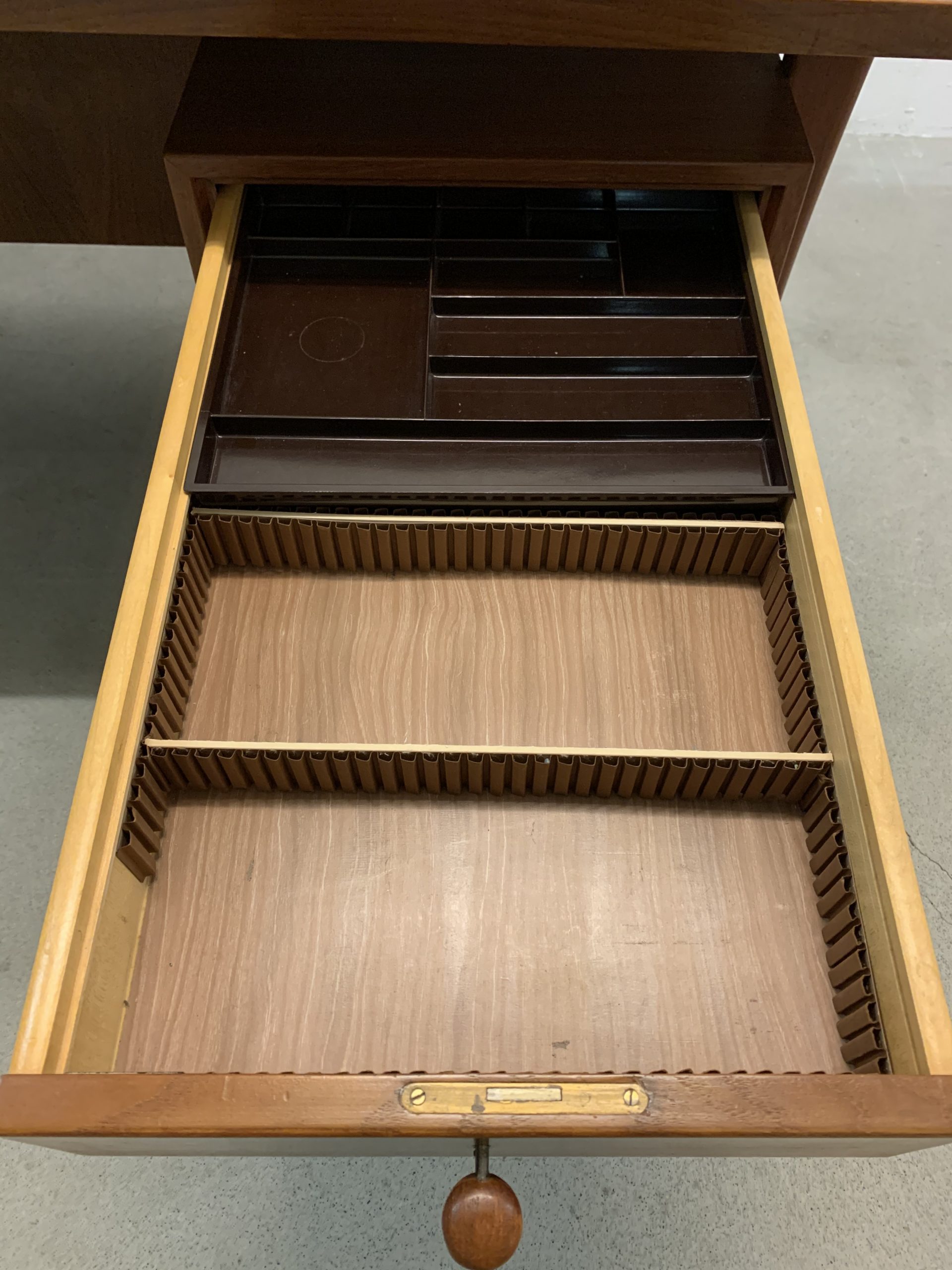 Le bureau a un grand tiroir porte-documents et 3 petits tiroirs (dont 2 ont des compartiments de rangement intérieurs). 2 tiroirs ferment à clé; il y a 3 clés disponibles. L’arrière du bureau permet d’y ranger des livres (il y manque un petit tablar).