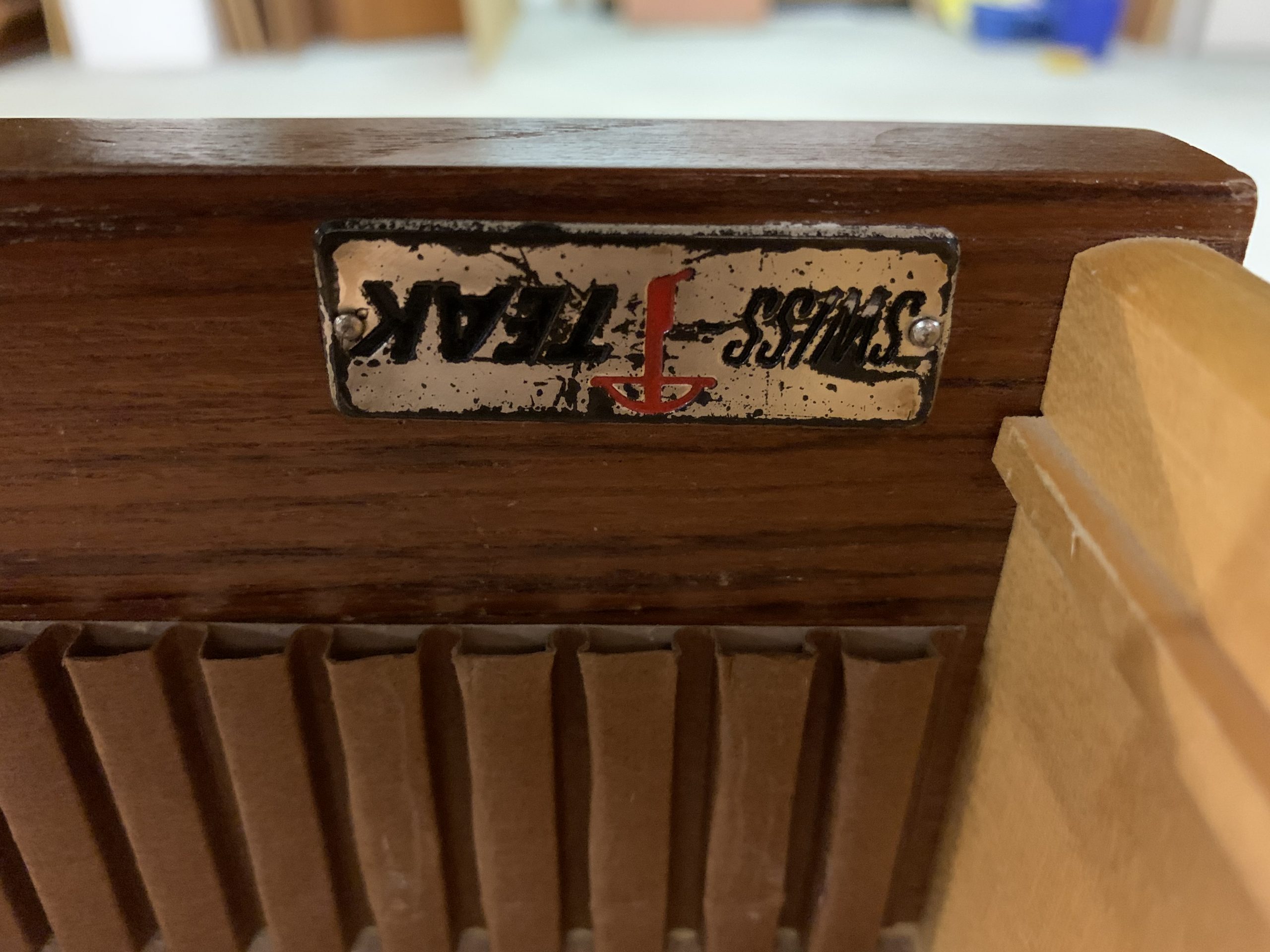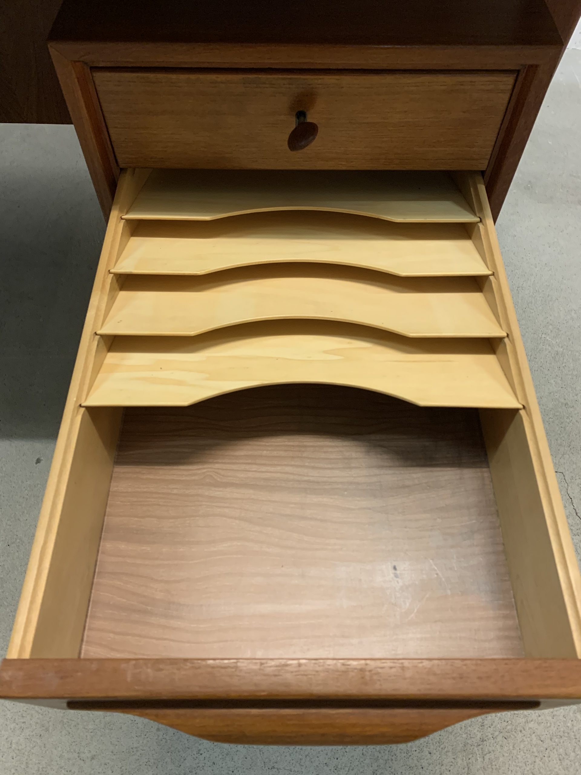 Bureau en teck au design typiquement scandinave mais de fabrication suisse (par Swiss Teak). Le plateau est légèrement arrondi, ses bords latéraux remontent de quelques millimètres, les clés sont en bois… tous les détails sont très soignés!