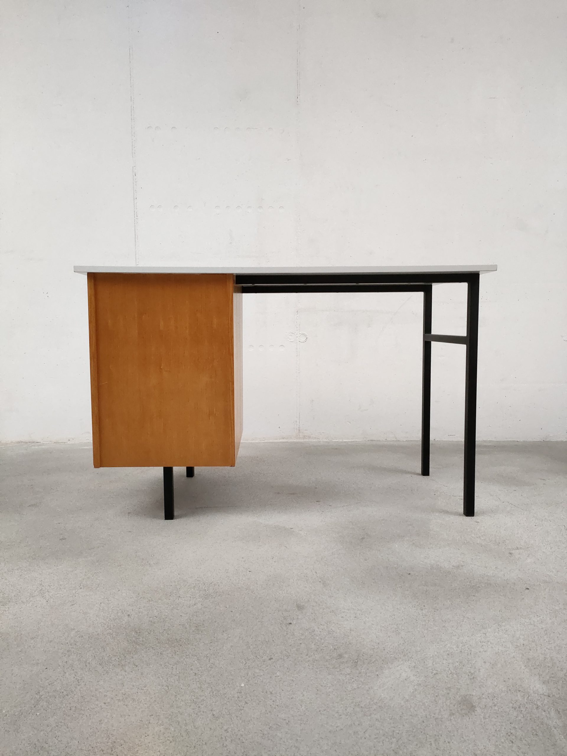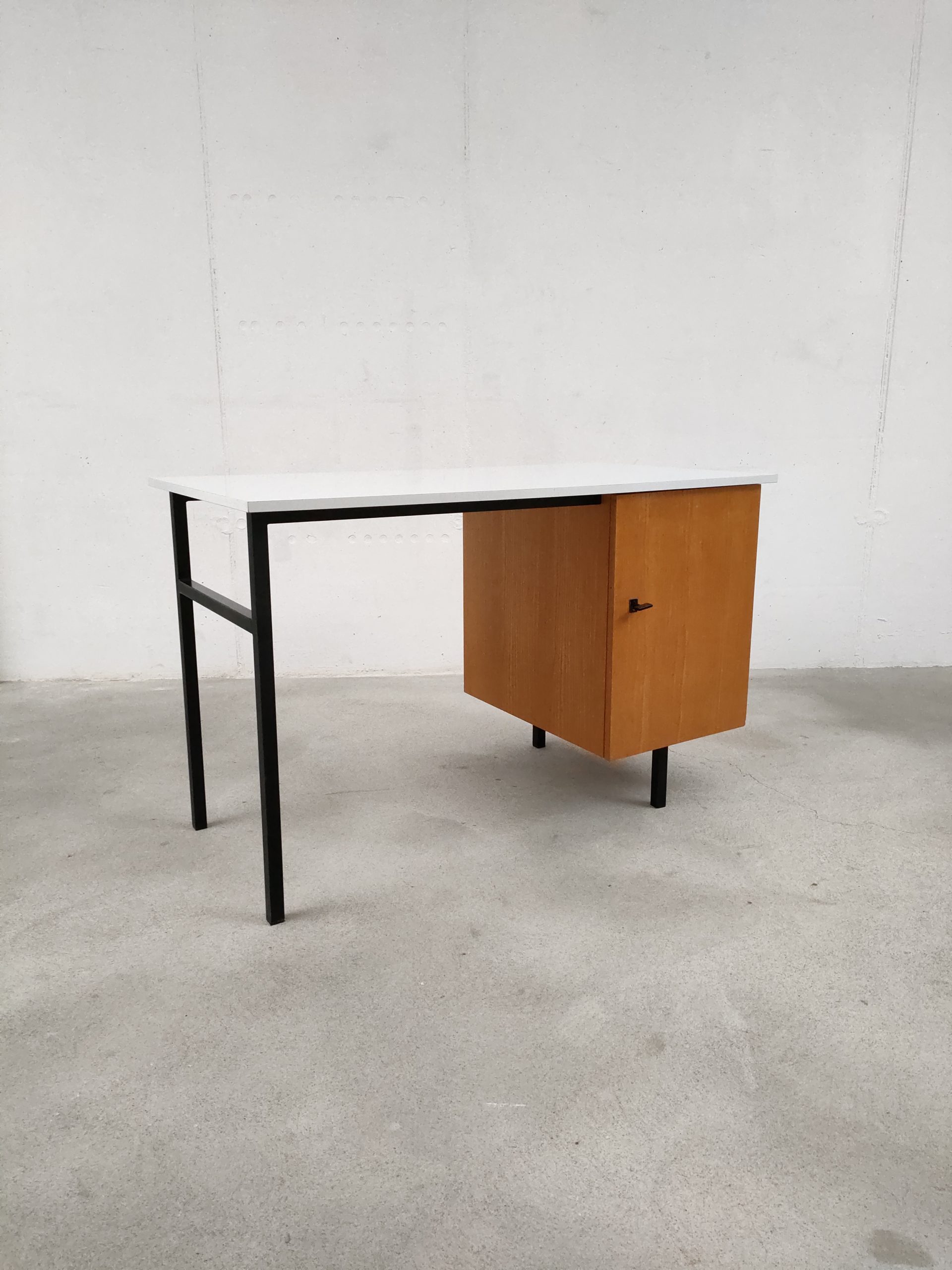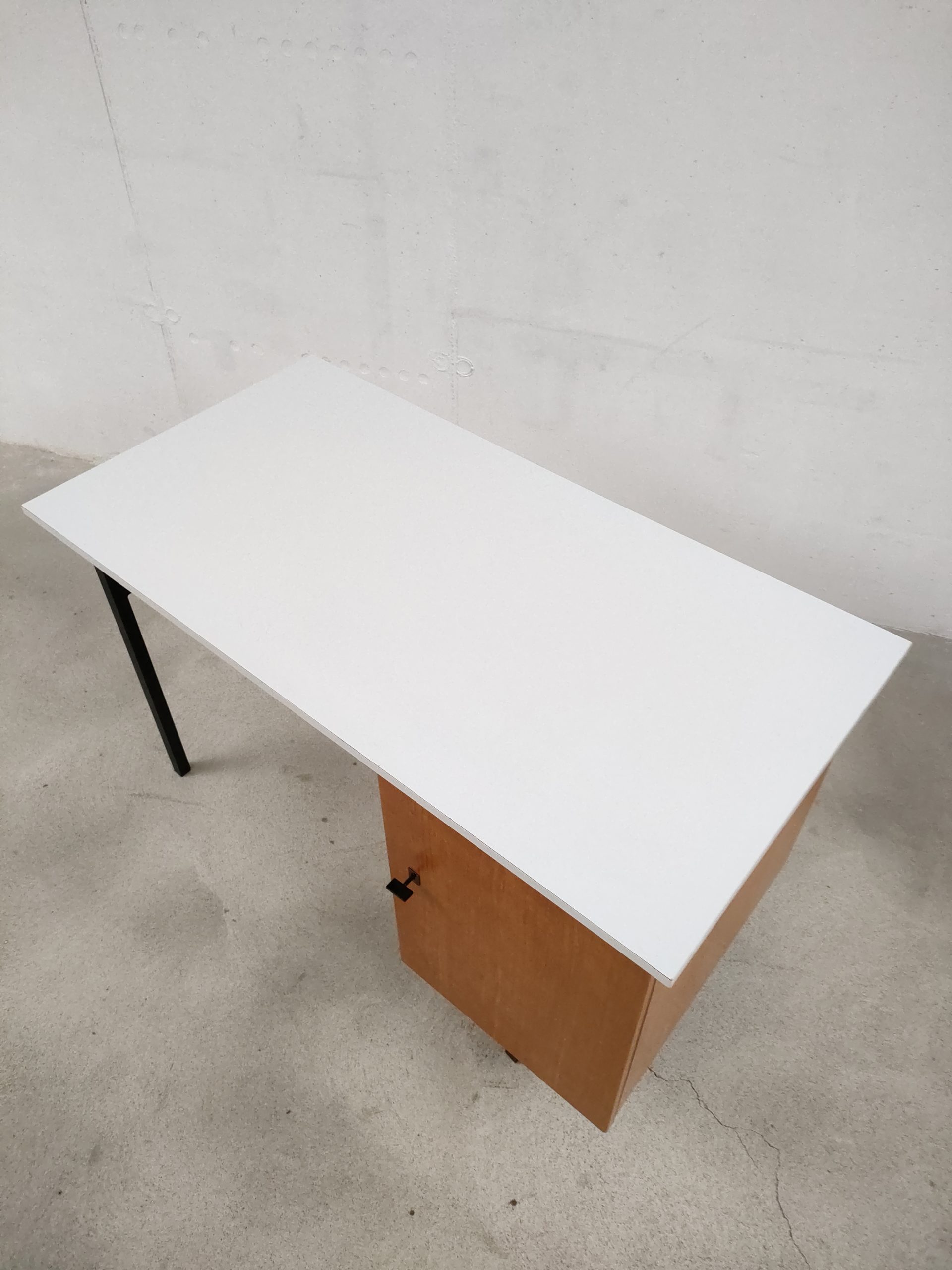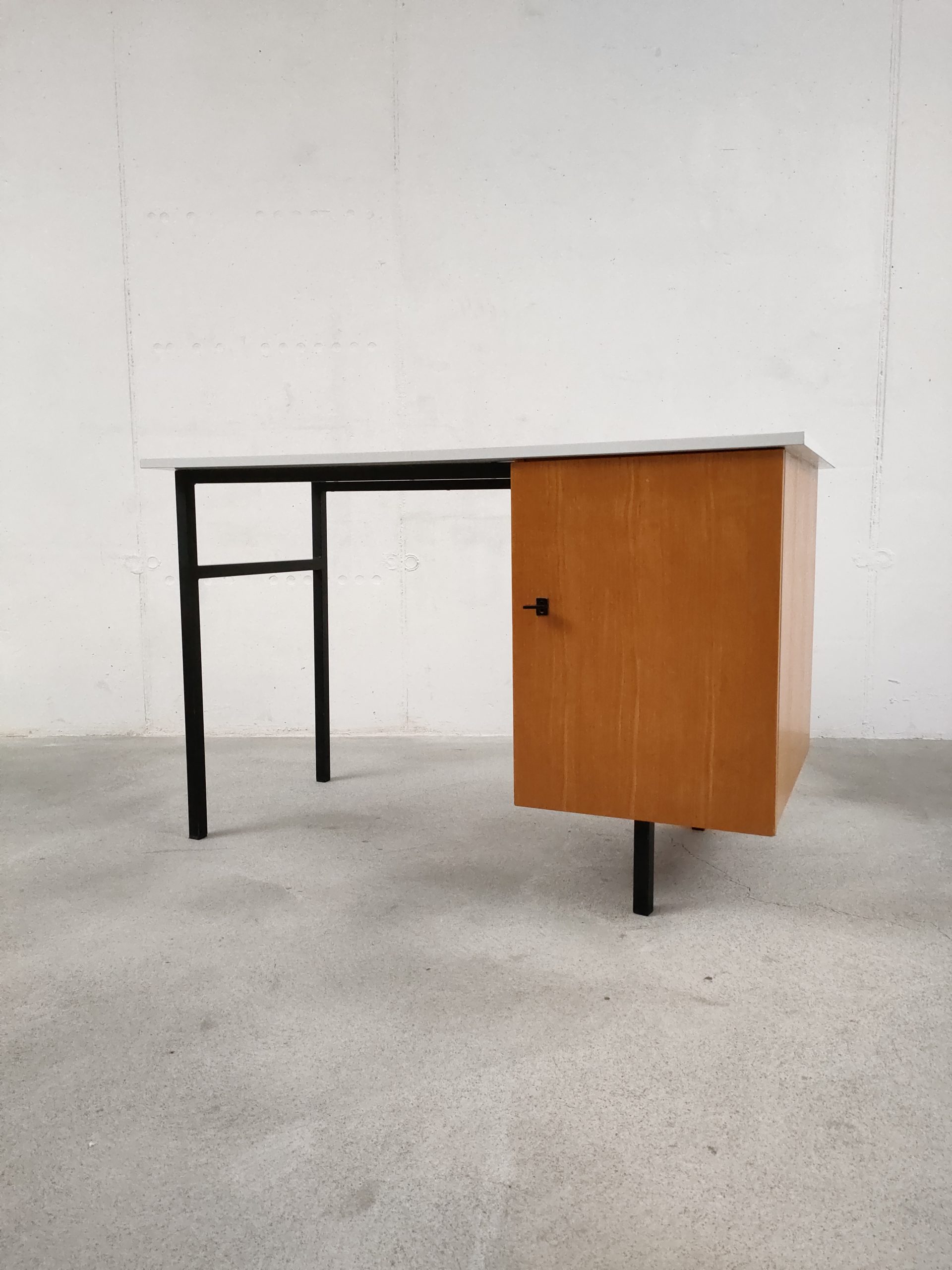 Produit venduBureau minimaliste vintage avec structure en métal noir, plateau en bois mélanimé blanc et espace de rangement en bois avec porte et tiroir à l’intérieur.
