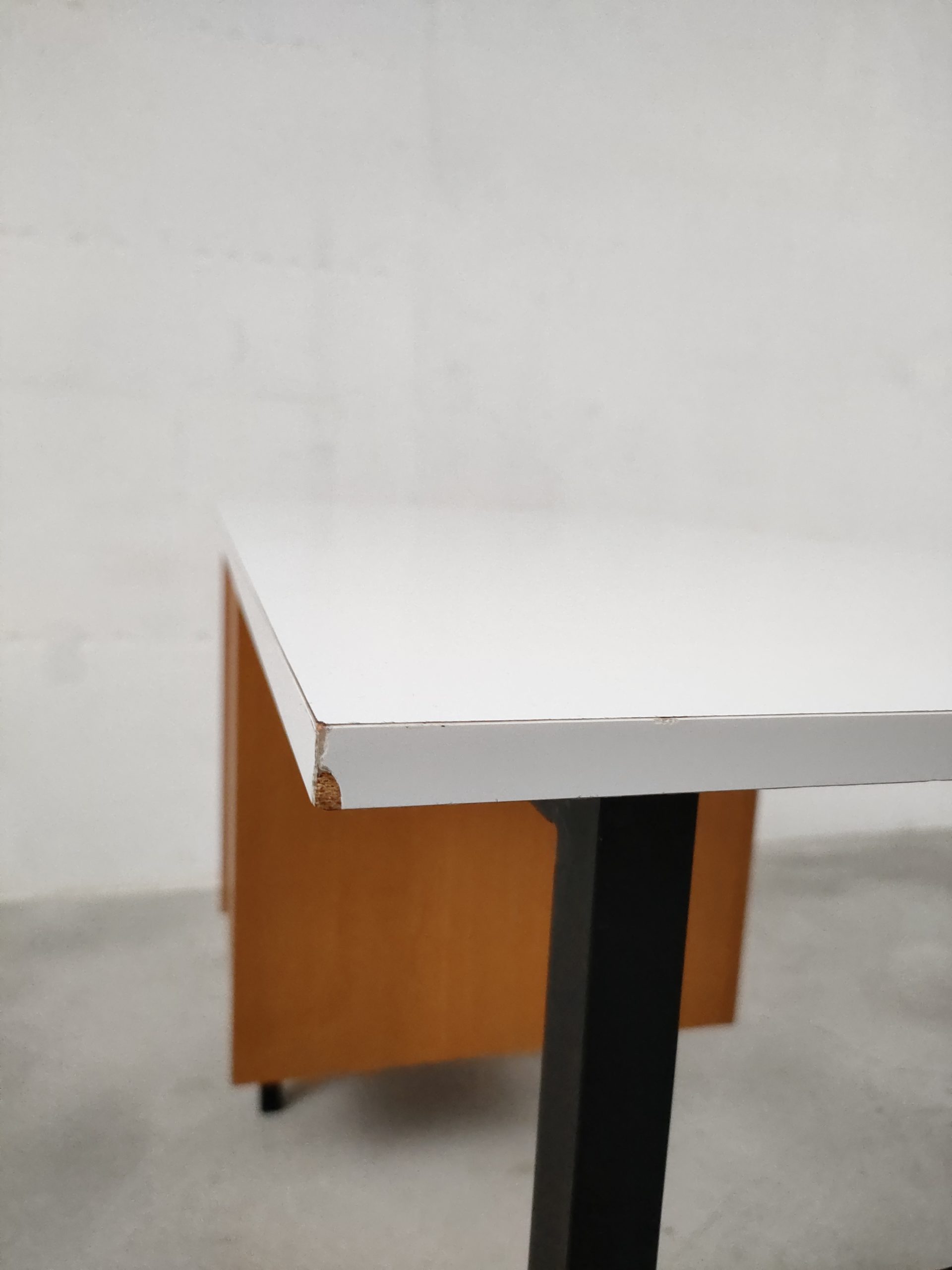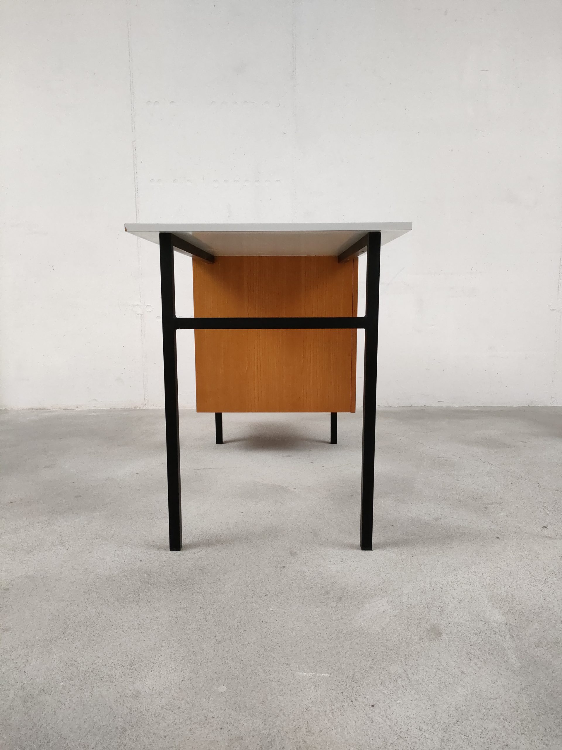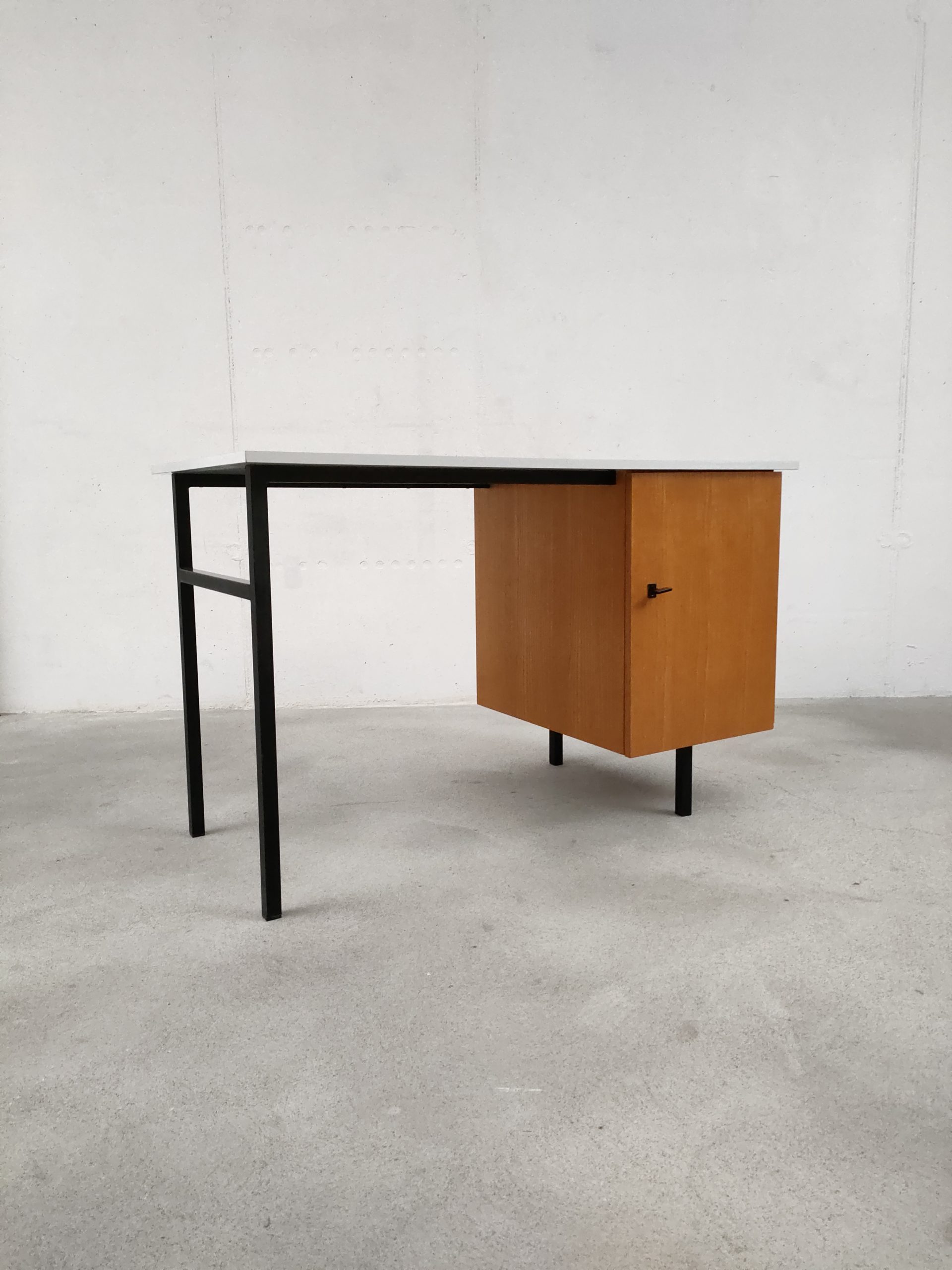 Produit venduBureau minimaliste vintage avec structure en métal noir, plateau en bois mélanimé blanc et espace de rangement en bois avec porte et tiroir à l’intérieur.