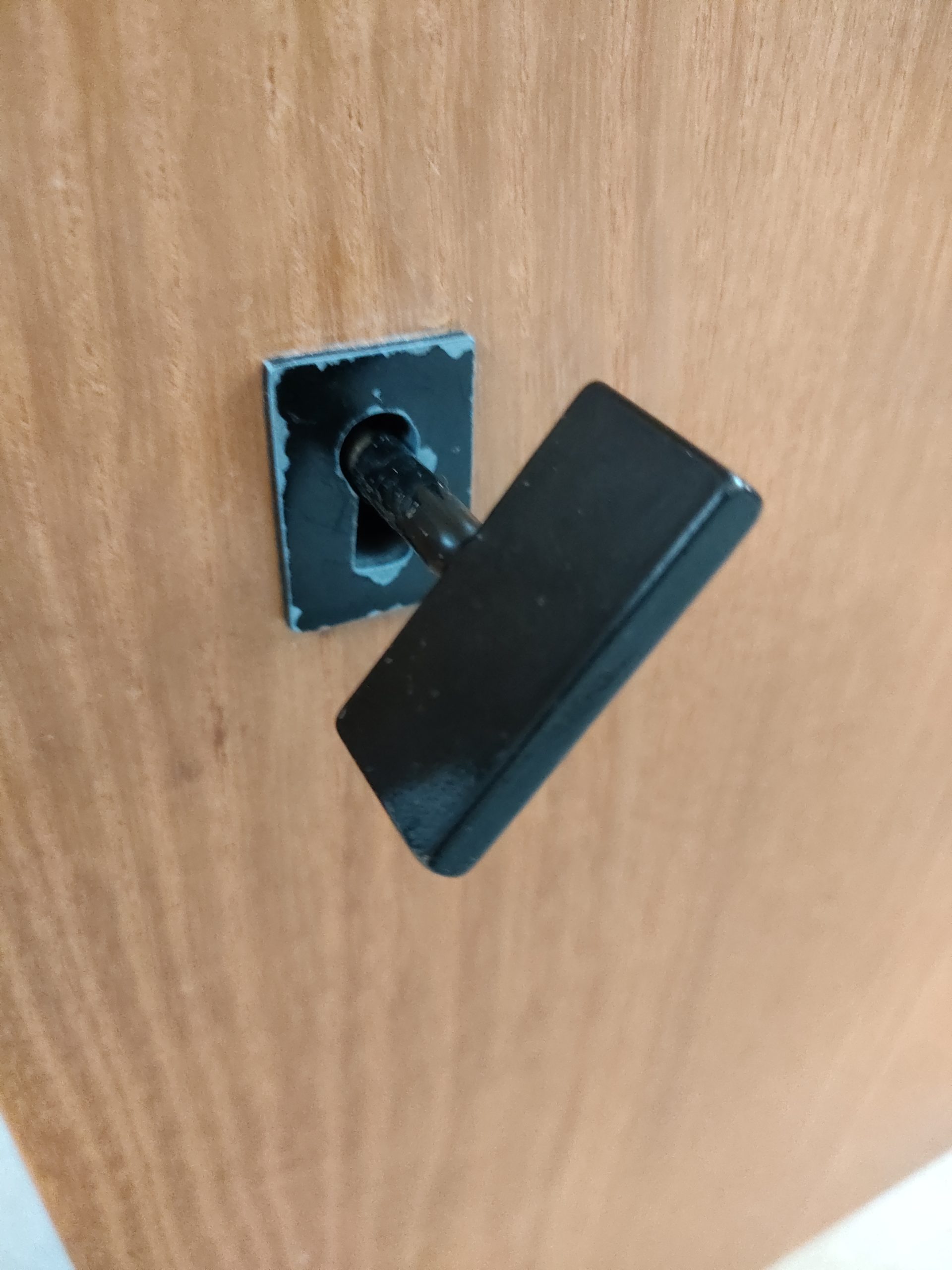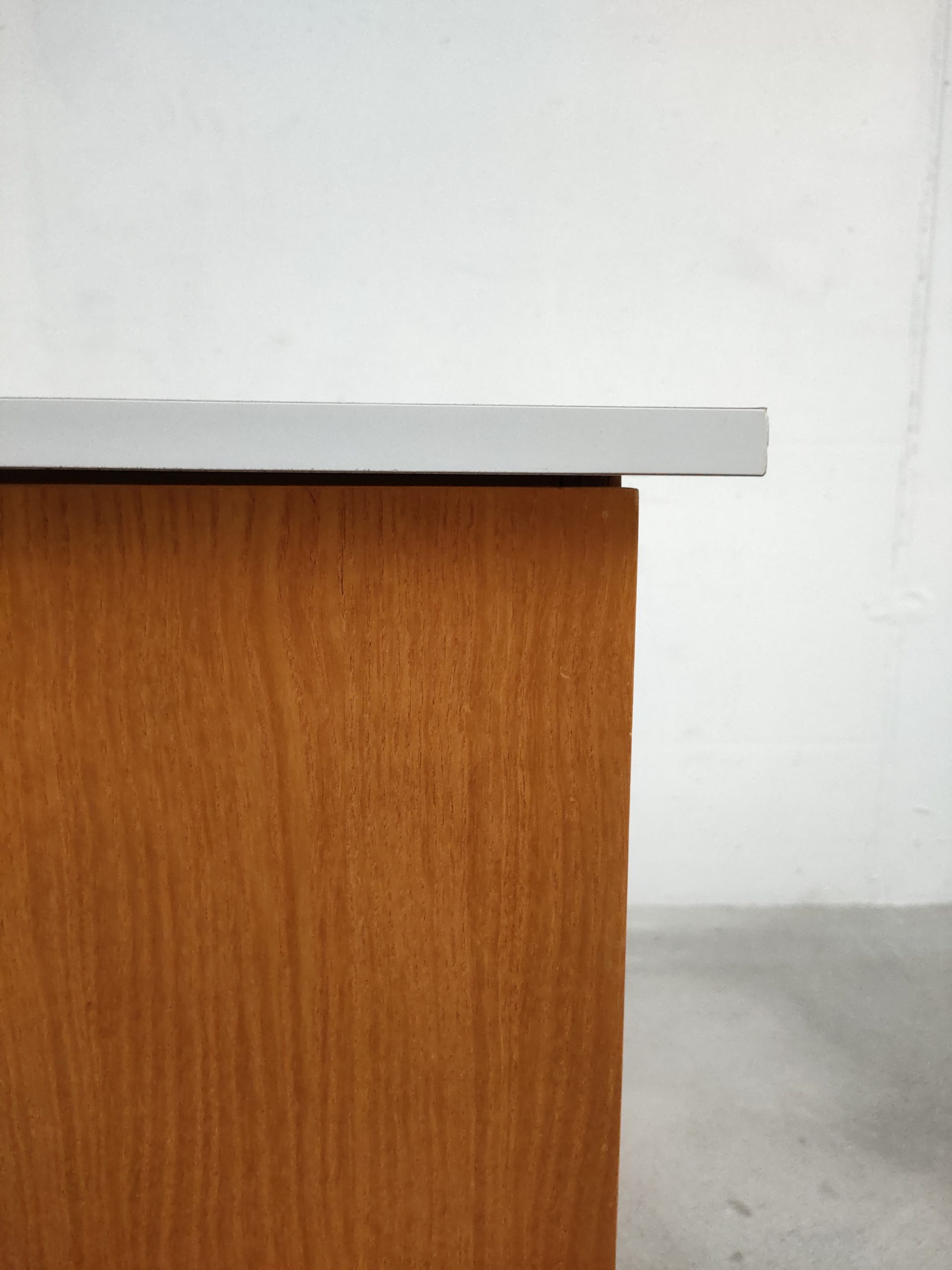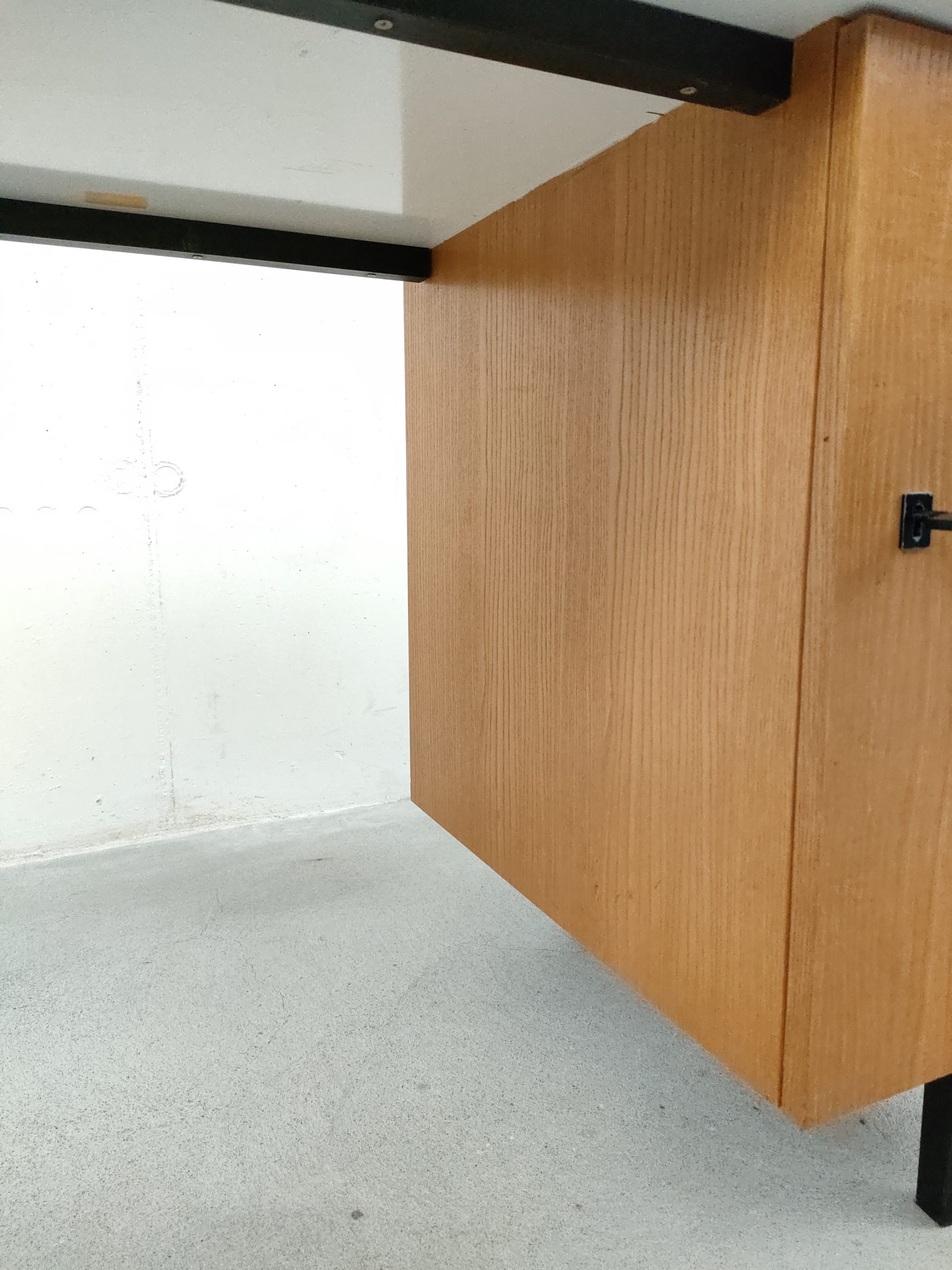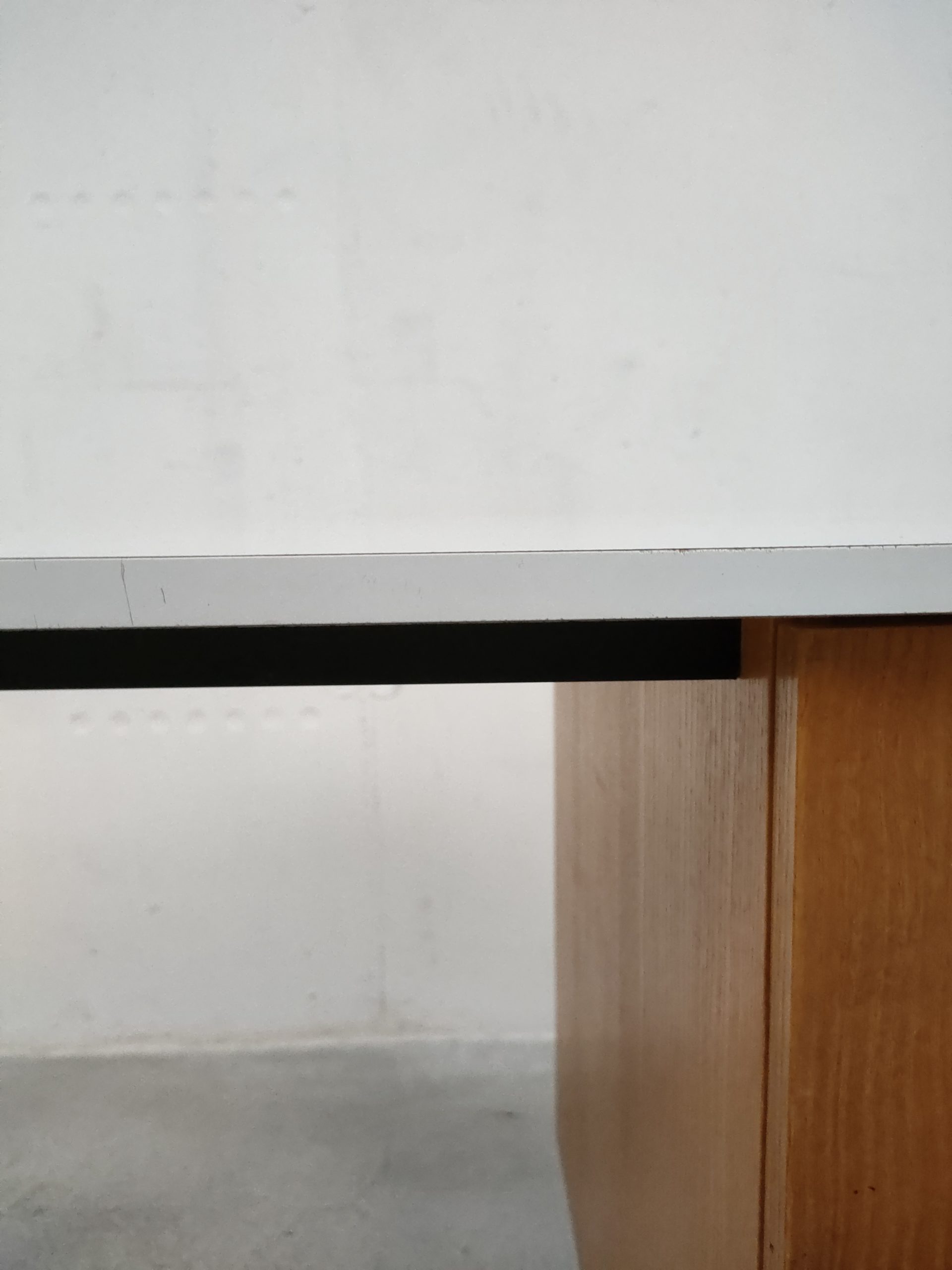 Produit venduBureau minimaliste vintage avec structure en métal noir, plateau en bois mélanimé blanc et espace de rangement en bois avec porte et tiroir à l’intérieur.