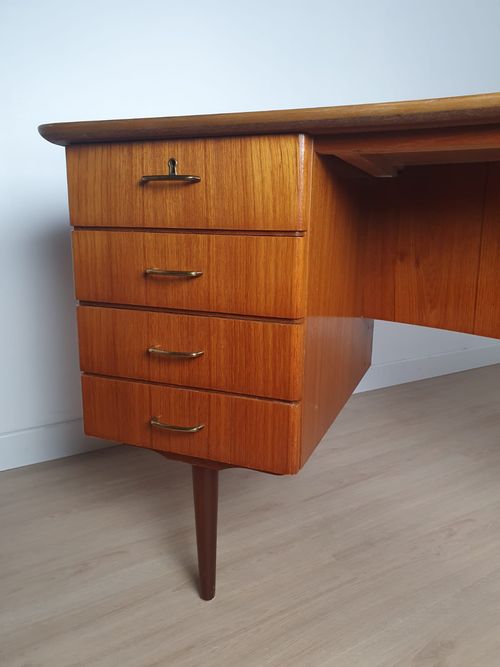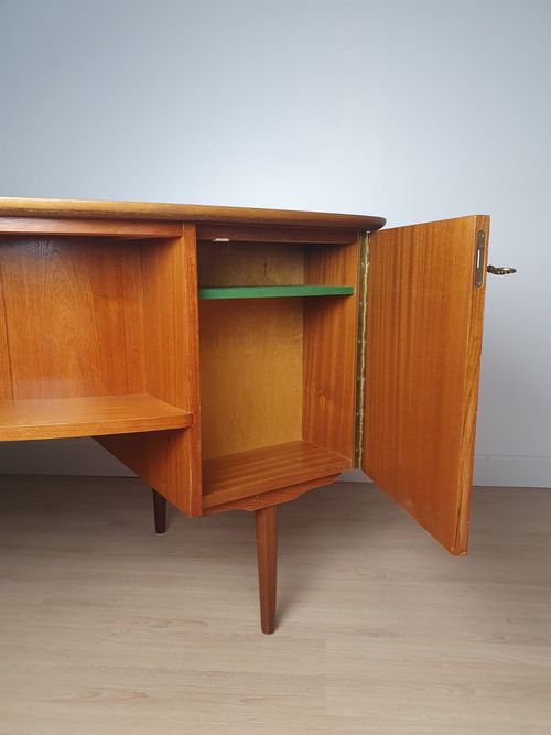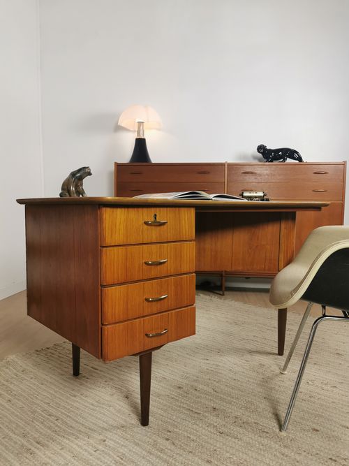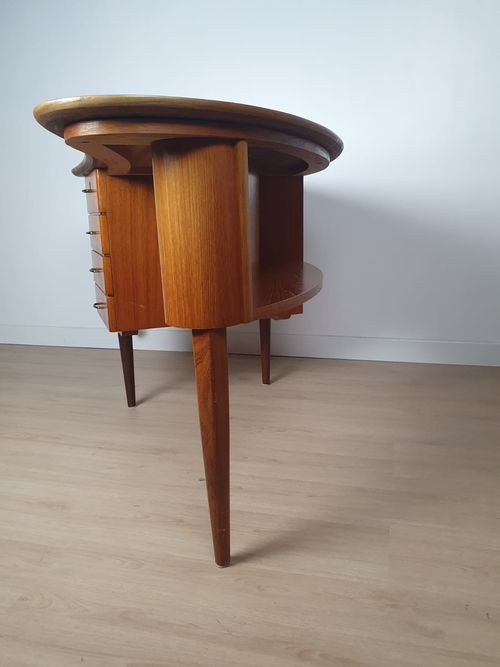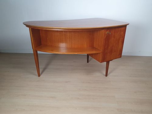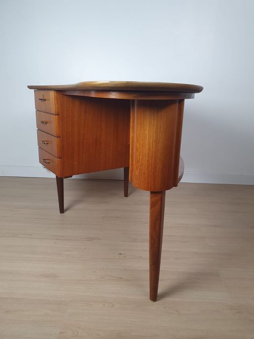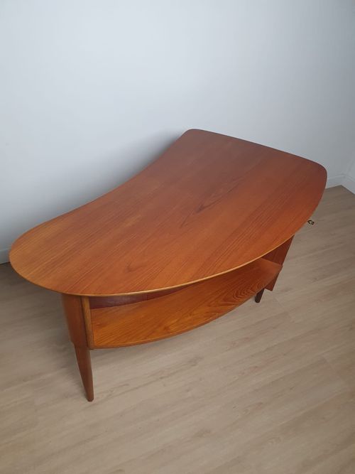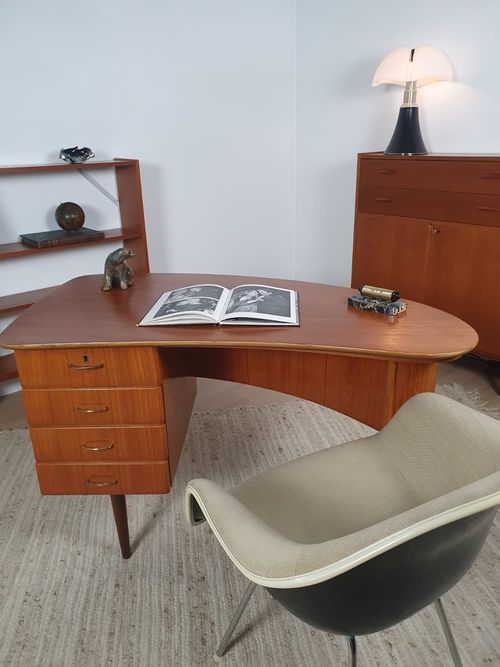 Produit venduMagnifique bureau scandinave en teck en forme d’haricot doté de plusieurs espaces de rangement avec ses tiroirs, sa bibliothéque arrondie et son bar.