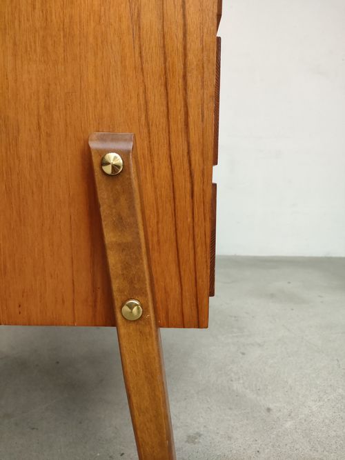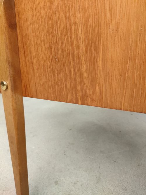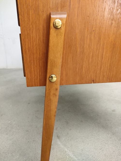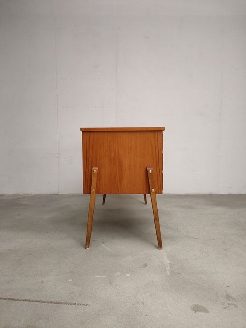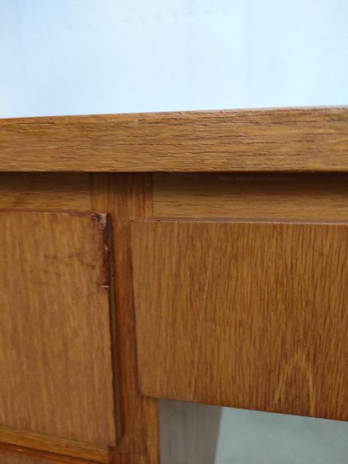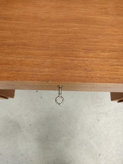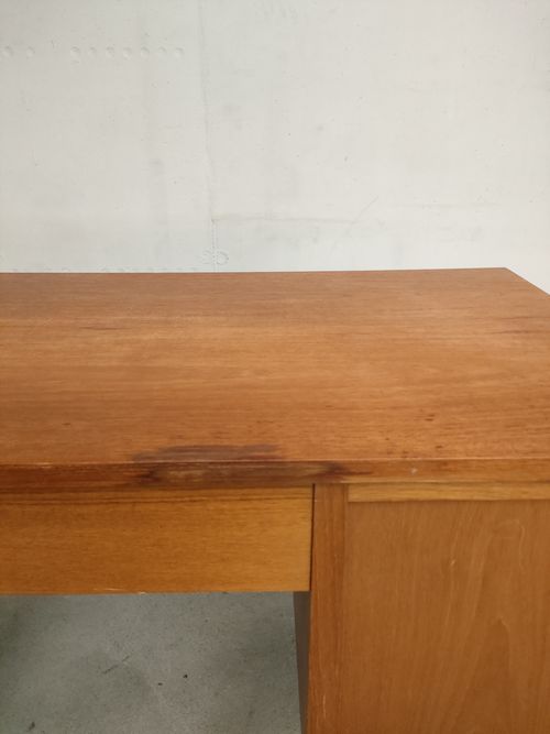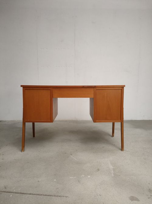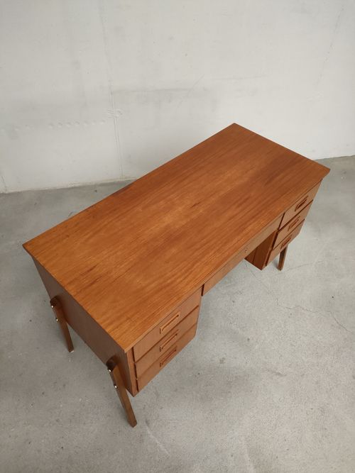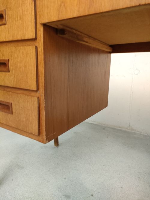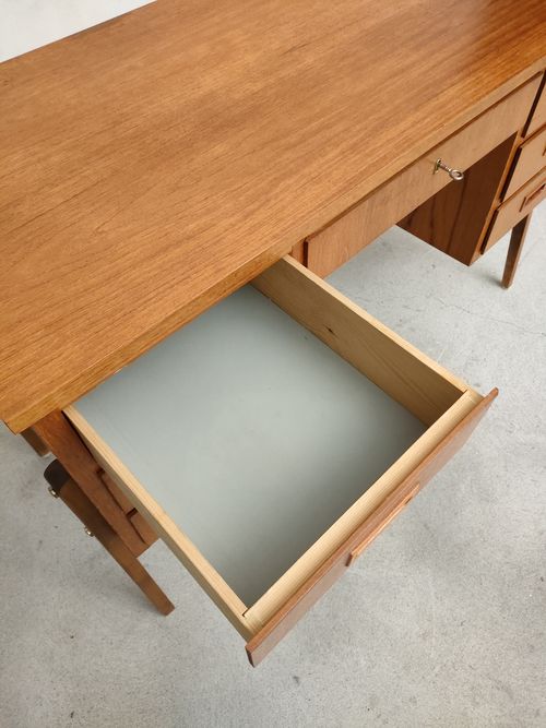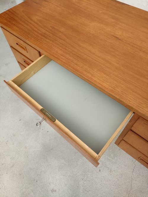 Produit venduBureau scandinave en teck doté de 3 tiroirs de chaque côté et d’un tiroir central avec clé. Ses pieds sont originaux et ses dimensions intéressantes.