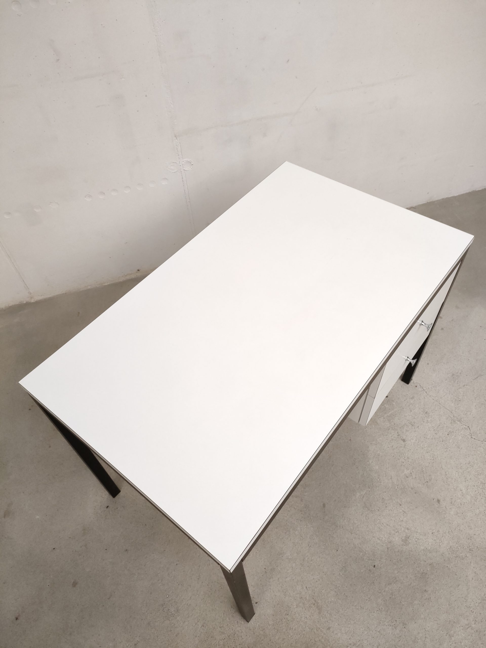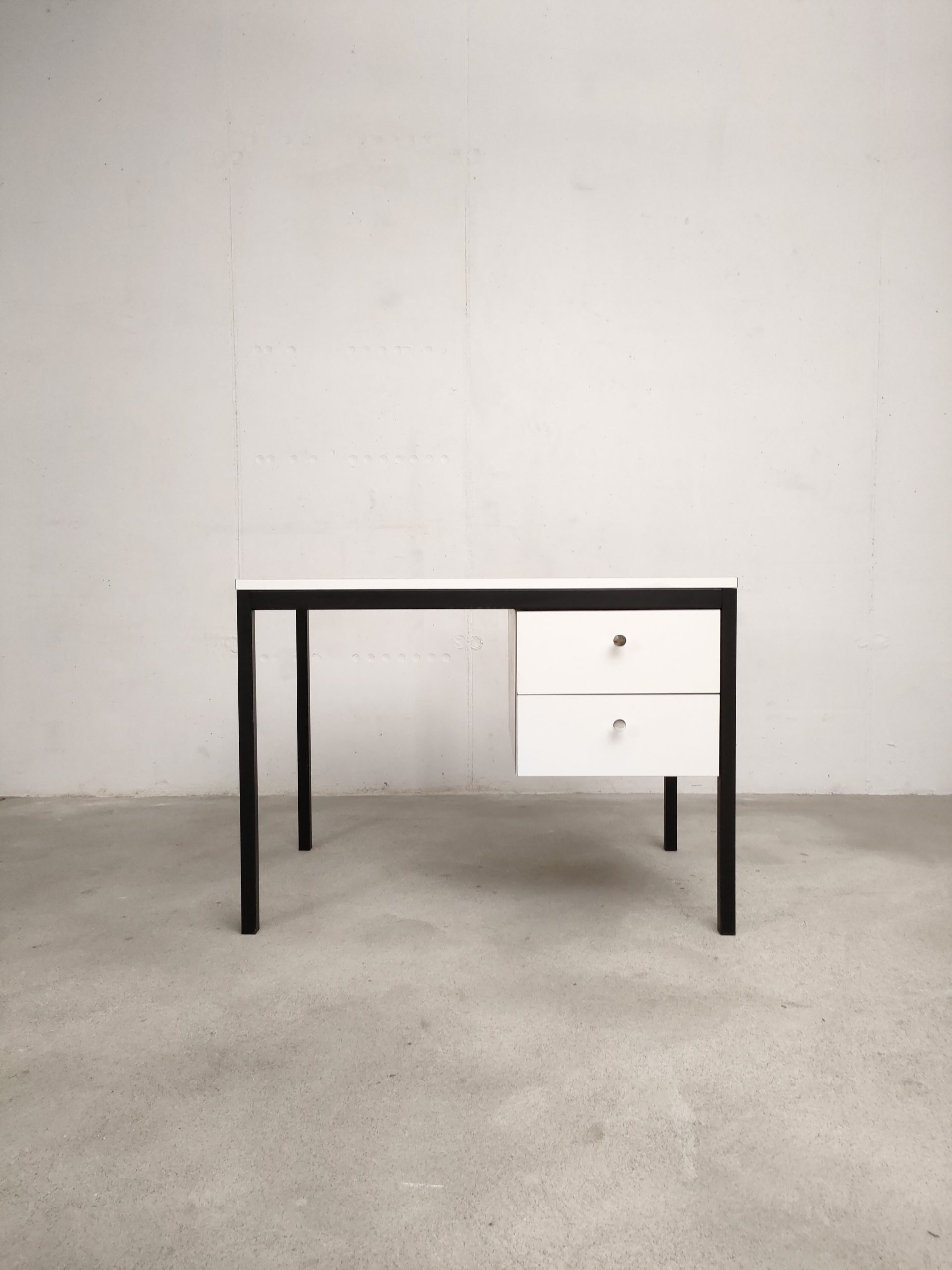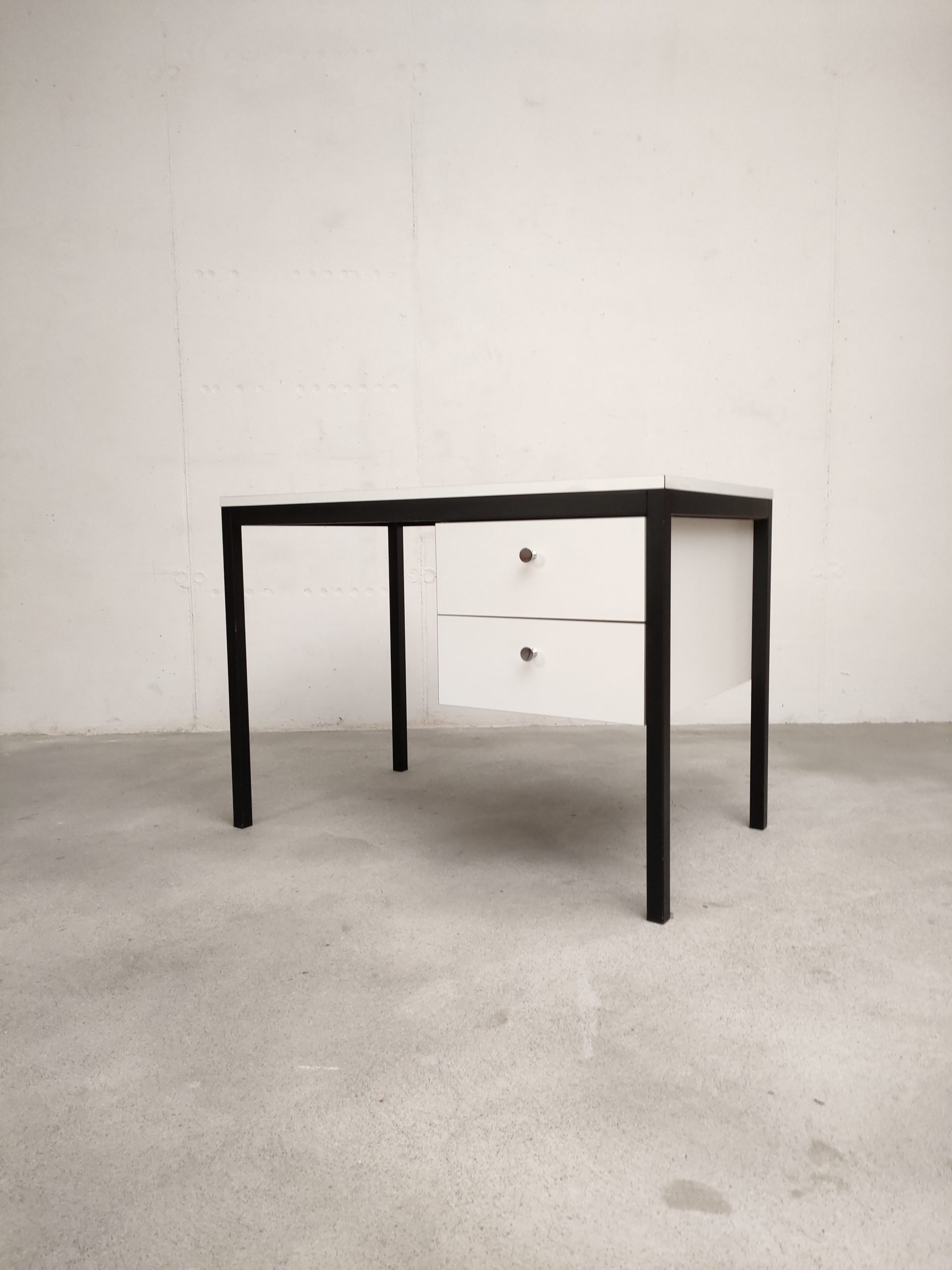 Produit venduBureau vintage avec structure en métal noir et plateau et 2 tiroirs en bois blanc. Produit par le fabricant de meuble suisse Victoria Möbel. Quelques traces sont présentes sur le plateau et à l’intérieur des tiroirs (voir photos). Il est parfaitement stable et solide. L’espace où on insère la chaise de bureau mesure 66 cm de hauteur et 53 cm de longueur.