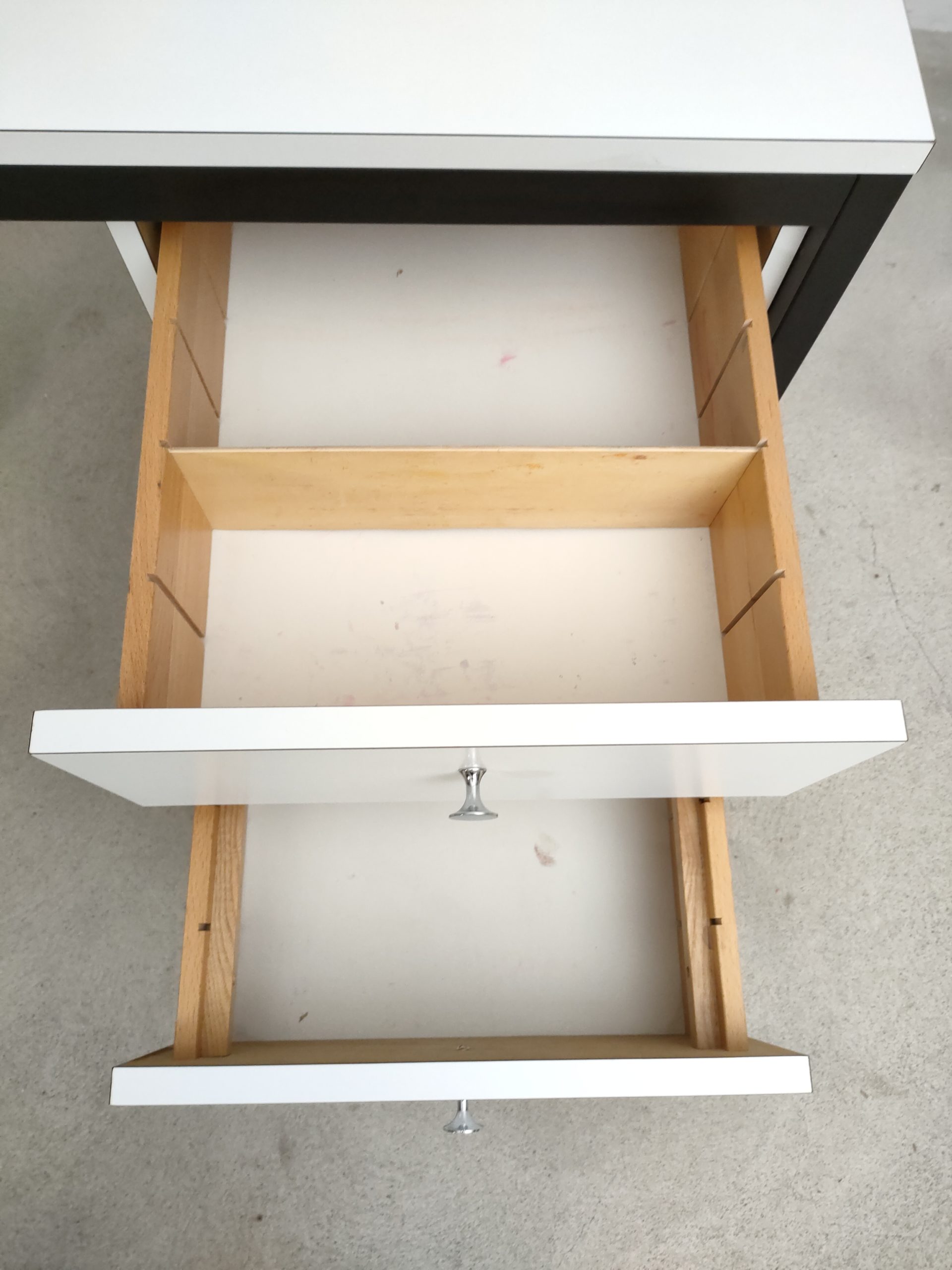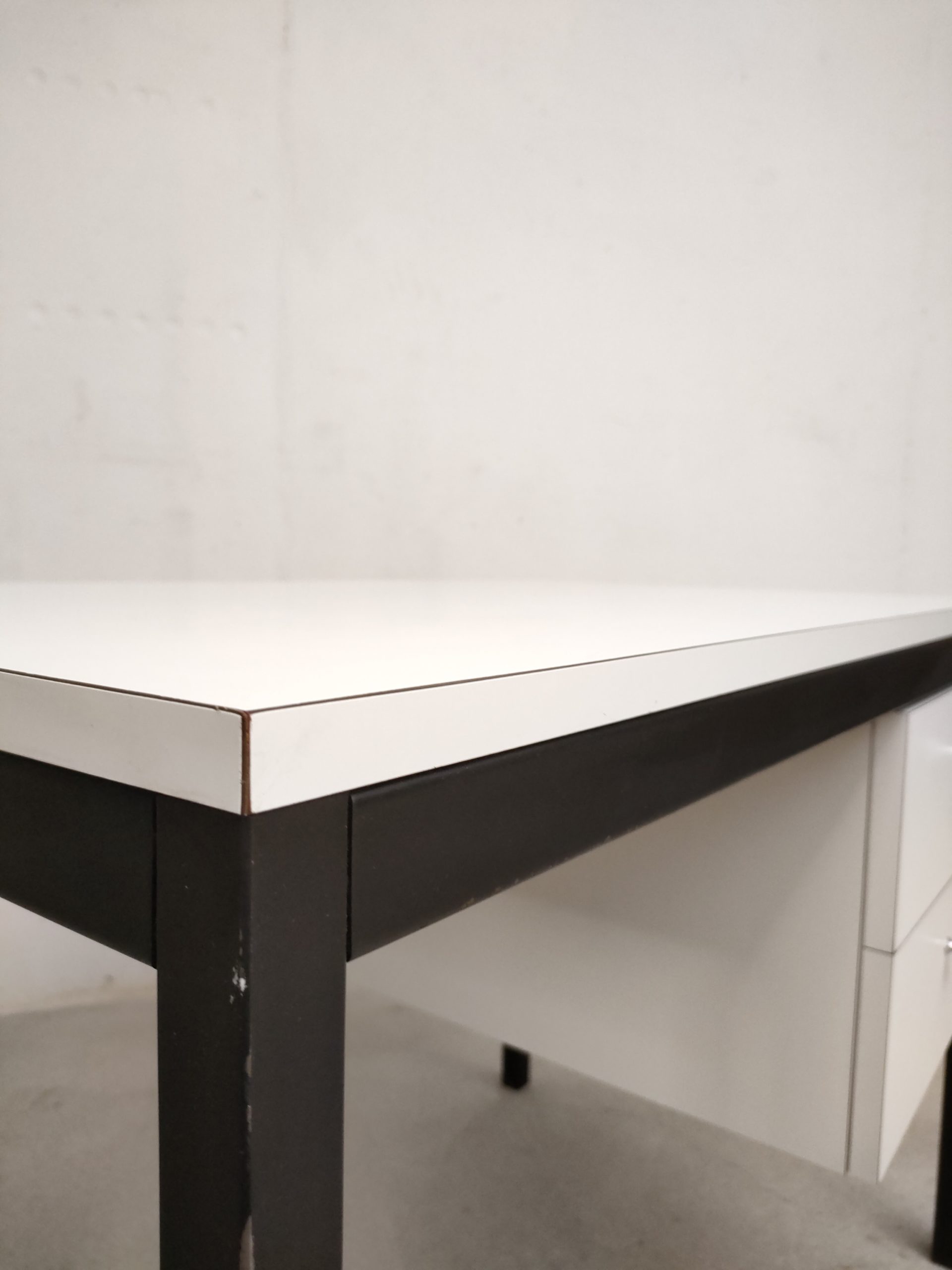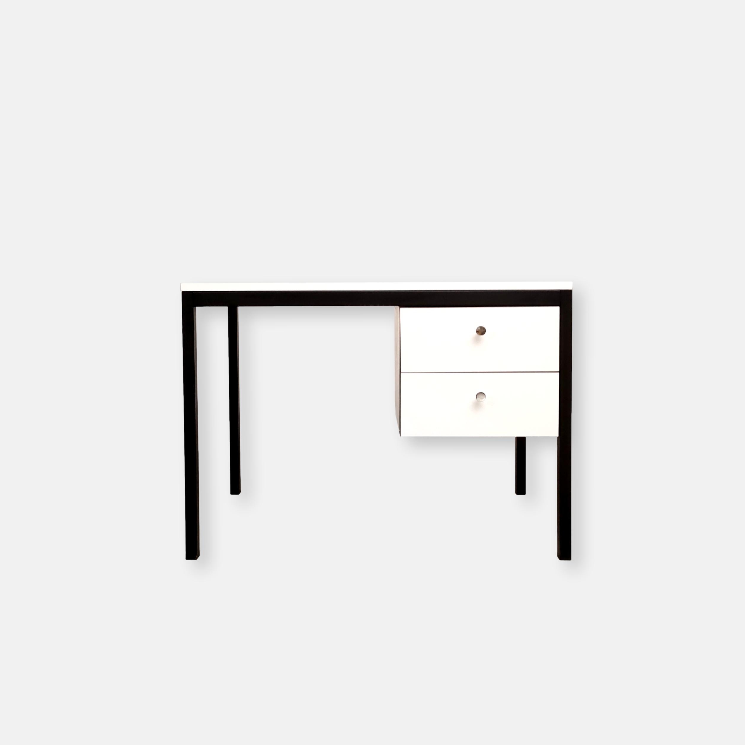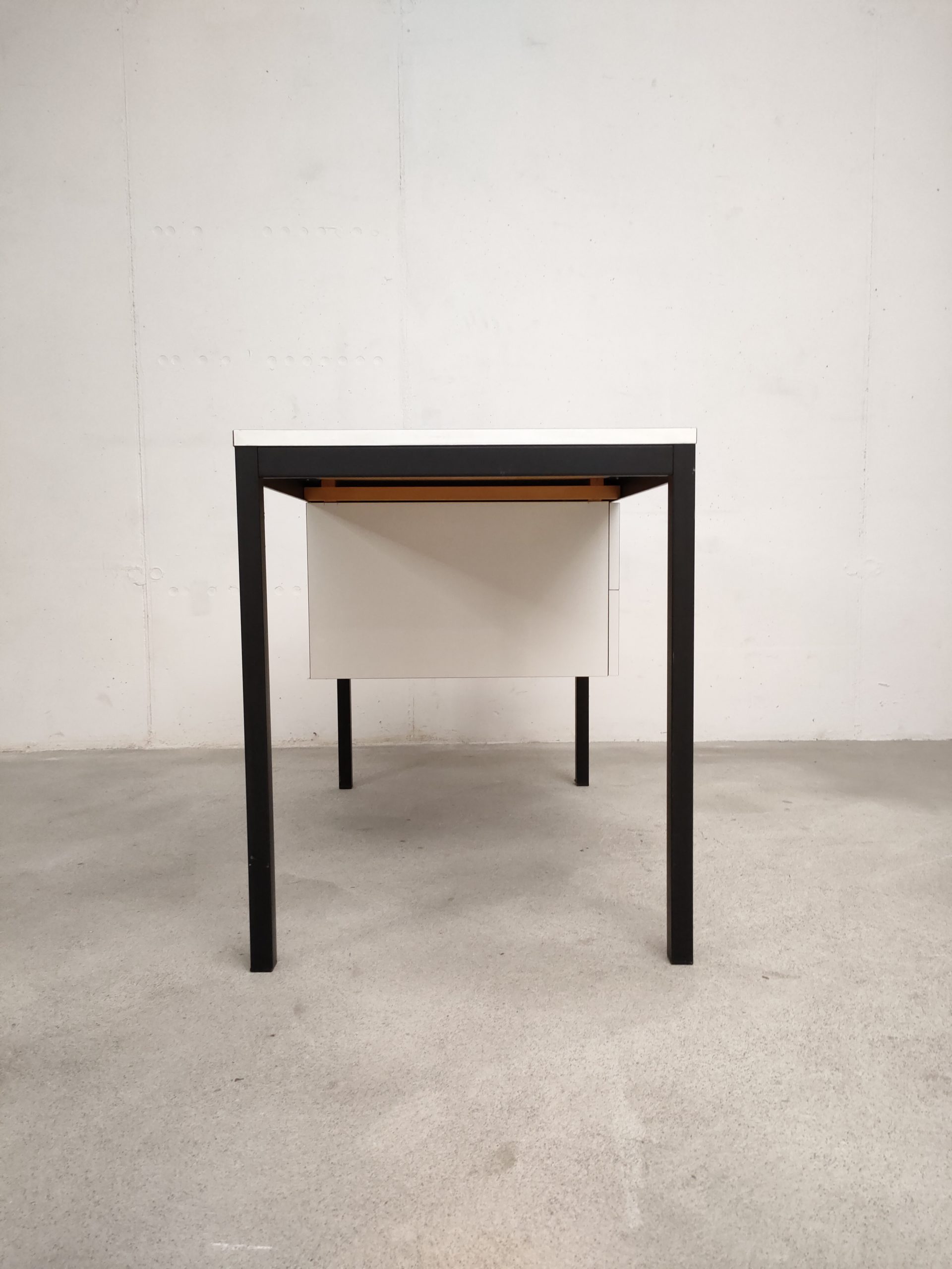 Produit venduBureau vintage avec structure en métal noir et plateau et 2 tiroirs en bois blanc. Produit par le fabricant de meuble suisse Victoria Möbel. Quelques traces sont présentes sur le plateau et à l’intérieur des tiroirs (voir photos). Il est parfaitement stable et solide. L’espace où on insère la chaise de bureau mesure 66 cm de hauteur et 53 cm de longueur.