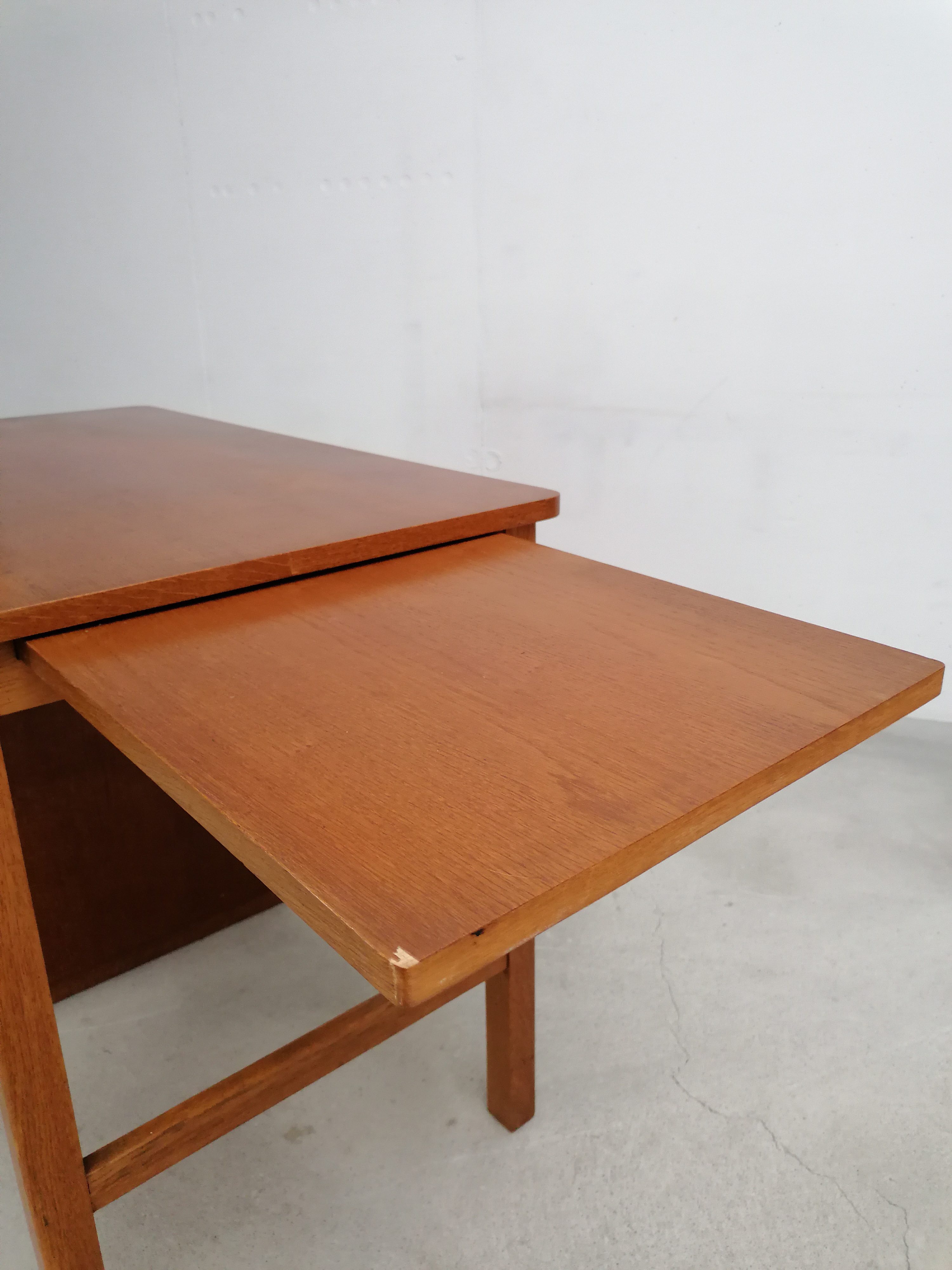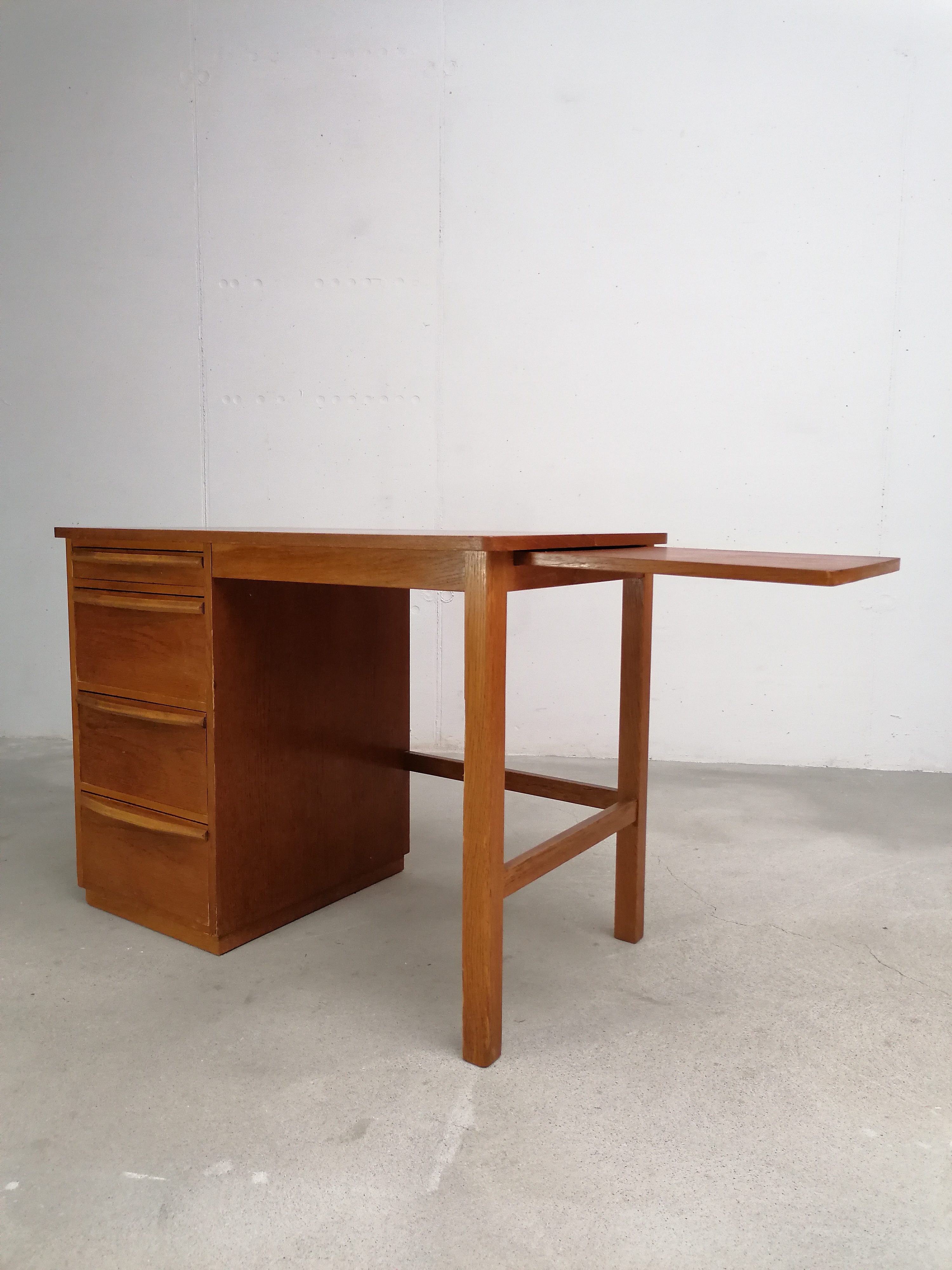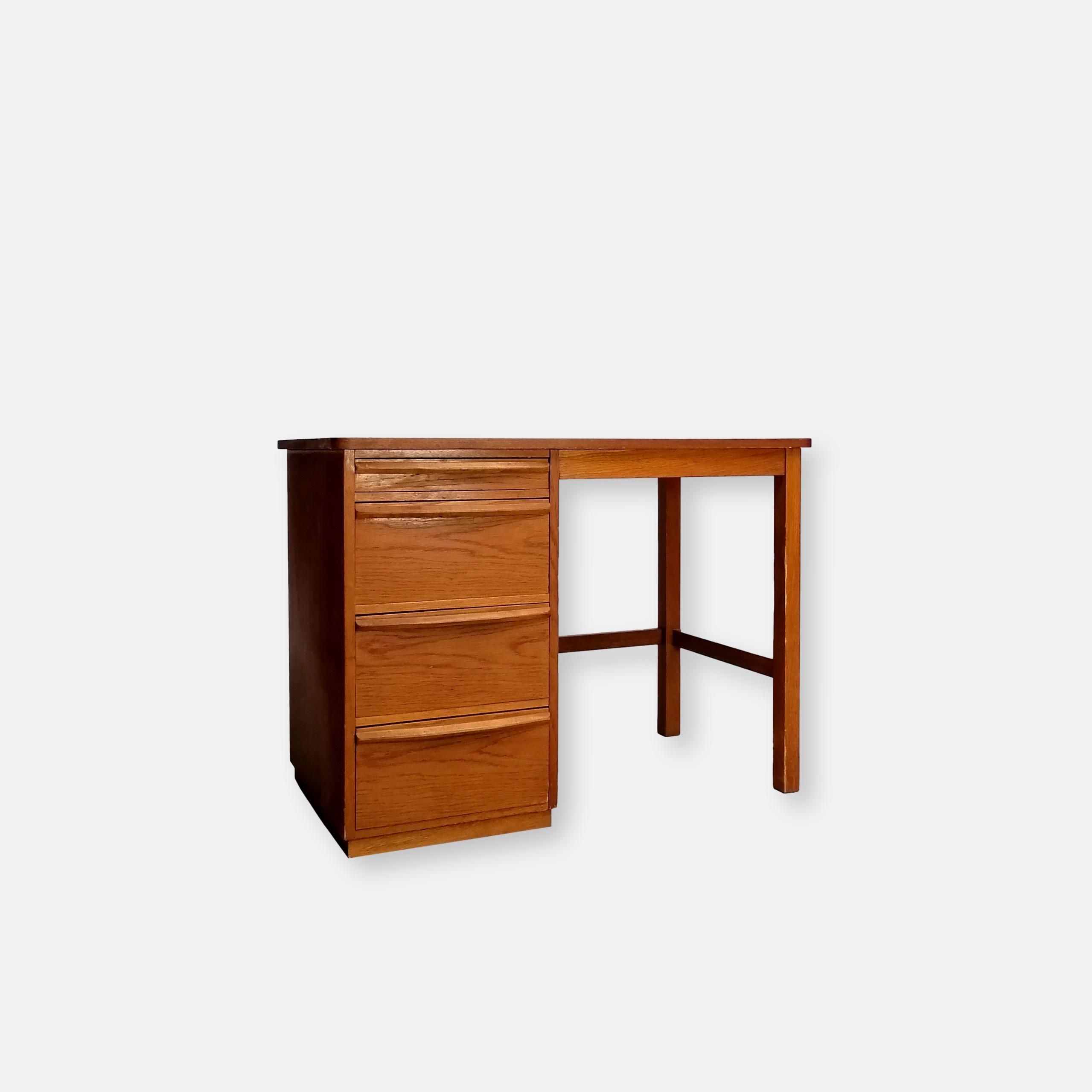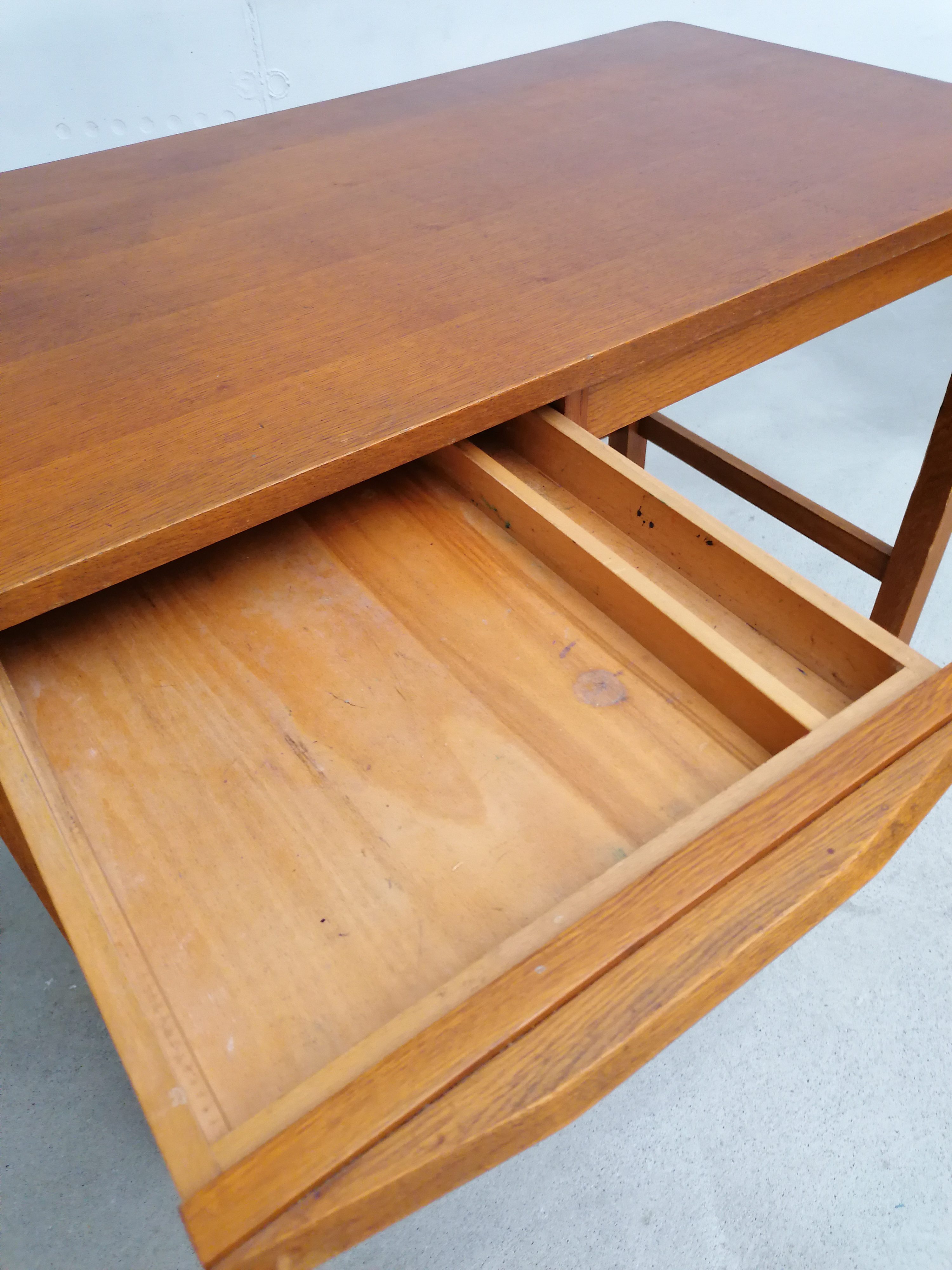 Produit venduBureau vintage en bois avec tablette extensible sur le côté. Doté de 4 tiroirs avec beaucoup d’éléments de rangement amovibles. Quelques traces d’usure sur le bois (voir photos) mais parfaitement stable et solide. Dimensions de l’espace où on peut mettre une chaise de bureau: hauteur 65.5 cm et largeur 50 cm.