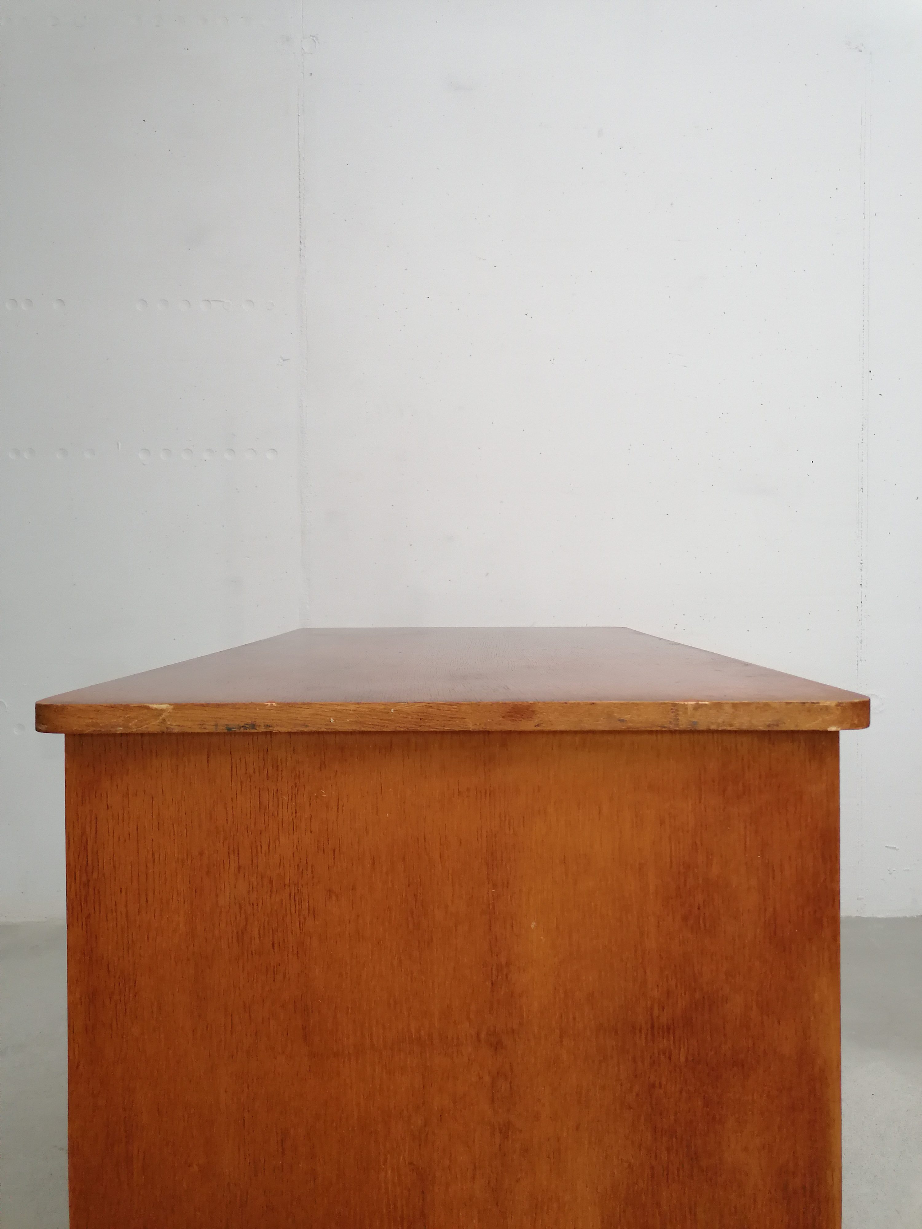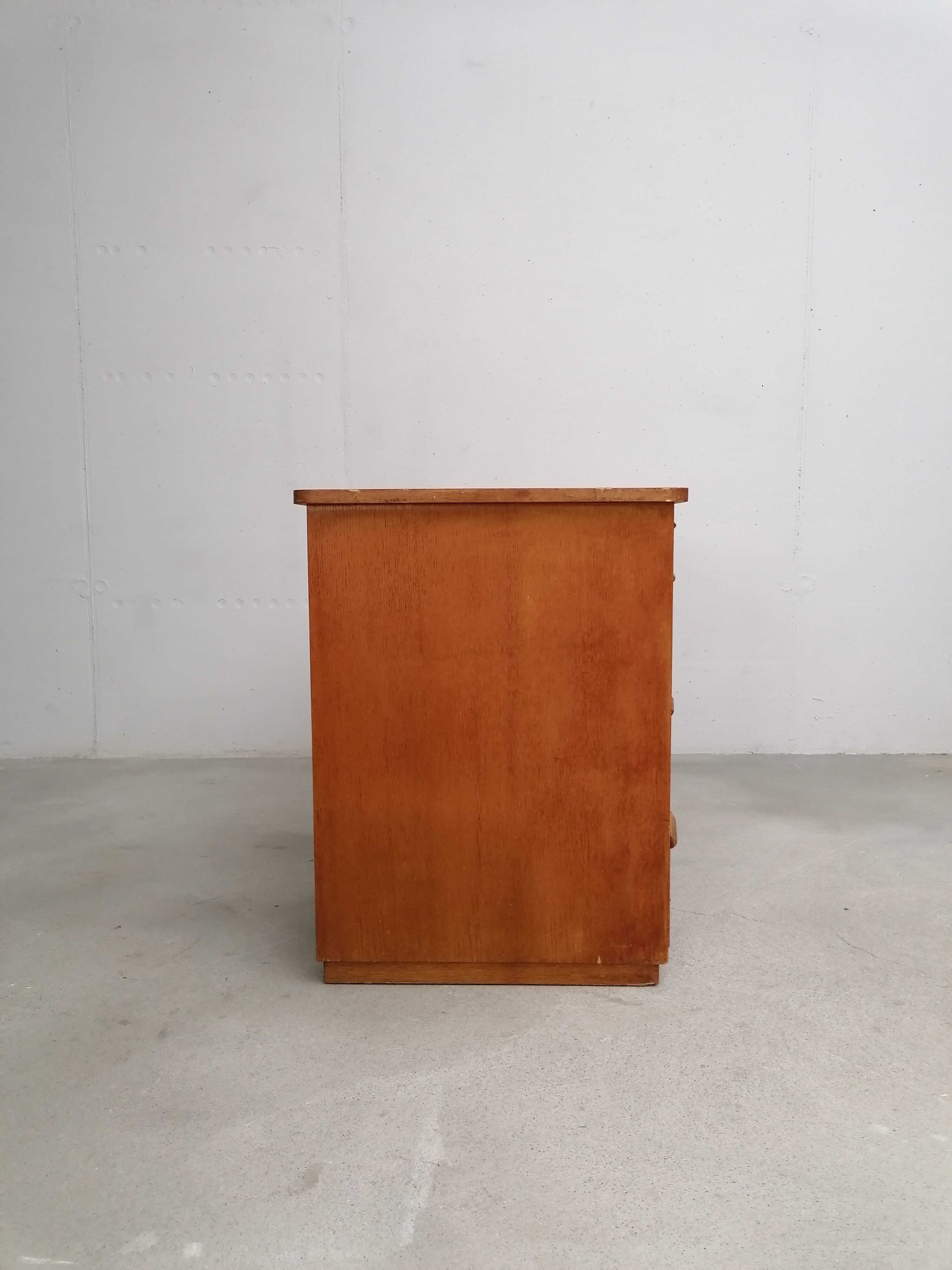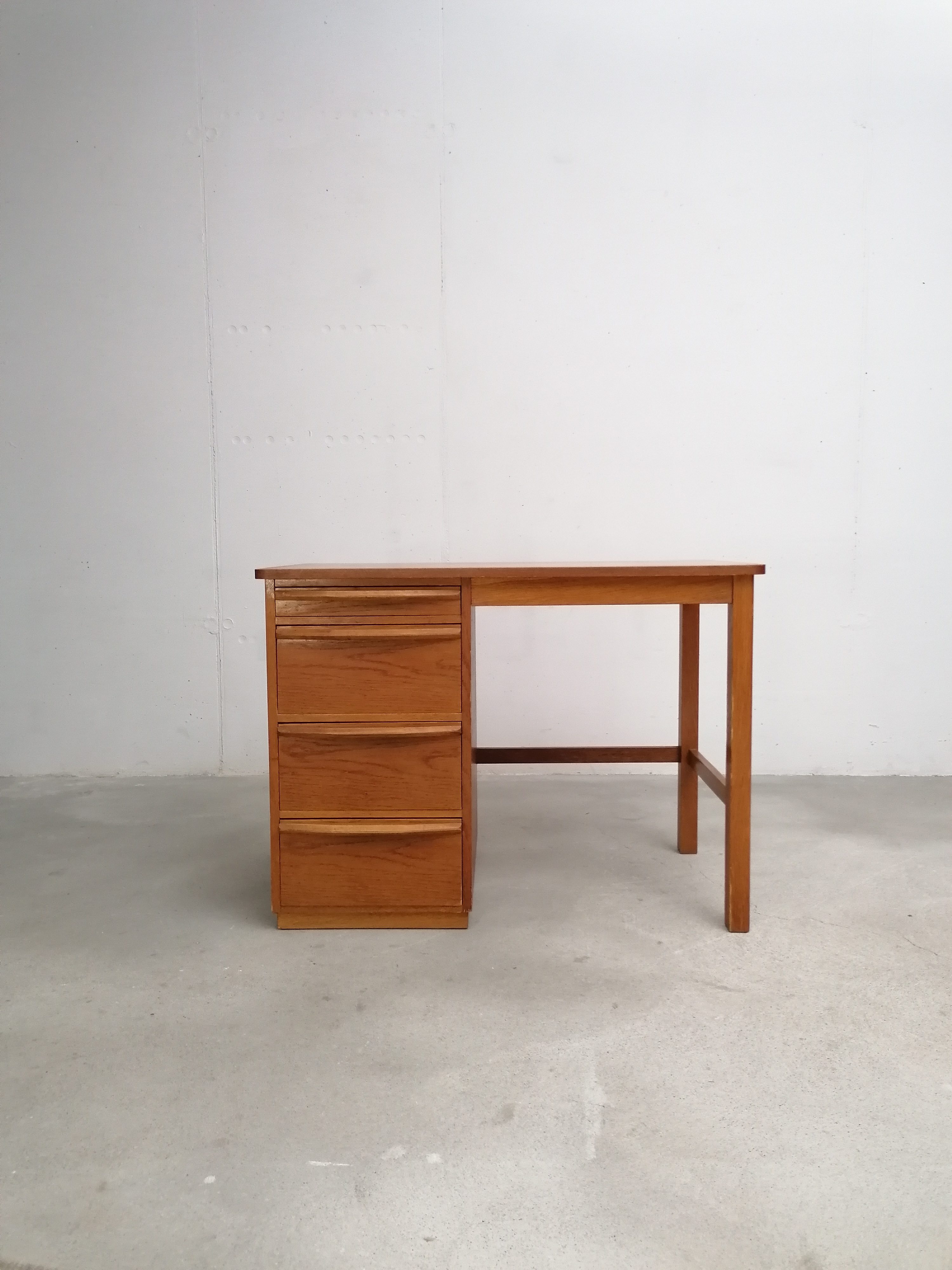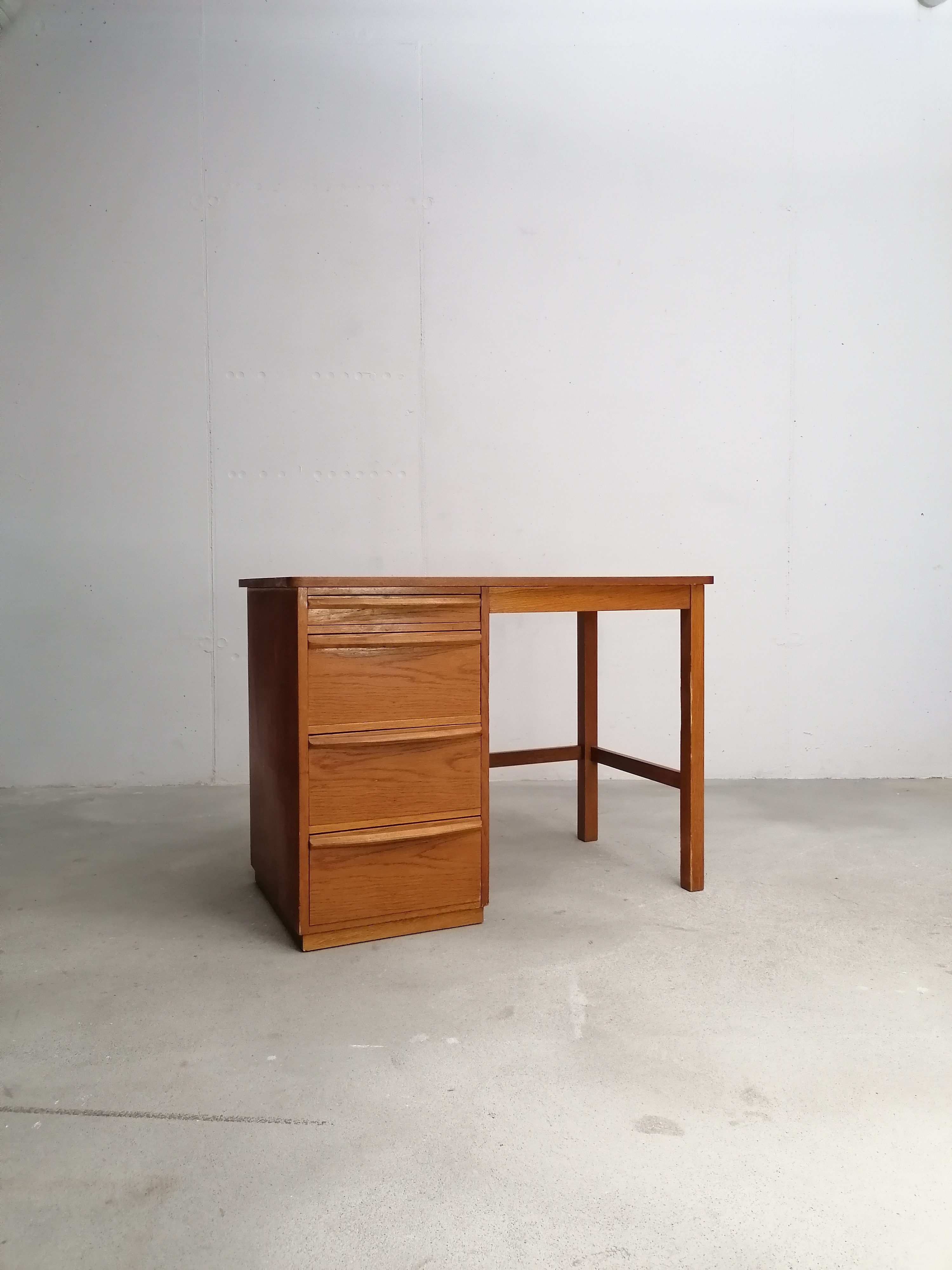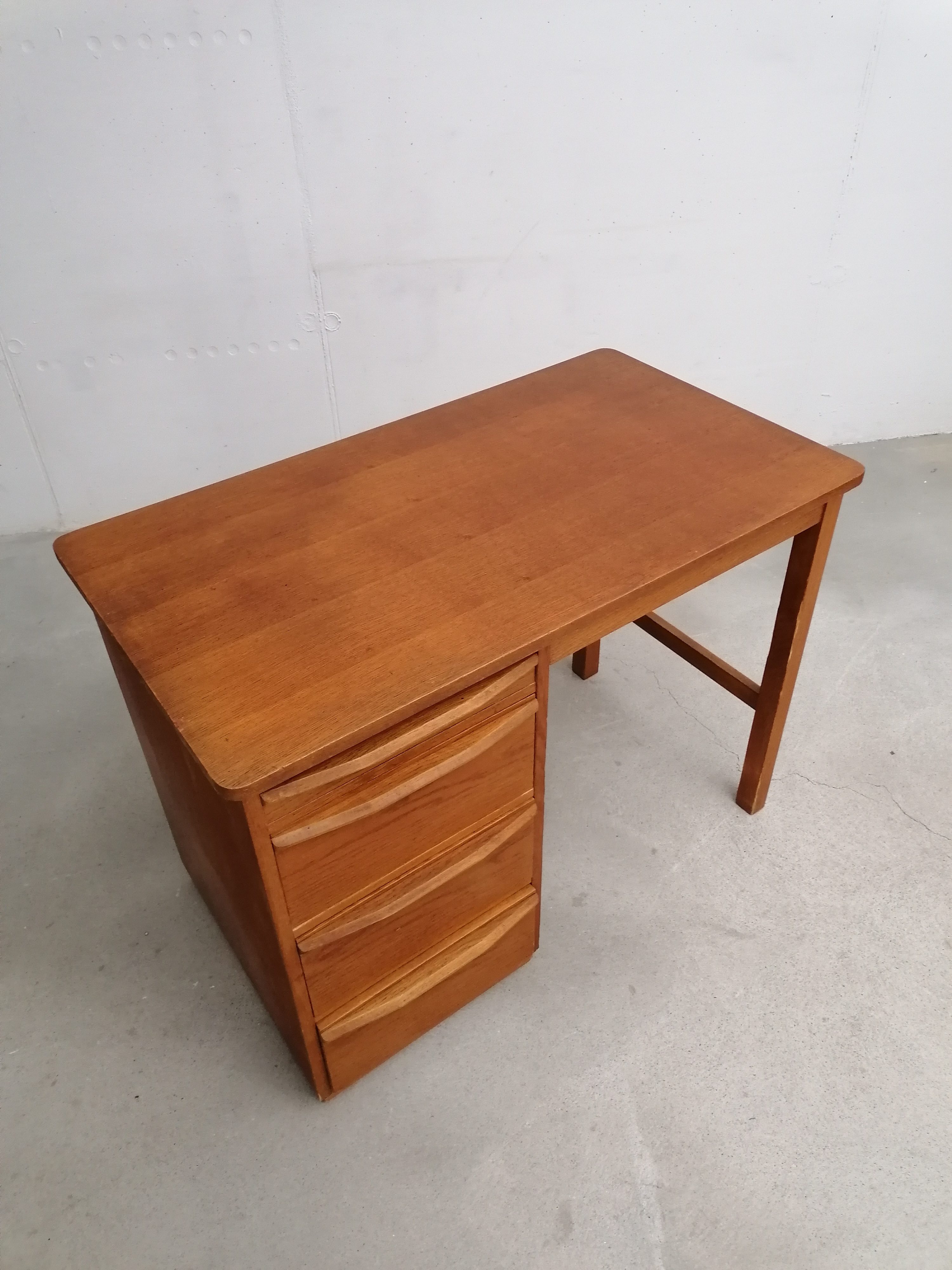 Produit venduBureau vintage en bois avec tablette extensible sur le côté. Doté de 4 tiroirs avec beaucoup d’éléments de rangement amovibles. Quelques traces d’usure sur le bois (voir photos) mais parfaitement stable et solide. Dimensions de l’espace où on peut mettre une chaise de bureau: hauteur 65.5 cm et largeur 50 cm.