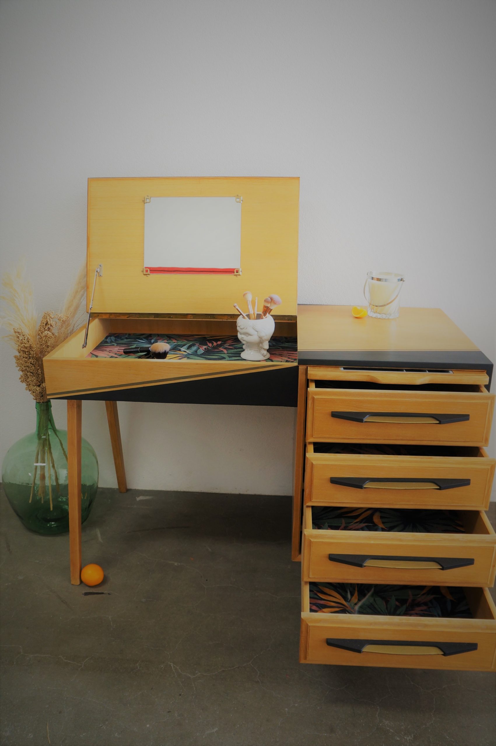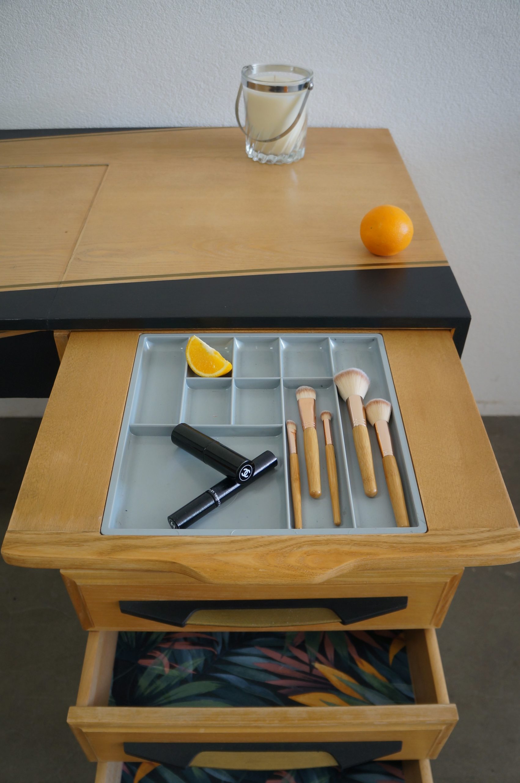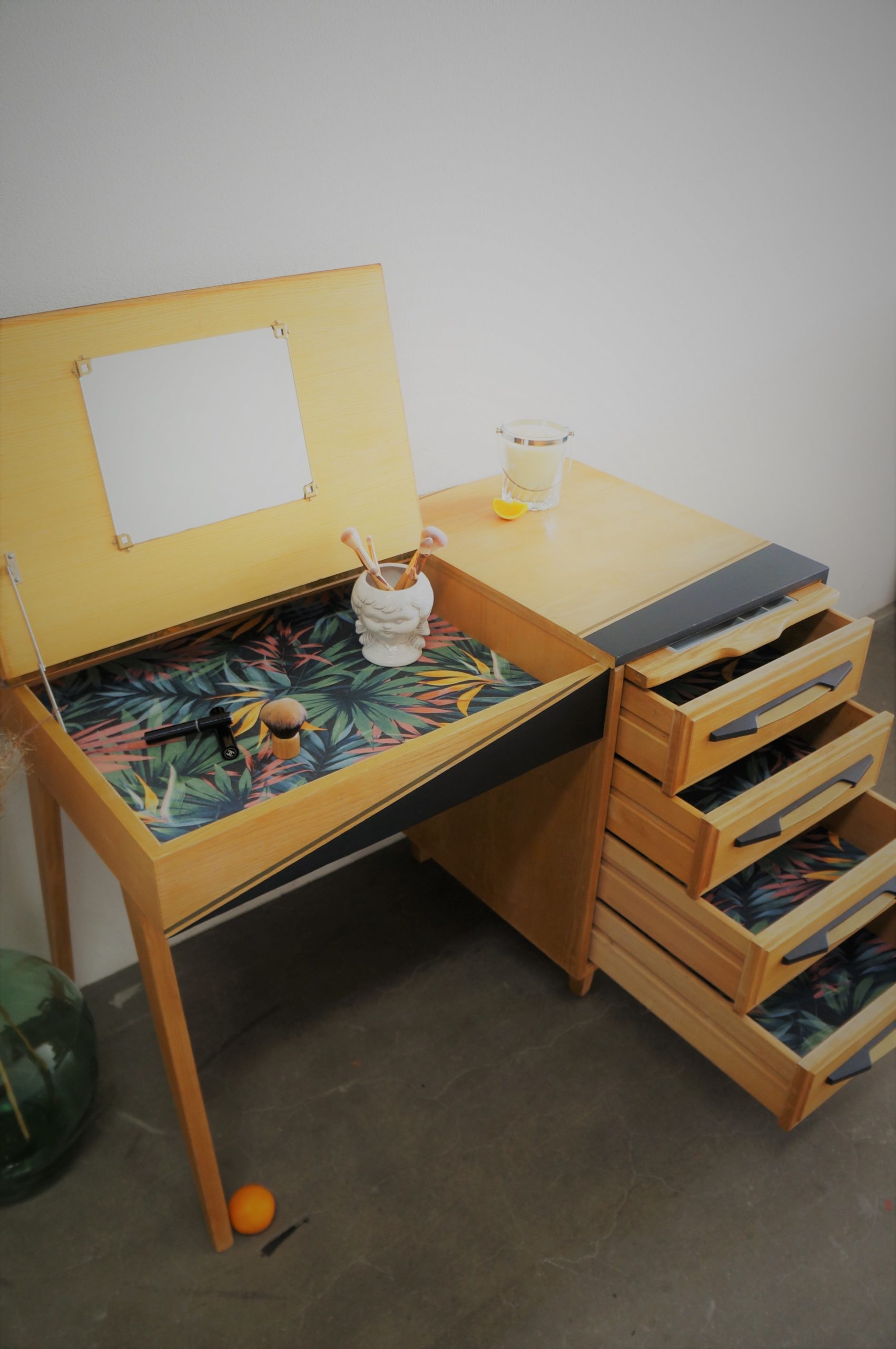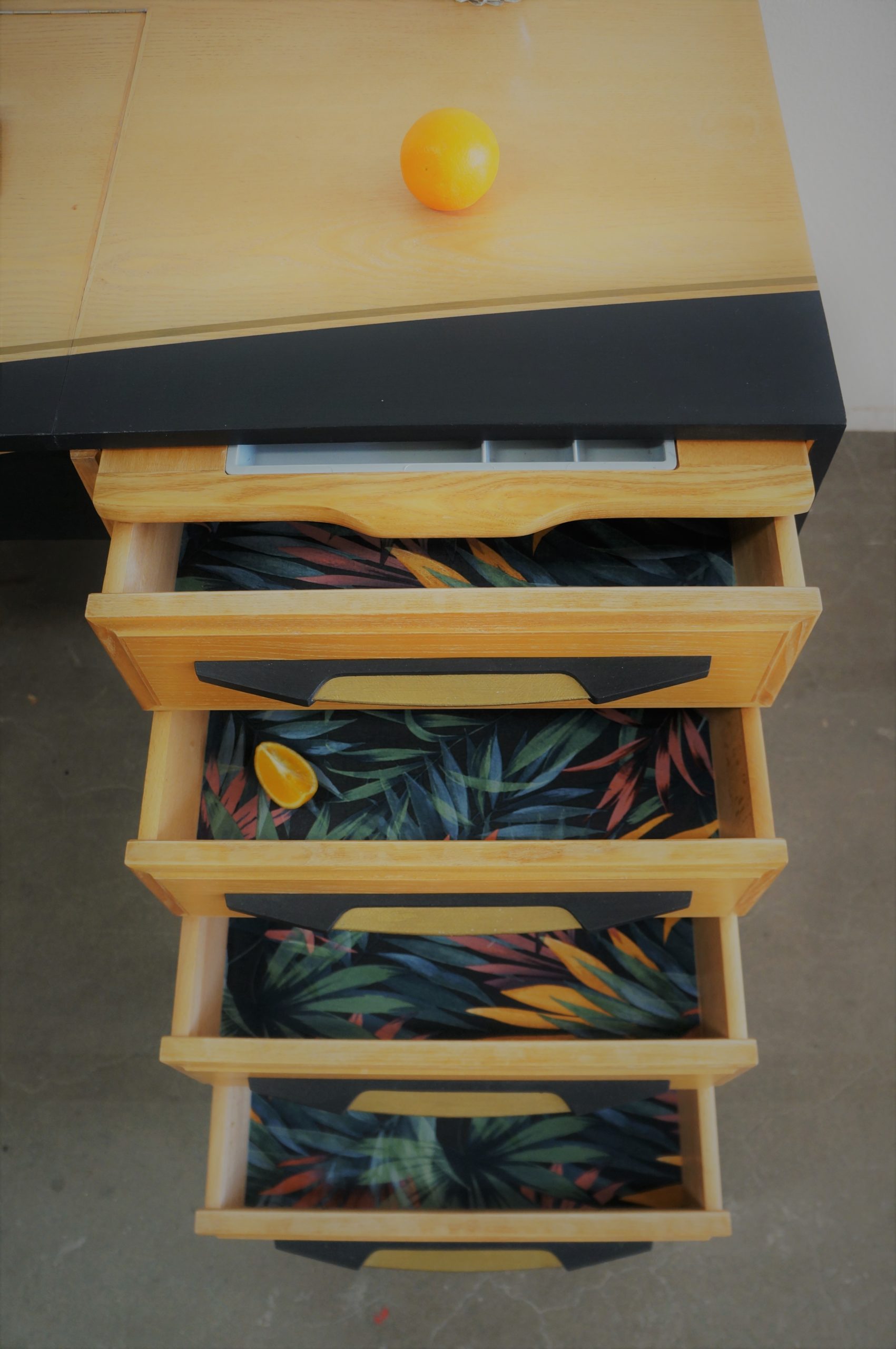 Produit venduQuand j’ai trouvé cette table/bureau vintage, tout le bord avant était fendu et éclaté. La pièce entière a été décapée, le bord avant a été rempli et reconstruit pour rendre la surface lisse à nouveau, retouché avec de la peinture de qualité et des détails dorés et enfin fini avec des couches de cire à la main pour la durabilité et un aspect semi-mat. Un papier peint coloré complète l’intérieur des tiroirs.