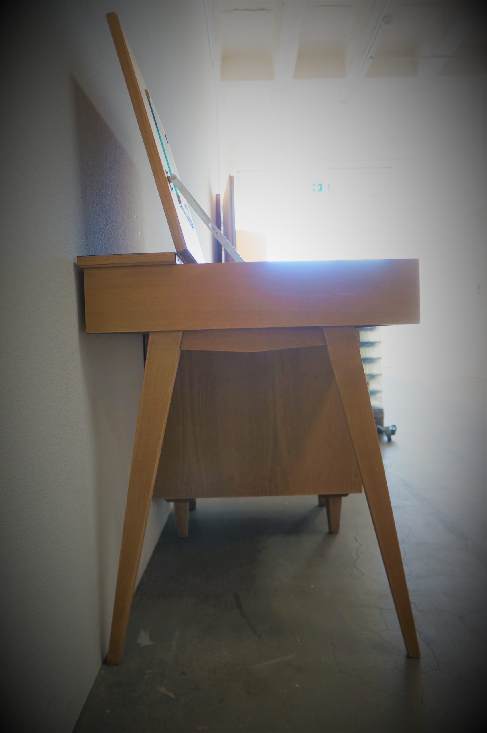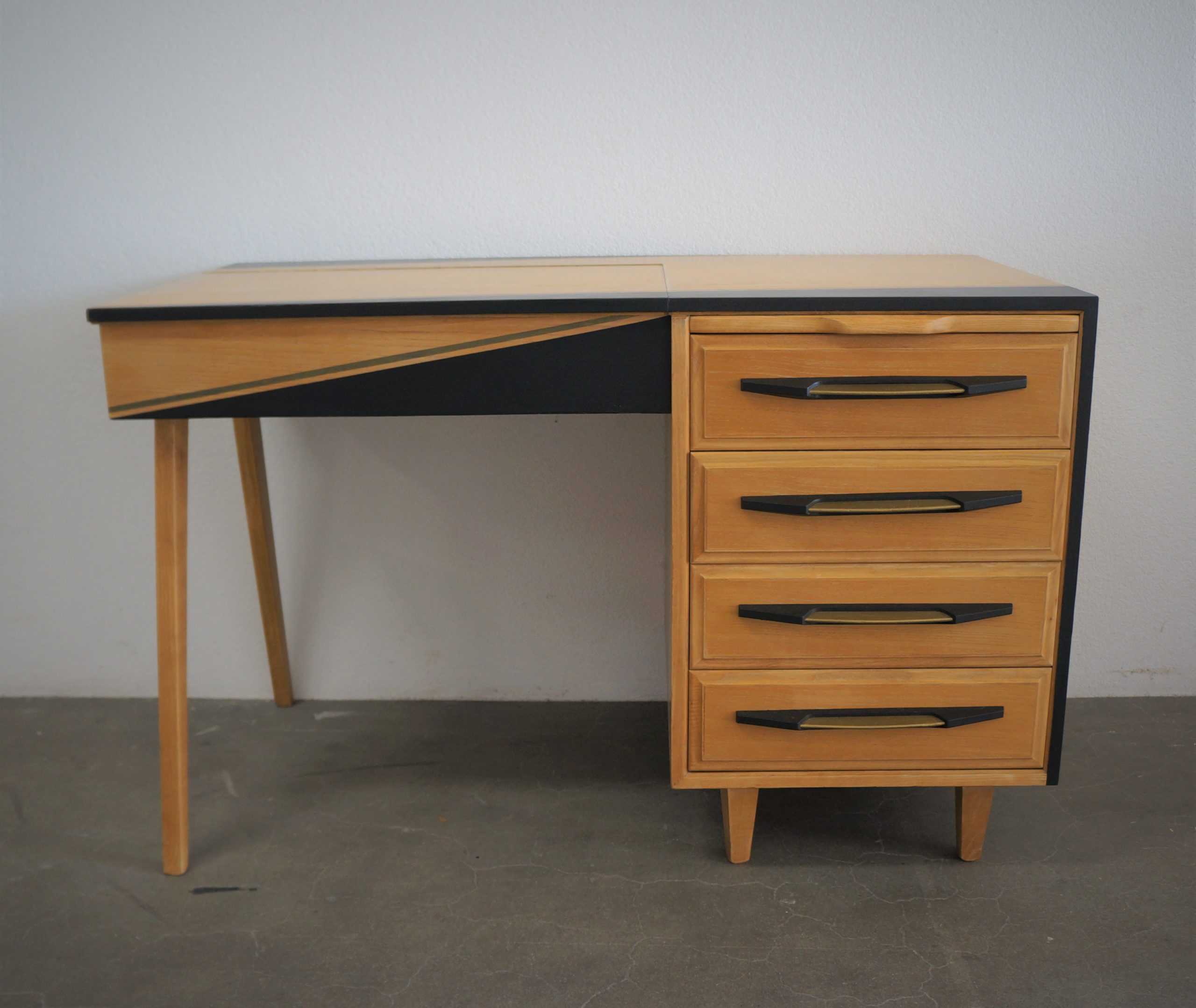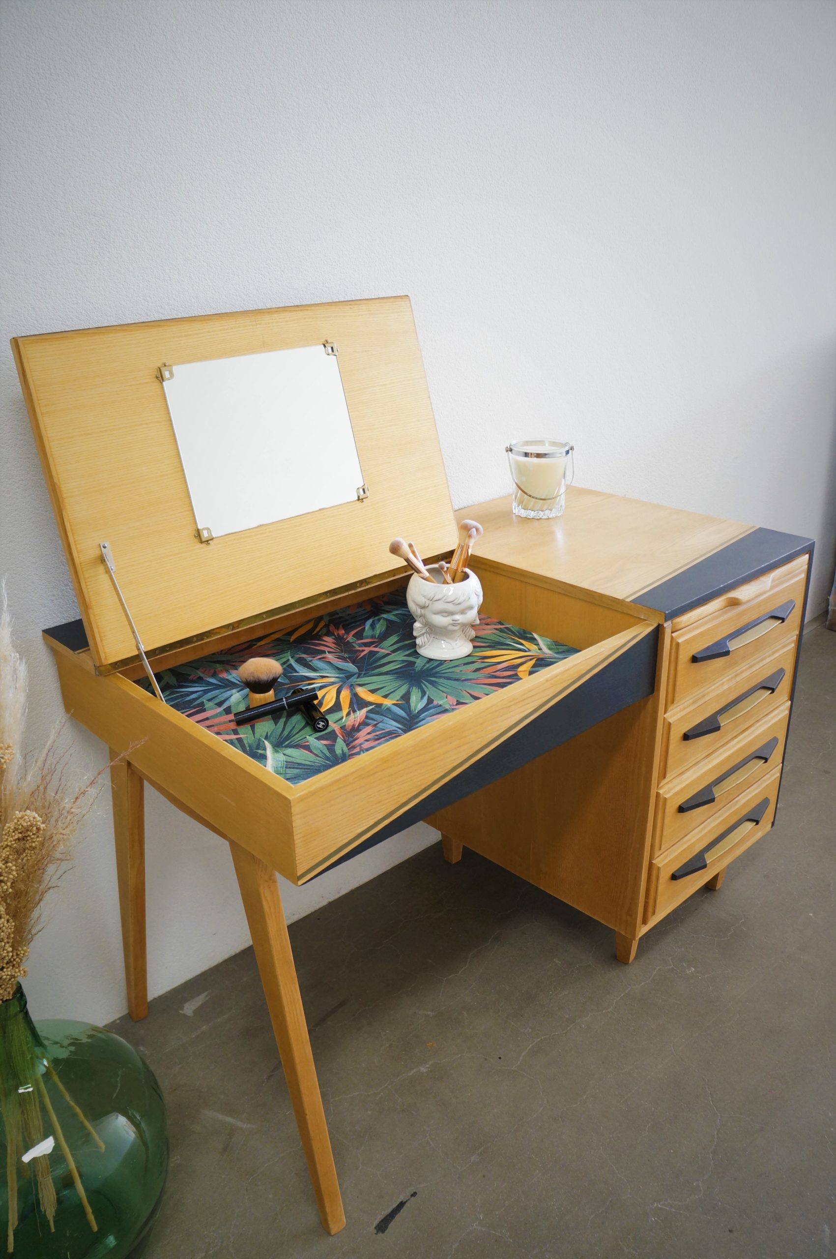 Produit venduQuand j’ai trouvé cette table/bureau vintage, tout le bord avant était fendu et éclaté. La pièce entière a été décapée, le bord avant a été rempli et reconstruit pour rendre la surface lisse à nouveau, retouché avec de la peinture de qualité et des détails dorés et enfin fini avec des couches de cire à la main pour la durabilité et un aspect semi-mat. Un papier peint coloré complète l’intérieur des tiroirs.
