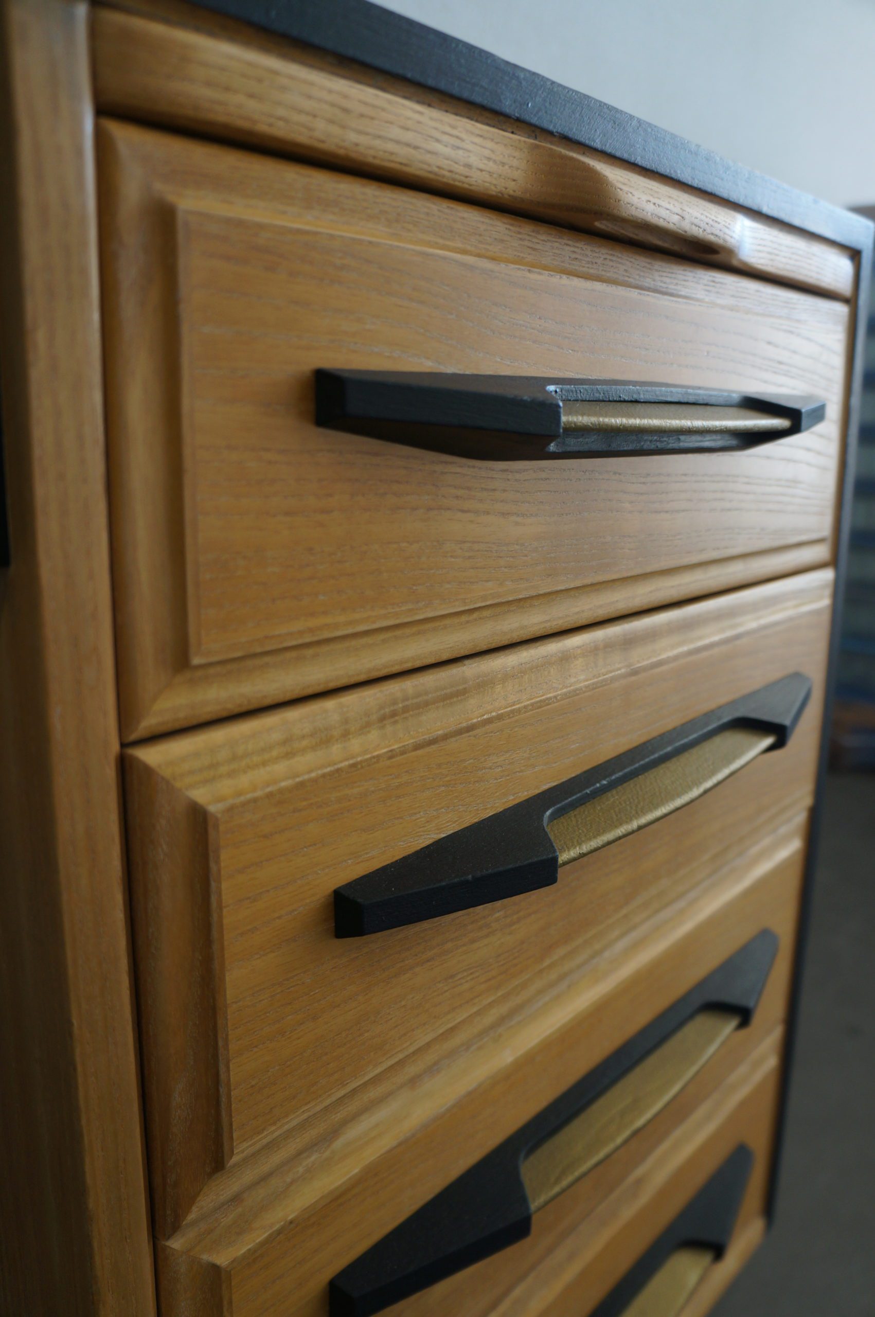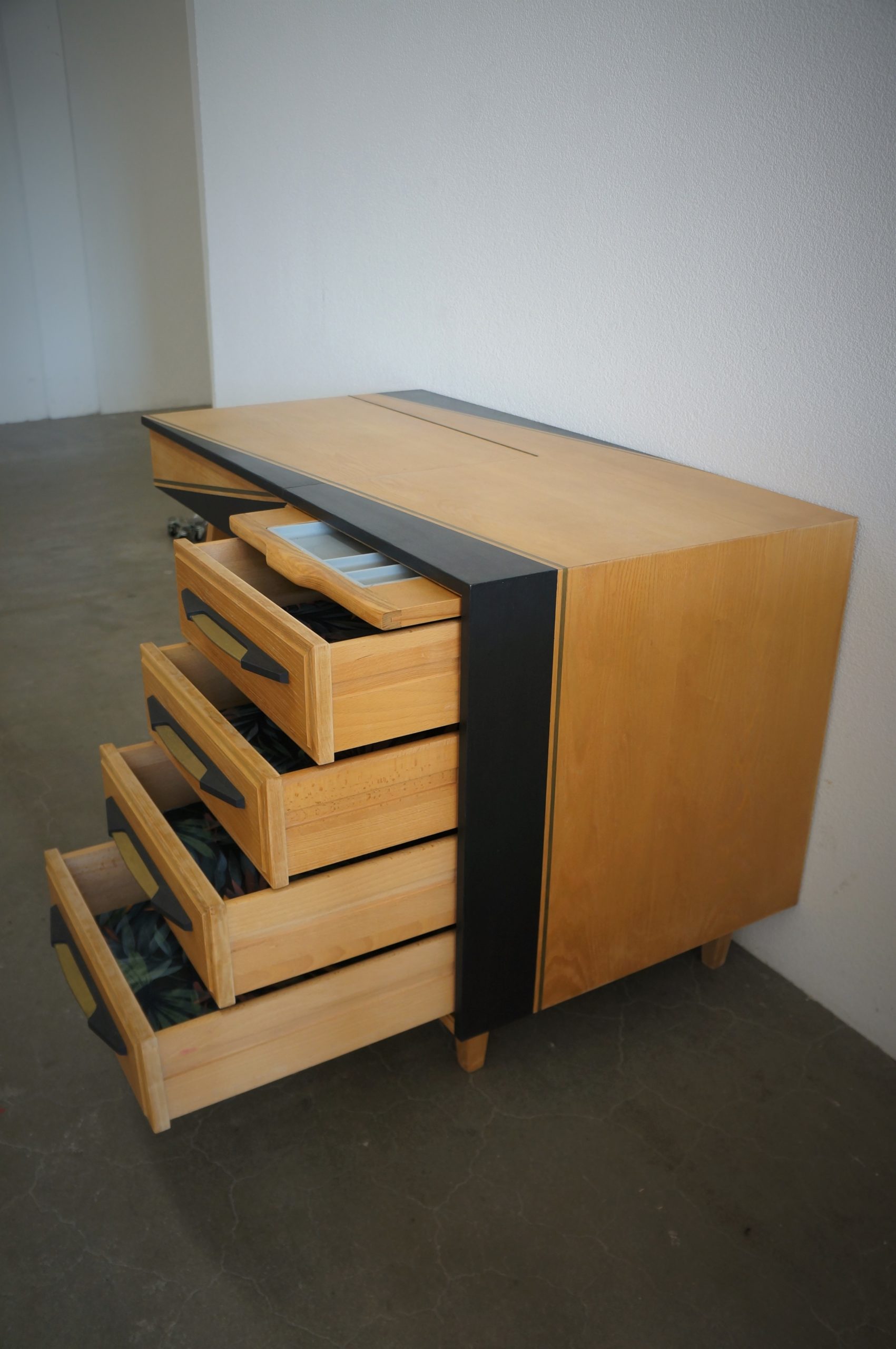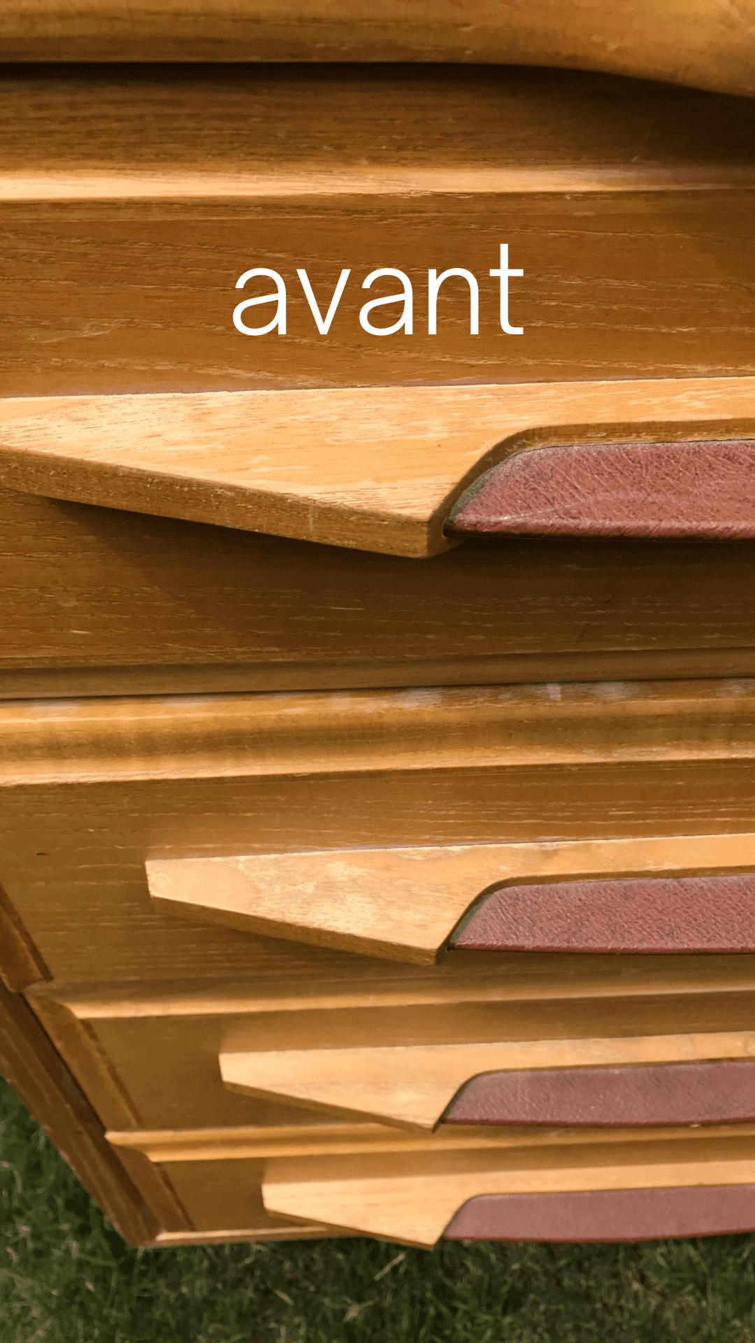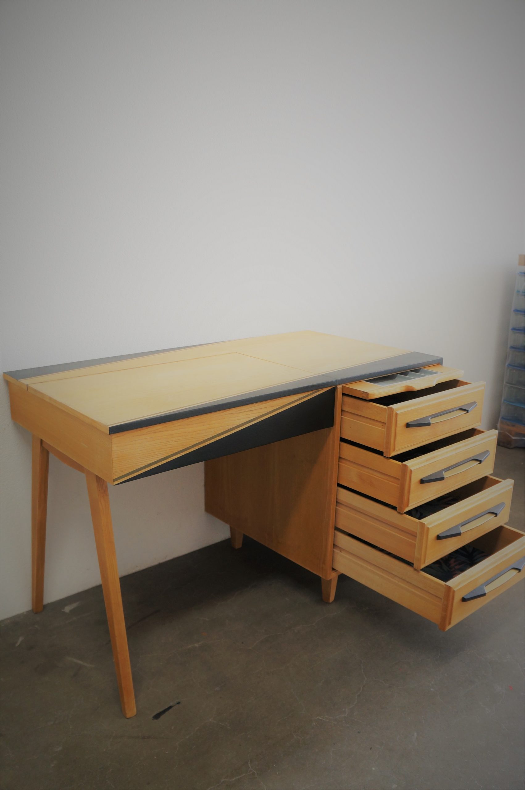 Produit venduQuand j’ai trouvé cette table/bureau vintage, tout le bord avant était fendu et éclaté. La pièce entière a été décapée, le bord avant a été rempli et reconstruit pour rendre la surface lisse à nouveau, retouché avec de la peinture de qualité et des détails dorés et enfin fini avec des couches de cire à la main pour la durabilité et un aspect semi-mat. Un papier peint coloré complète l’intérieur des tiroirs.