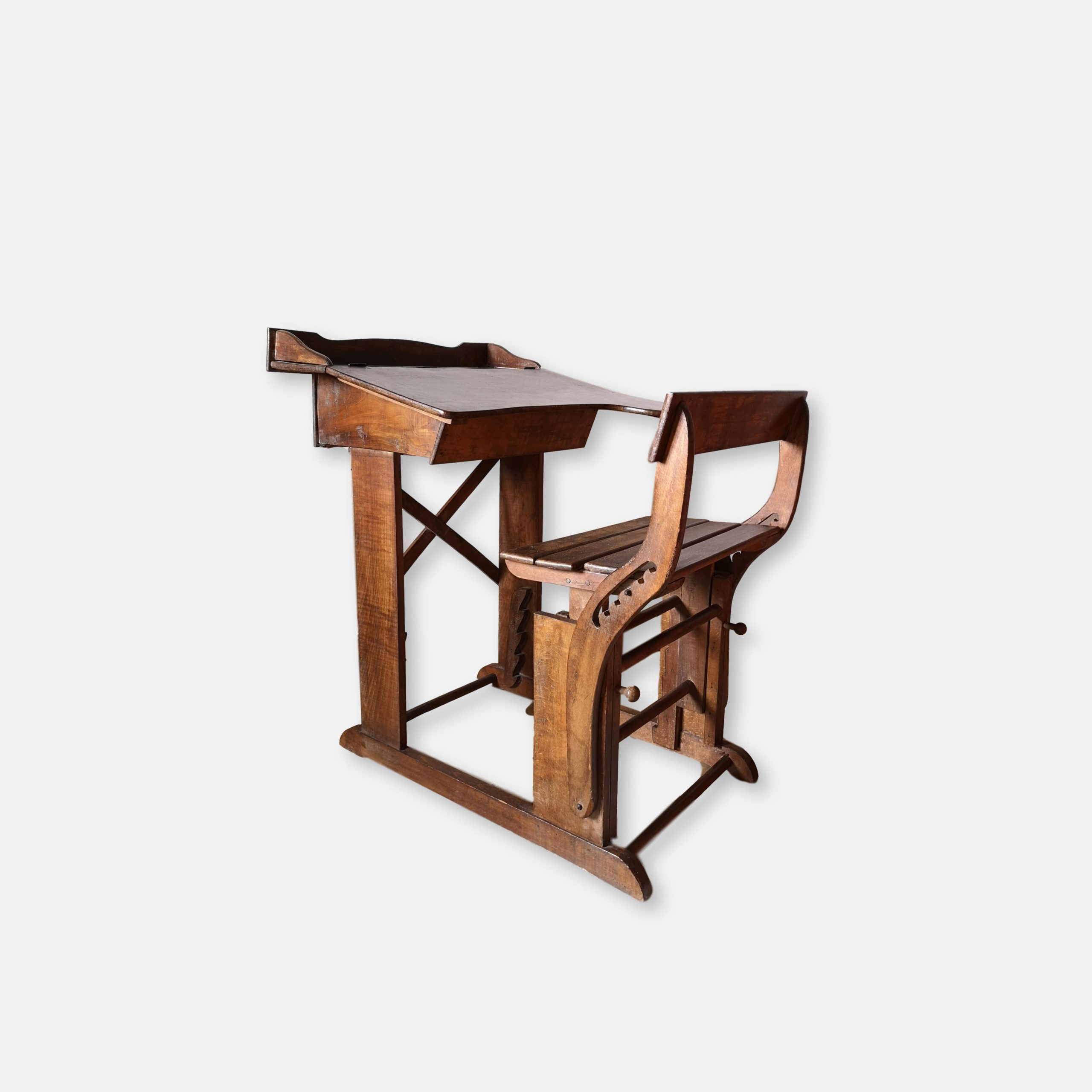 Produit venduPupitre enfant évolutif des années 50 avec casier et banc intégrés. Le banc est réglable en hauteur à l’aide de vis en bois (hauteur de l’assise: 47-57 cm). Possibilité de rajouter une planche pour la hauteur des pieds. Superbe pépite !