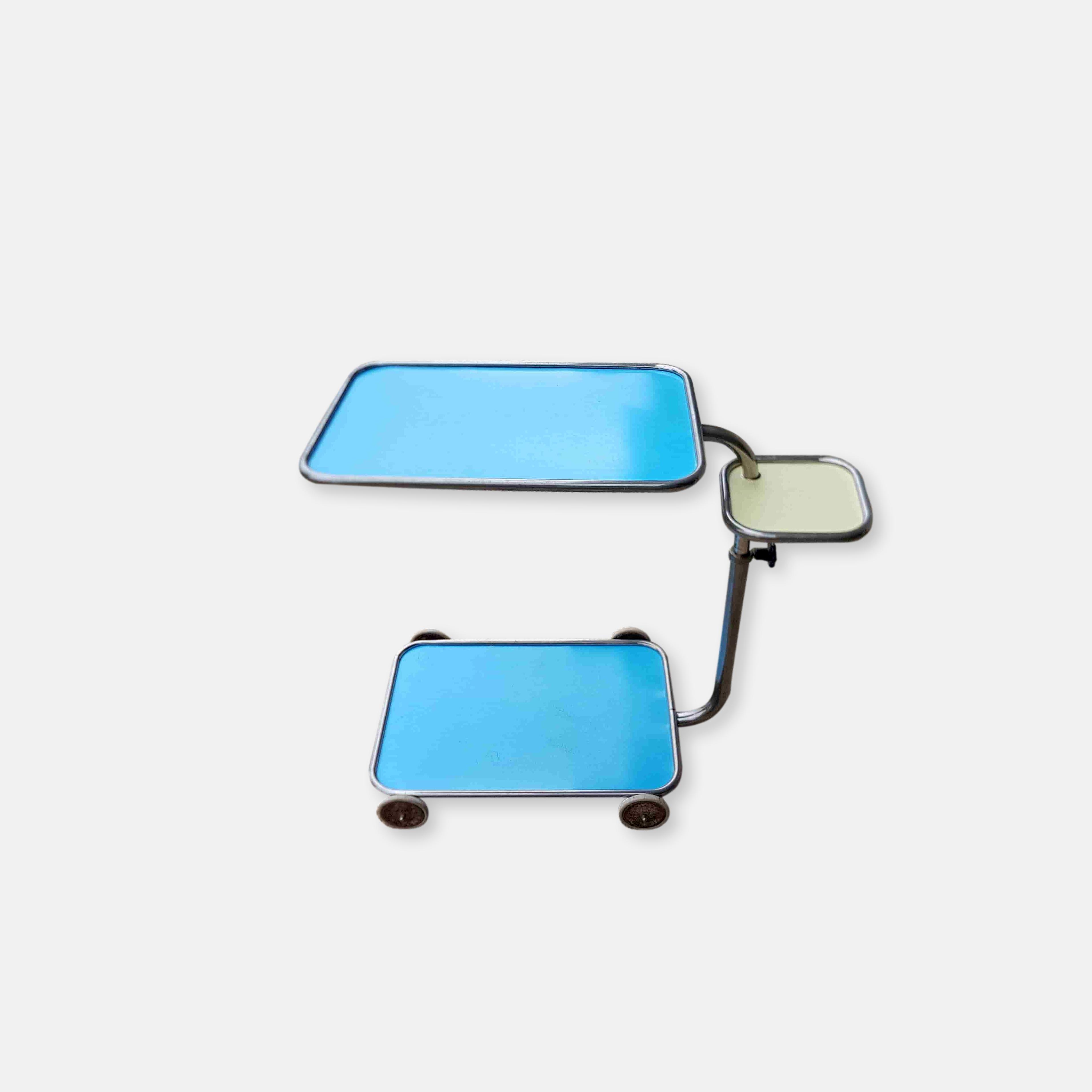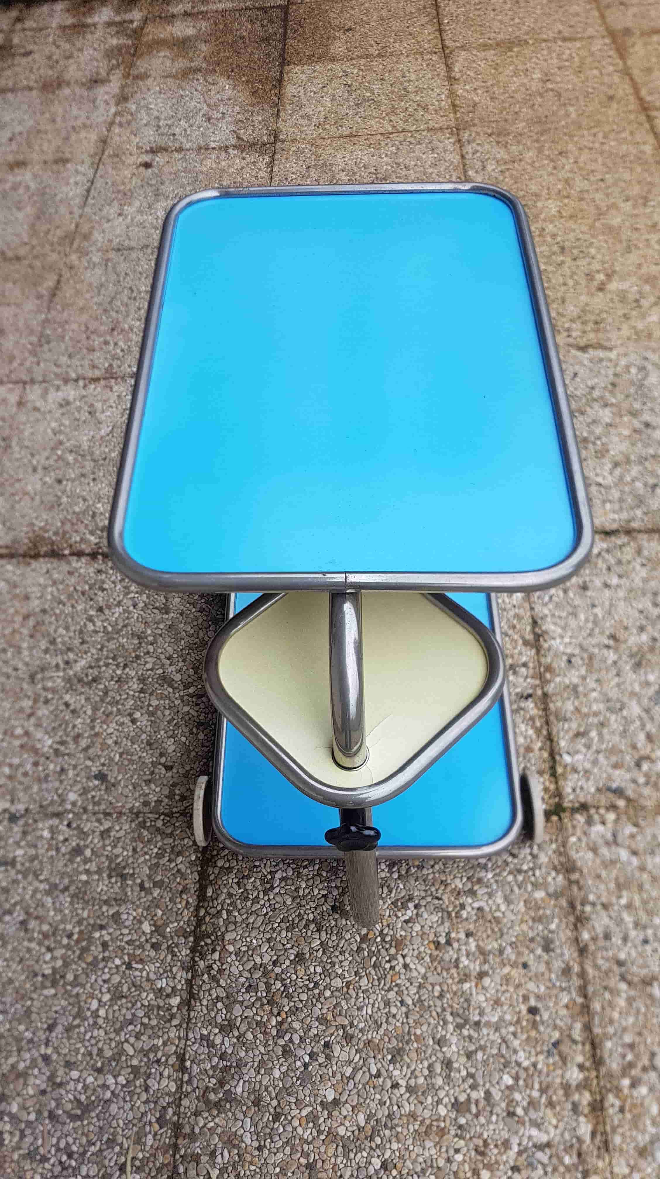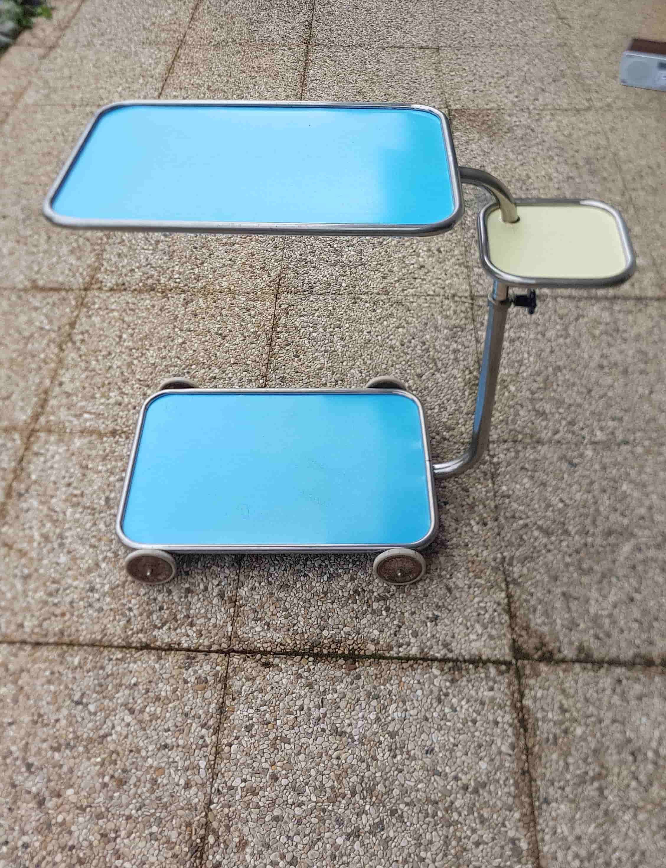 Produit venduTrès “seventies” cette desserte (servante – service-boy) est composée d’un tablard bas fixe, d’un petit central modulable en hauteur et en directionnel, tout comme celui du haut. Le tout sur roulettes, en métal et formica. Quelques toutes petites fentes sur plateau du milieu et état d’usage, une belle pièce qui va rendre encore beaucoup de services dans un joli design atypique .