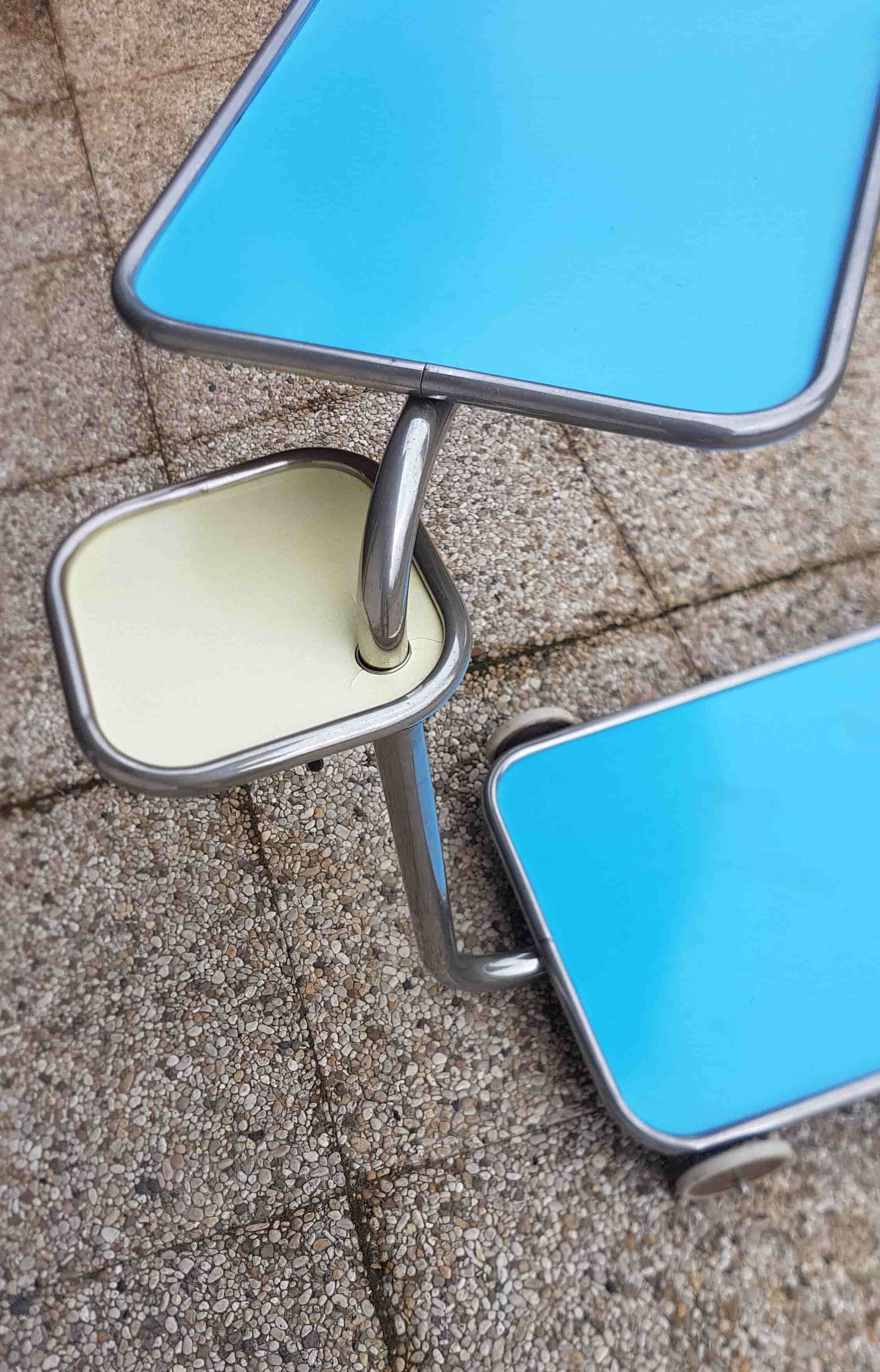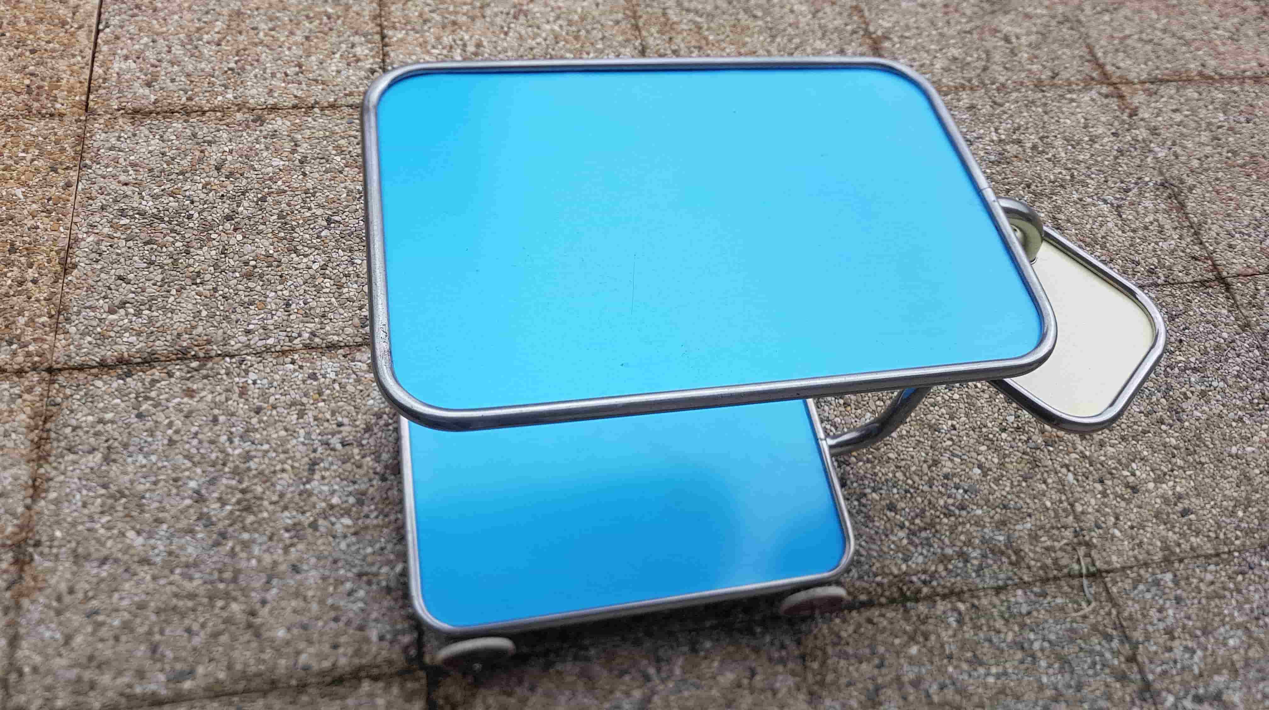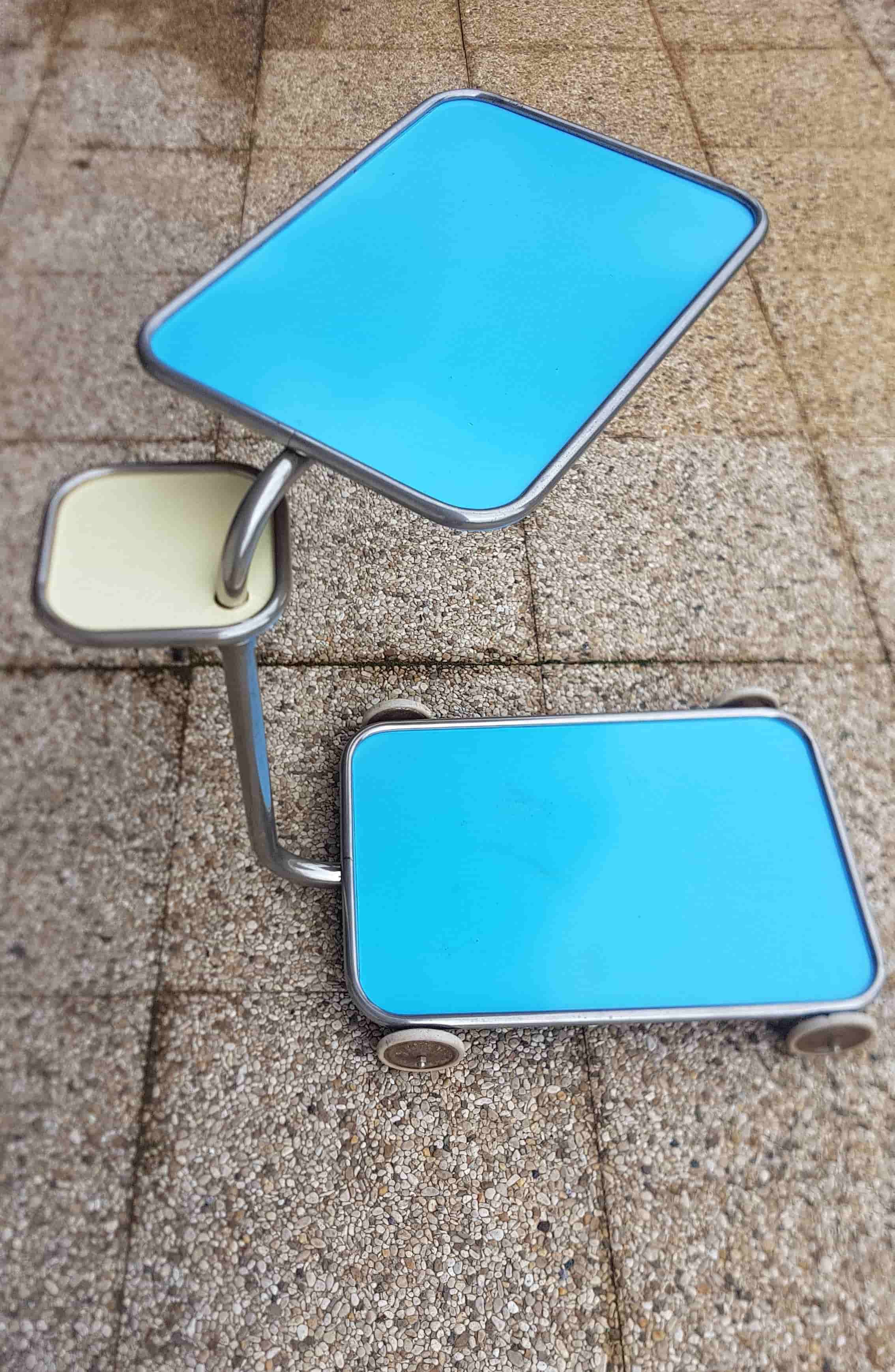 Produit venduTrès “seventies” cette desserte (servante – service-boy) est composée d’un tablard bas fixe, d’un petit central modulable en hauteur et en directionnel, tout comme celui du haut. Le tout sur roulettes, en métal et formica. Quelques toutes petites fentes sur plateau du milieu et état d’usage, une belle pièce qui va rendre encore beaucoup de services dans un joli design atypique .